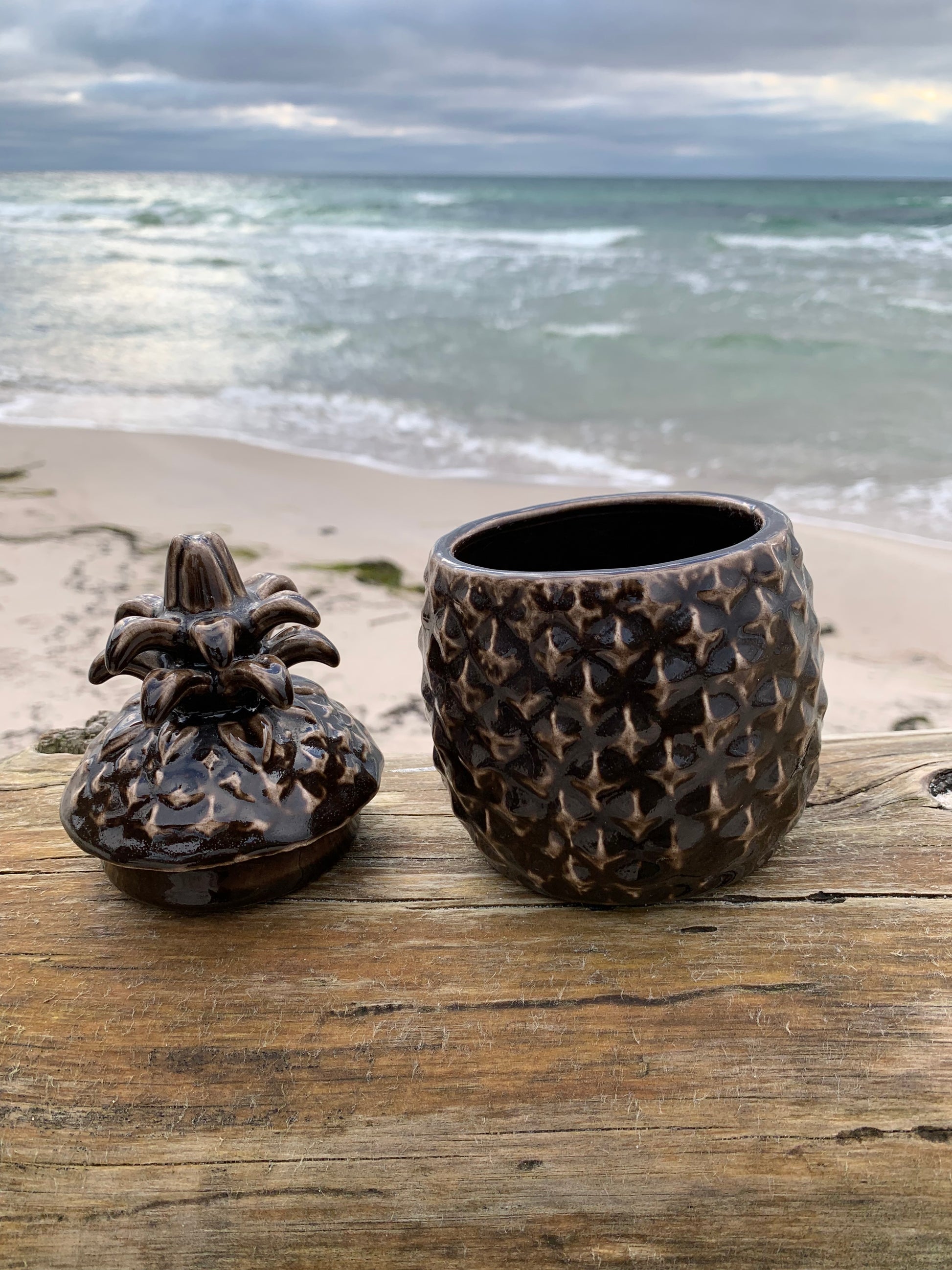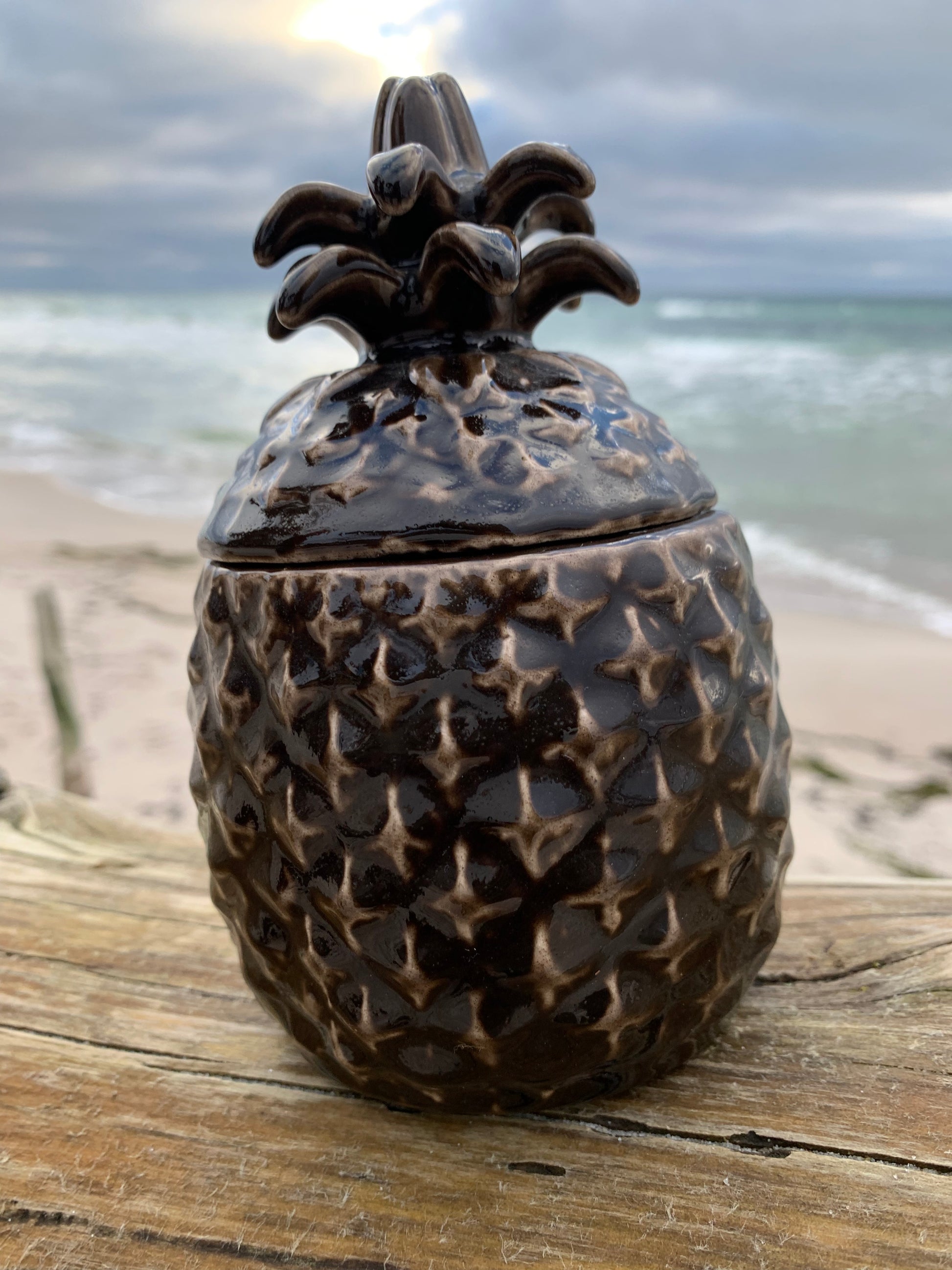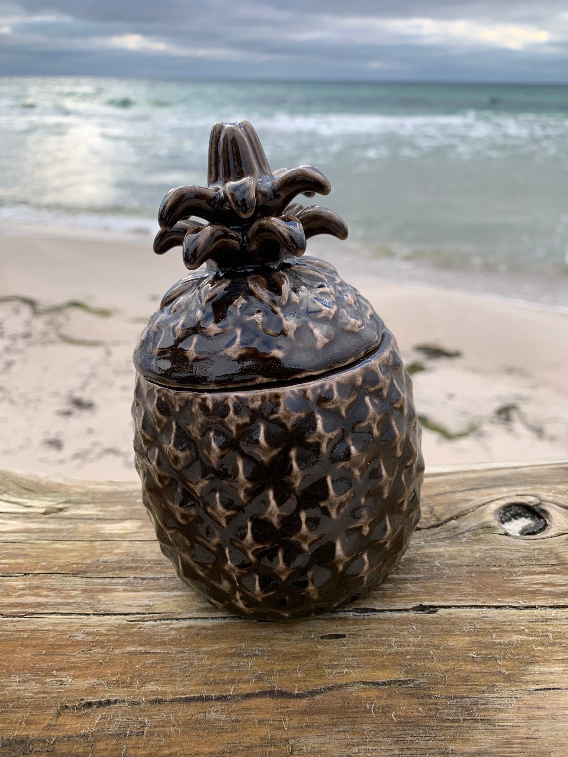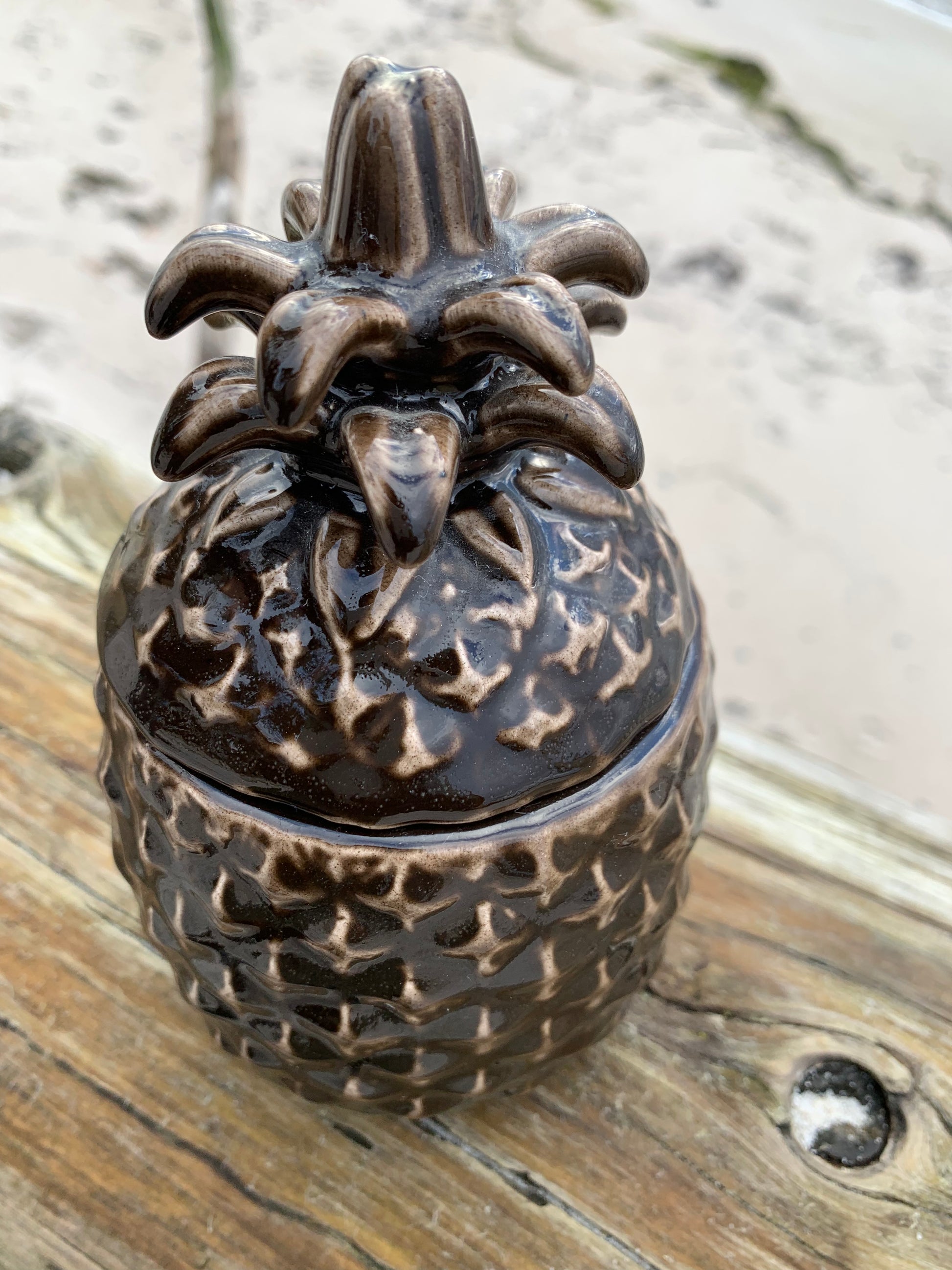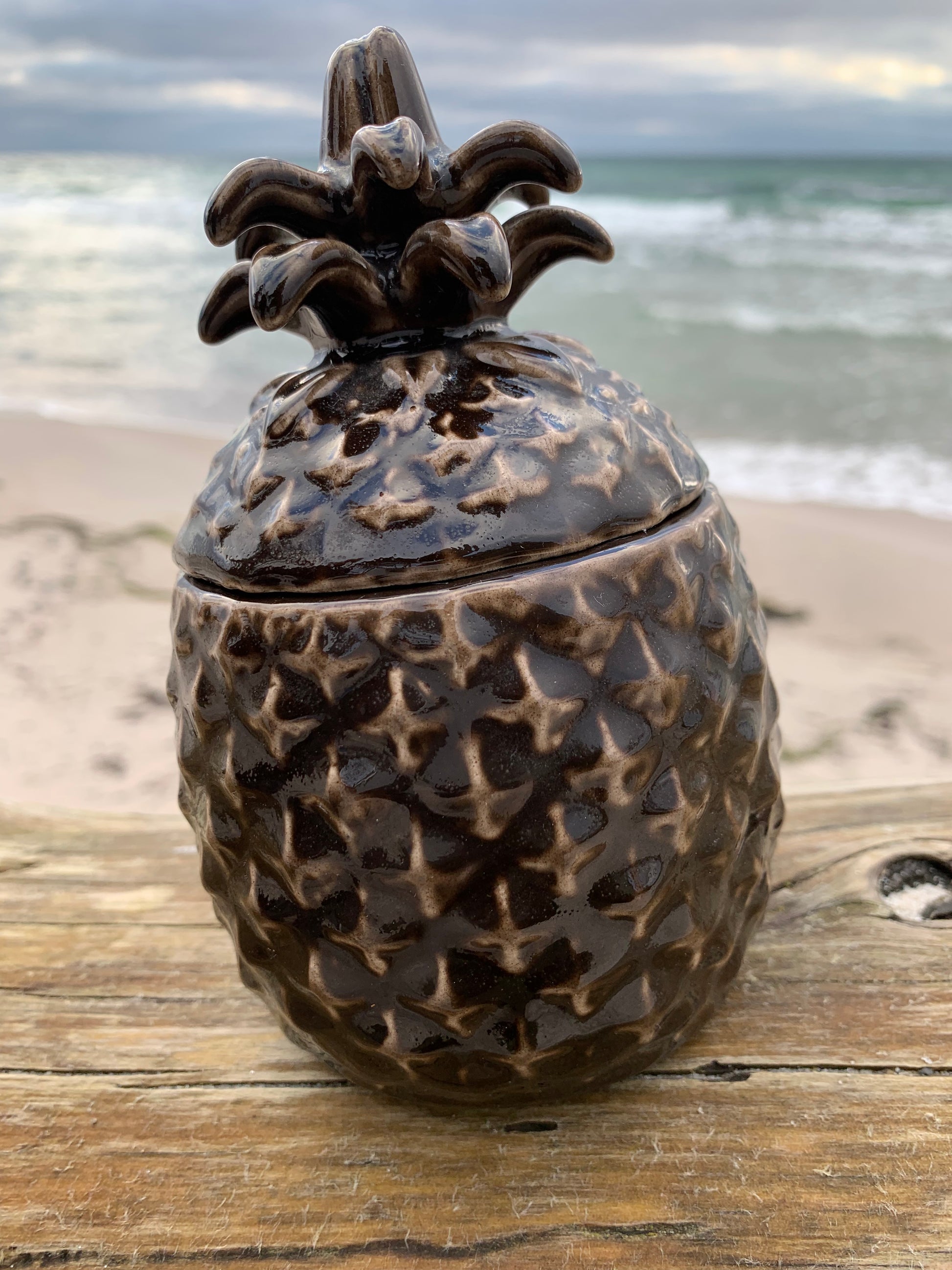 Sjov ananas keramikkrukke med låg. Krukken er fundet i Sverige.