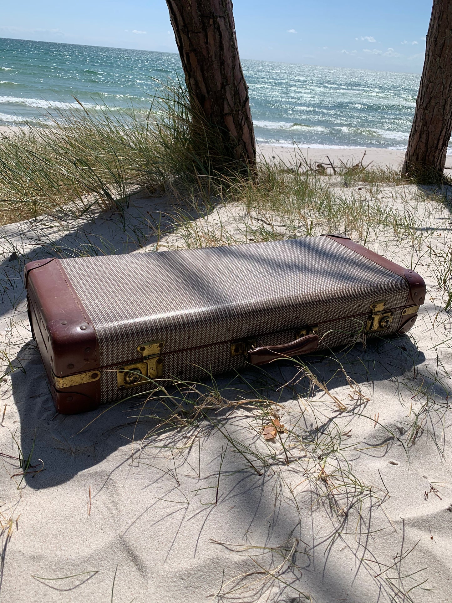 Historie: En kuffert er en rektangulær taske med runde hjørner lavet af hård eller blød plastik, vinyl, hårdt læder eller et lignende materiale, der holder formen. En kuffert har et håndtag til at bære den i, og bliver hovedsageligt brugt til at transportere tøj og andre ejendele ved rejser.