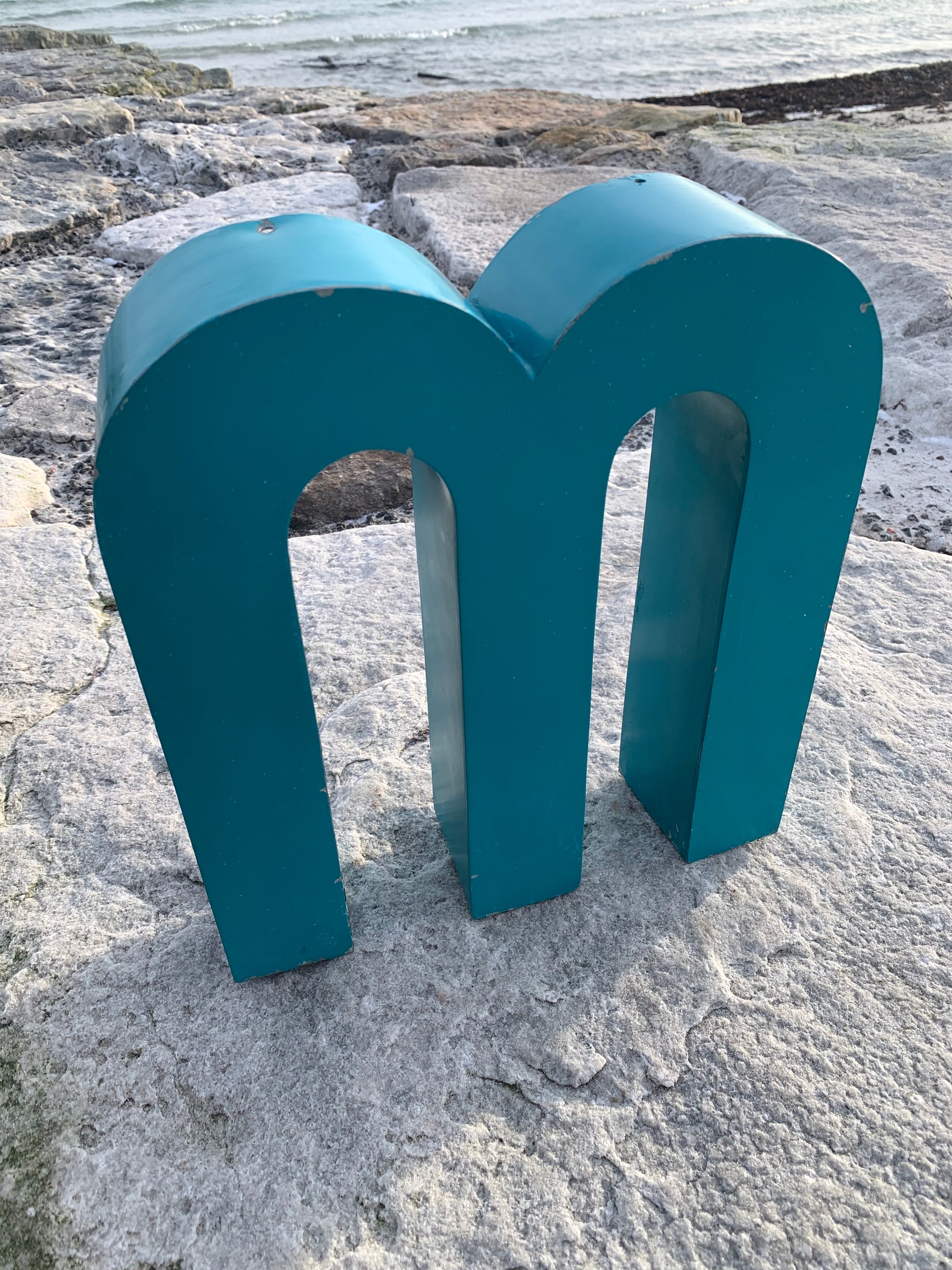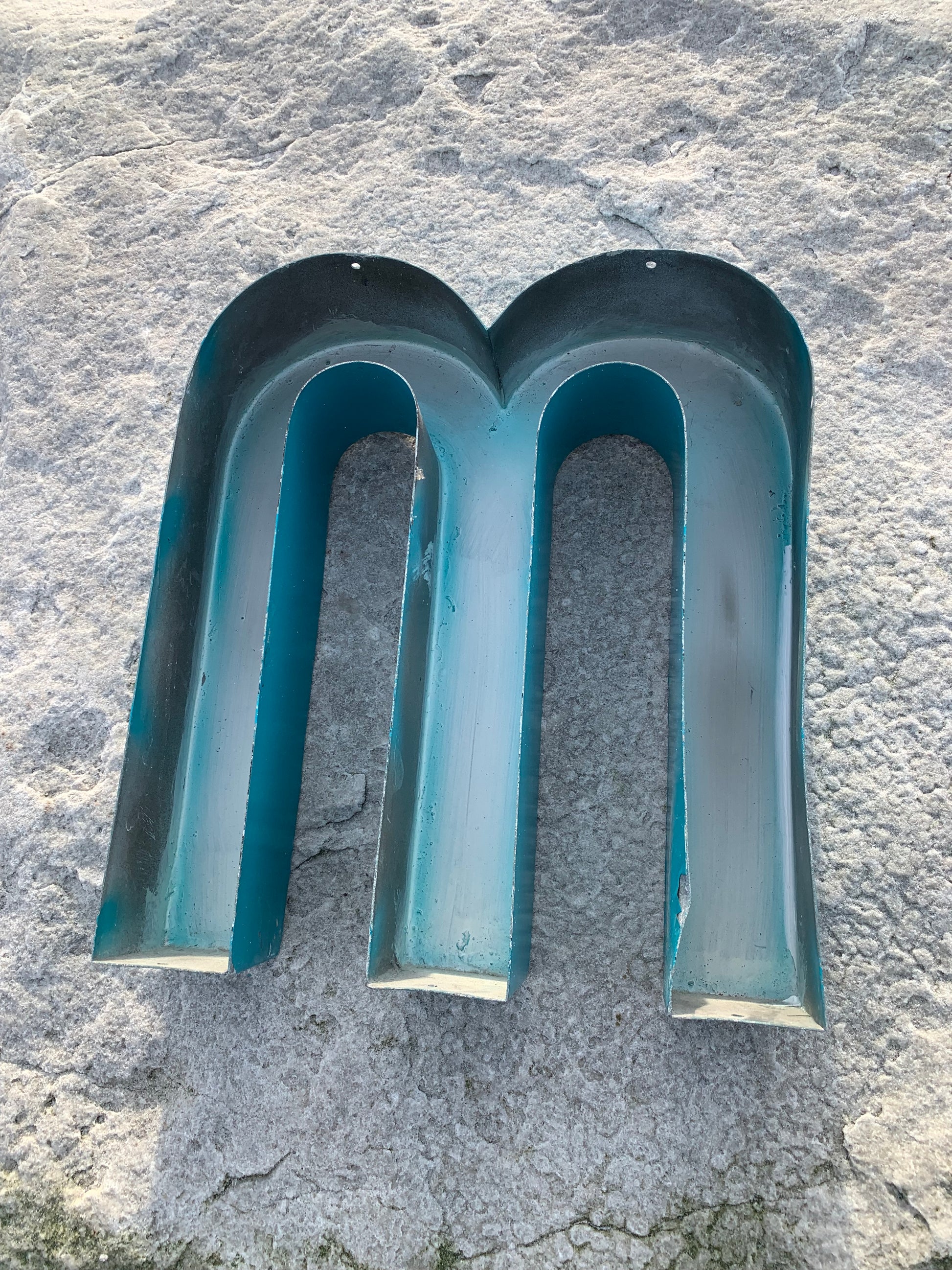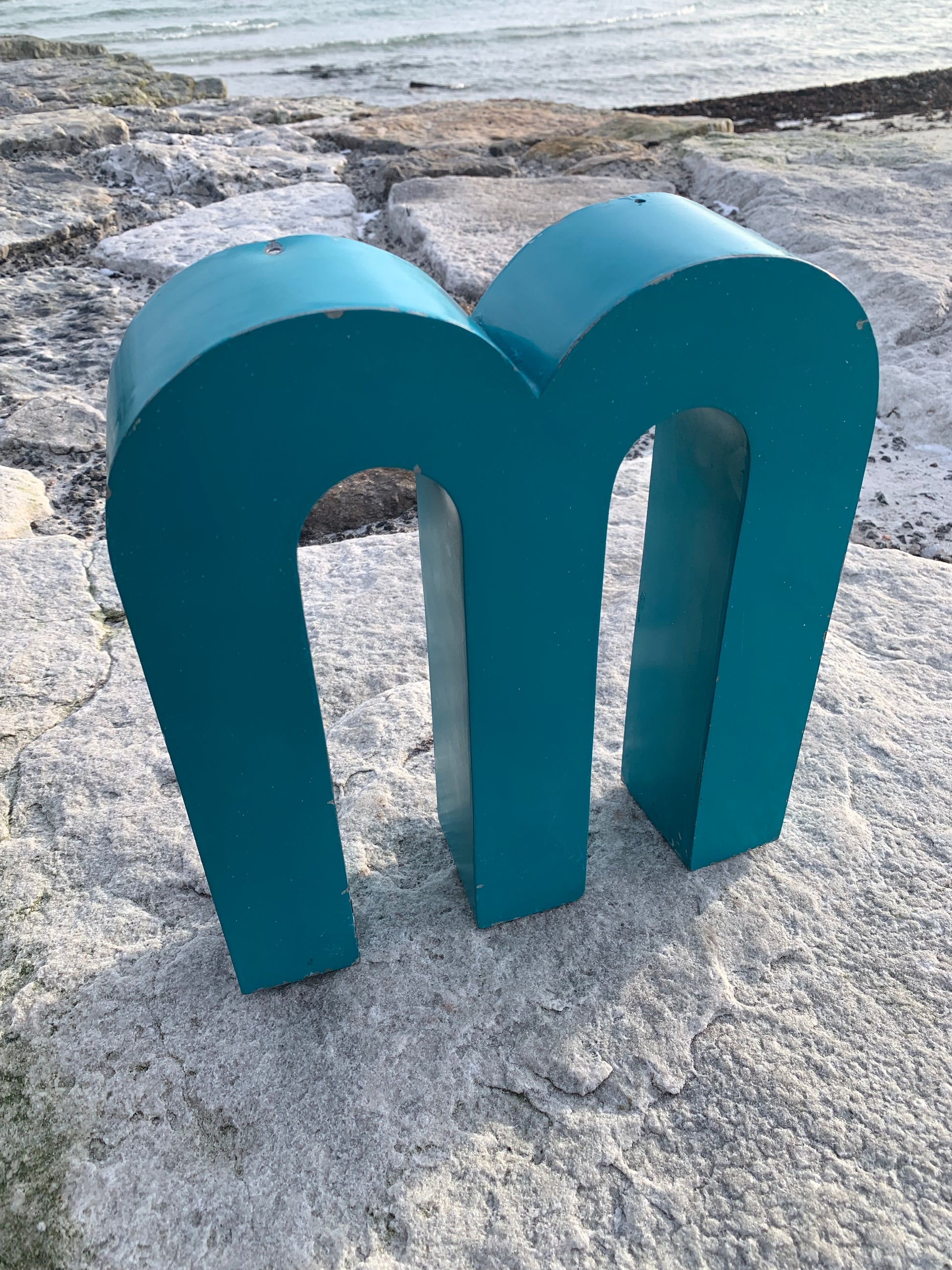 Dekorativt facadebogstav i metal. Bogstavet har lige været en tur i værkstedet, her er det blevet renset for gammel maling og poleret. Det fremstår stadig med en charmerende patina.
