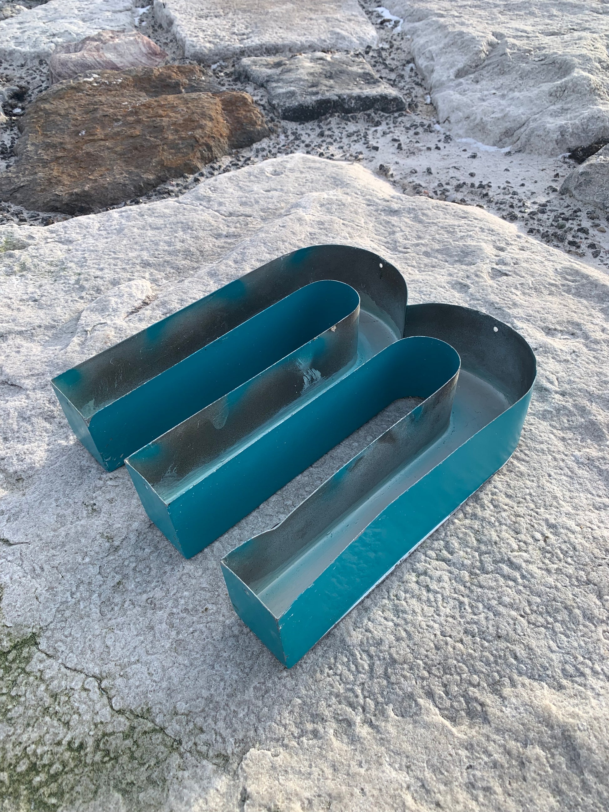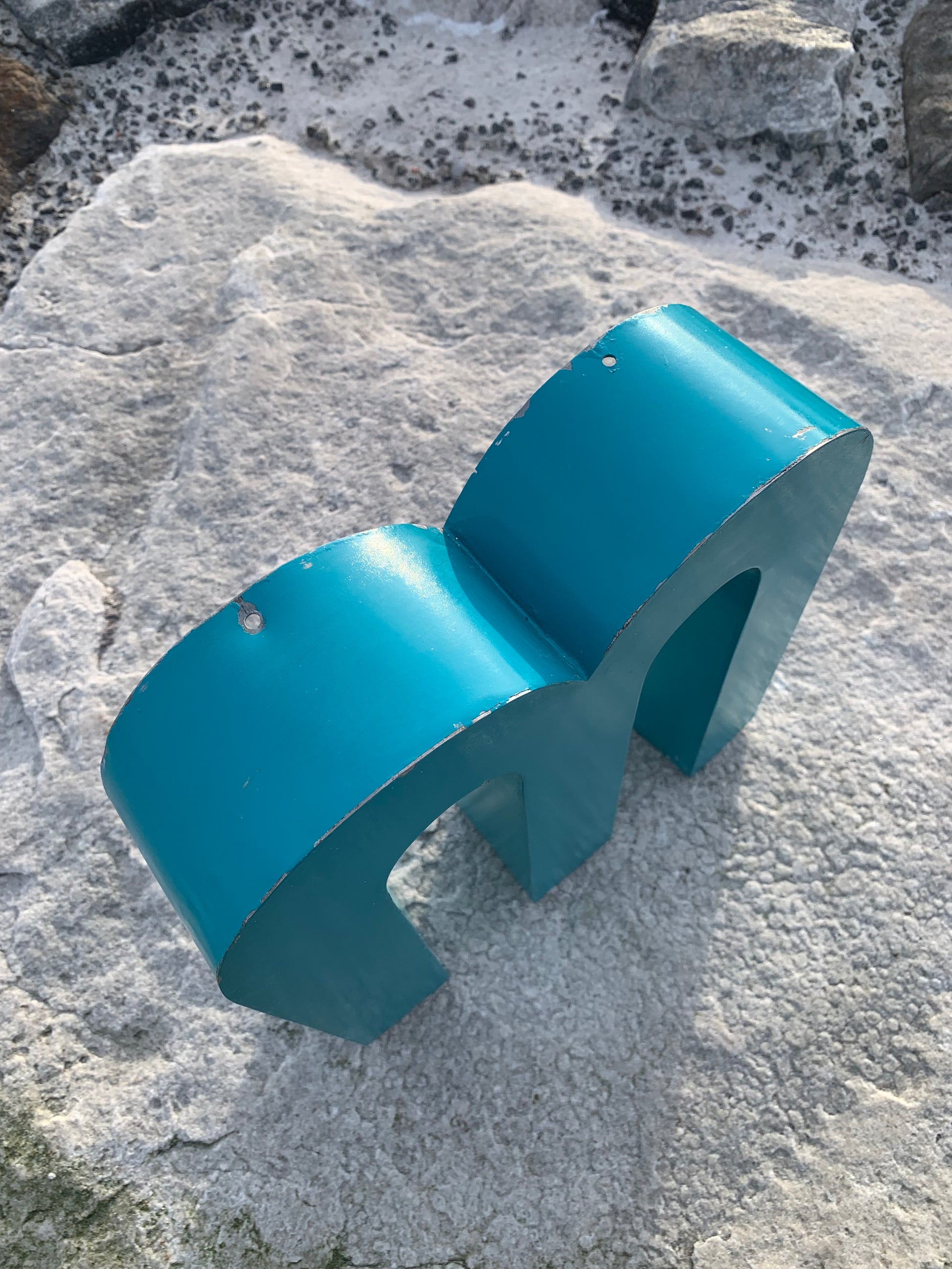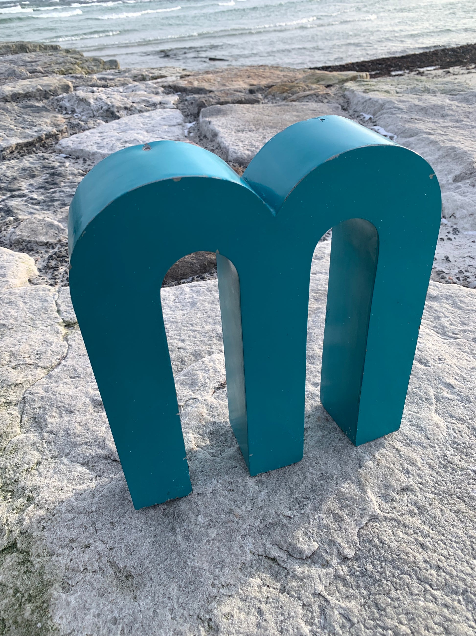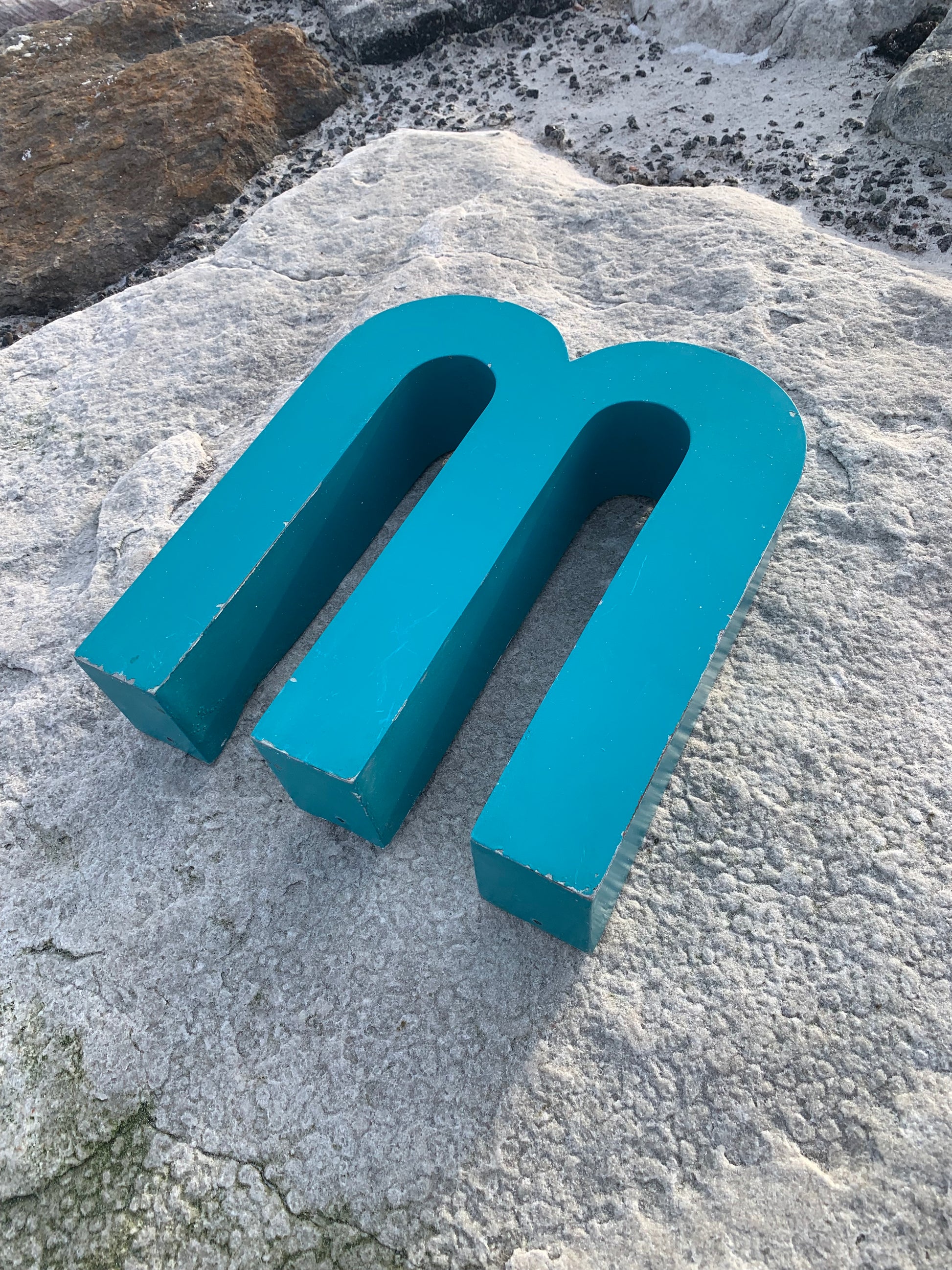 Dekorativt facadebogstav i metal. Bogstavet har lige været en tur i værkstedet, her er det blevet renset for gammel maling og poleret. Det fremstår stadig med en charmerende patina.