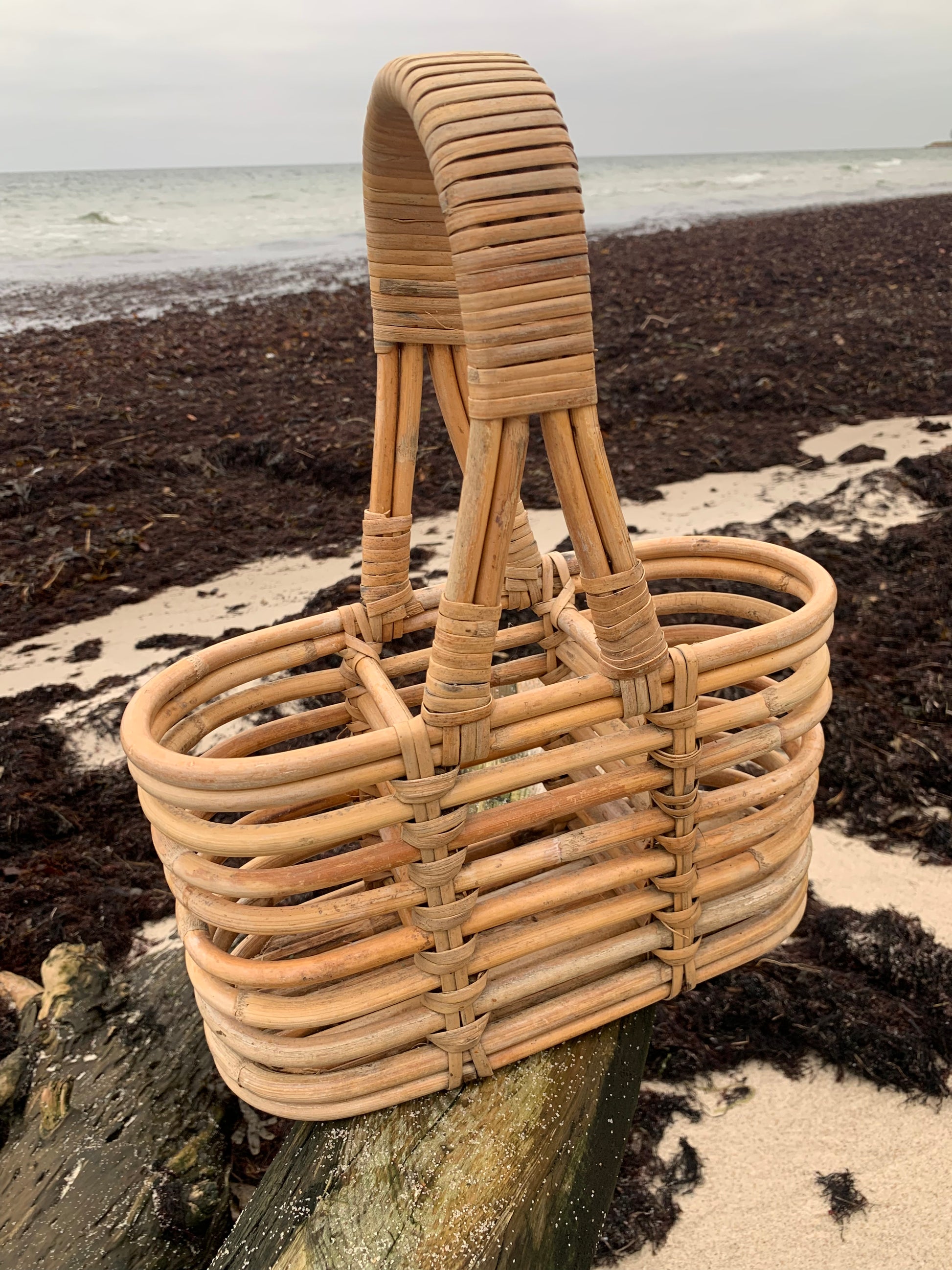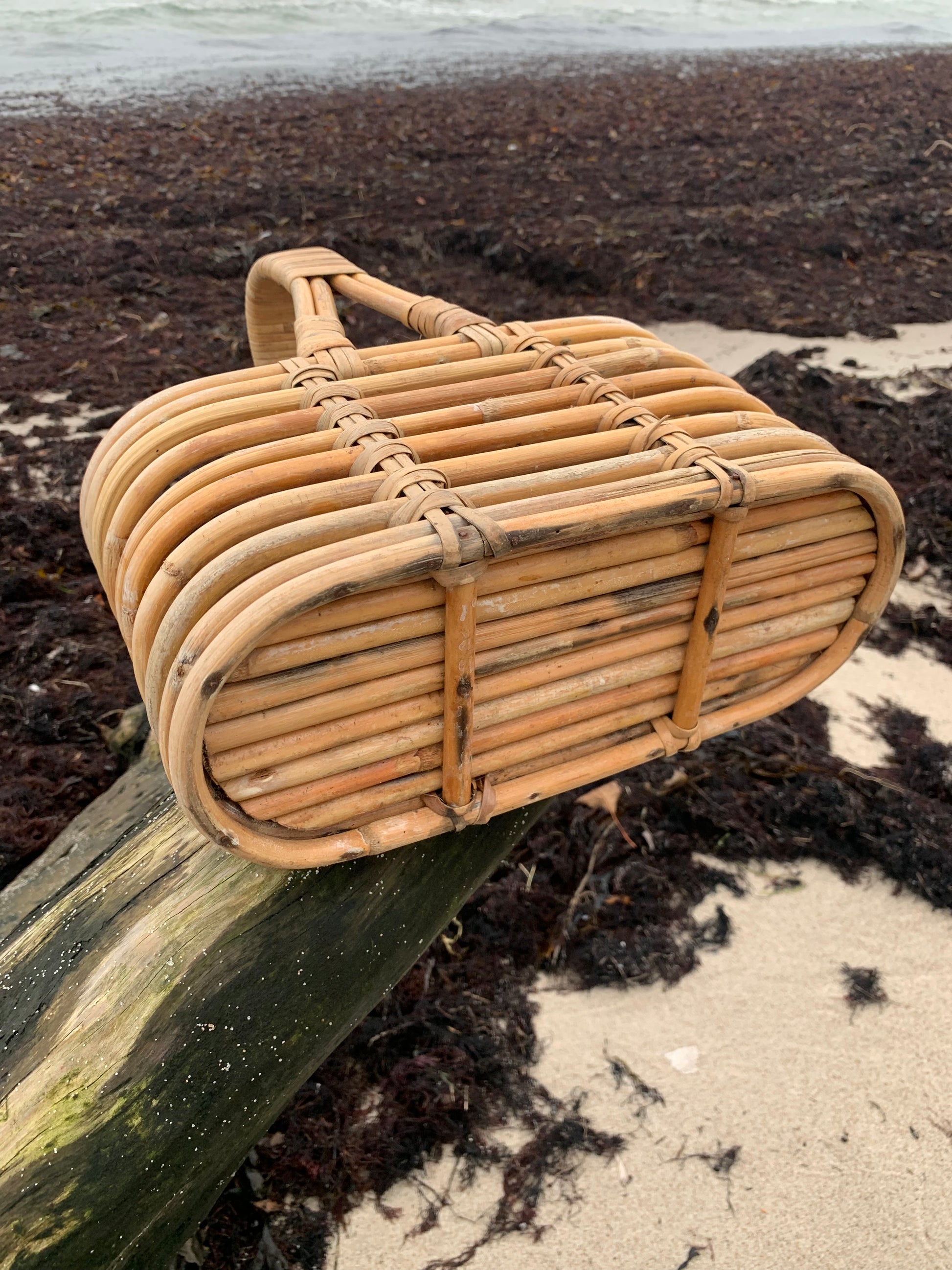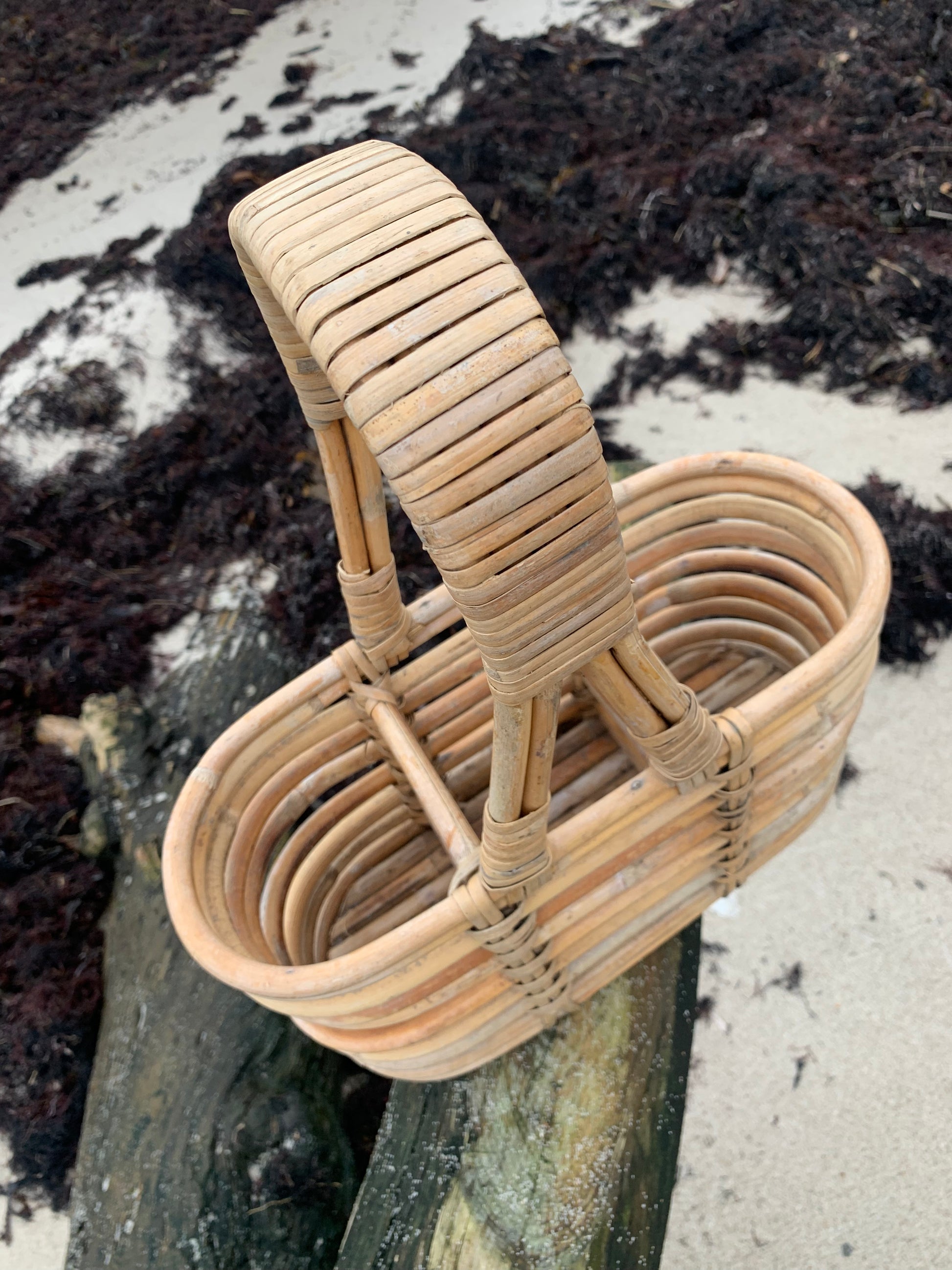 Skøn flaskekurv i bambus. Den skønne kurv er fundet i Frankrig.