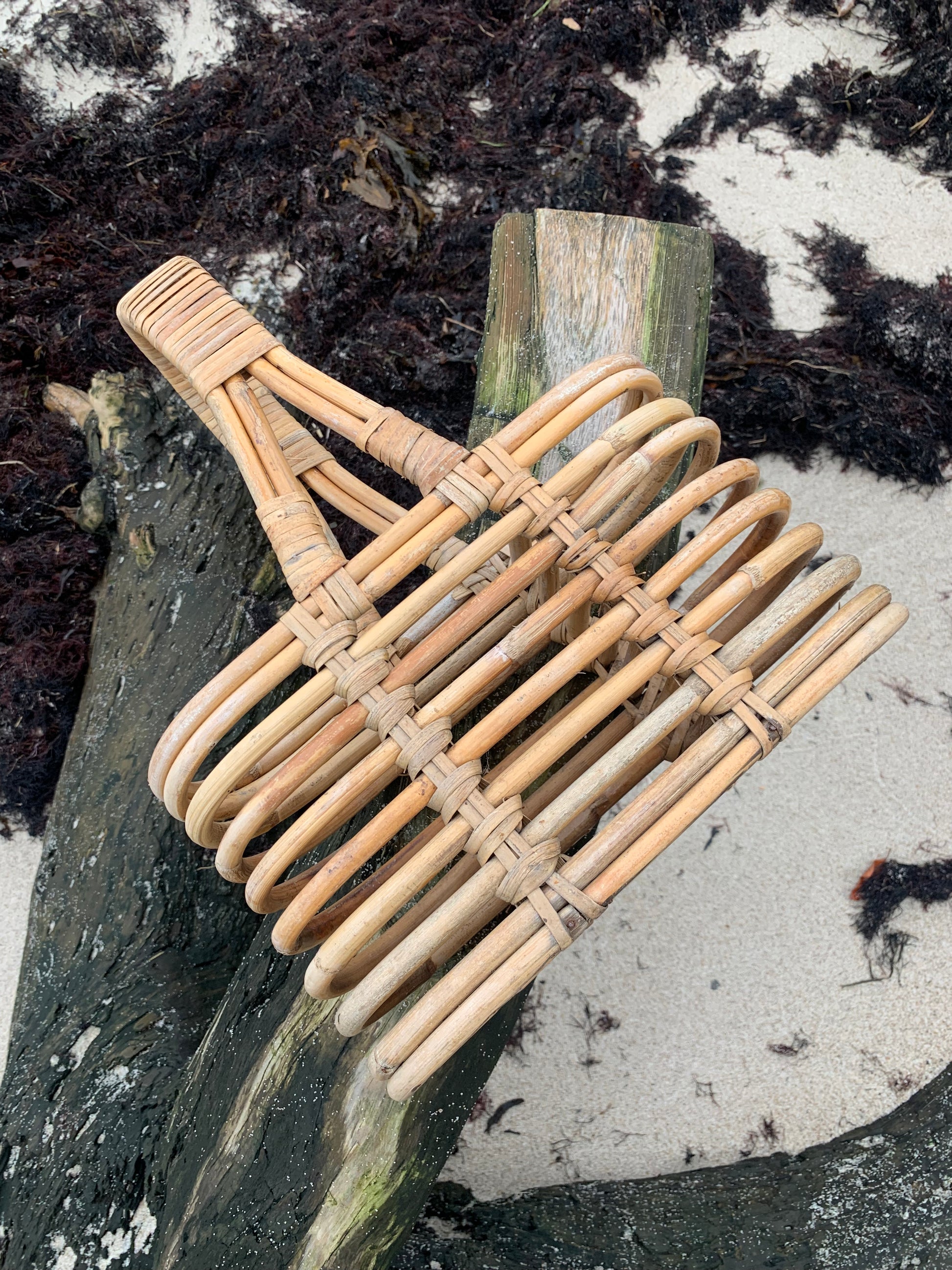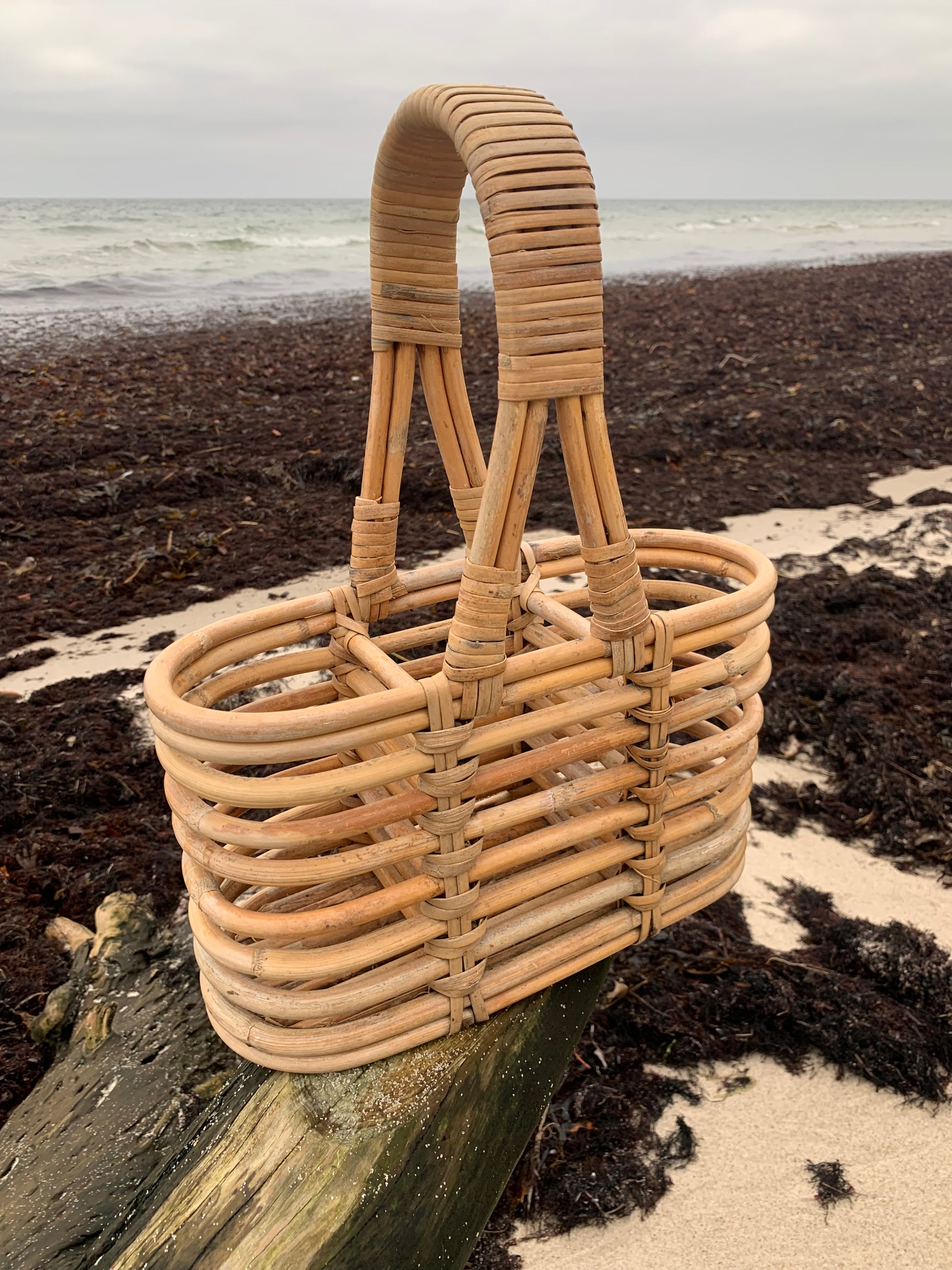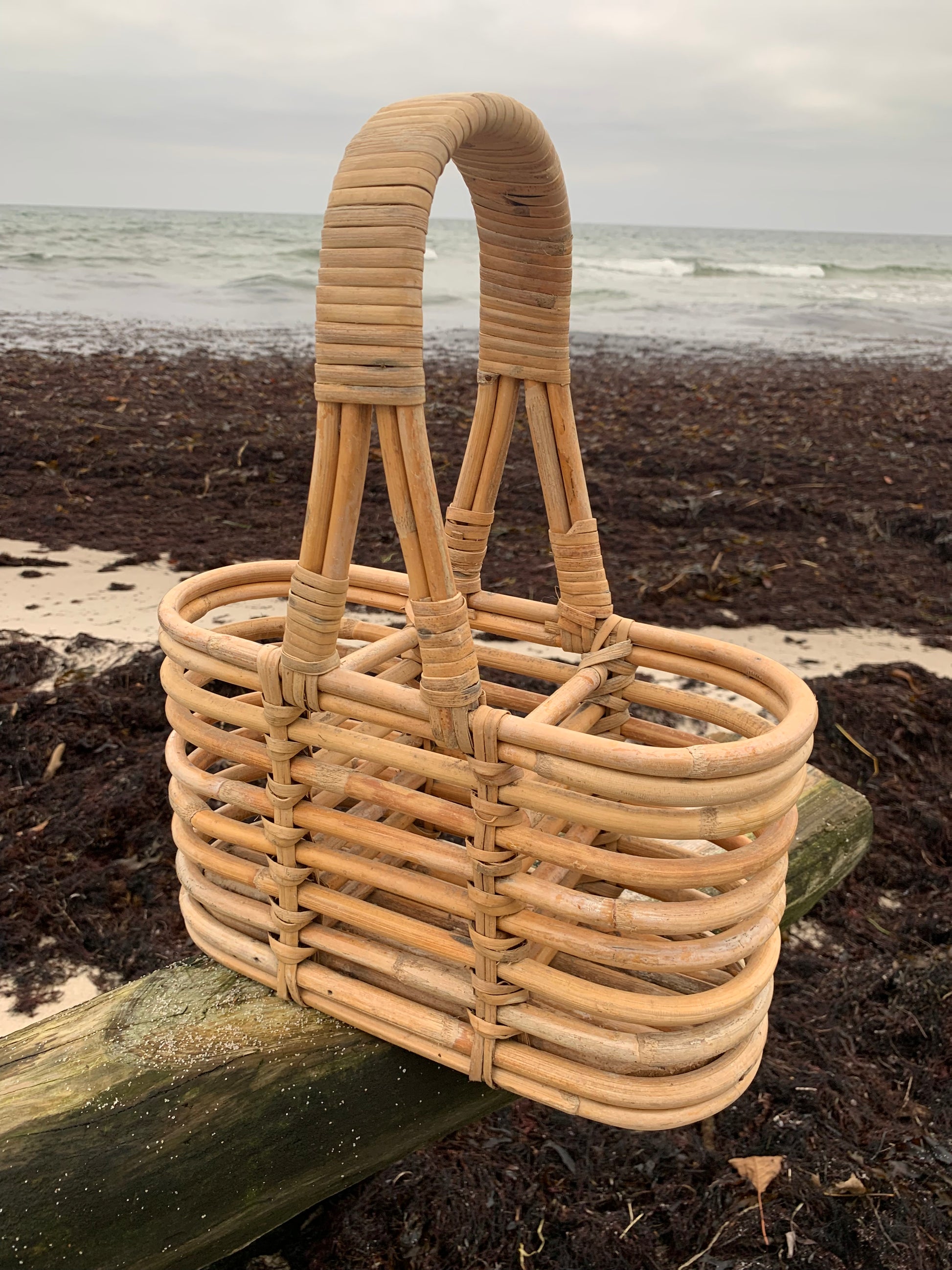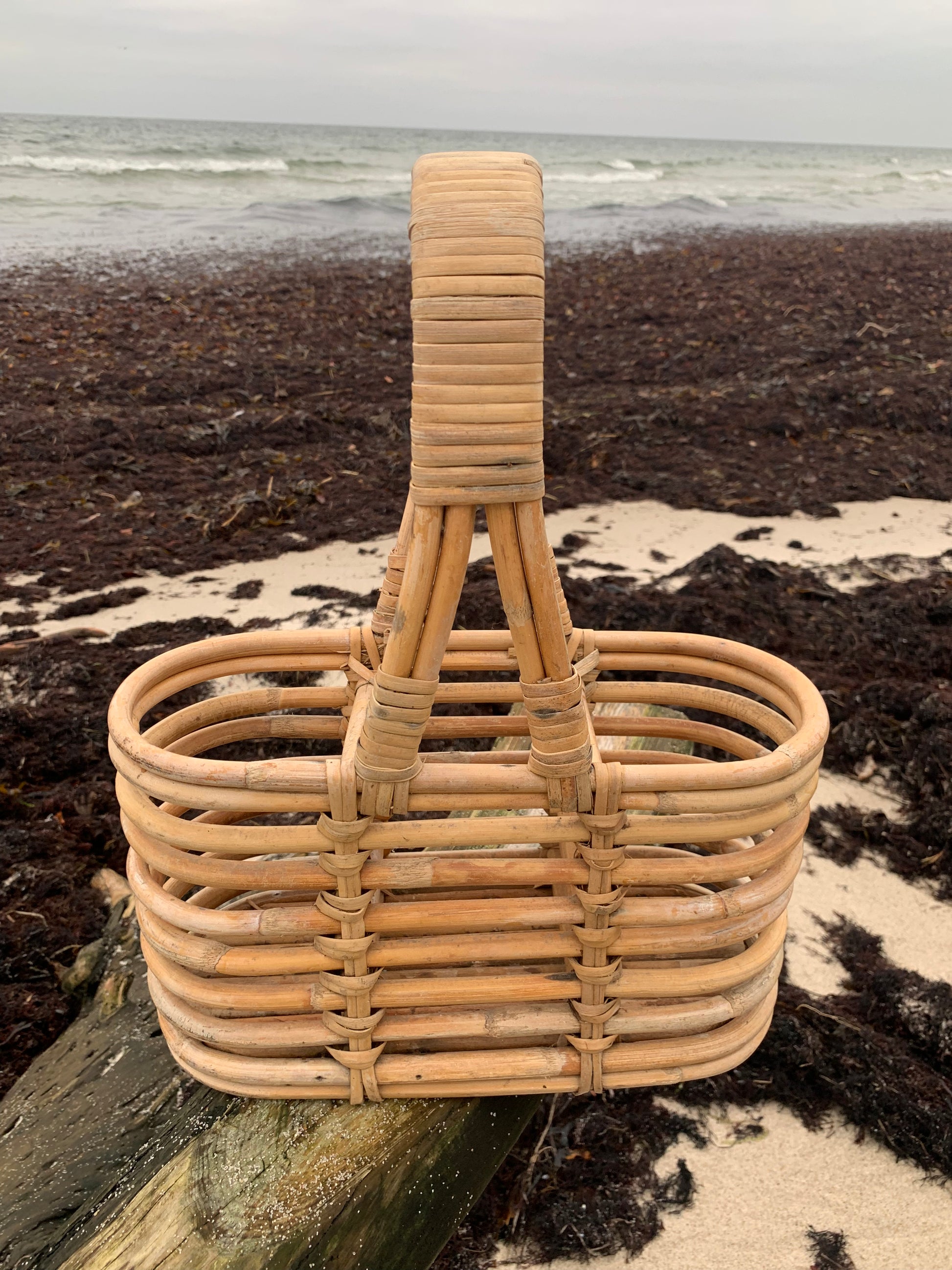Skøn flaskekurv i bambus. Den skønne kurv er fundet i Frankrig.
