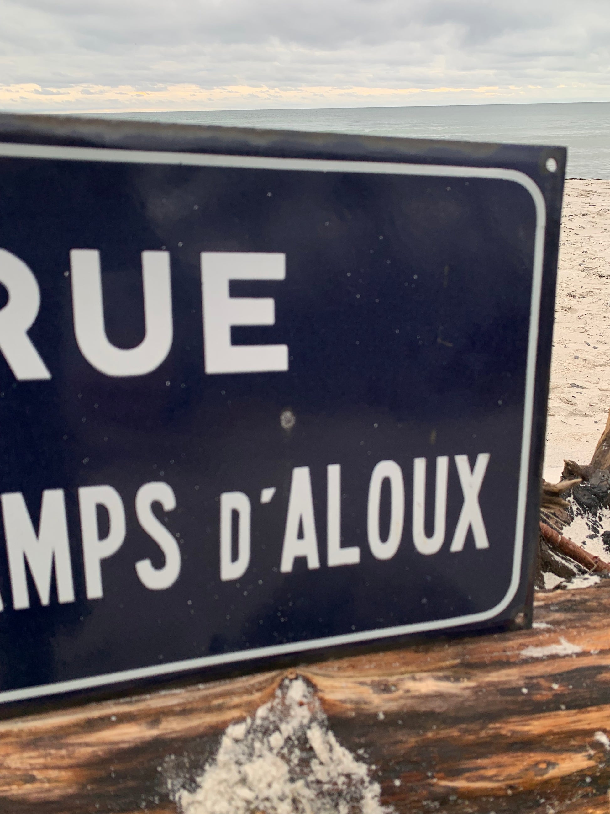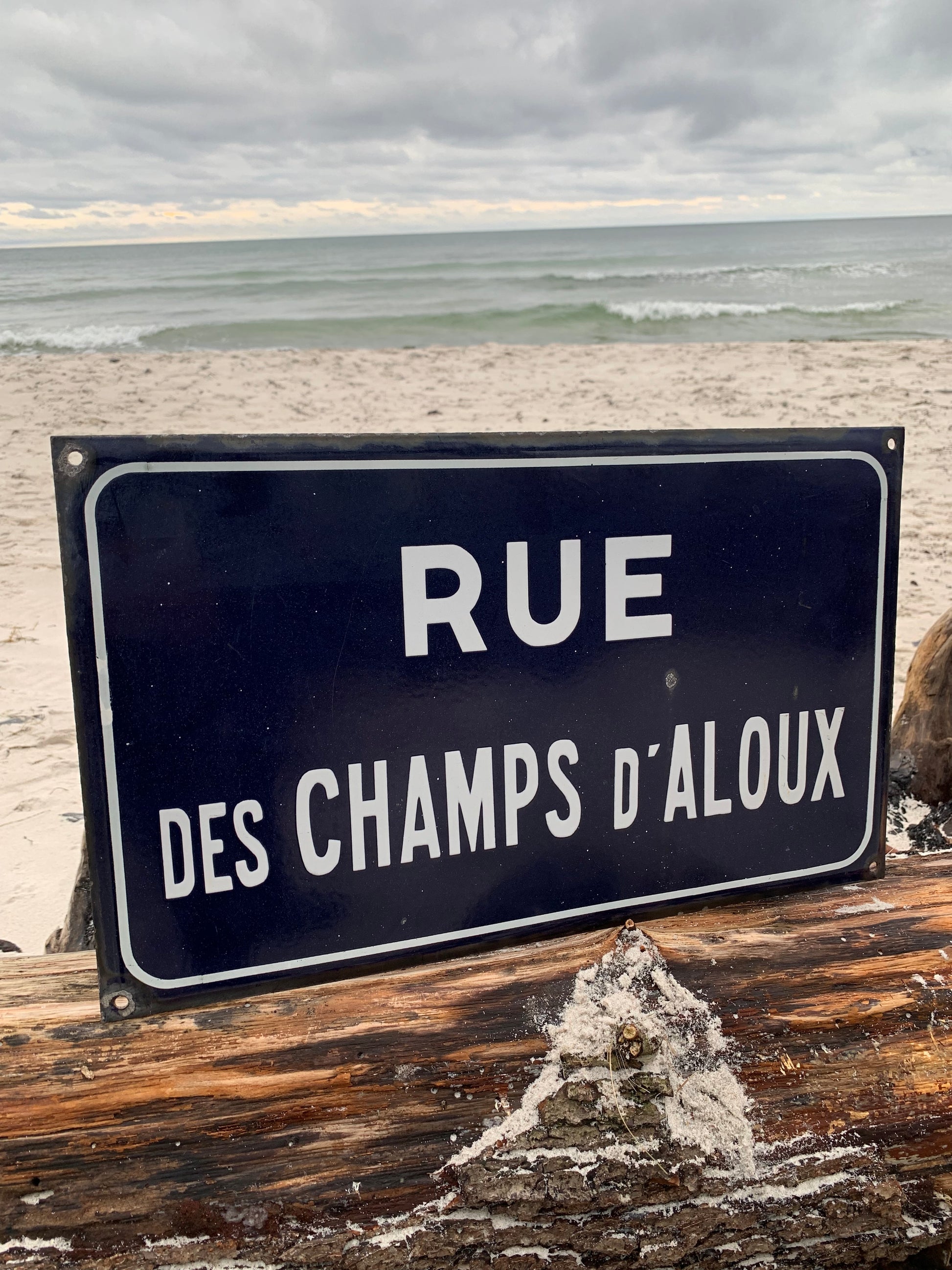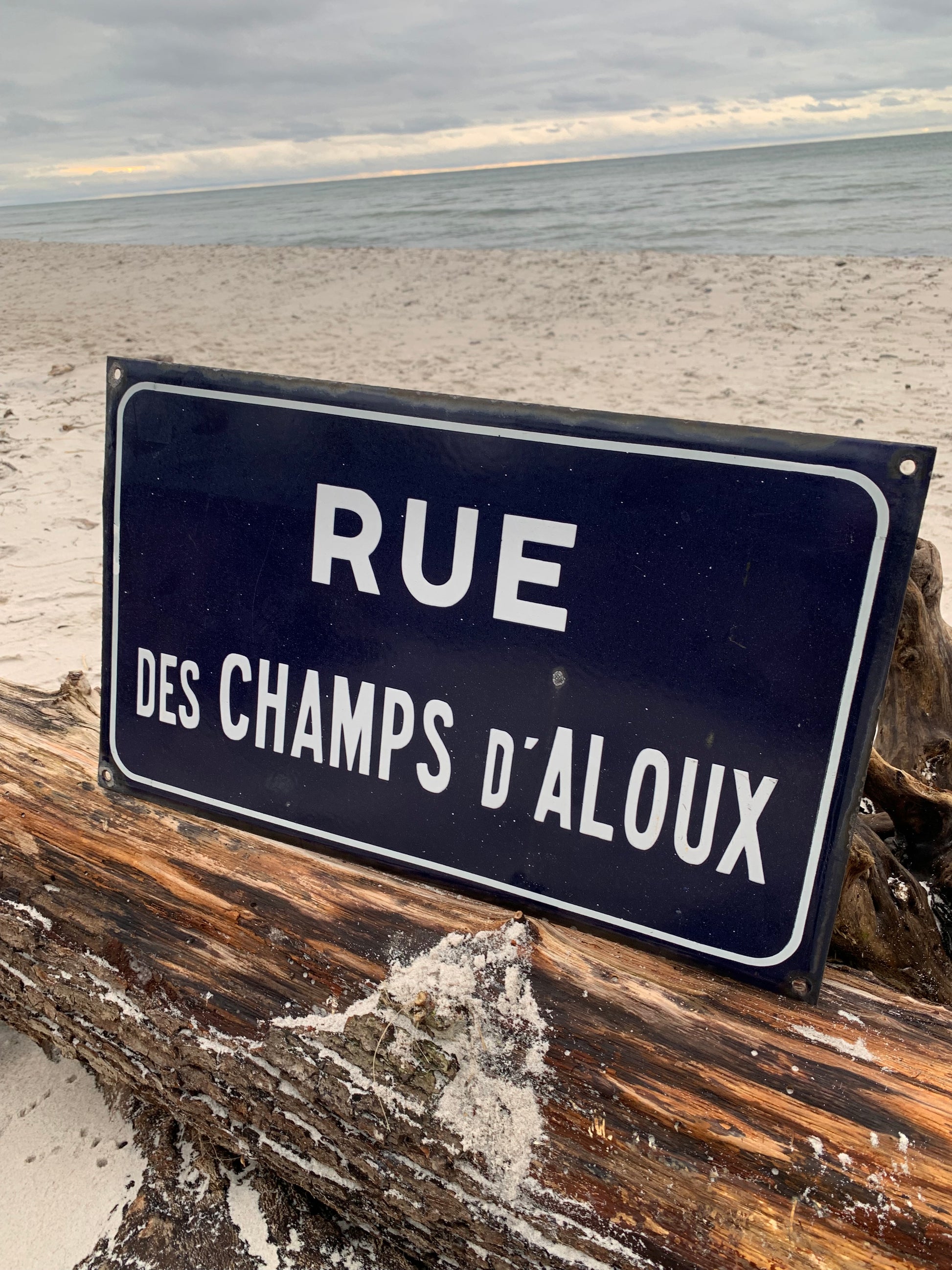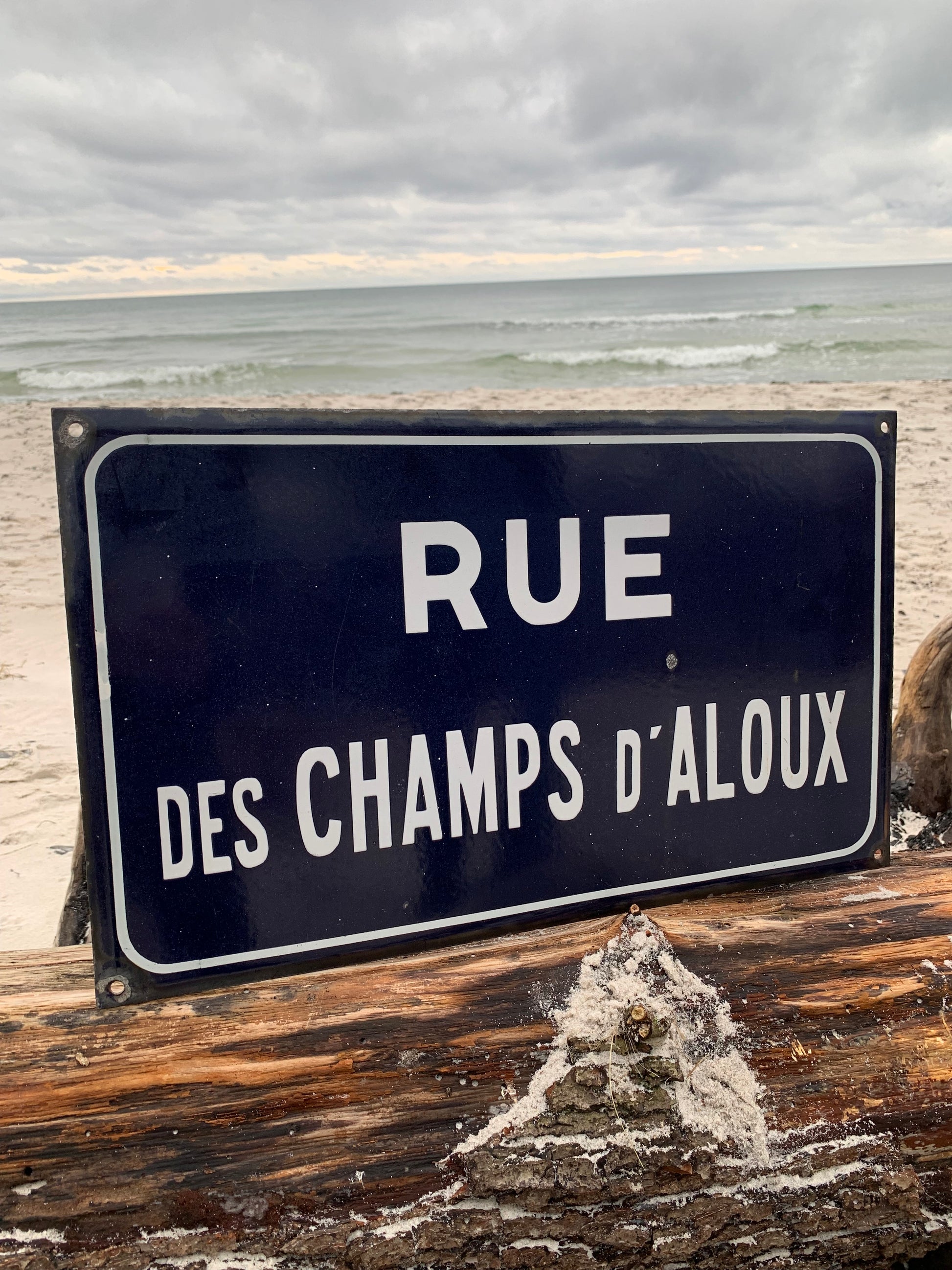 Emaljeskilt fra Frankrig “RUE DES CHAMPS d’ALOUX” Skiltet har aldersrelatede brugsspor på den charmerende måde.