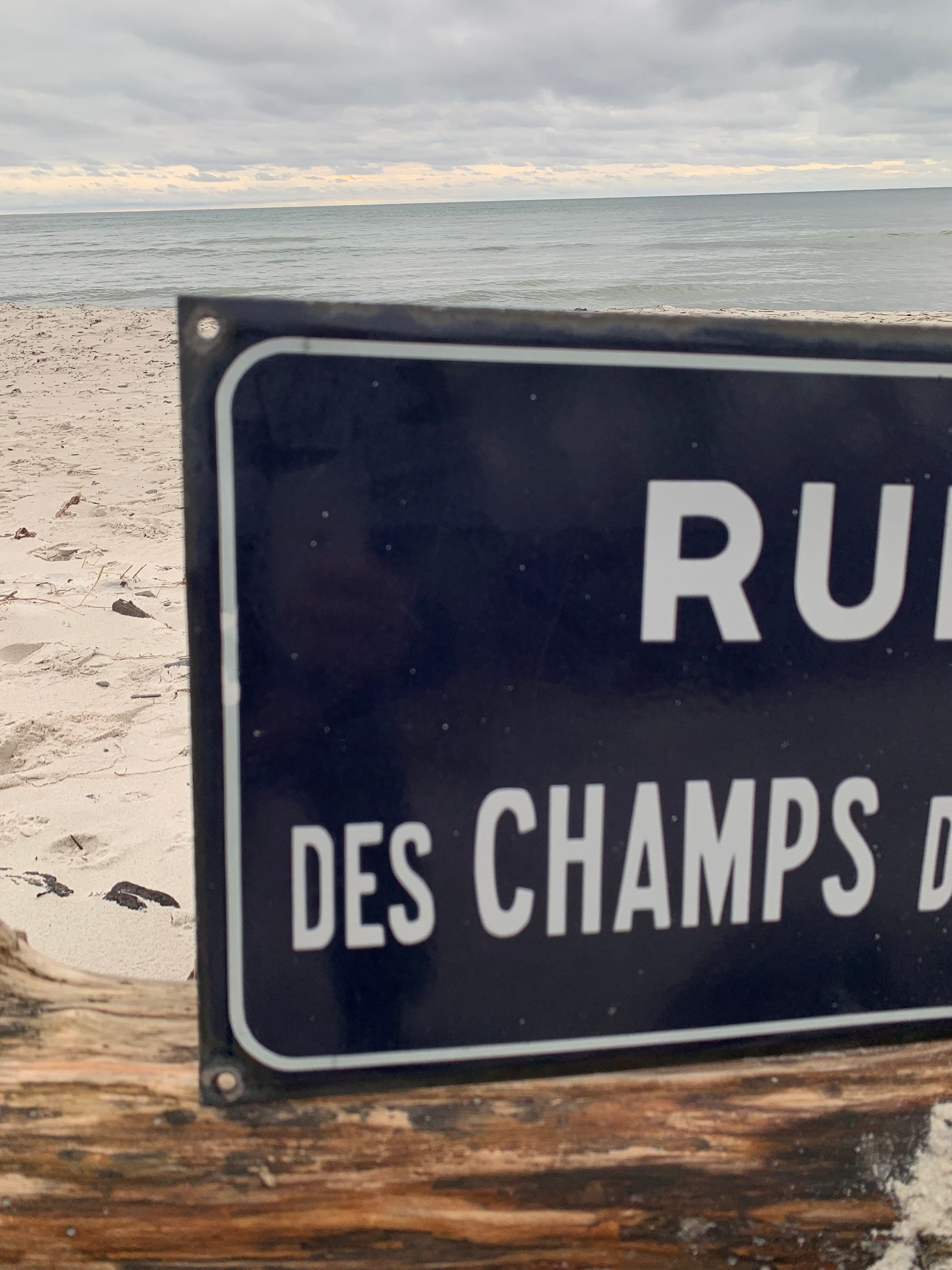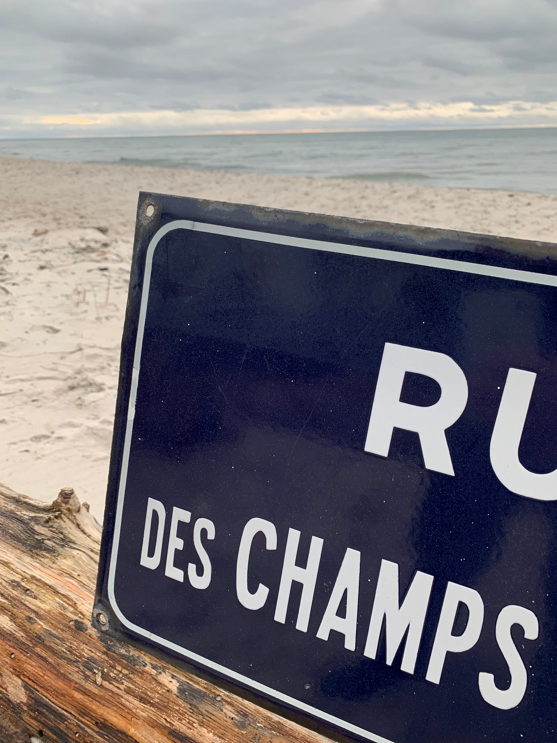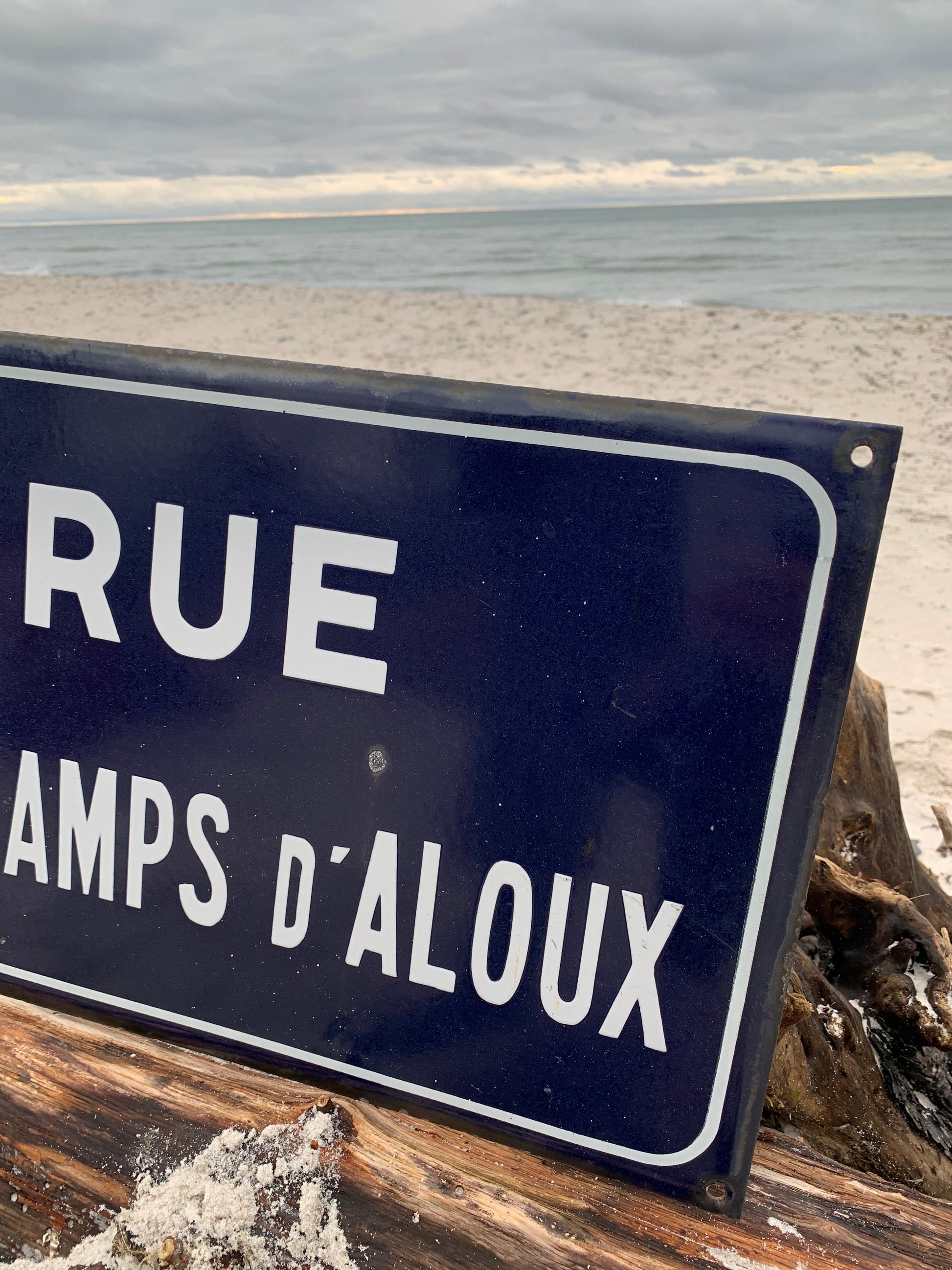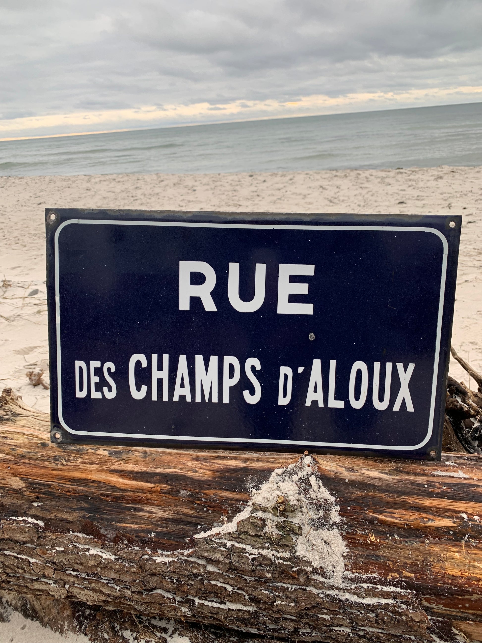 Emaljeskilt fra Frankrig “RUE DES CHAMPS d’ALOUX” Skiltet har aldersrelatede brugsspor på den charmerende måde.
