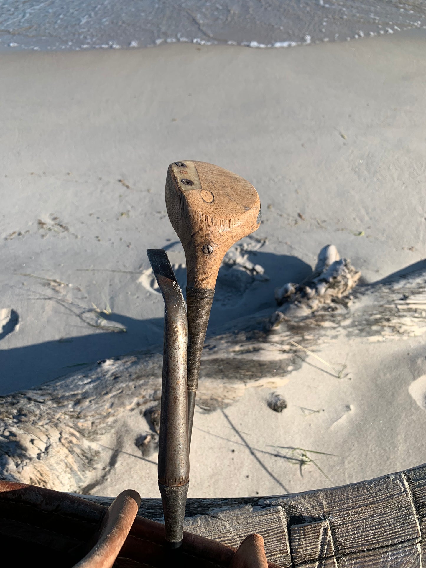 Der medfølger to gamle køller hvor den ene er i træ.