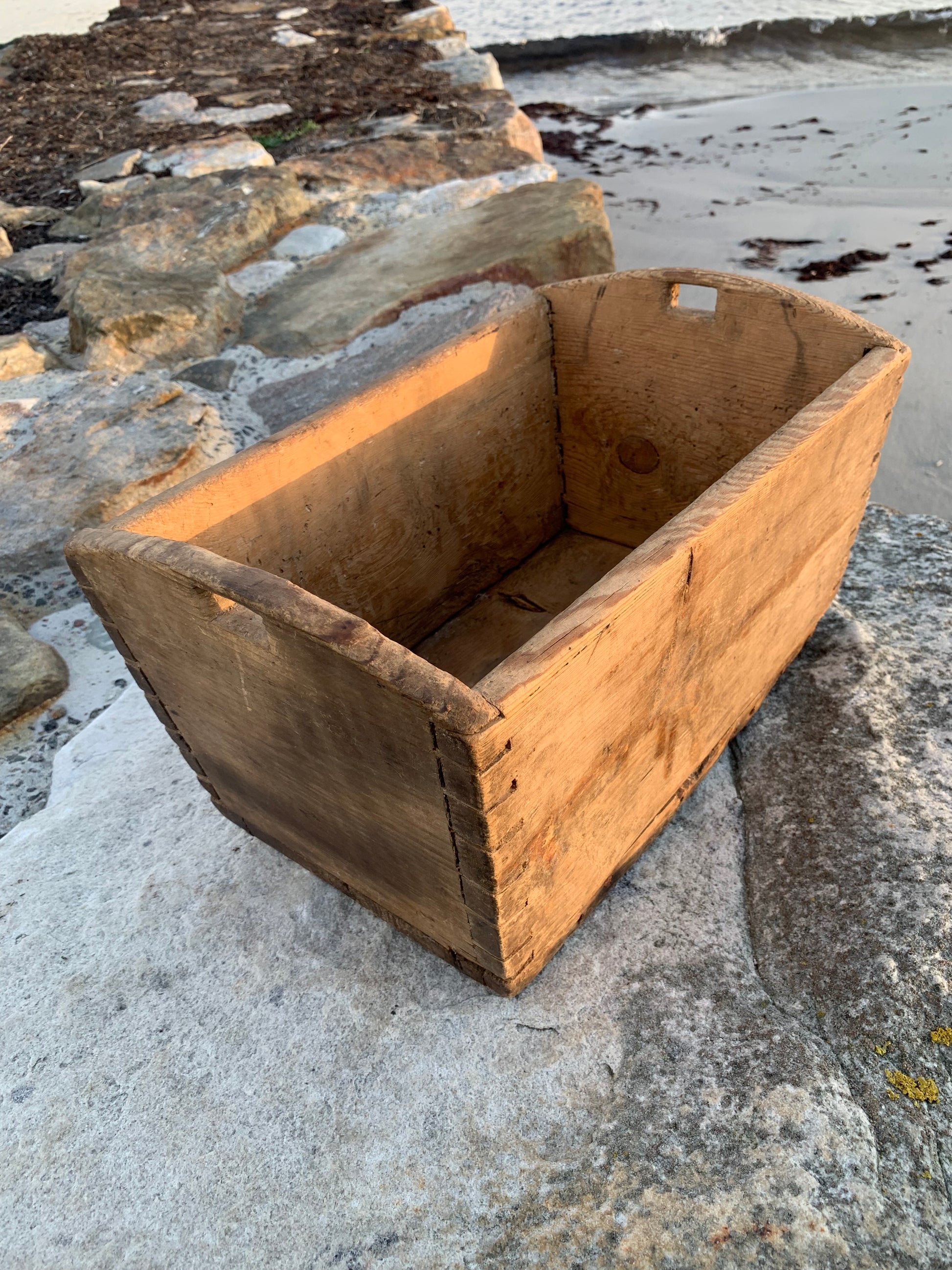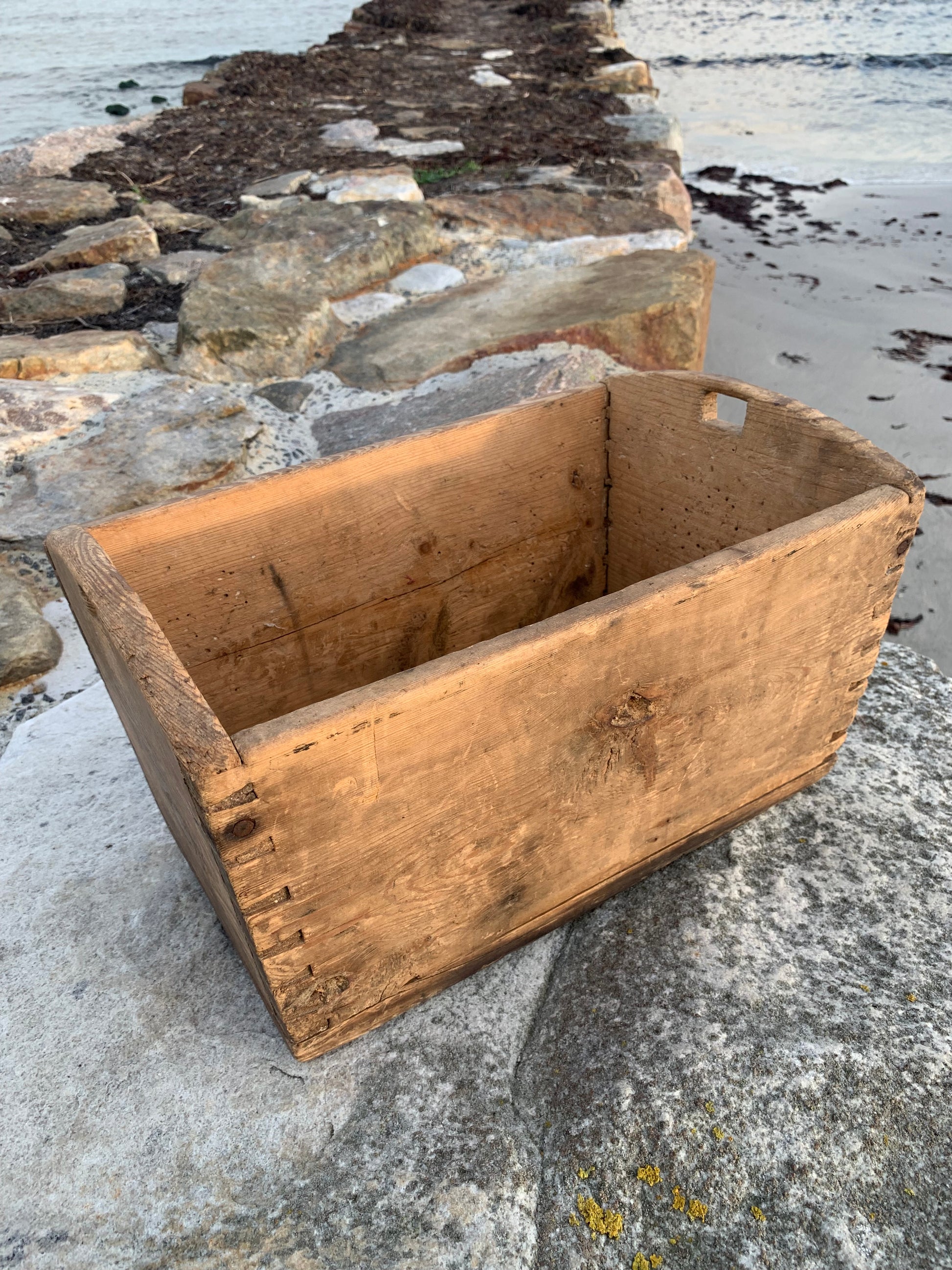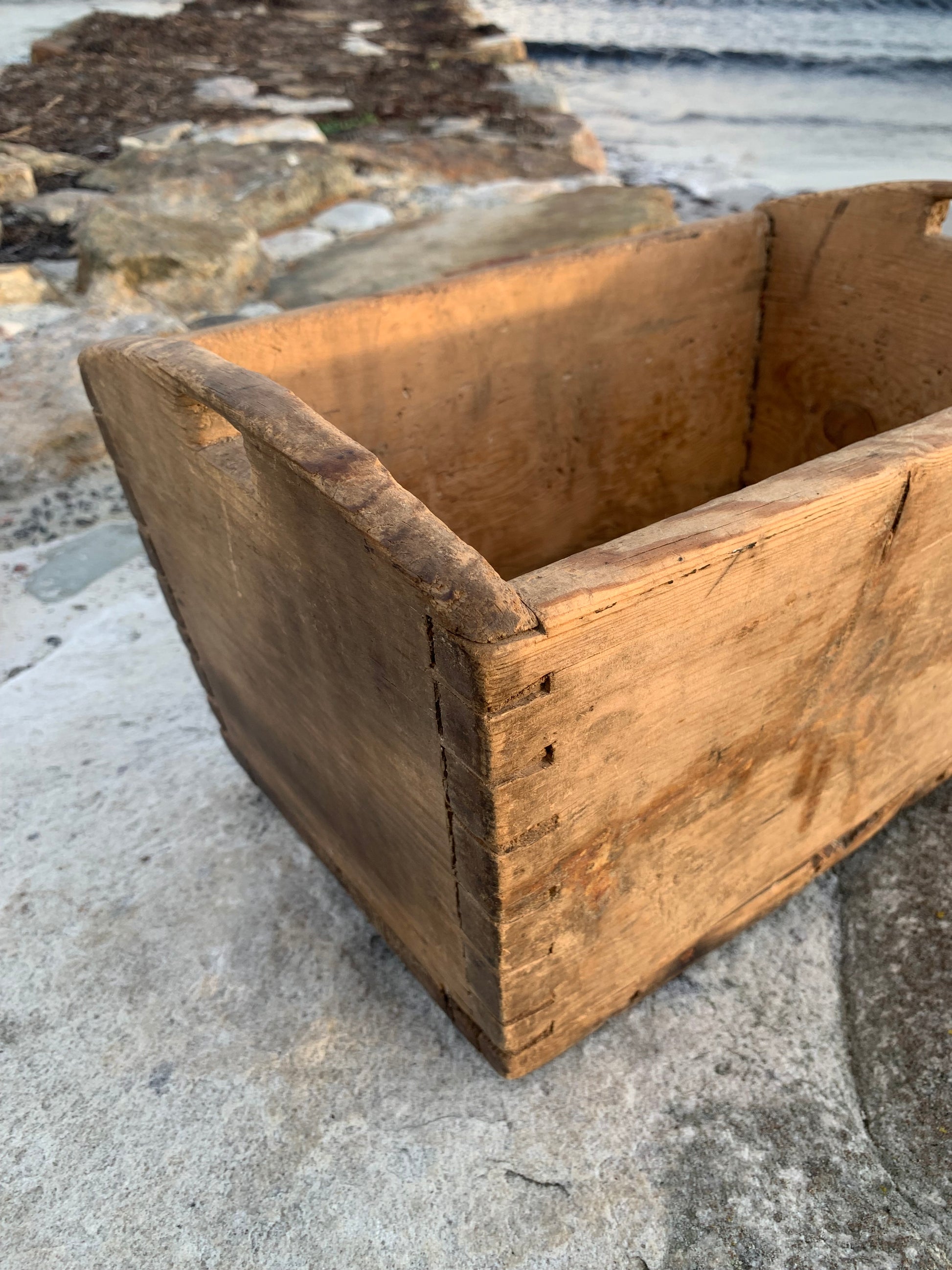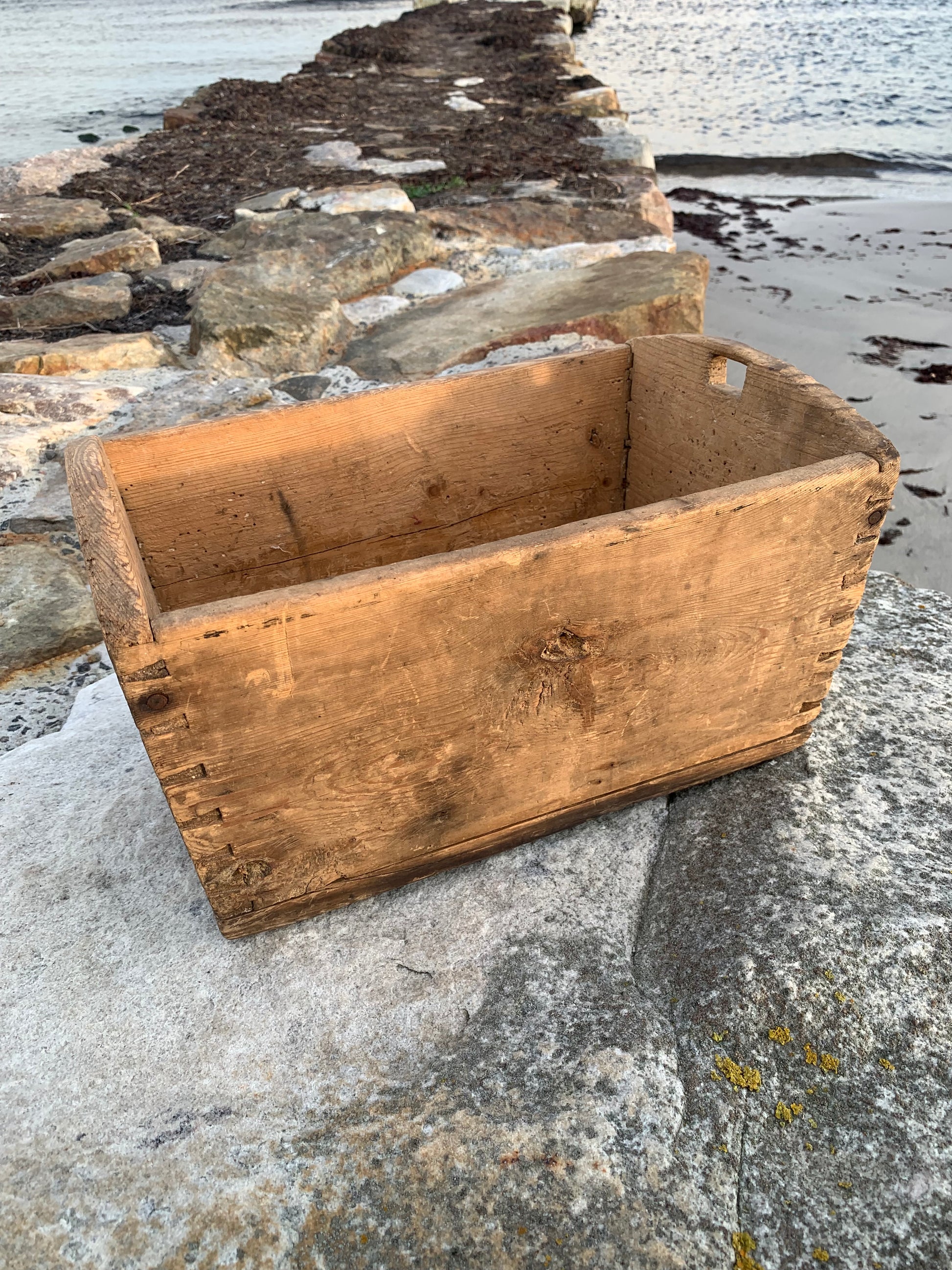 Gammel og meget charmerende trækasse med greb. Kassen har nogle fine håndværksmæssige detaljer, (er tappet sammen i hjørnerne) derudover har den et udtryk som det har taget mange år at opnå.