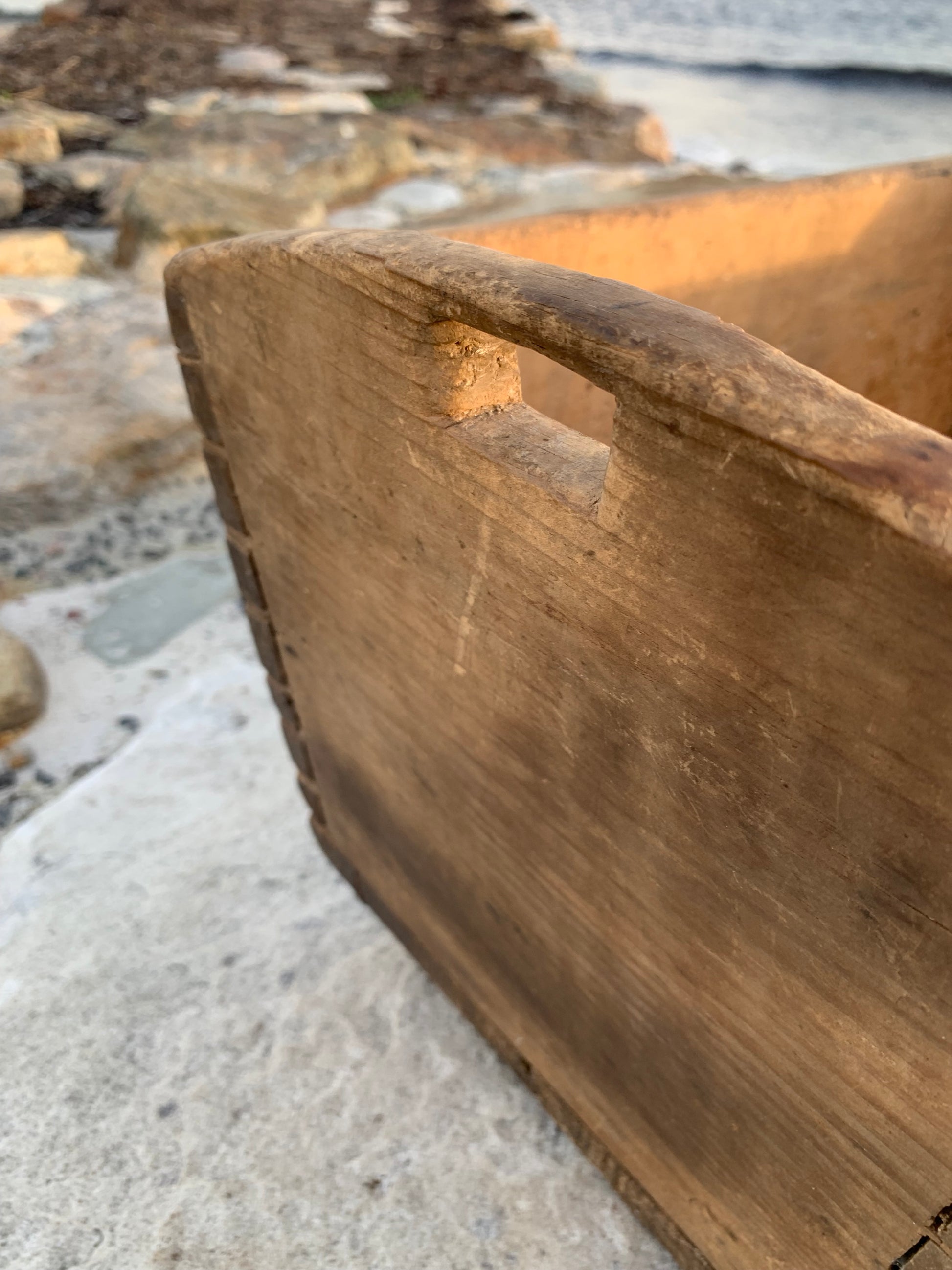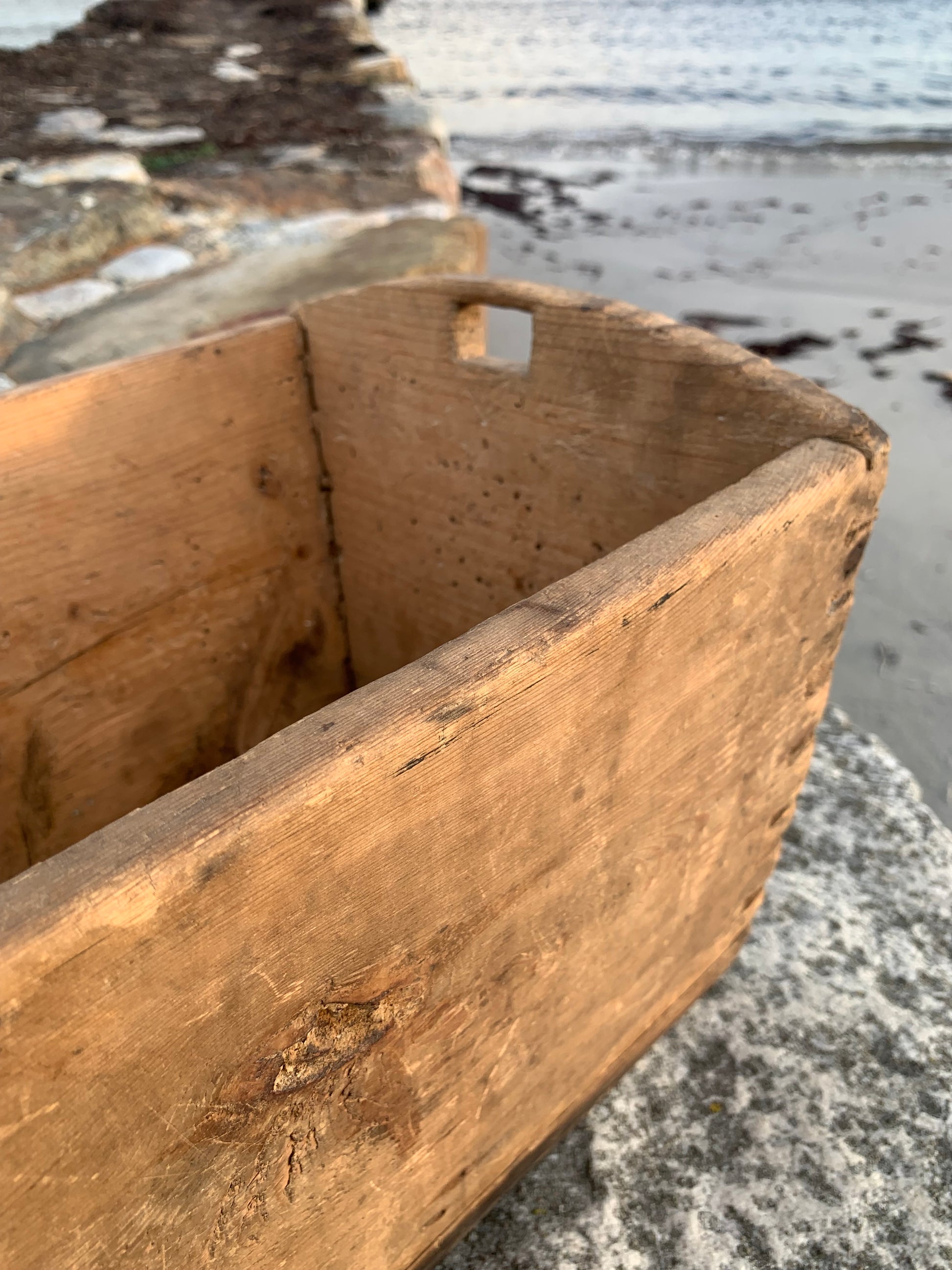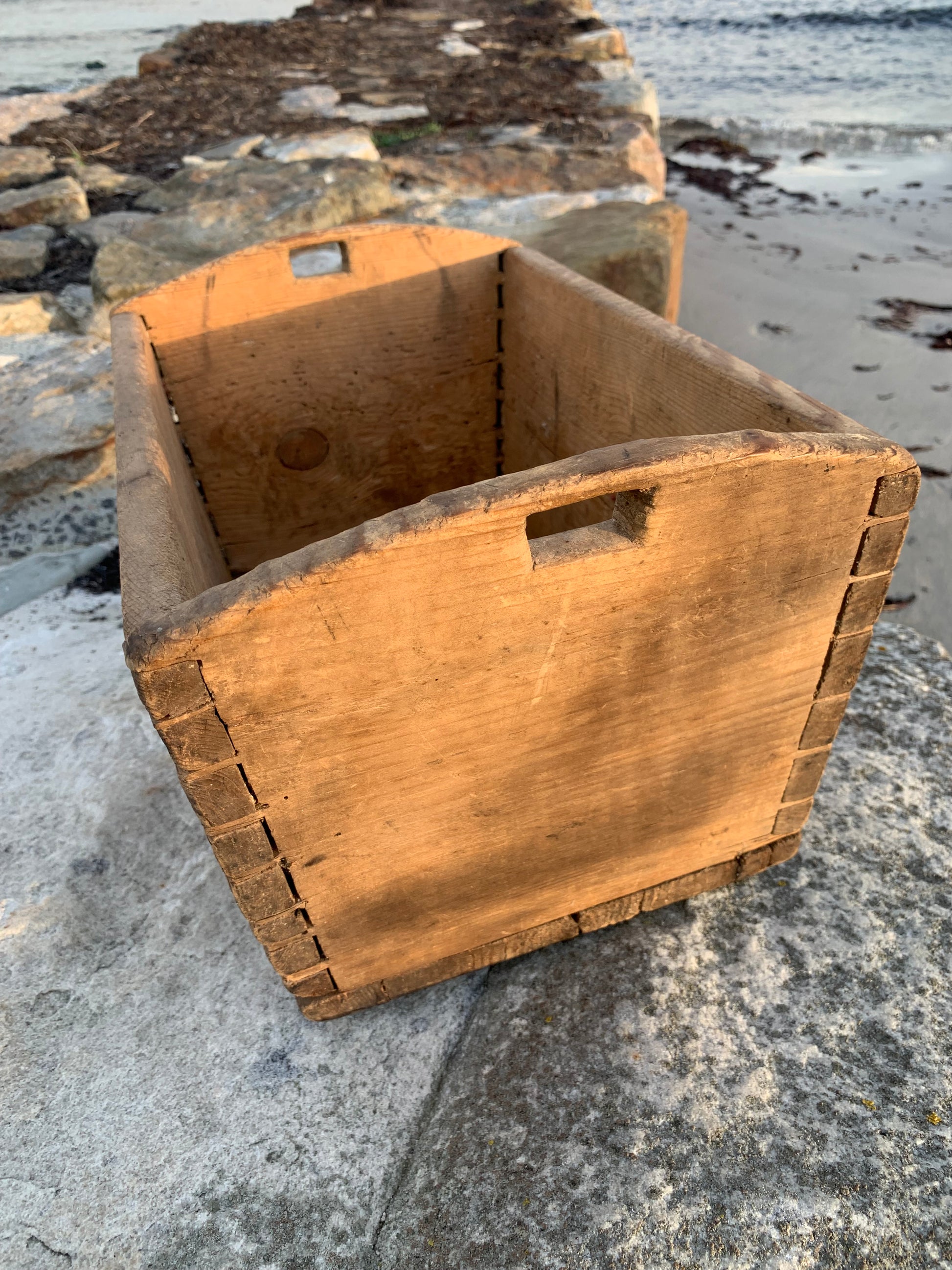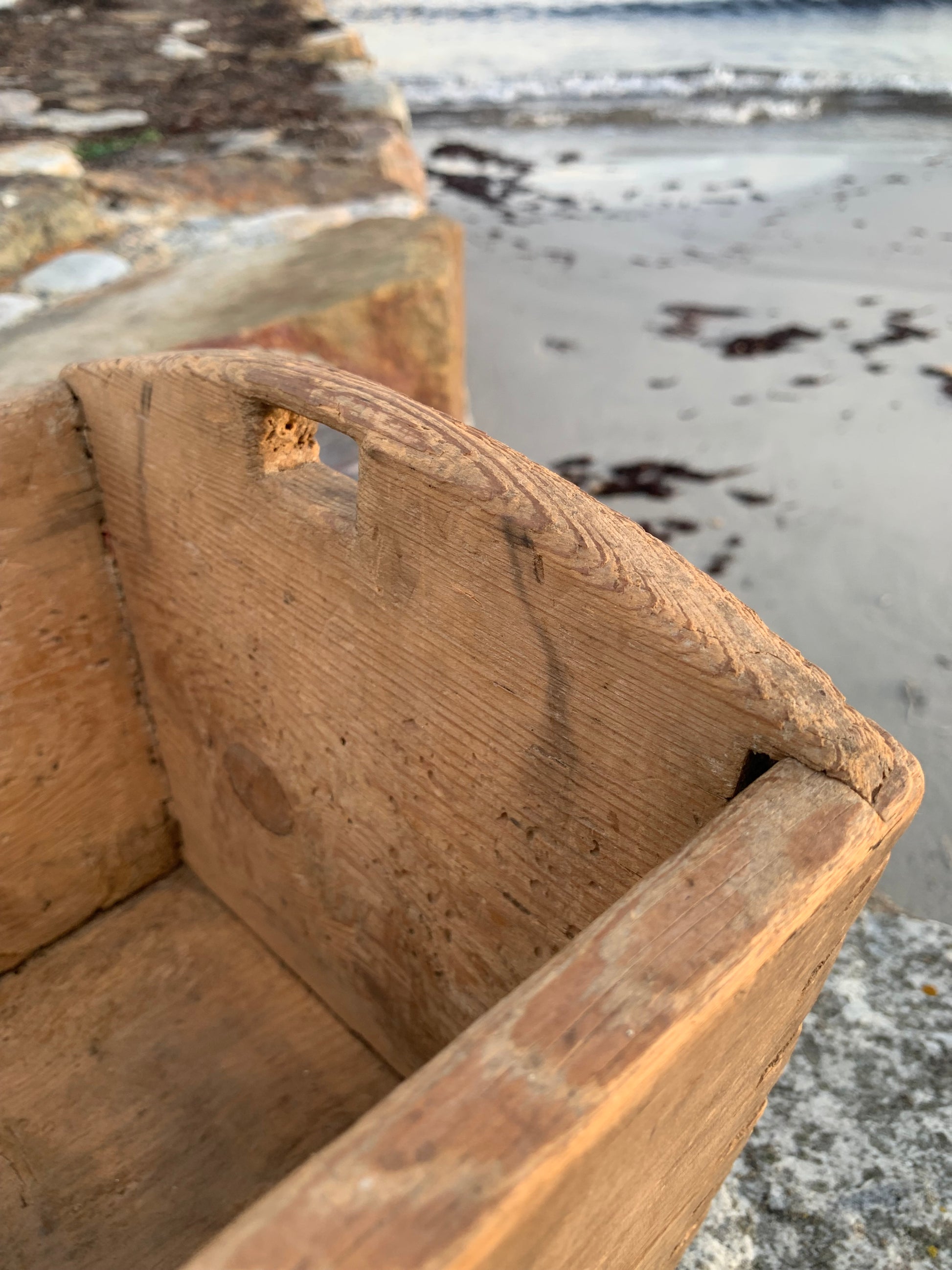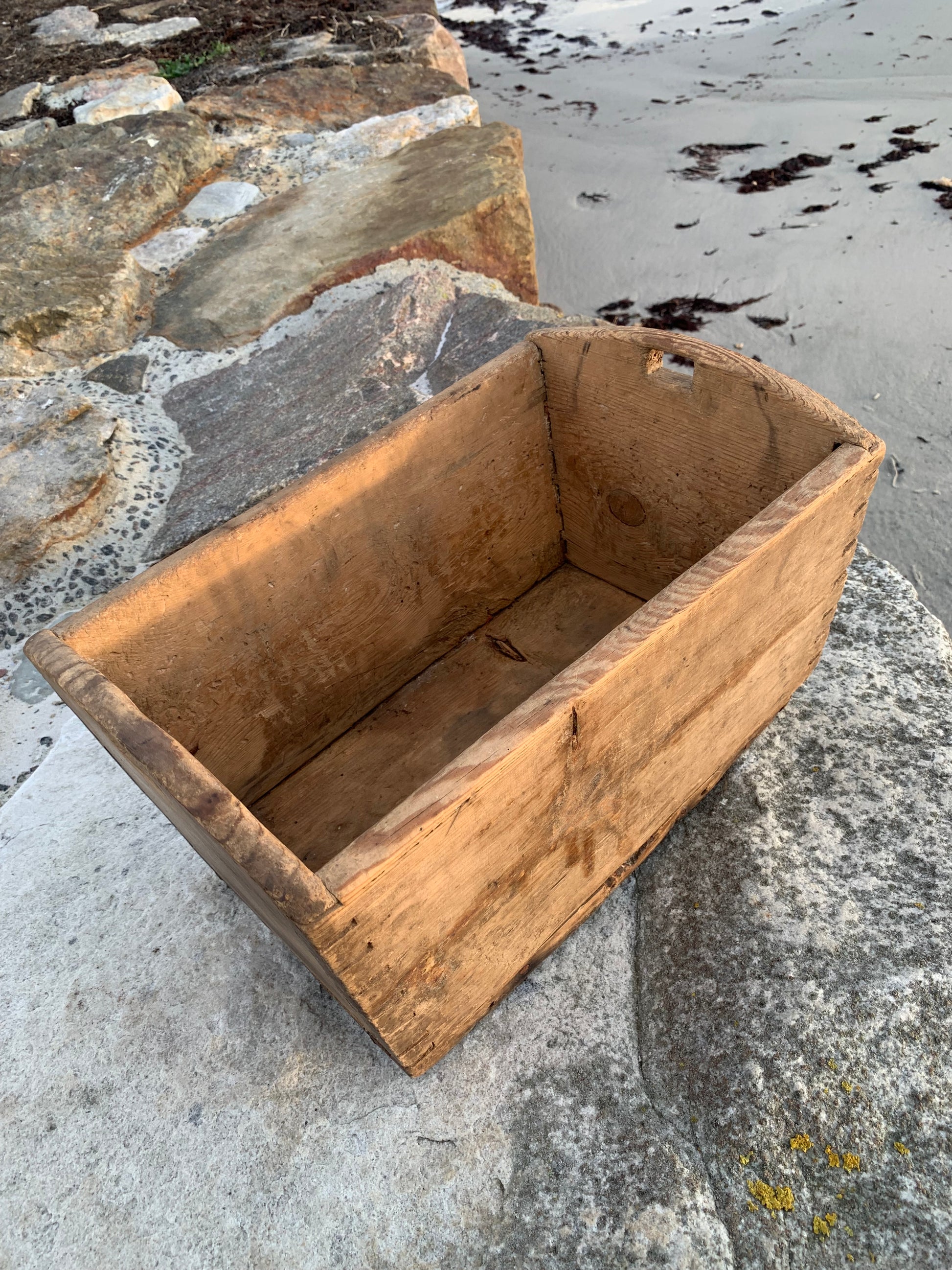 Gammel og meget charmerende trækasse med greb. Kassen har nogle fine håndværksmæssige detaljer, (er tappet sammen i hjørnerne) derudover har den et udtryk som det har taget mange år at opnå.