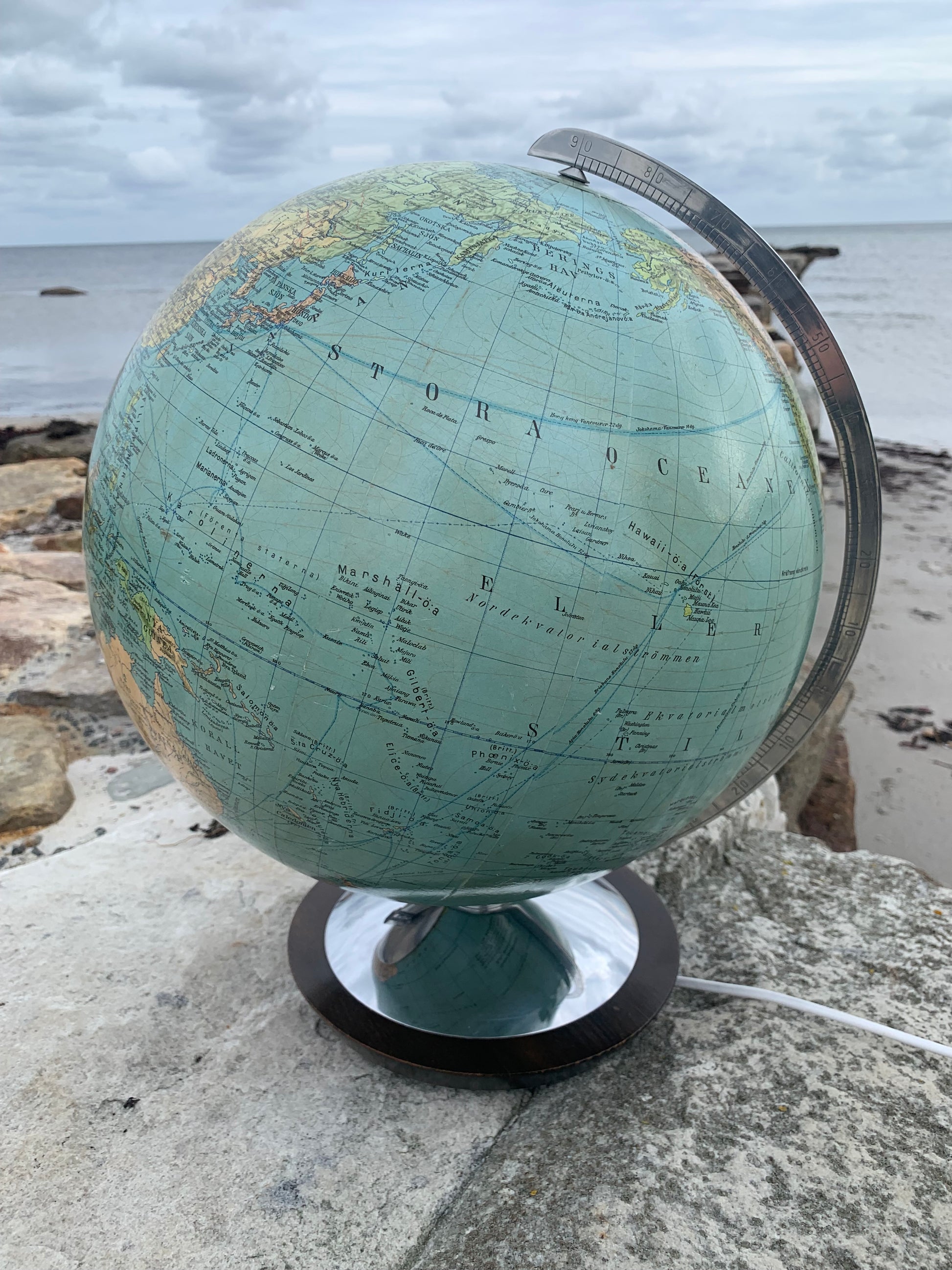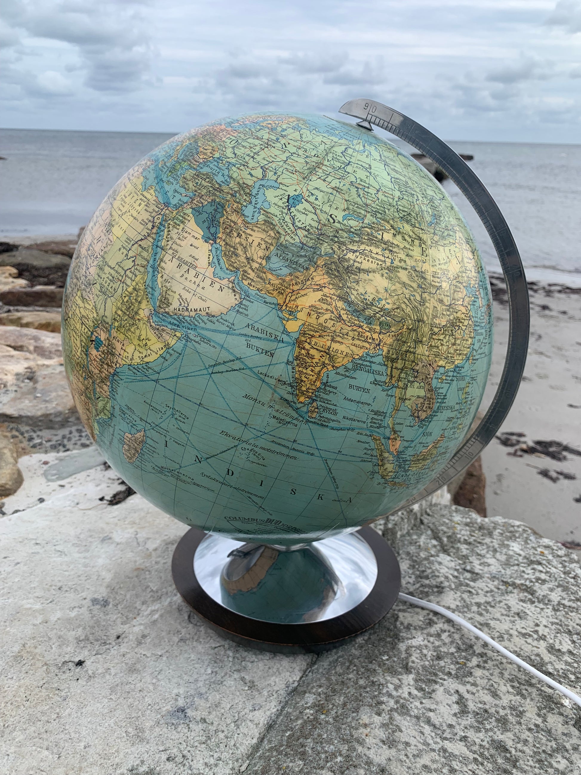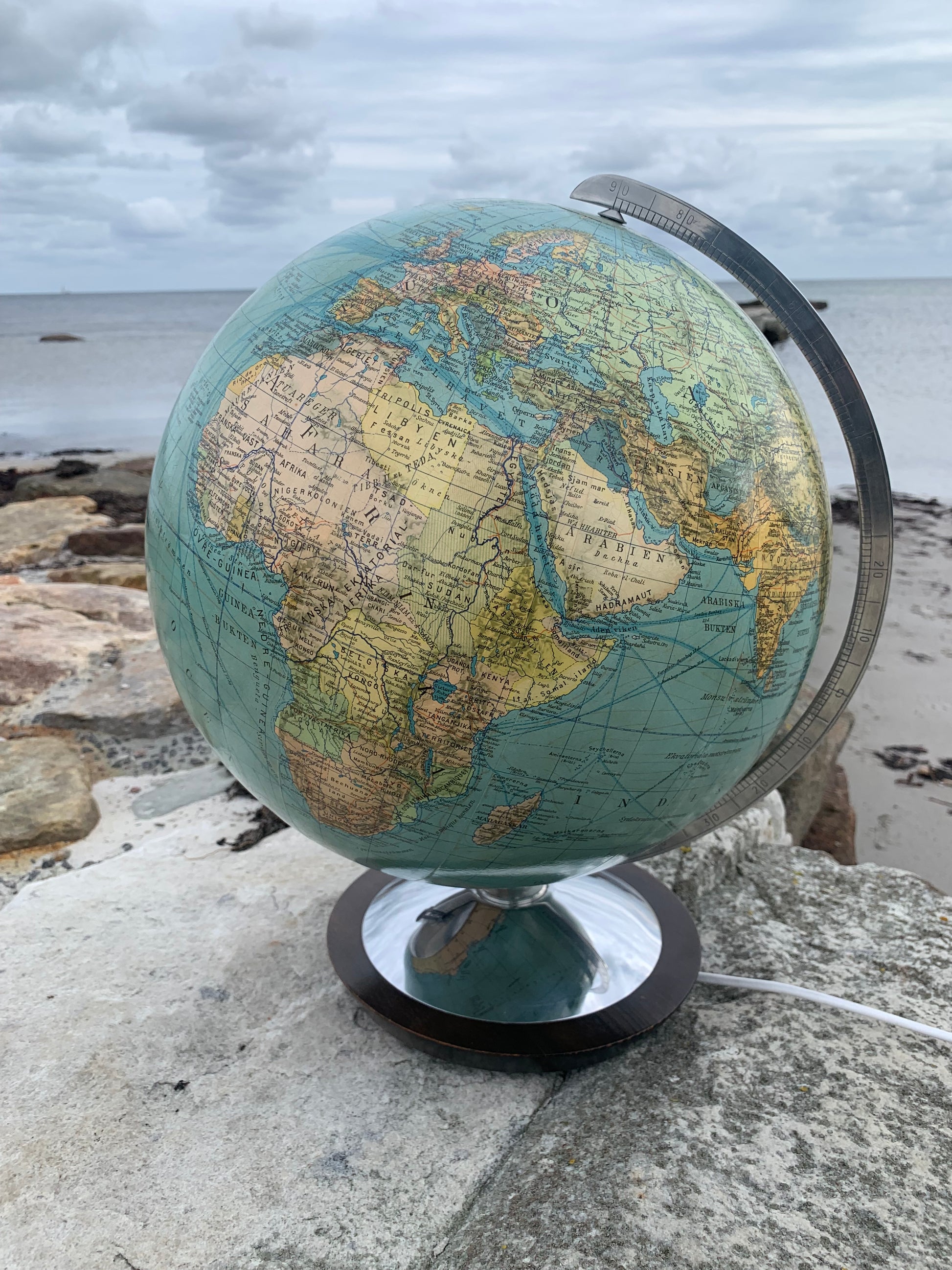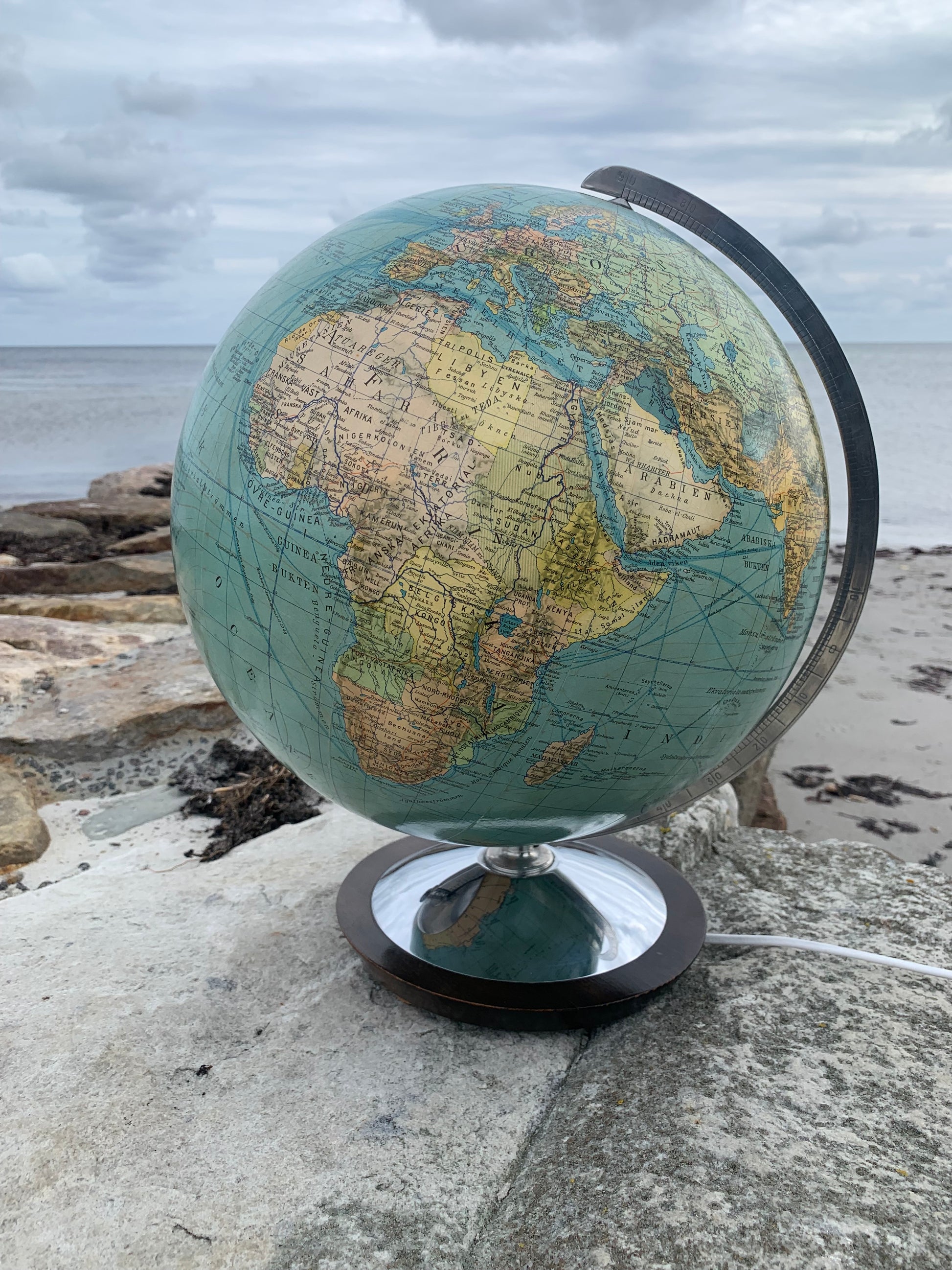 Fin gammel globus i glas. Tidens tand har bidt en smule i globusen der giver et flot lys når den er tændt.