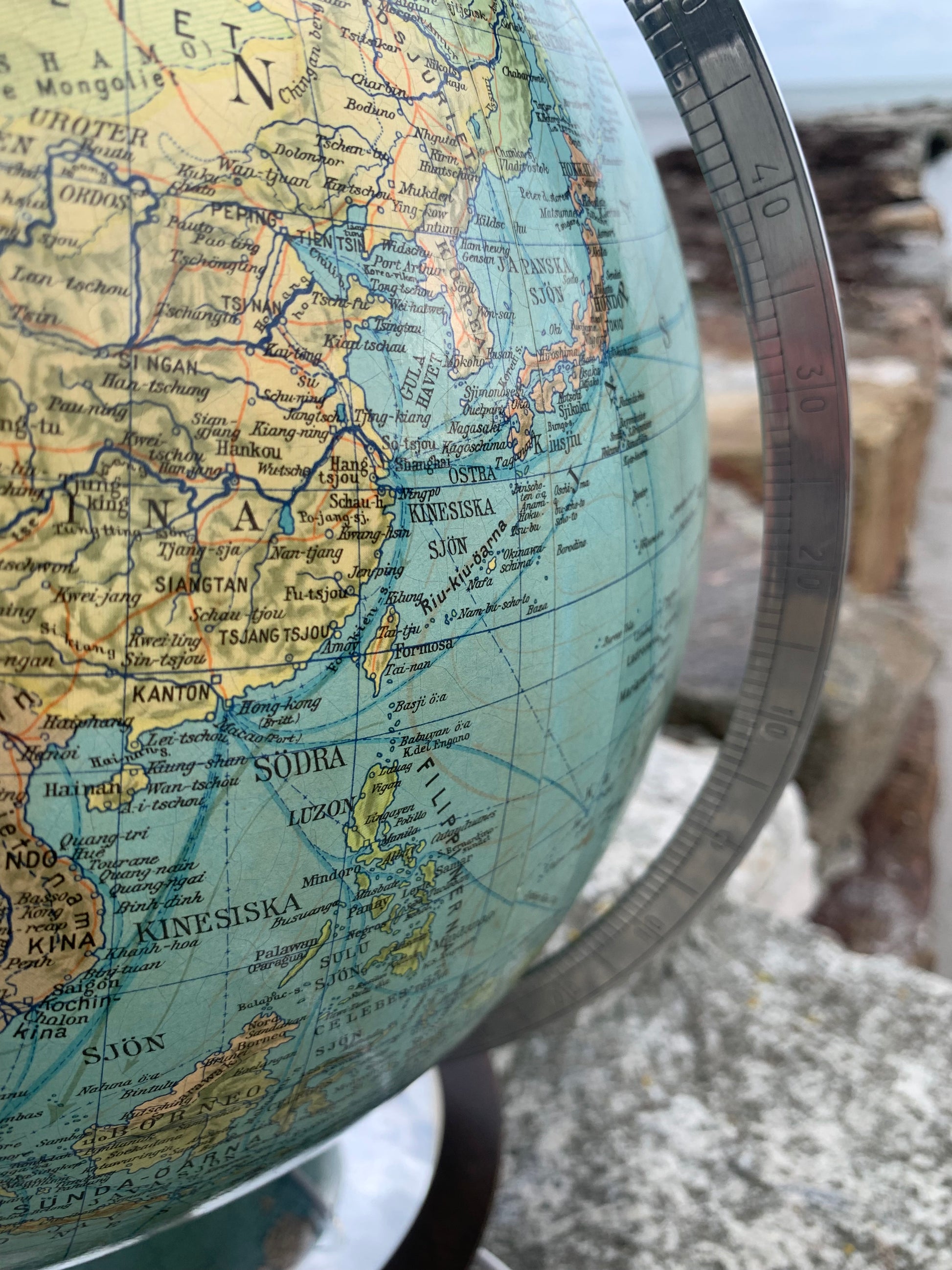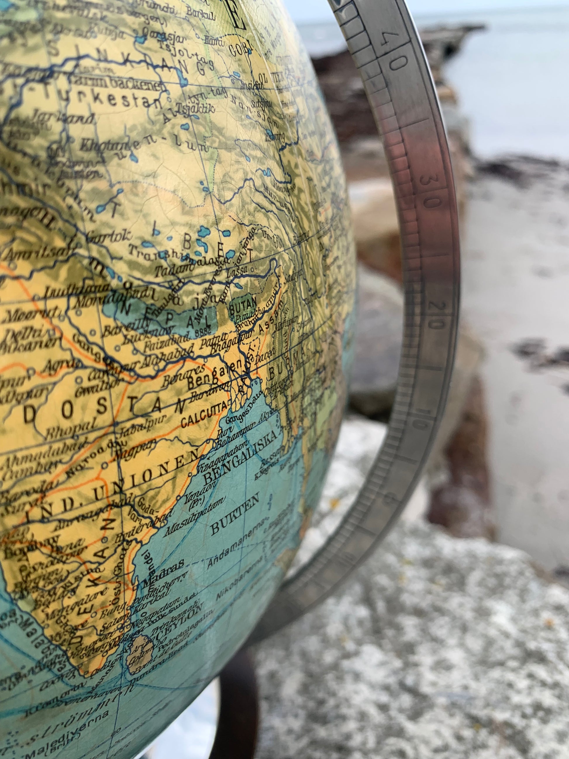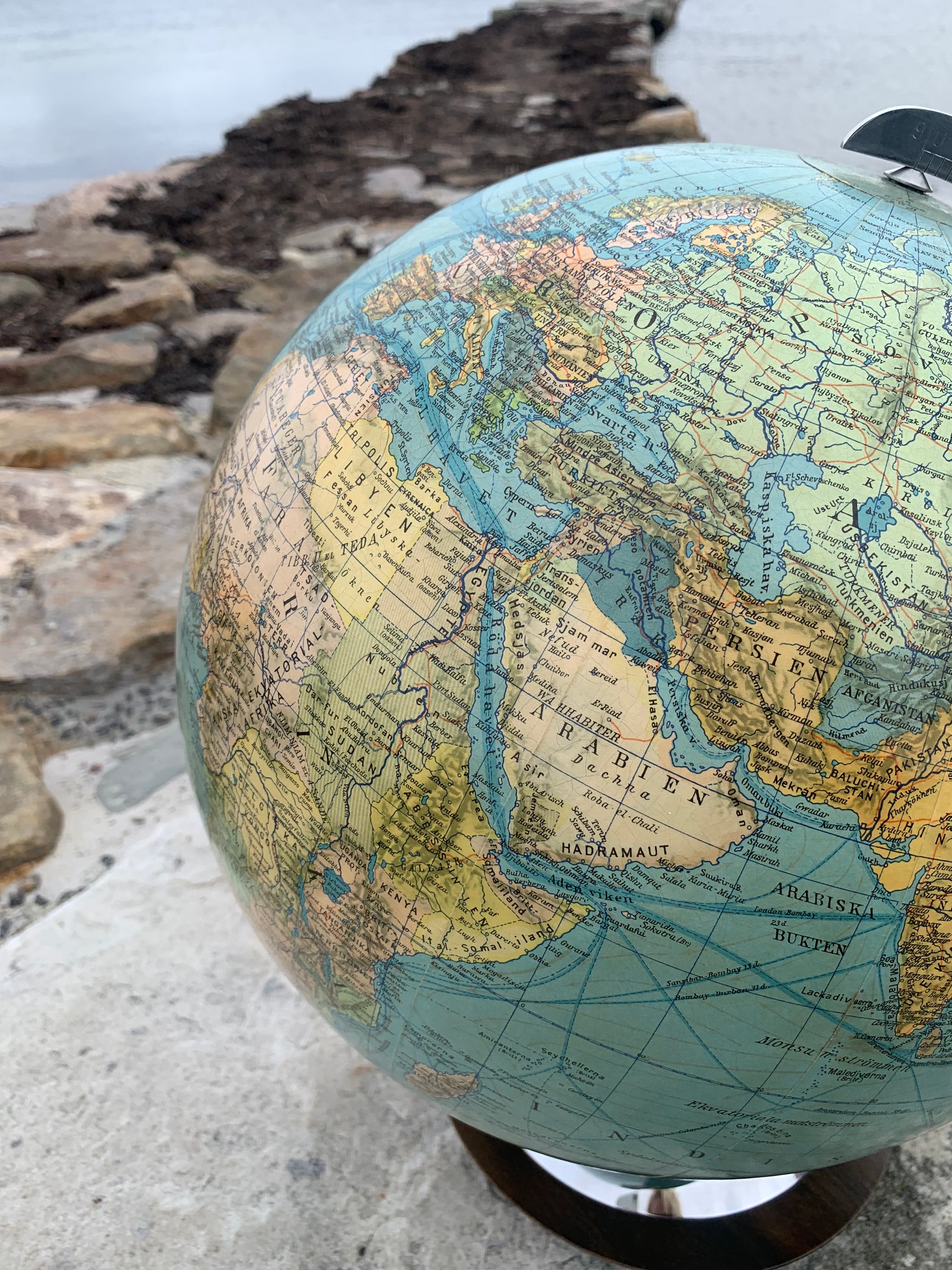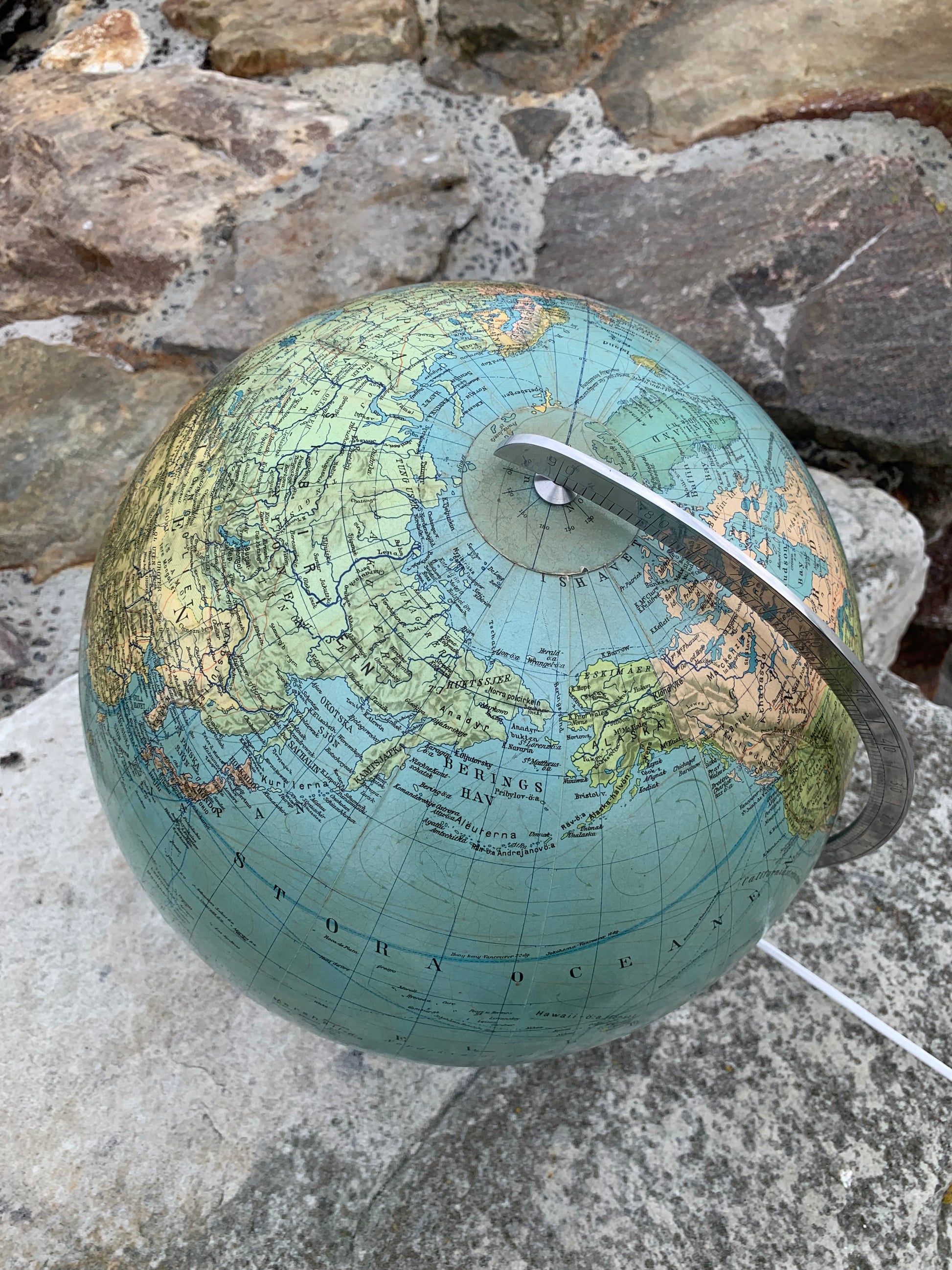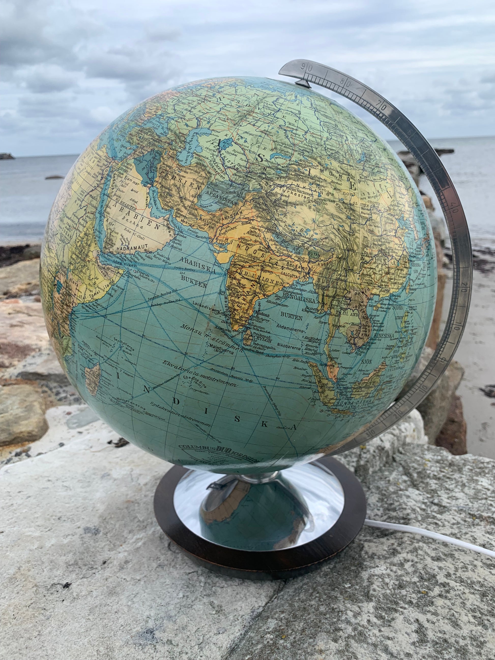 Fin gammel globus i glas. Tidens tand har bidt en smule i globusen der giver et flot lys når den er tændt.