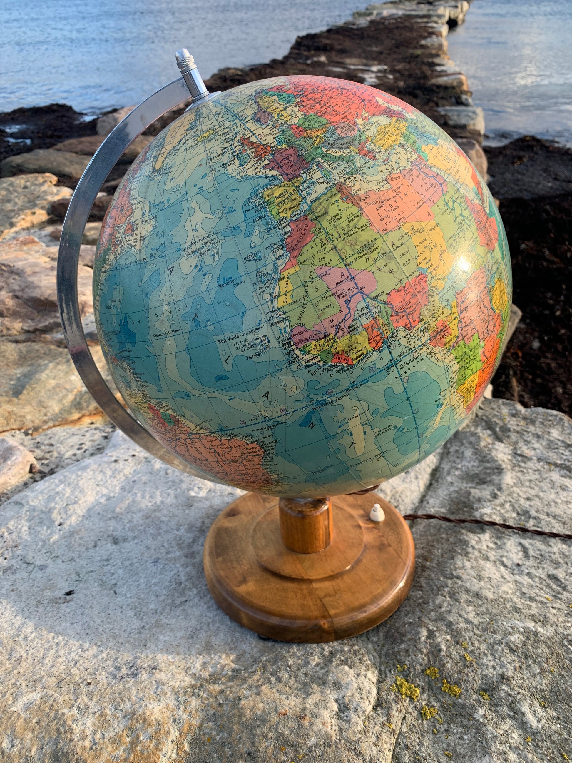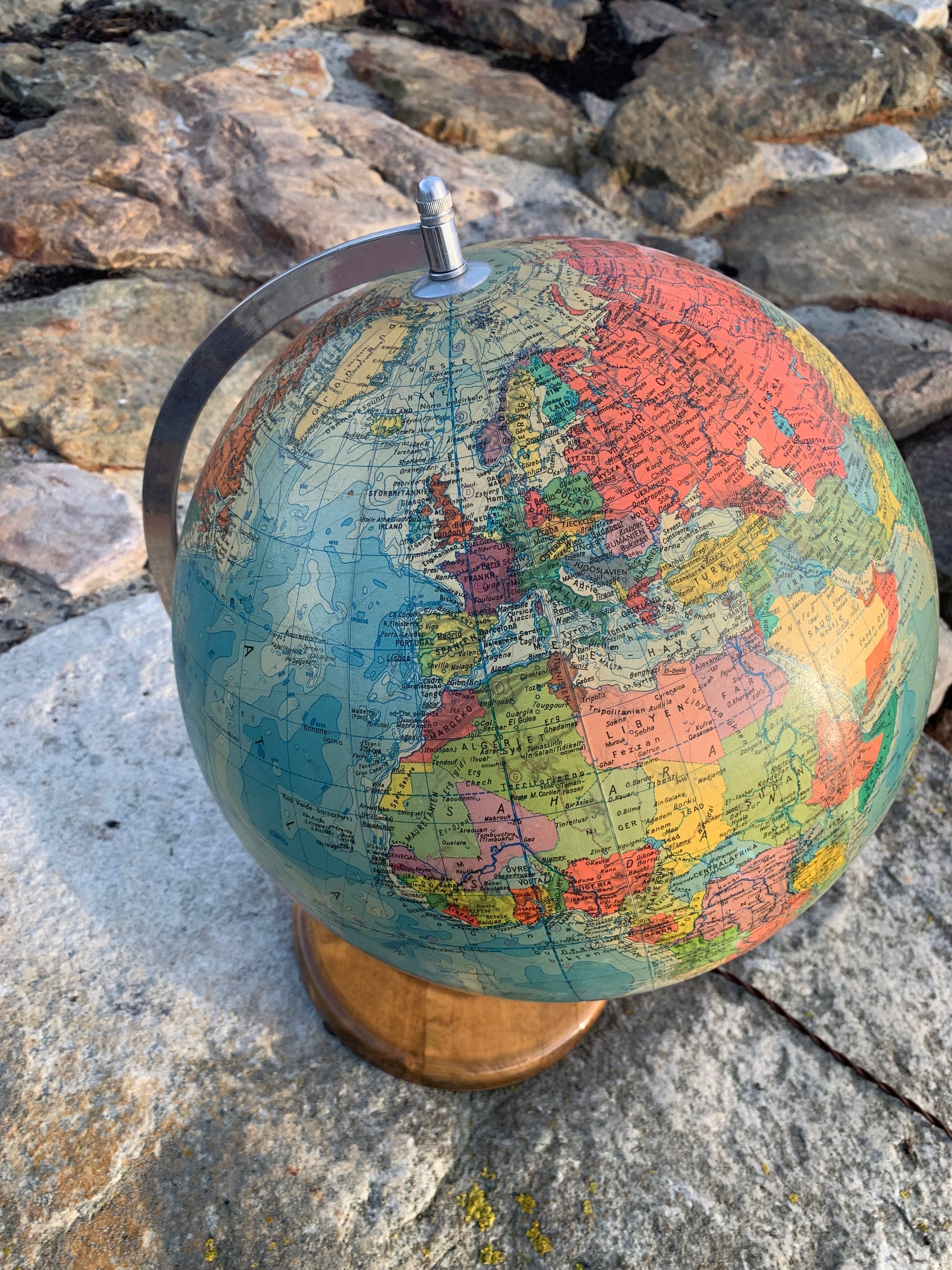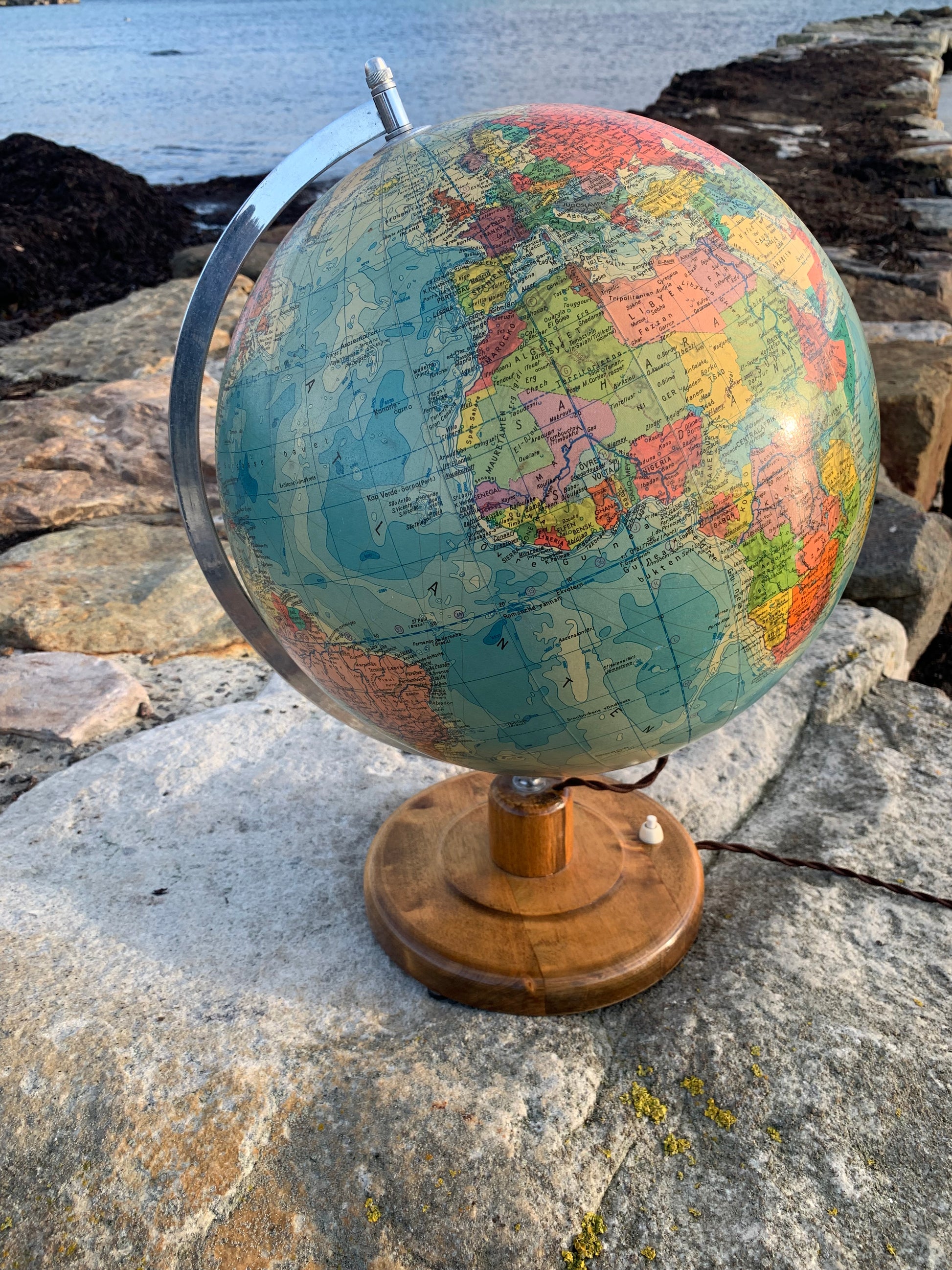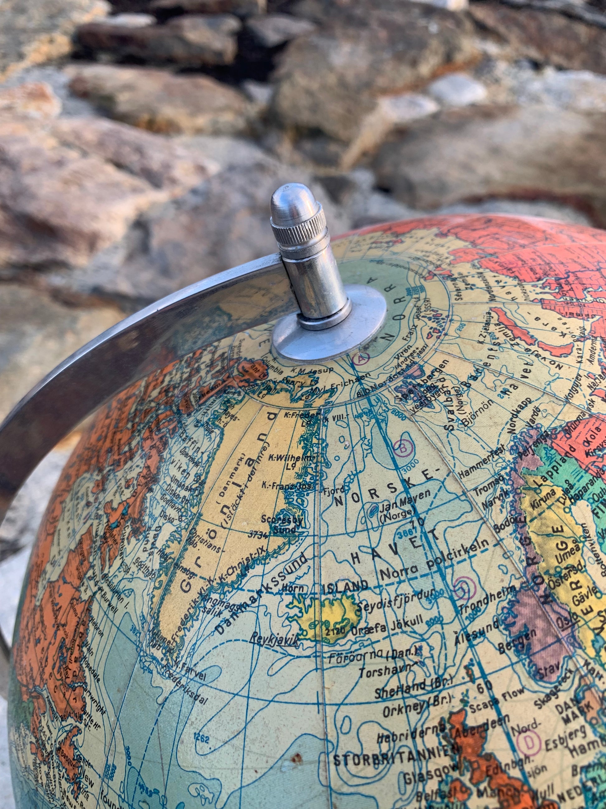 Fin gammel globus i glas. Tidens tand har bidt en smule i globusen der giver et flot lys når den er tændt.