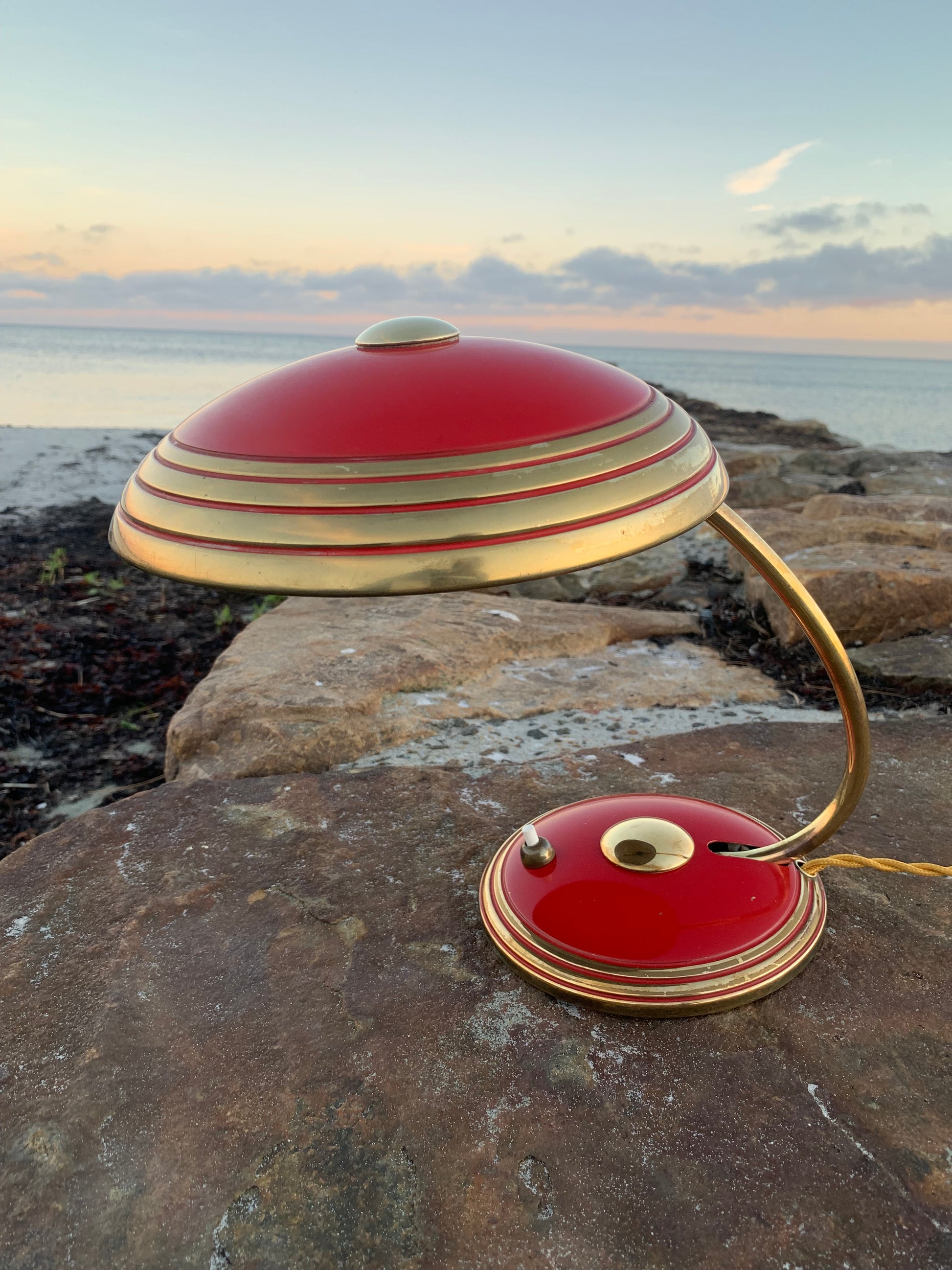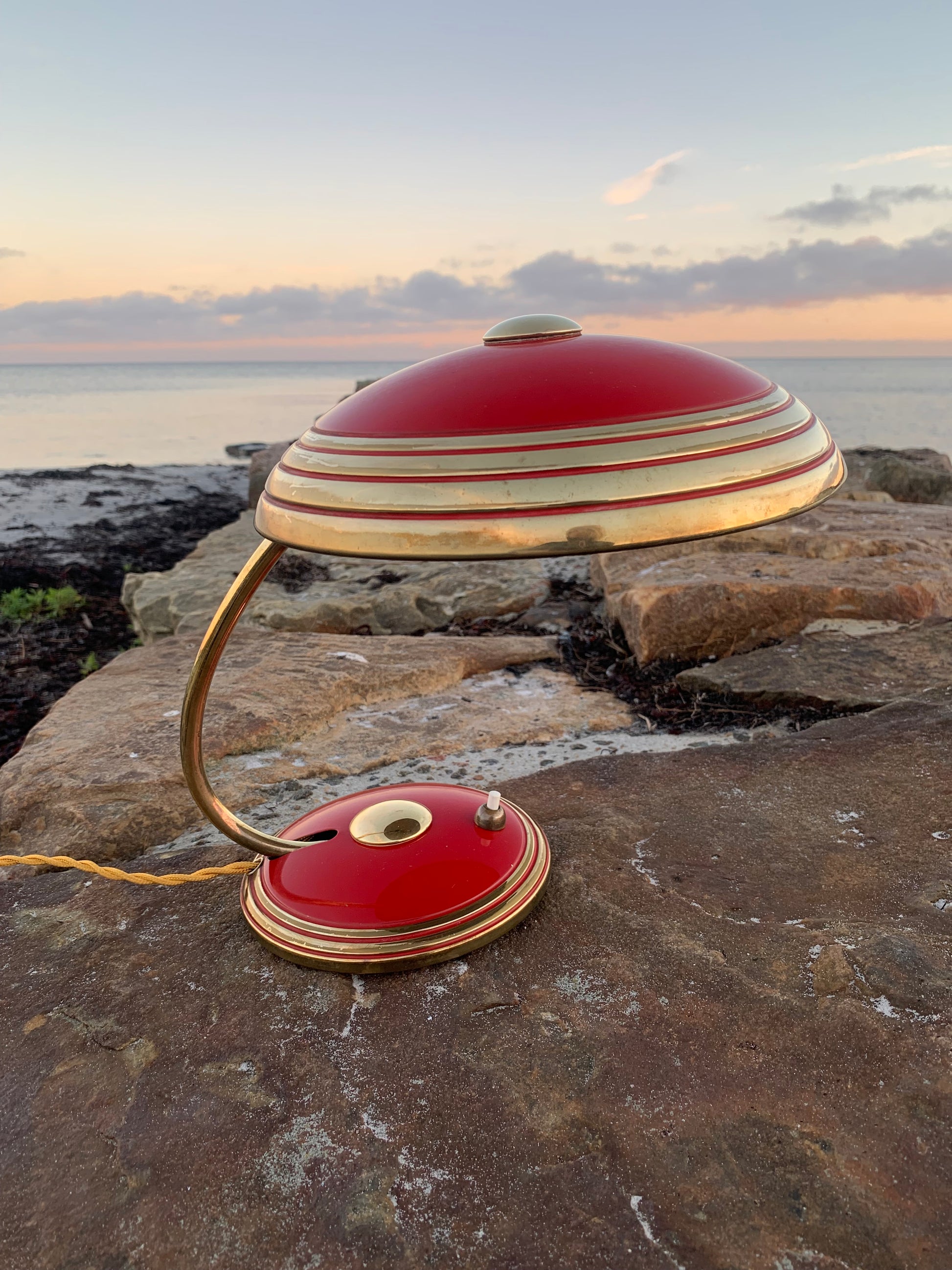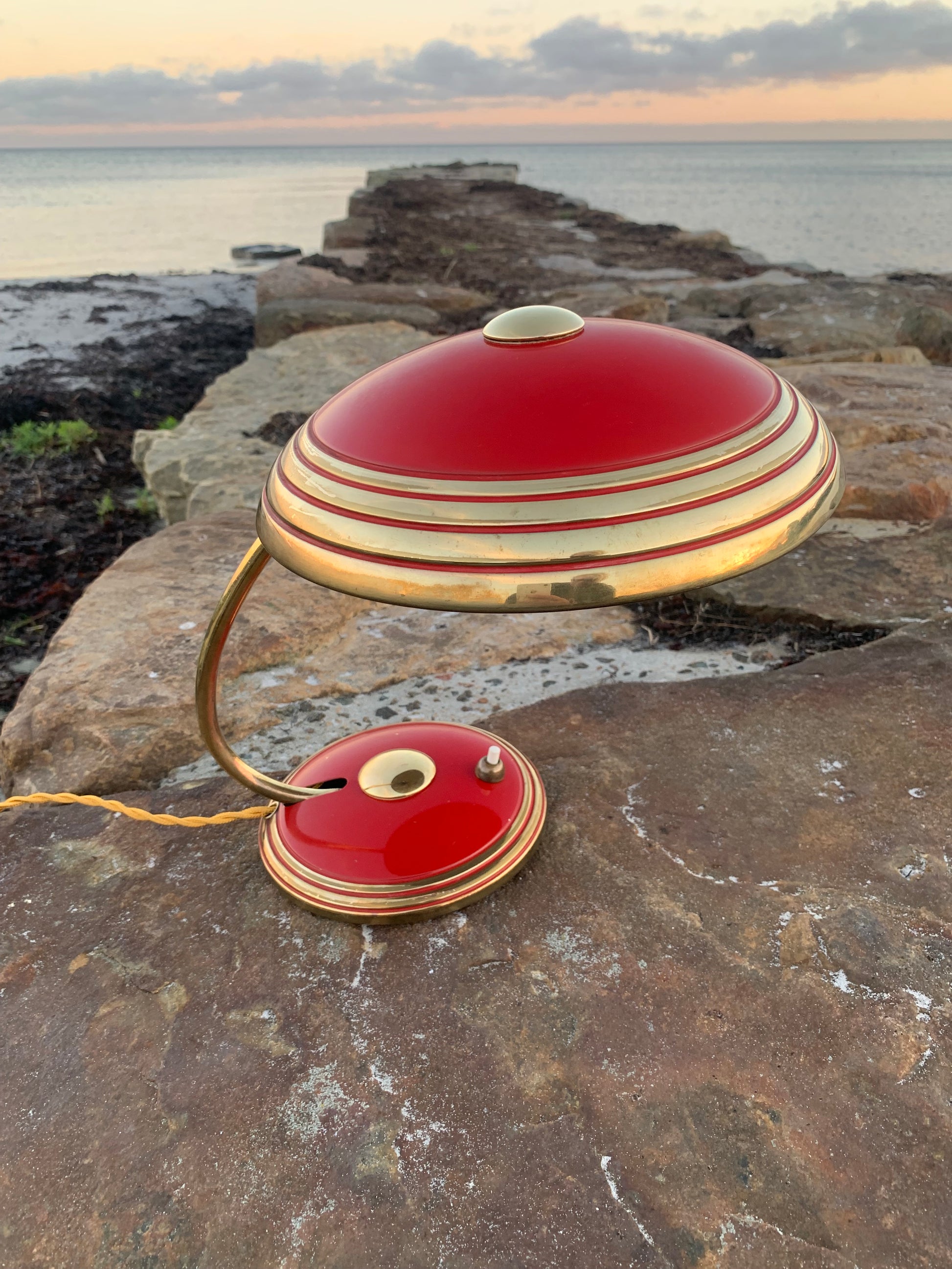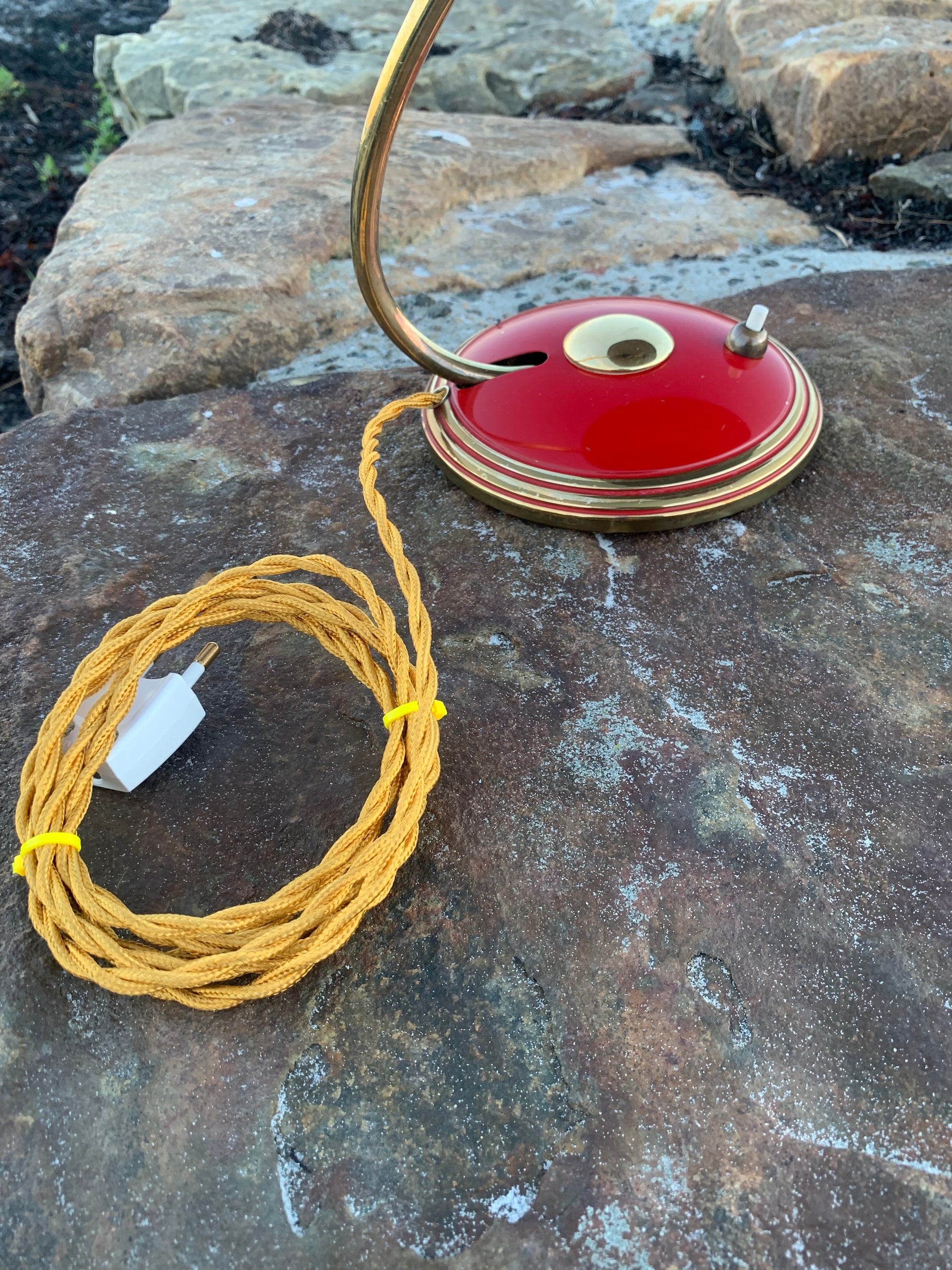 Flot Helo vintagelampe. Lampen der er nykablet, har en smule aldersrelaterede brugsspor som sådan en lampe (efter vores smag) nærmest bør have. Dette vidner blot om originalitet og om at lampen har mange årtier bag sig. Dette eksemplar er sandsynligvis fra 1950’erne.
