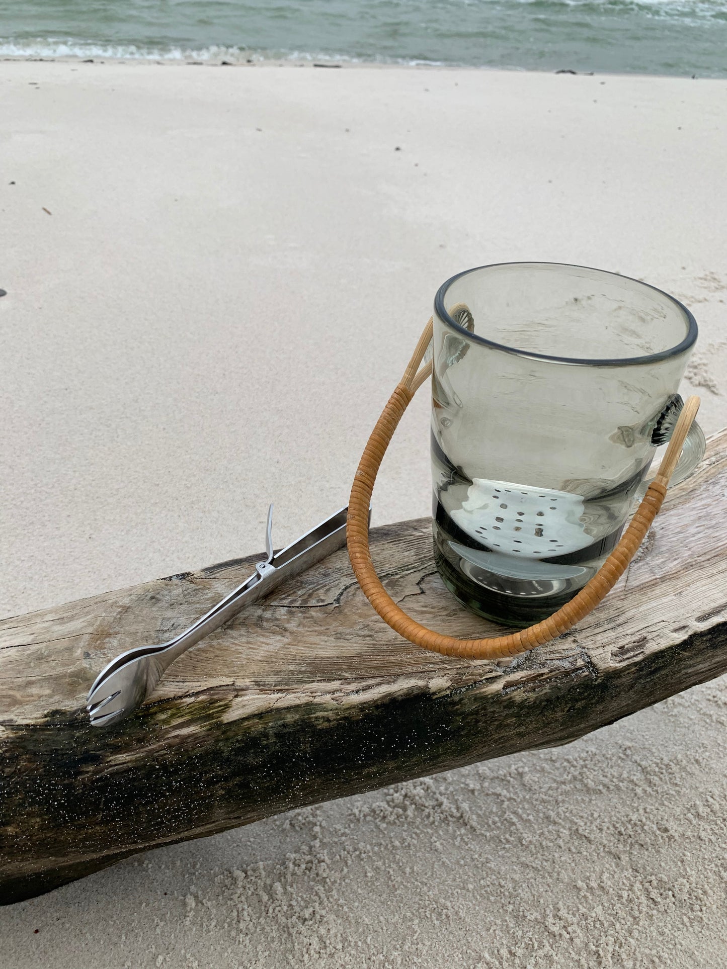 Fin gammel isspand fra Holmegaard med tilhørende tang samt bundrist. Det charmerende sæt har aldersrelaterede brugsspor.
