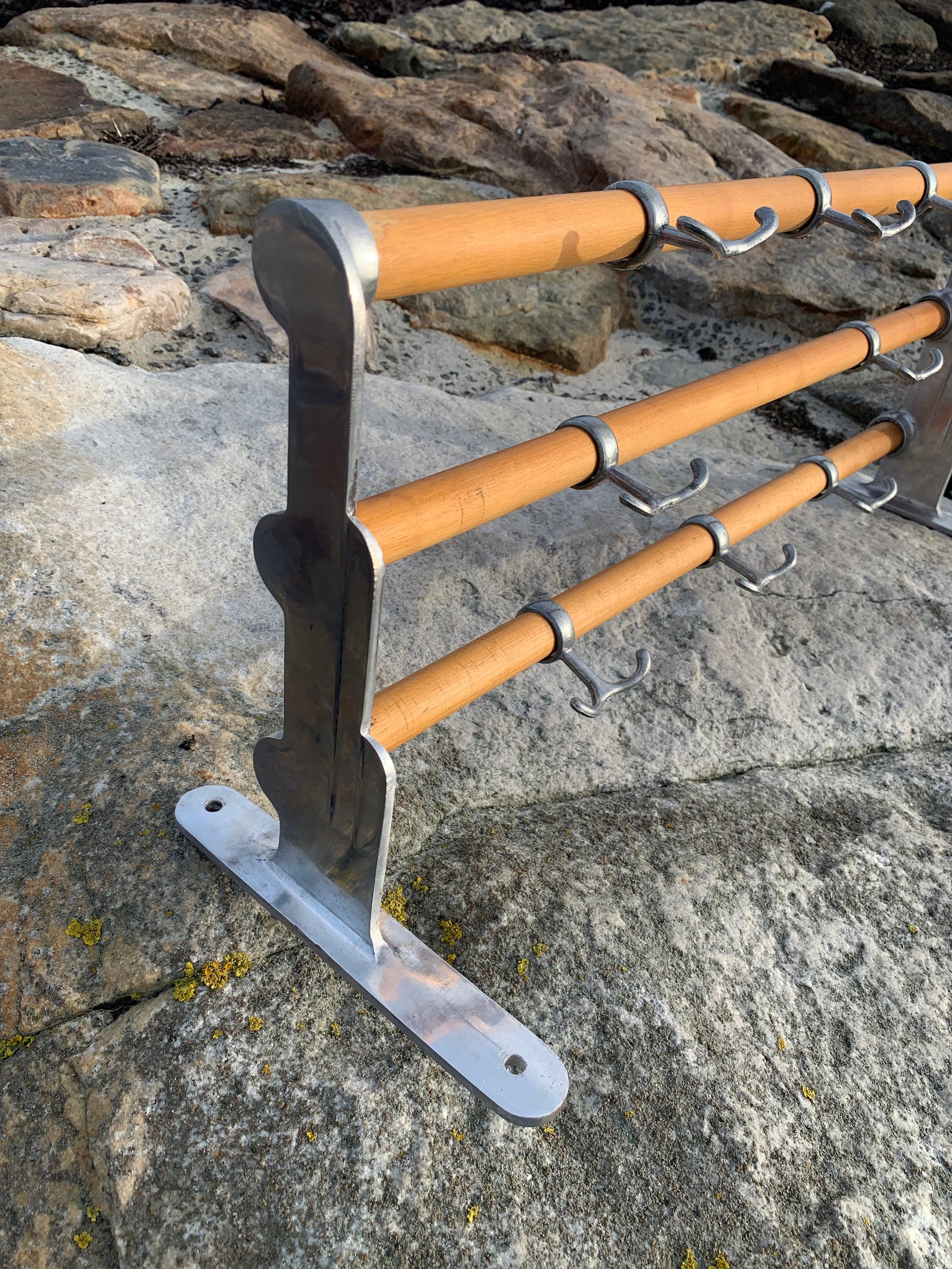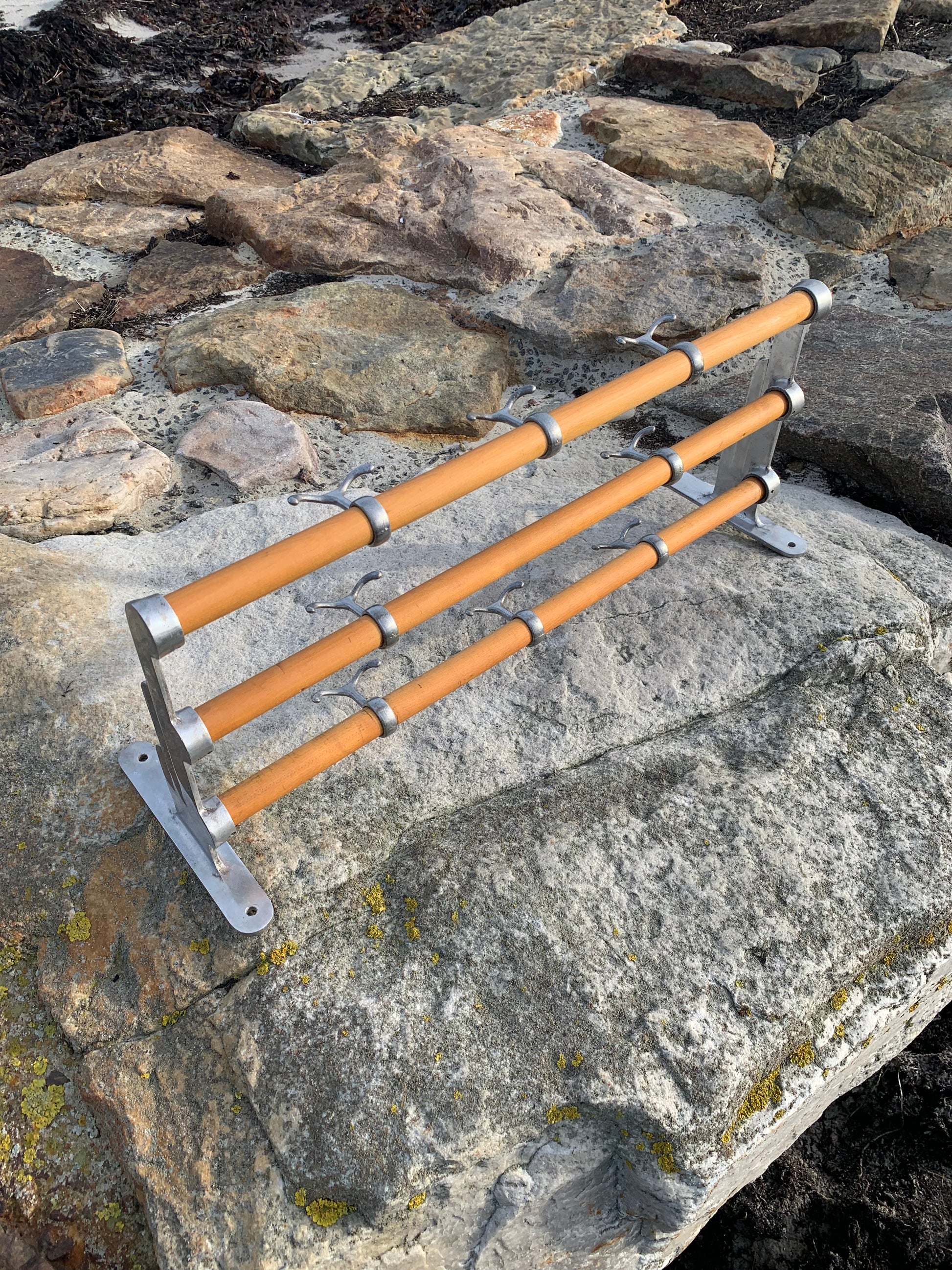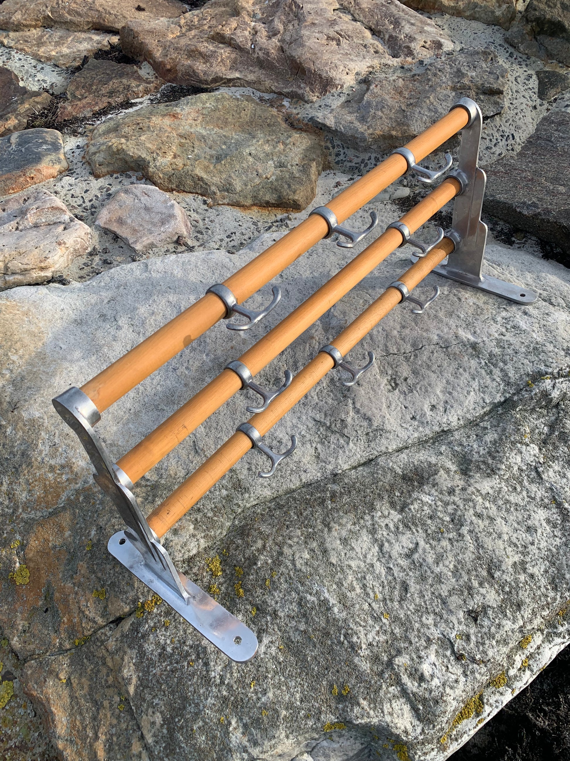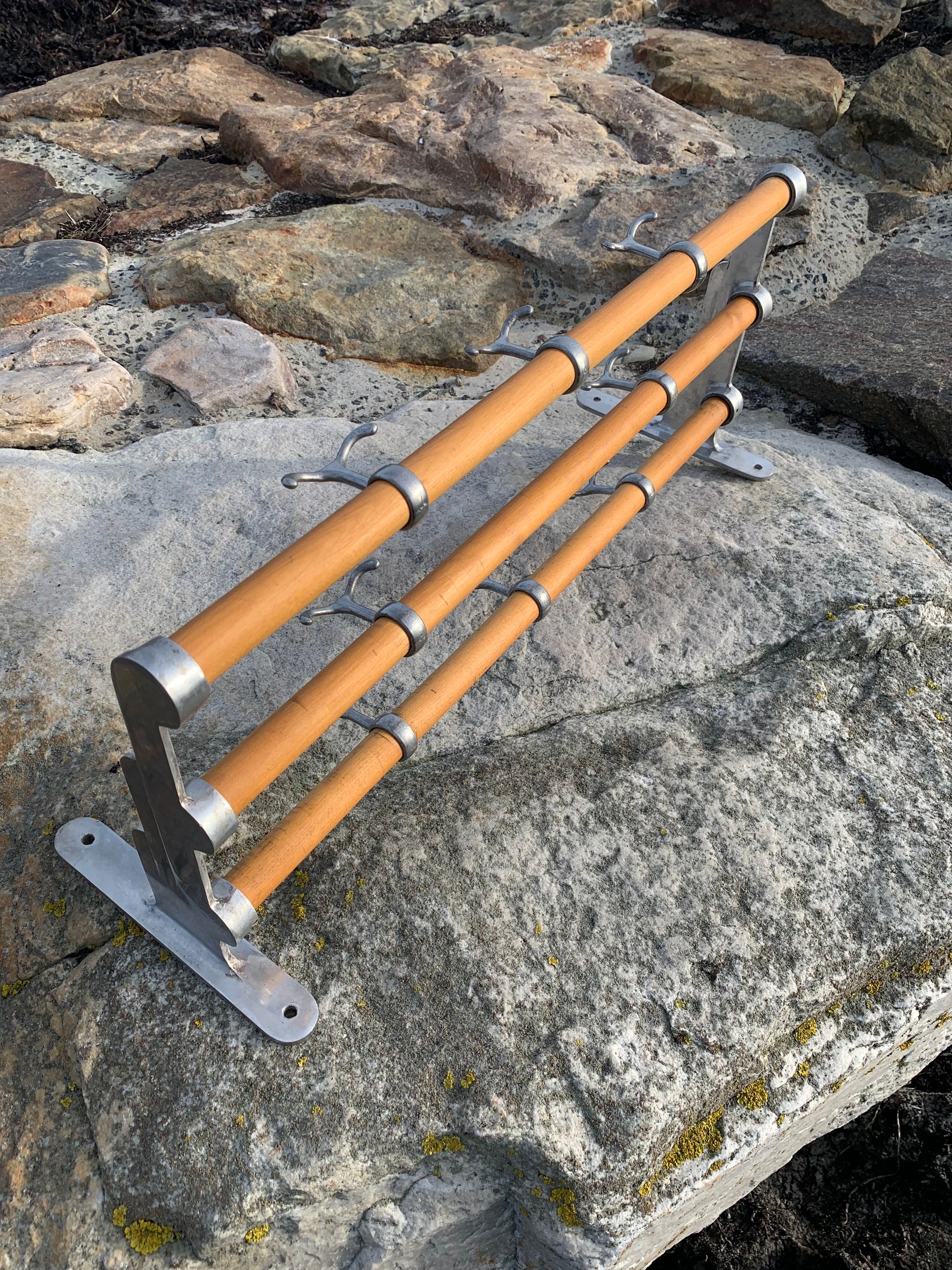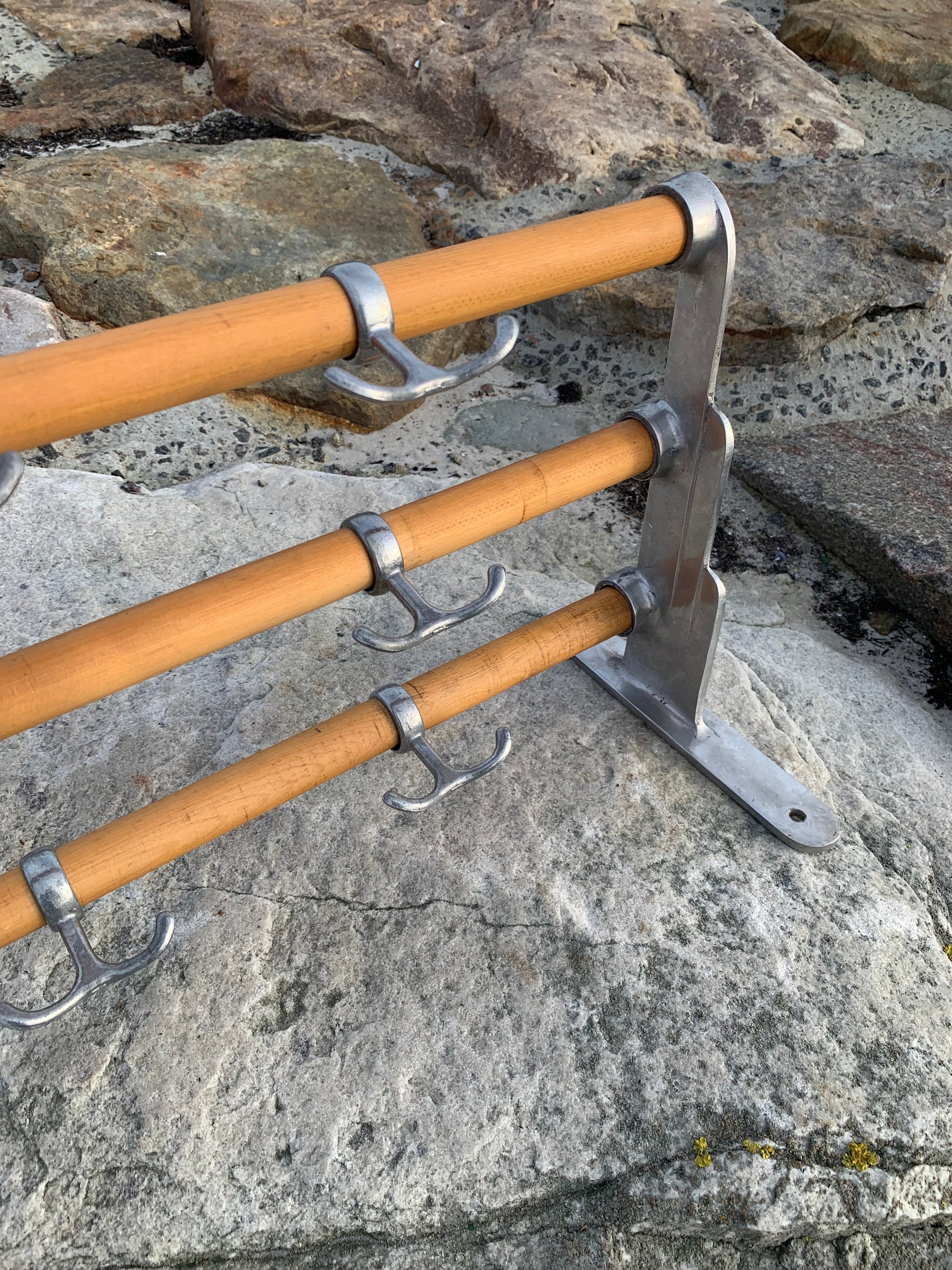 Skøn svensk hattehylde i godt design af Gunnar Bolin. Tidens tand har bidt i den, således at den fremstår med aldersrelaterede brugsspor, der blot vidner om at nogen sandsynligvis har været glade for den.