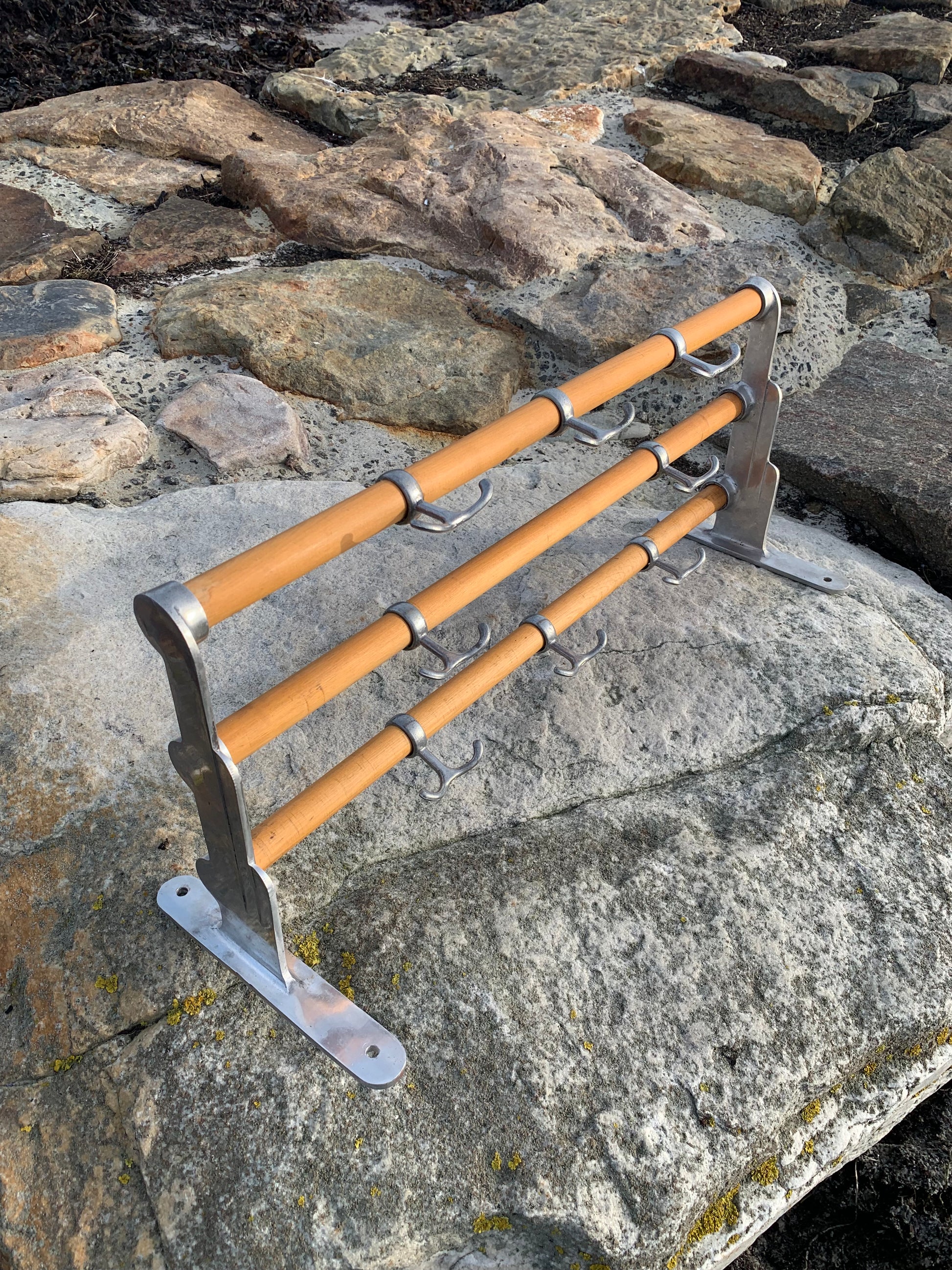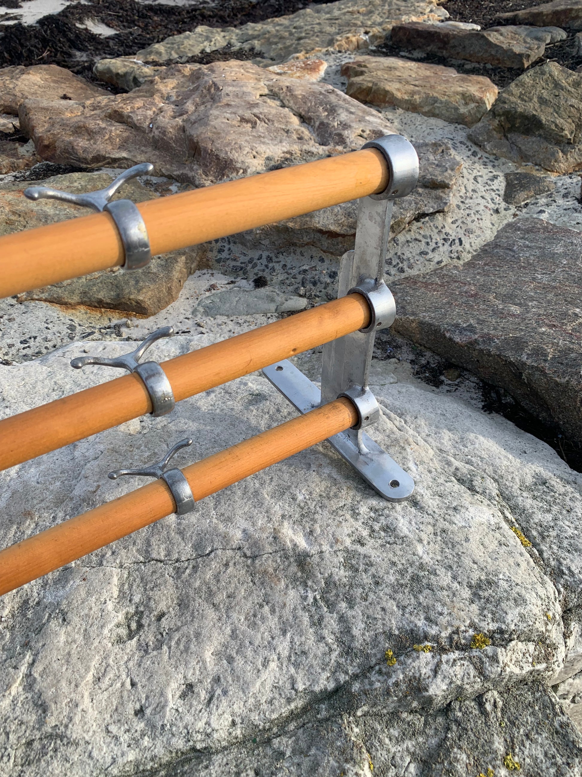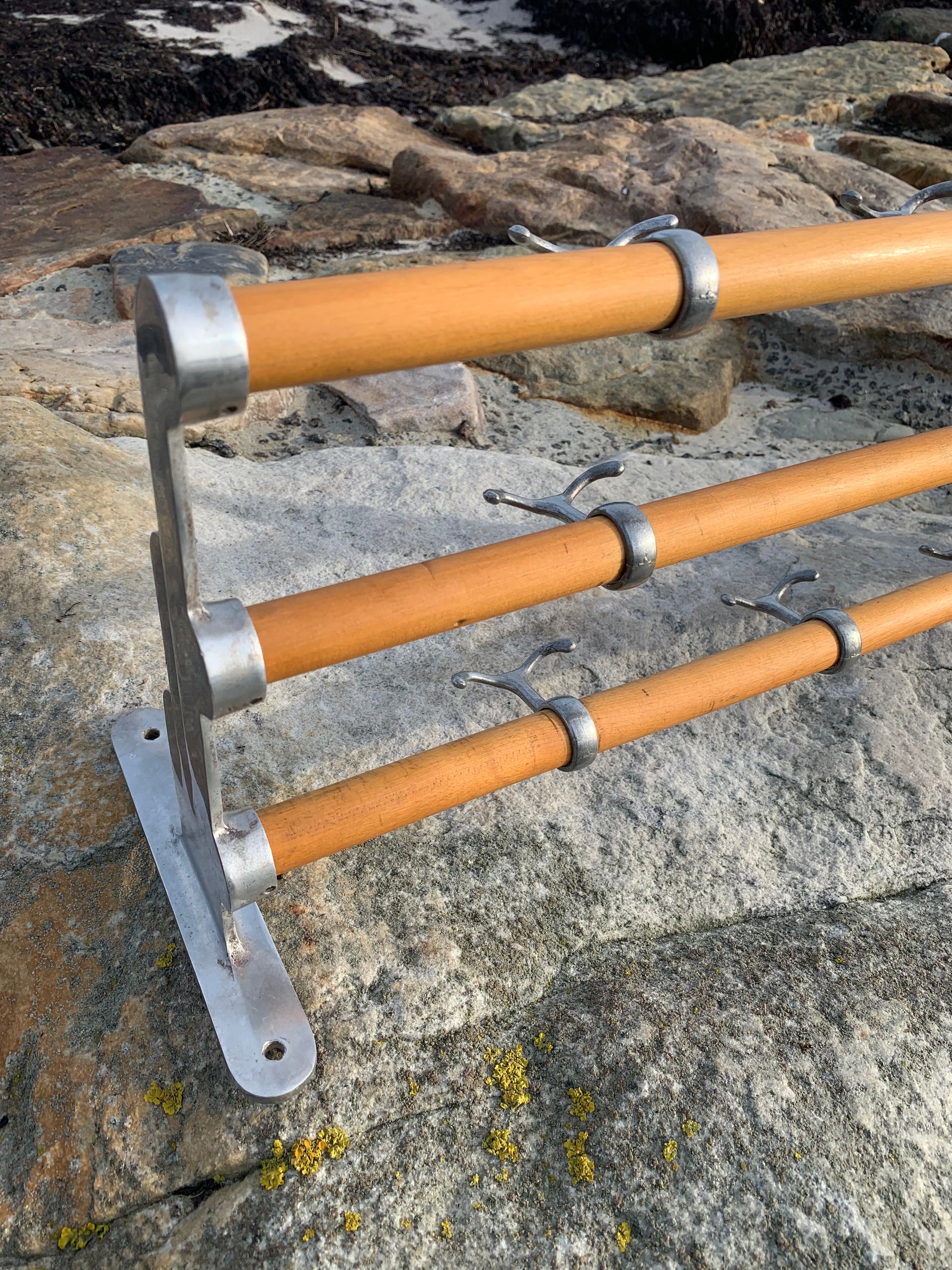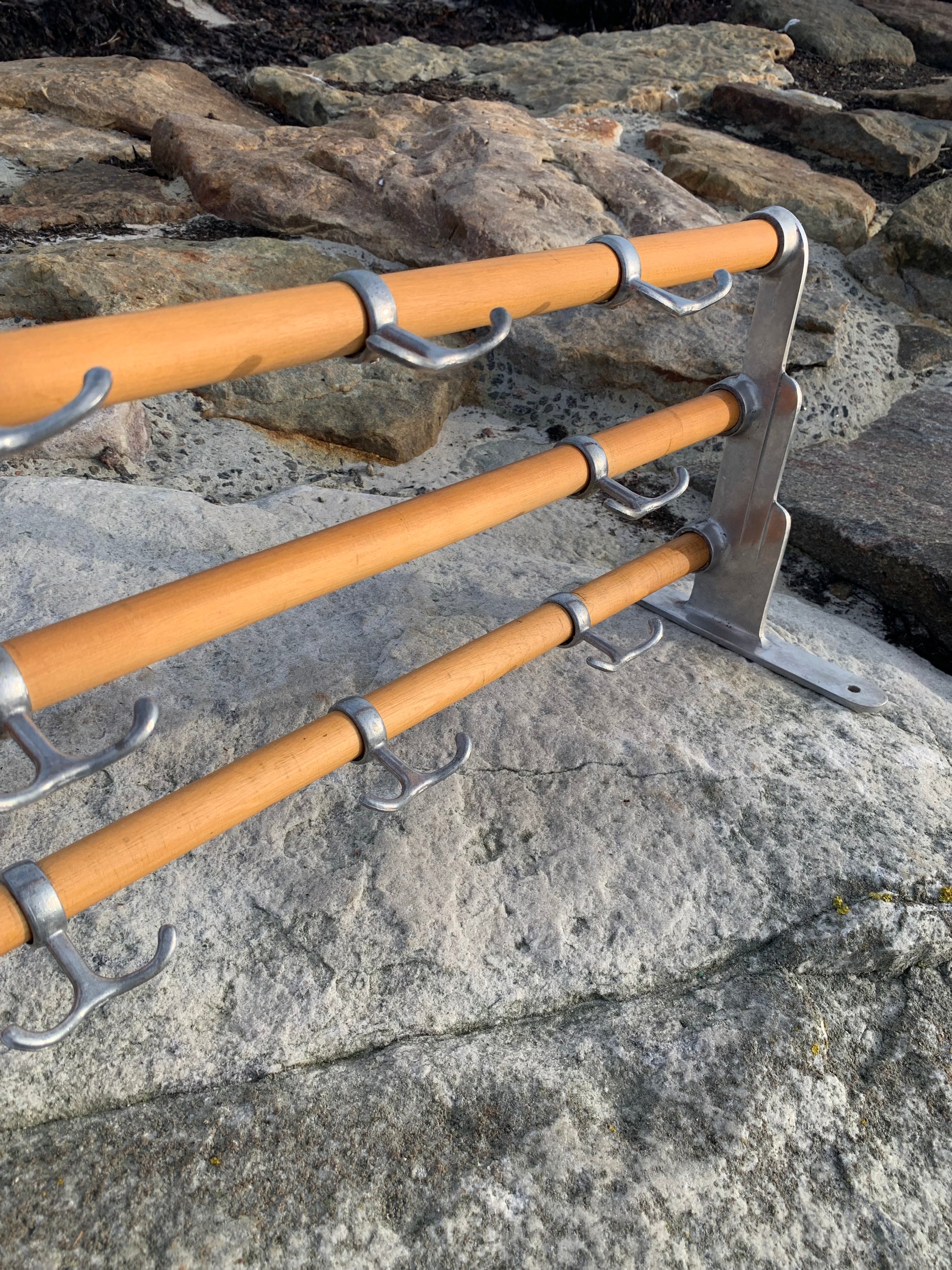 Skøn svensk hattehylde i godt design af Gunnar Bolin. Tidens tand har bidt i den, således at den fremstår med aldersrelaterede brugsspor, der blot vidner om at nogen sandsynligvis har været glade for den.