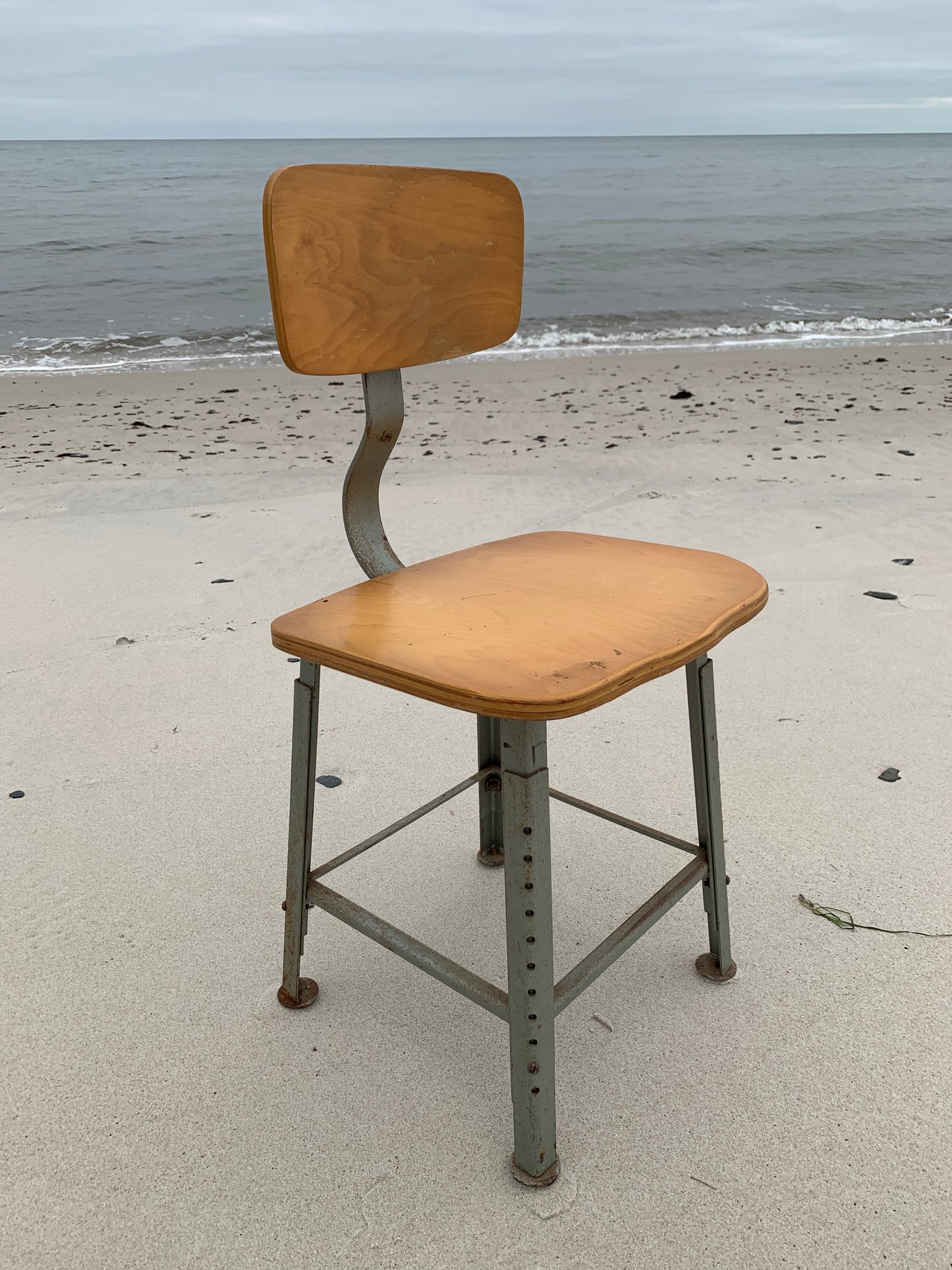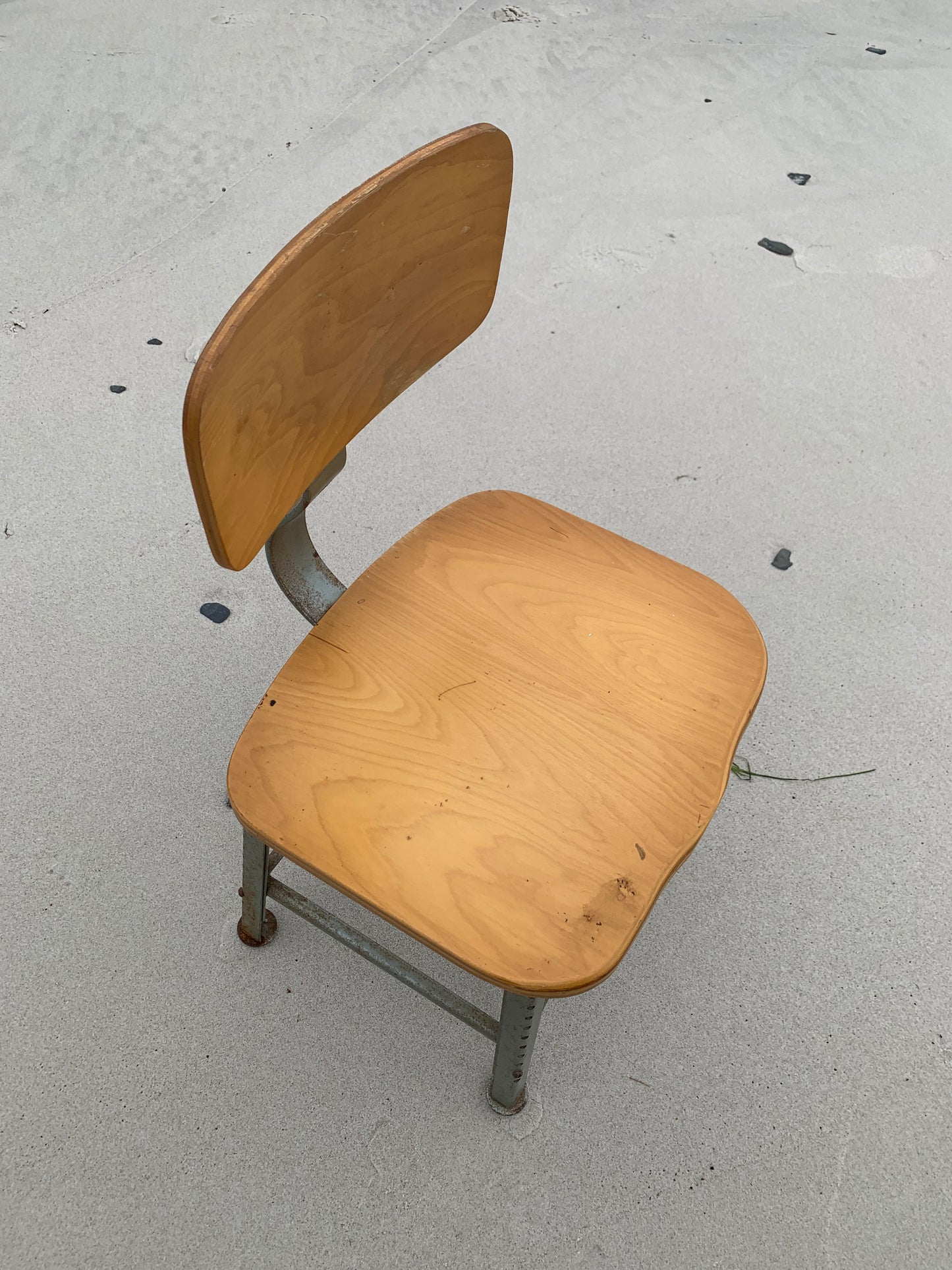 Industriel stol med ryglæn. Stolen har en flot formgivning og fremstår rå med en skøn patina.
