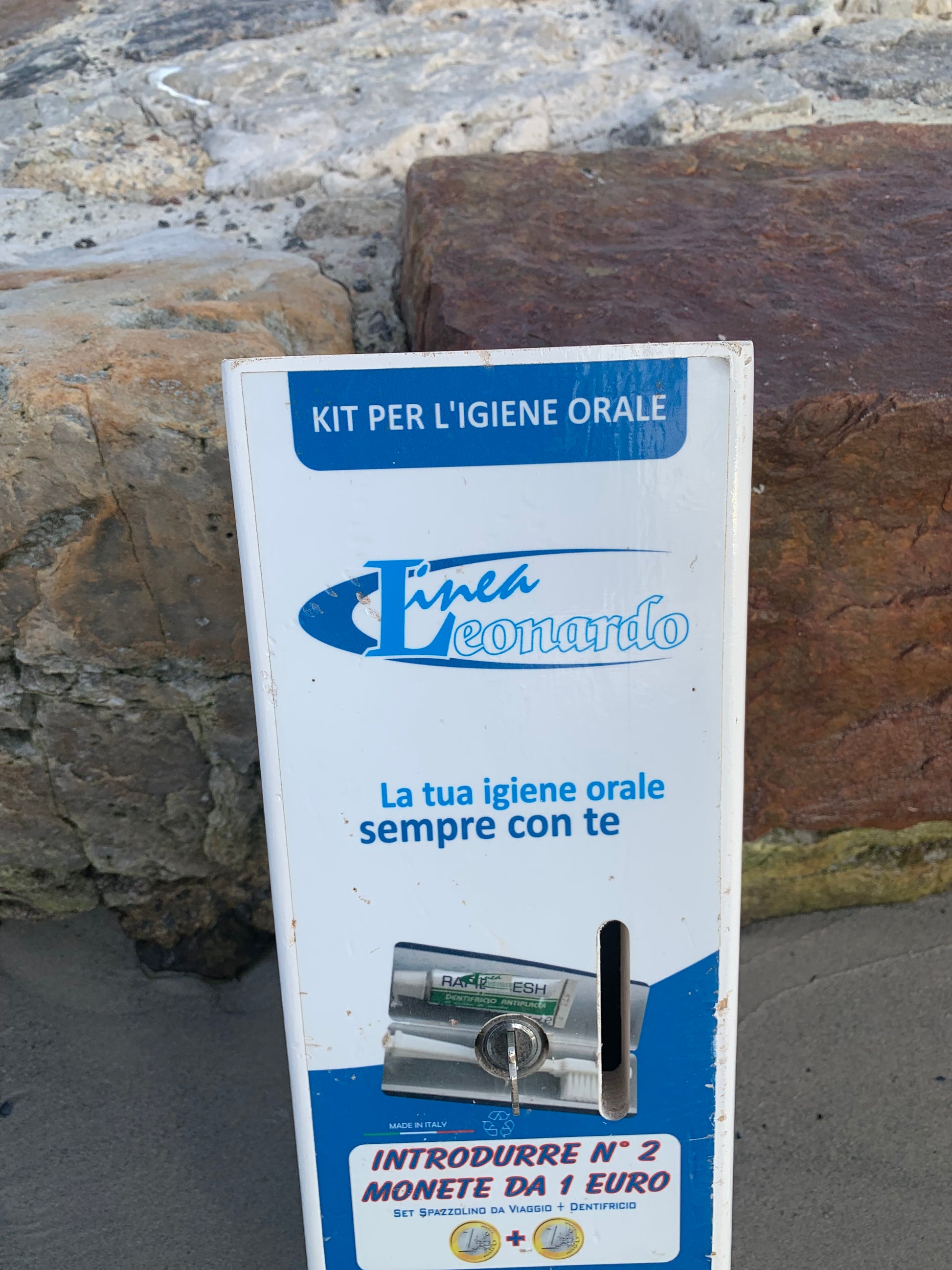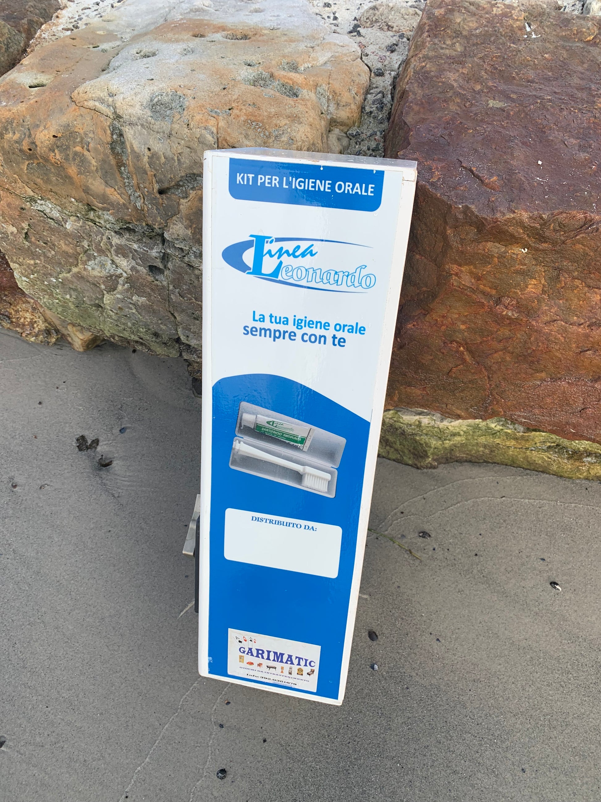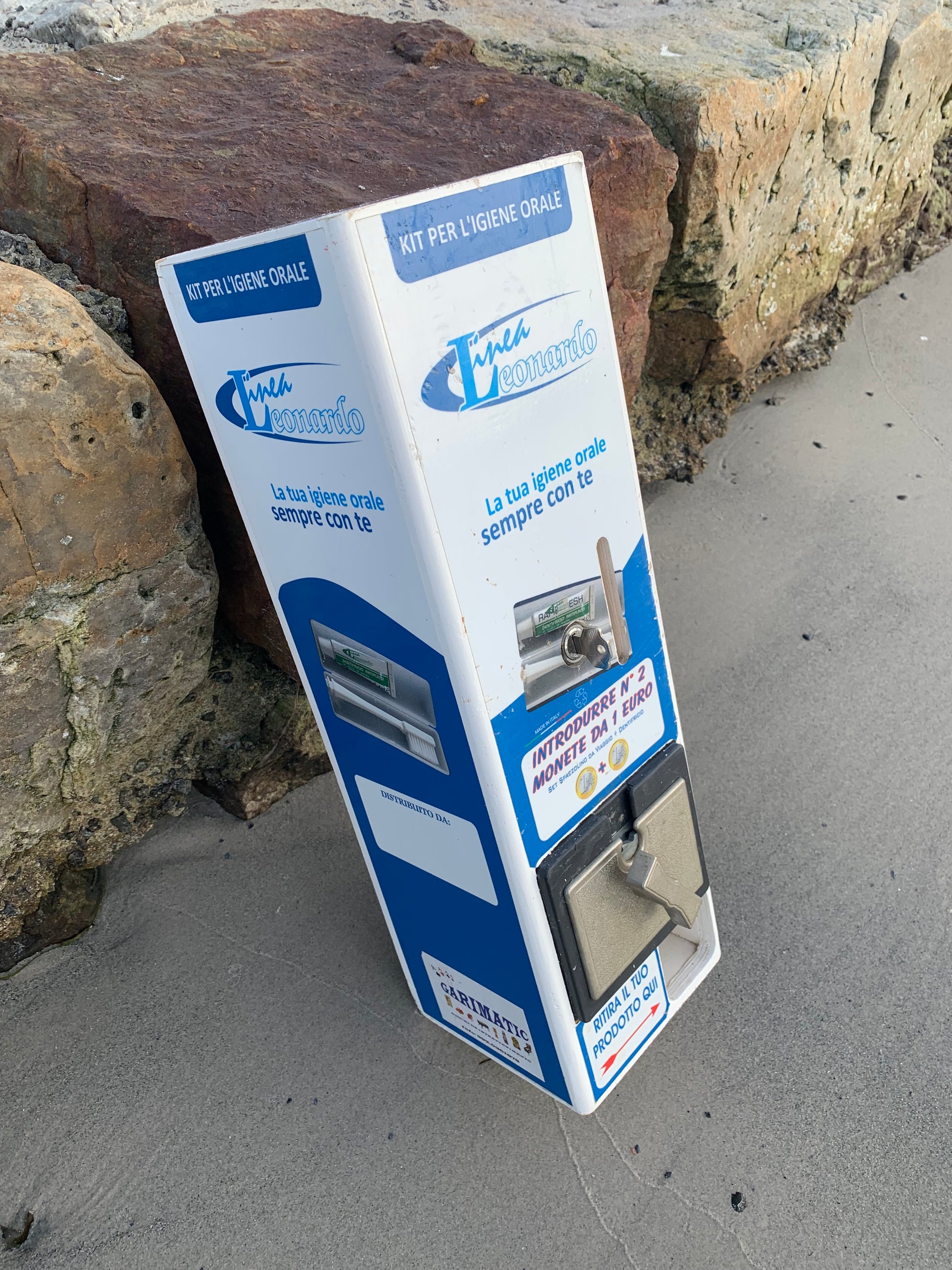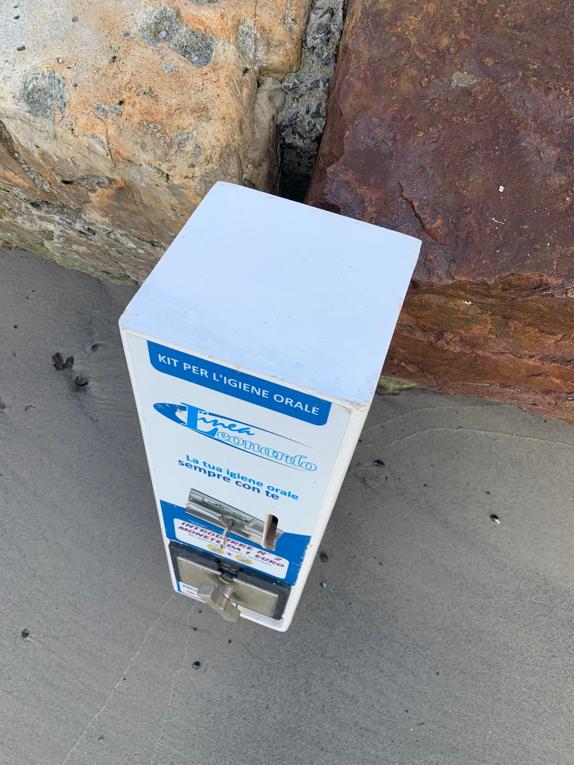 Sjov automat fra Italien. Engang var det muligt at trække en tandbørste med tilhørende tandpasta i automaten. Vi garanterer ikke for funktionen, men den er dekorativ.