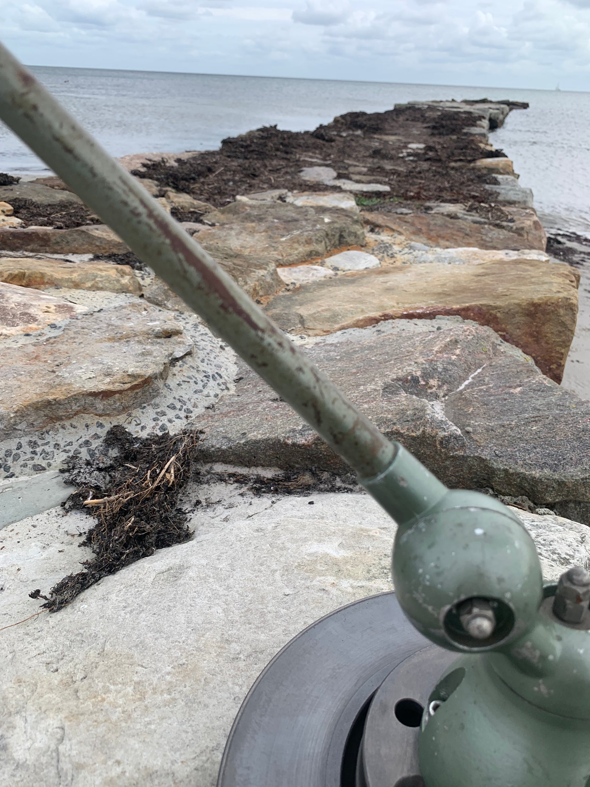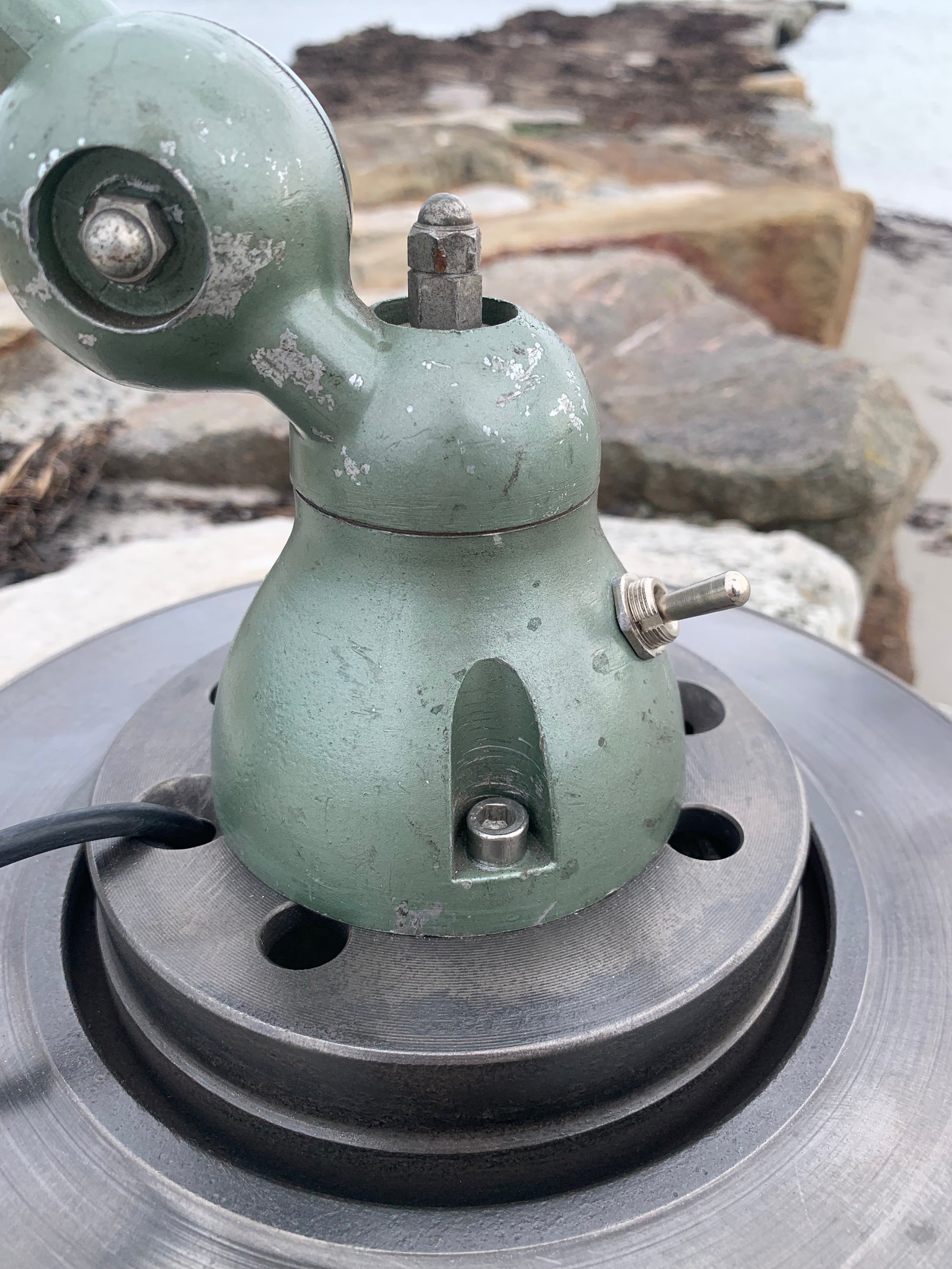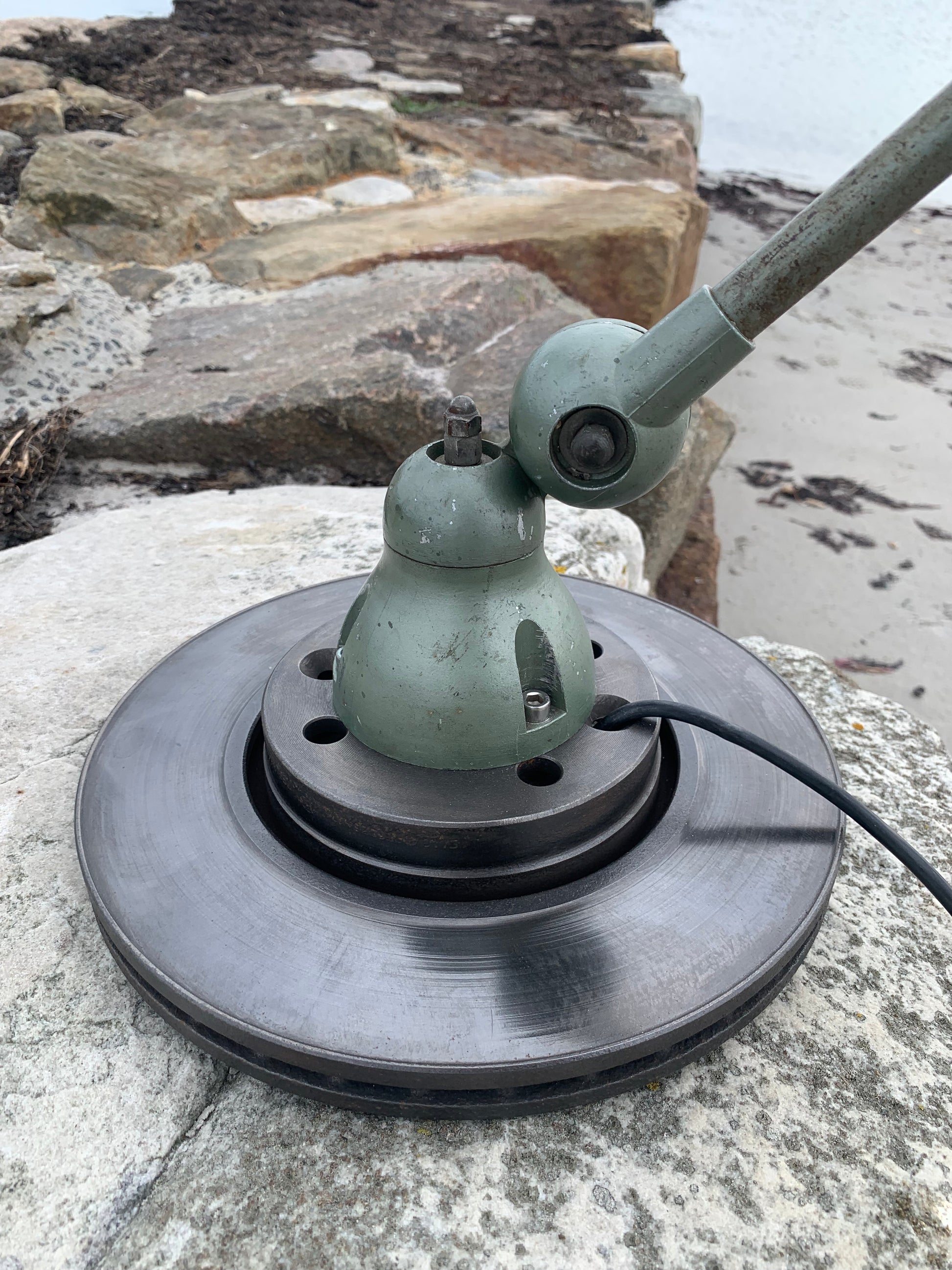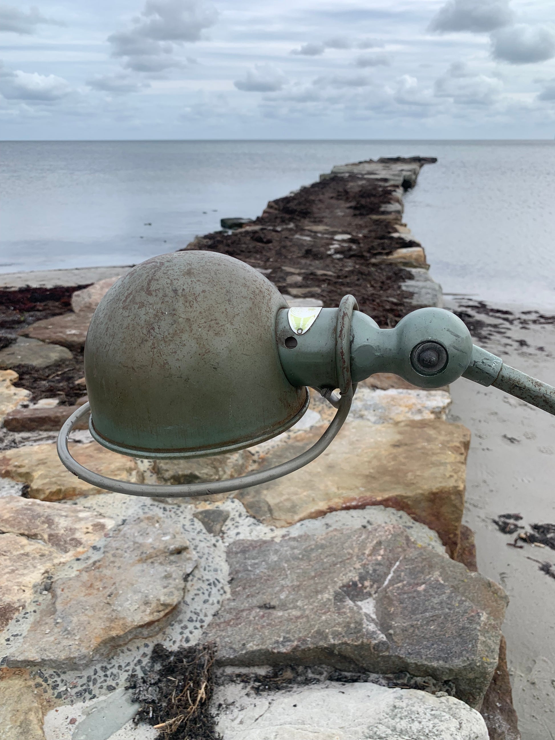 Skøn Jieldé lampe i lækker grøn farve. Tidens tand har bidt i lampen der fremstår med masser af patina og henvender sig til dig der ser det perfekte i det uperfekte.