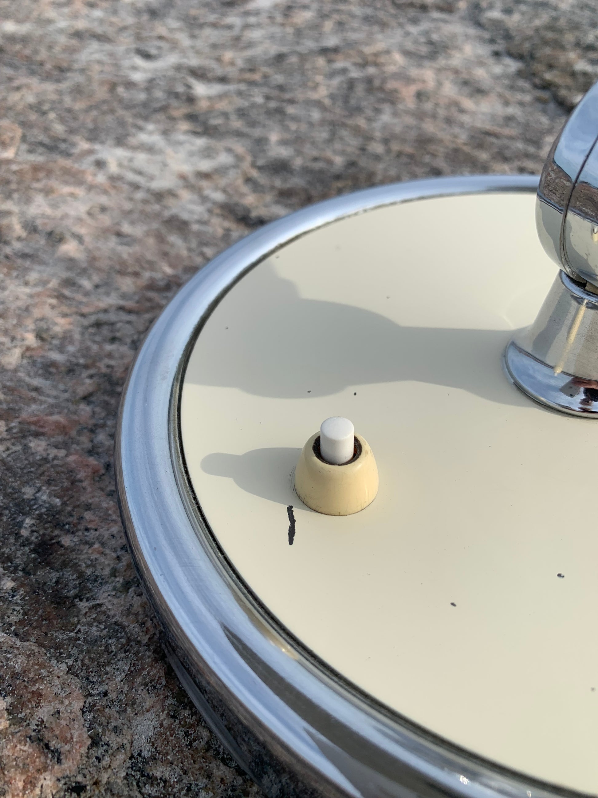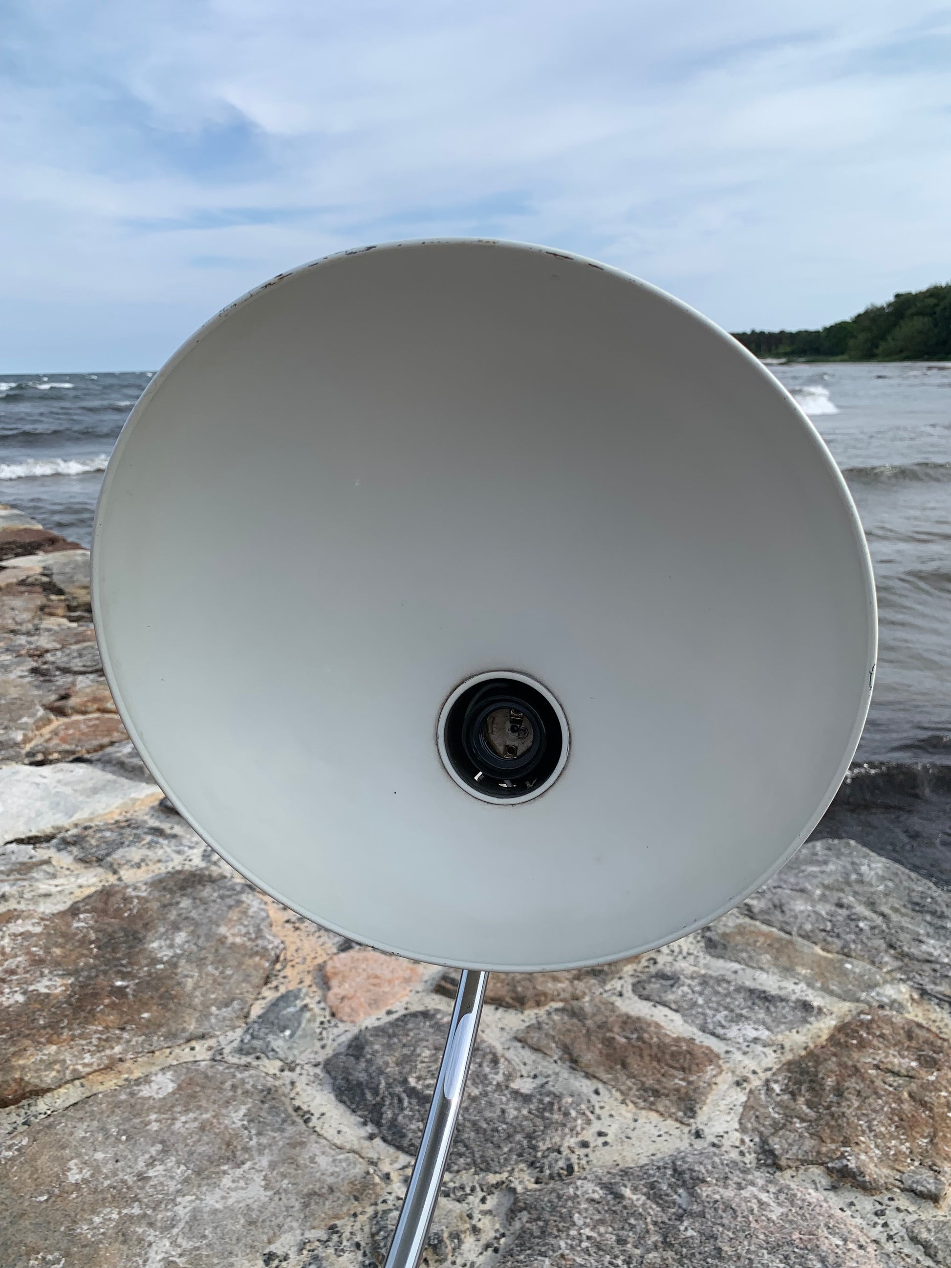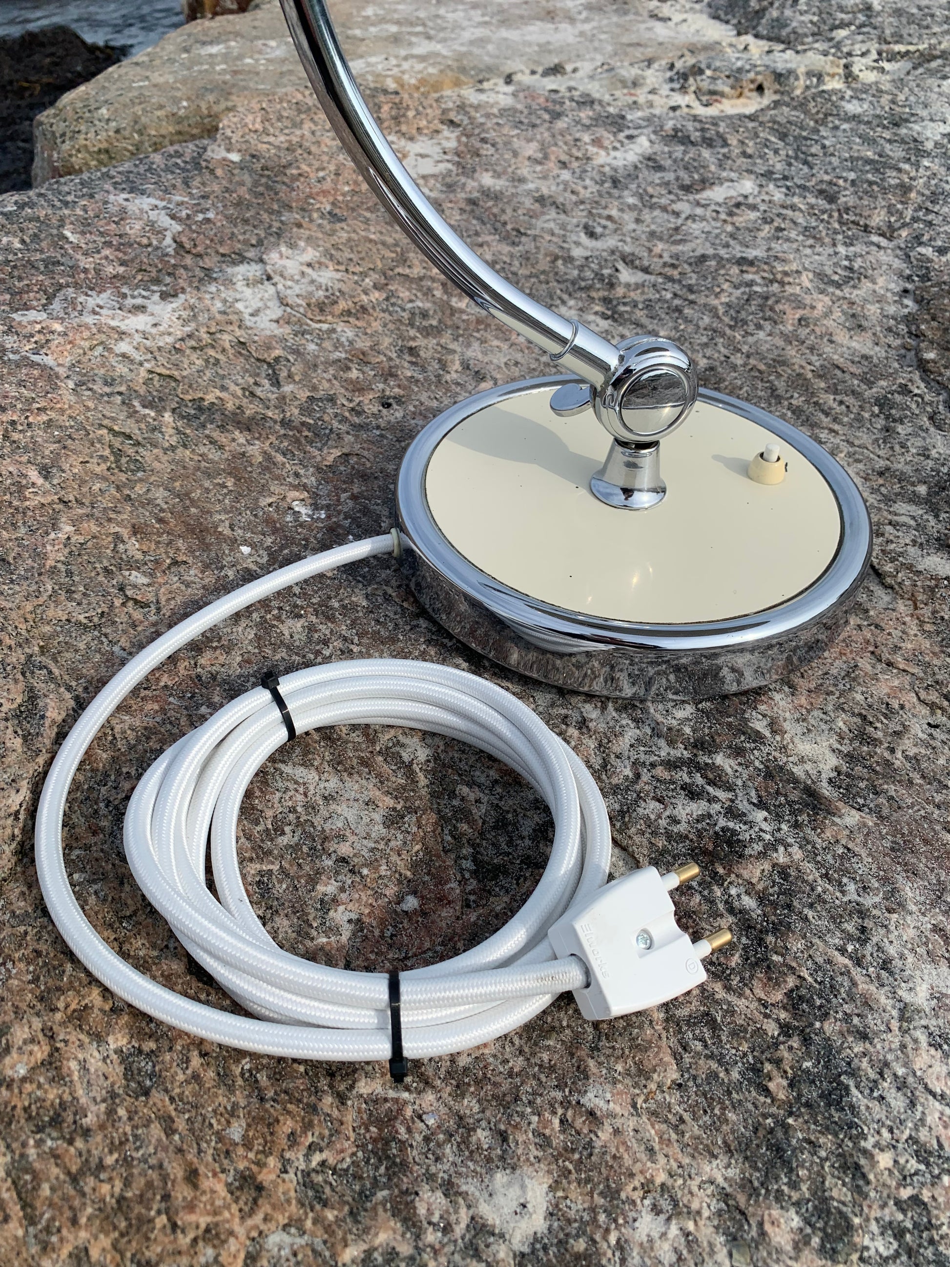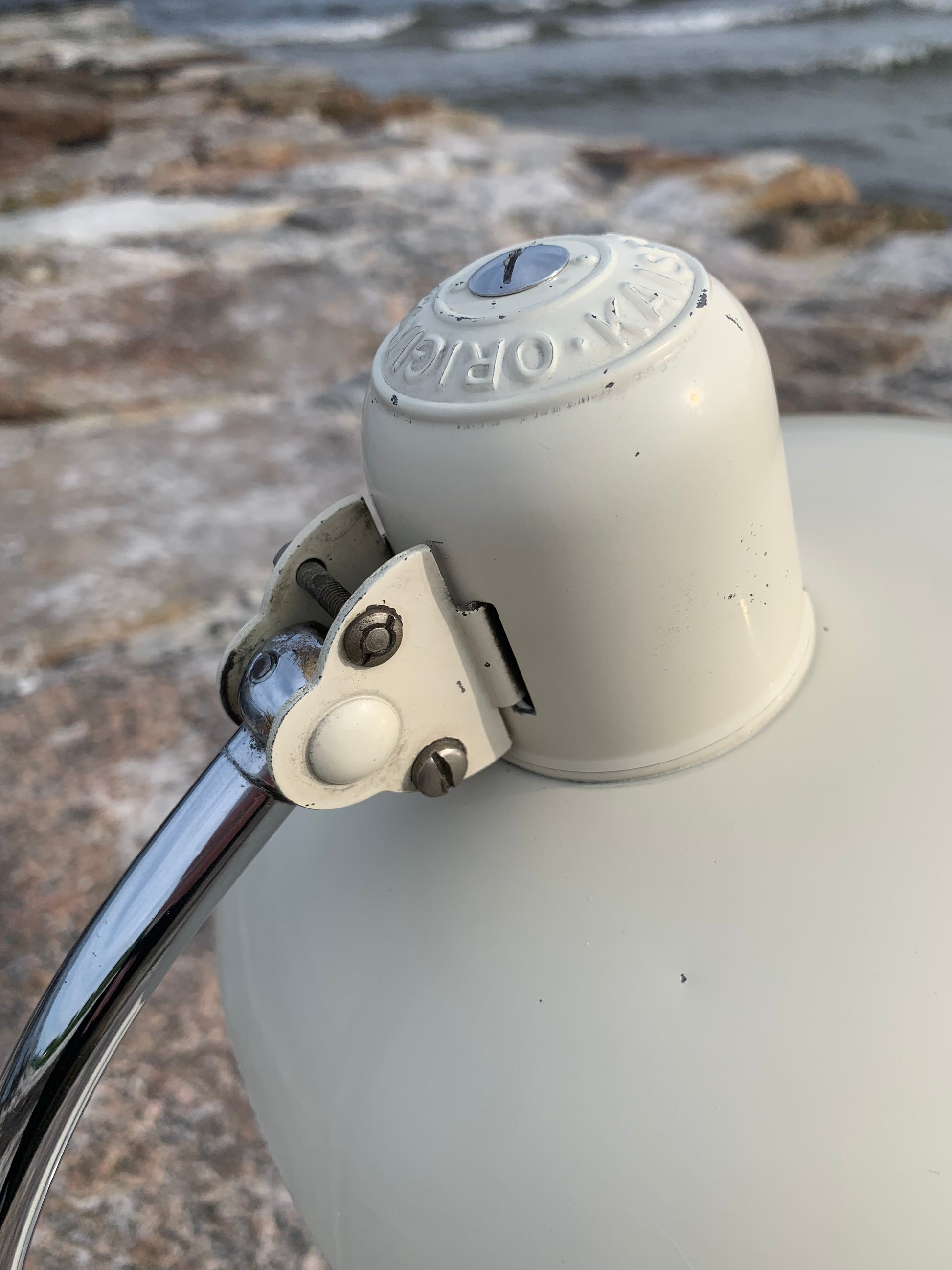 Dette eksemplar fremstår i den originale lakering og med nye kabler. Lampen har lidt aldersrelaterede brugsspor, som sådan en lampe (efter vores smag) nærmest bør have, lidt små skrammer (se foto) men overordnet er den i pæn vintagestand.