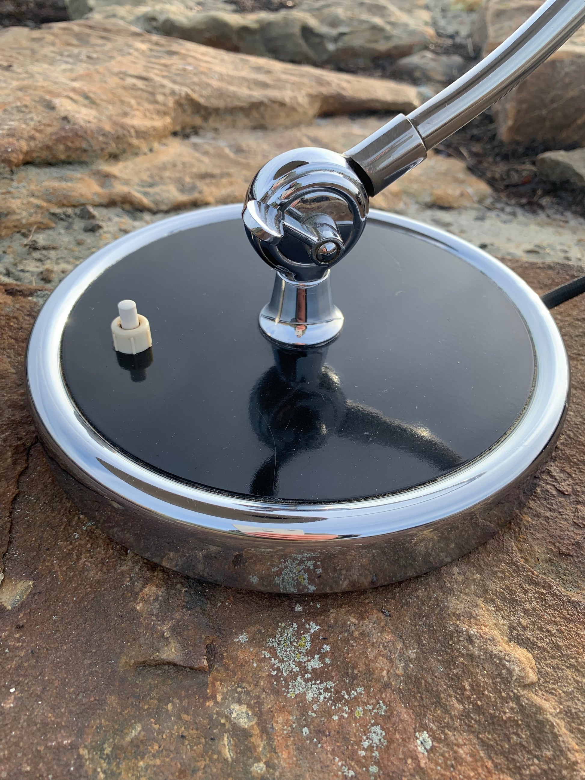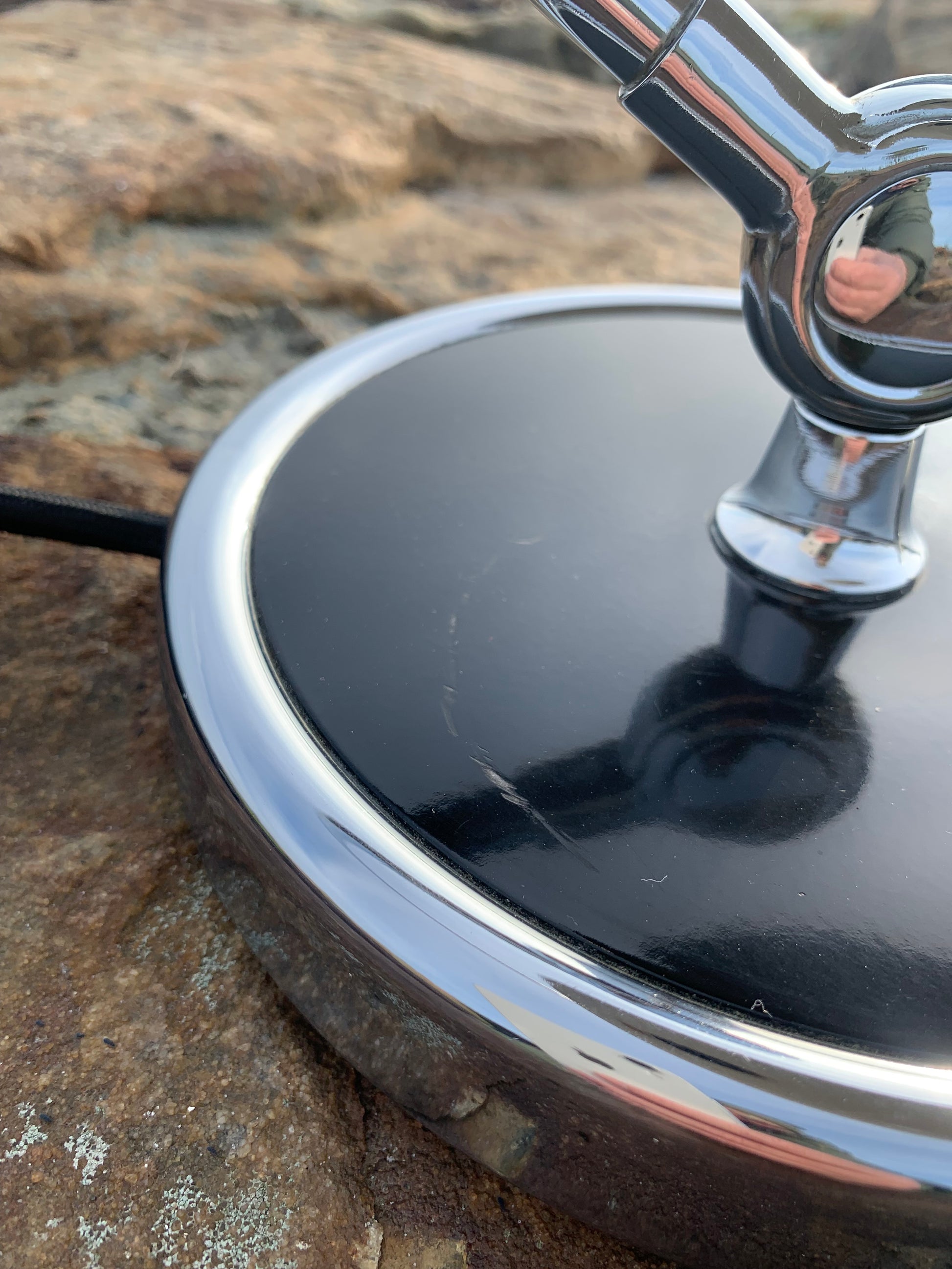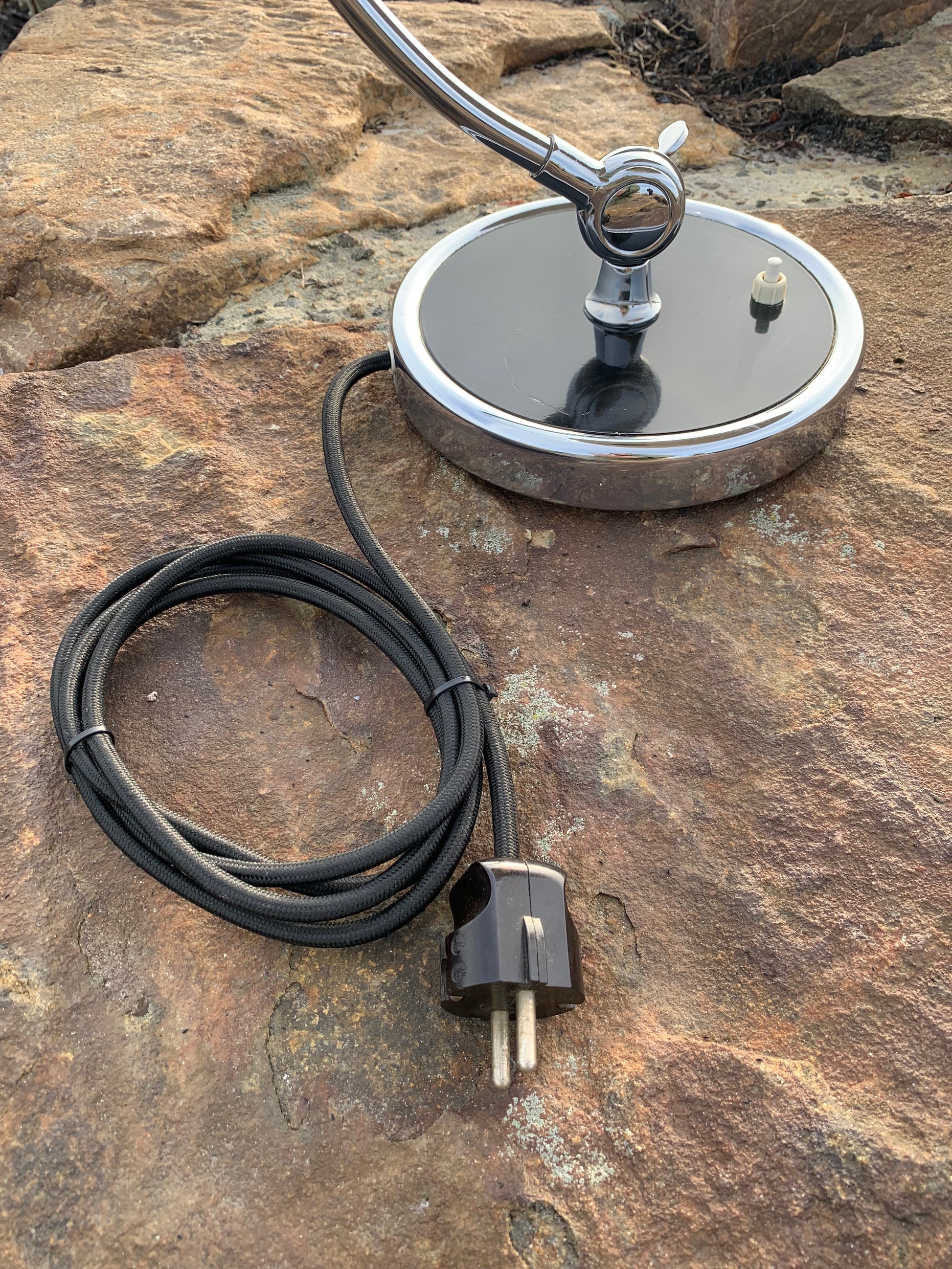 Dette eksemplar fremstår i den originale lakering og med nye kabler. Lampen har lidt aldersrelaterede brugsspor, som sådan en lampe (efter vores smagnærmest bør have) Denne har en ridse på foden samt lidt på kanten af skærmen (se foto) og derfor henvender lampen sig til dig der ser det perfekte i det uperfekte.
