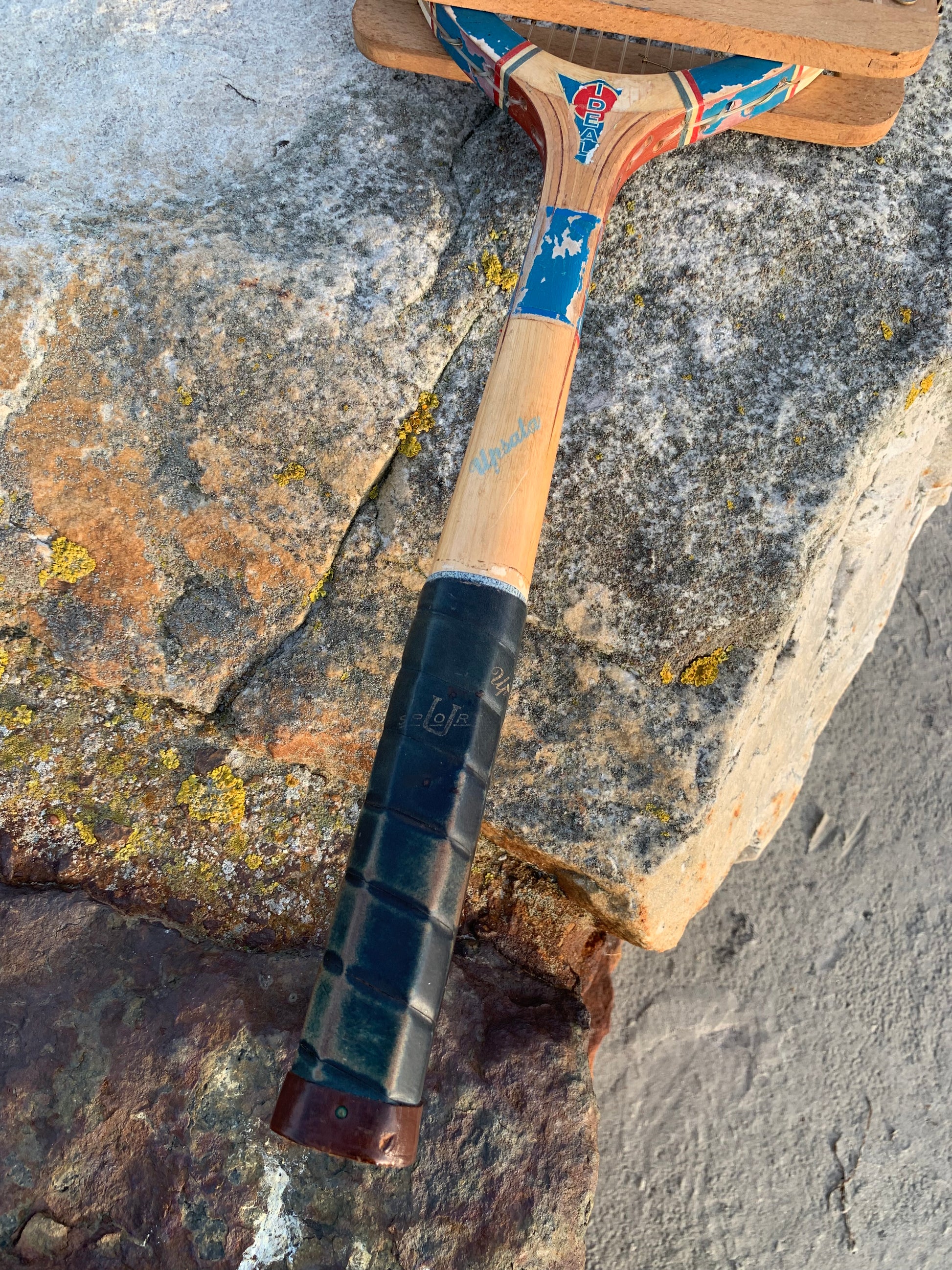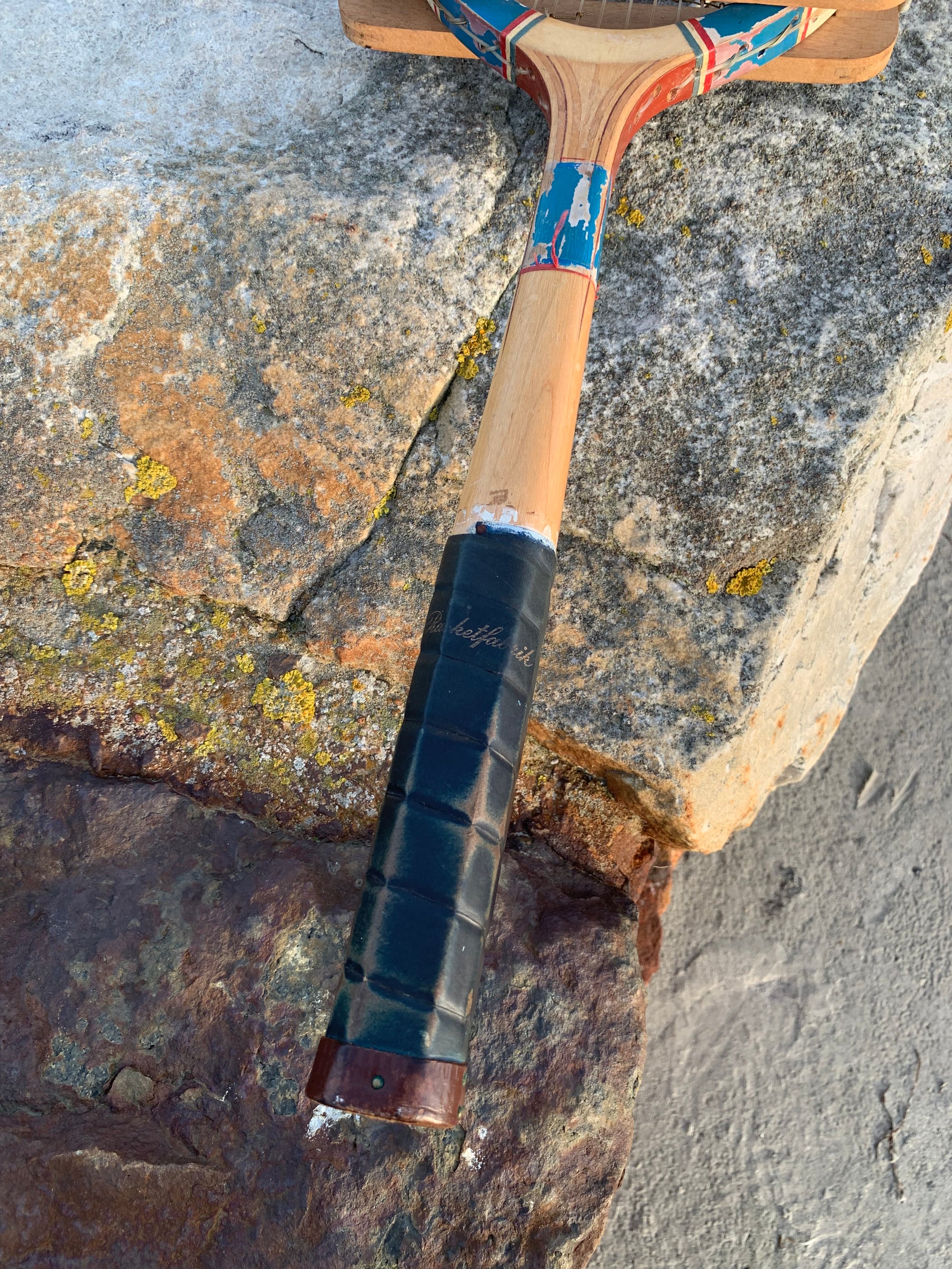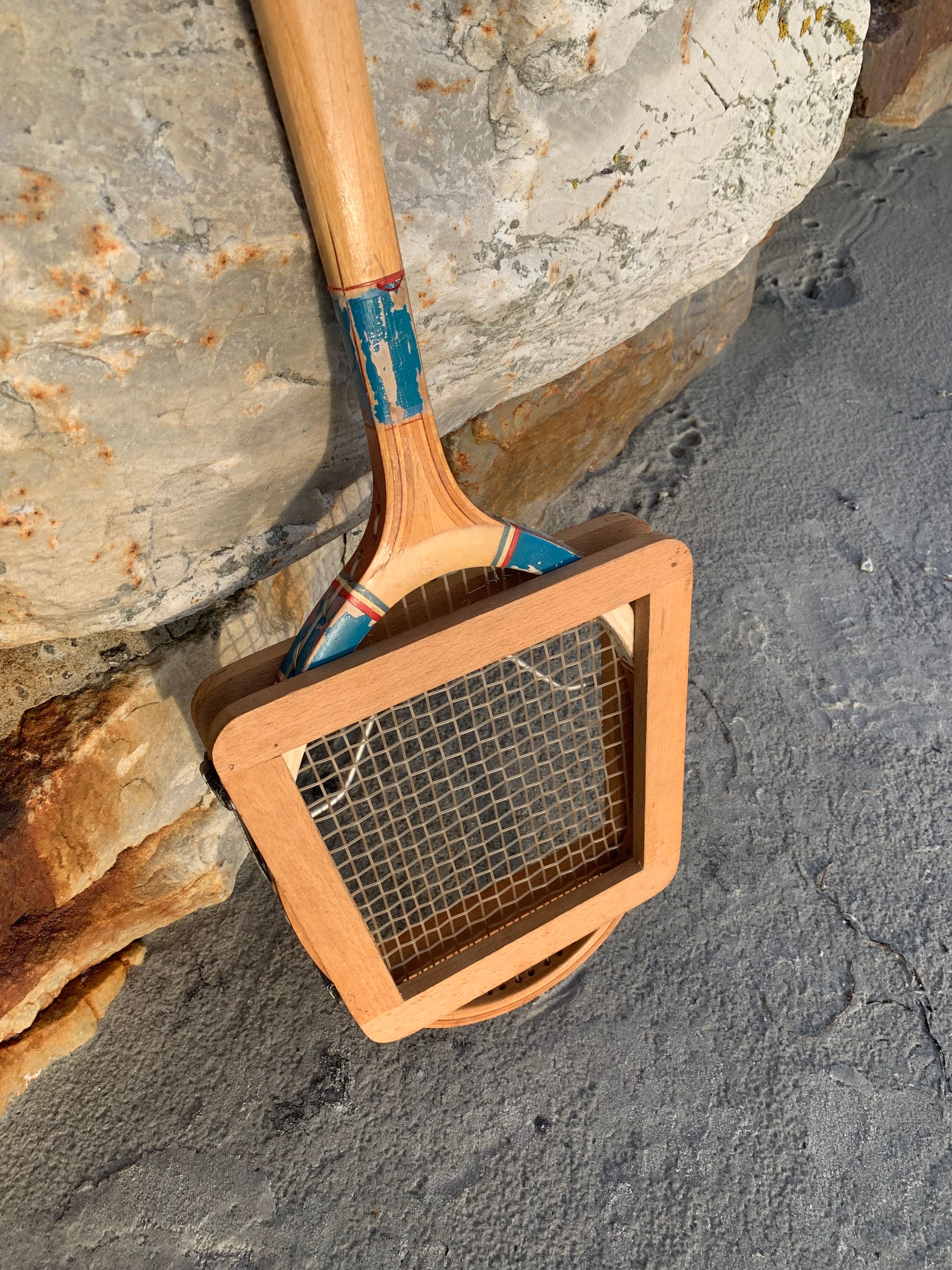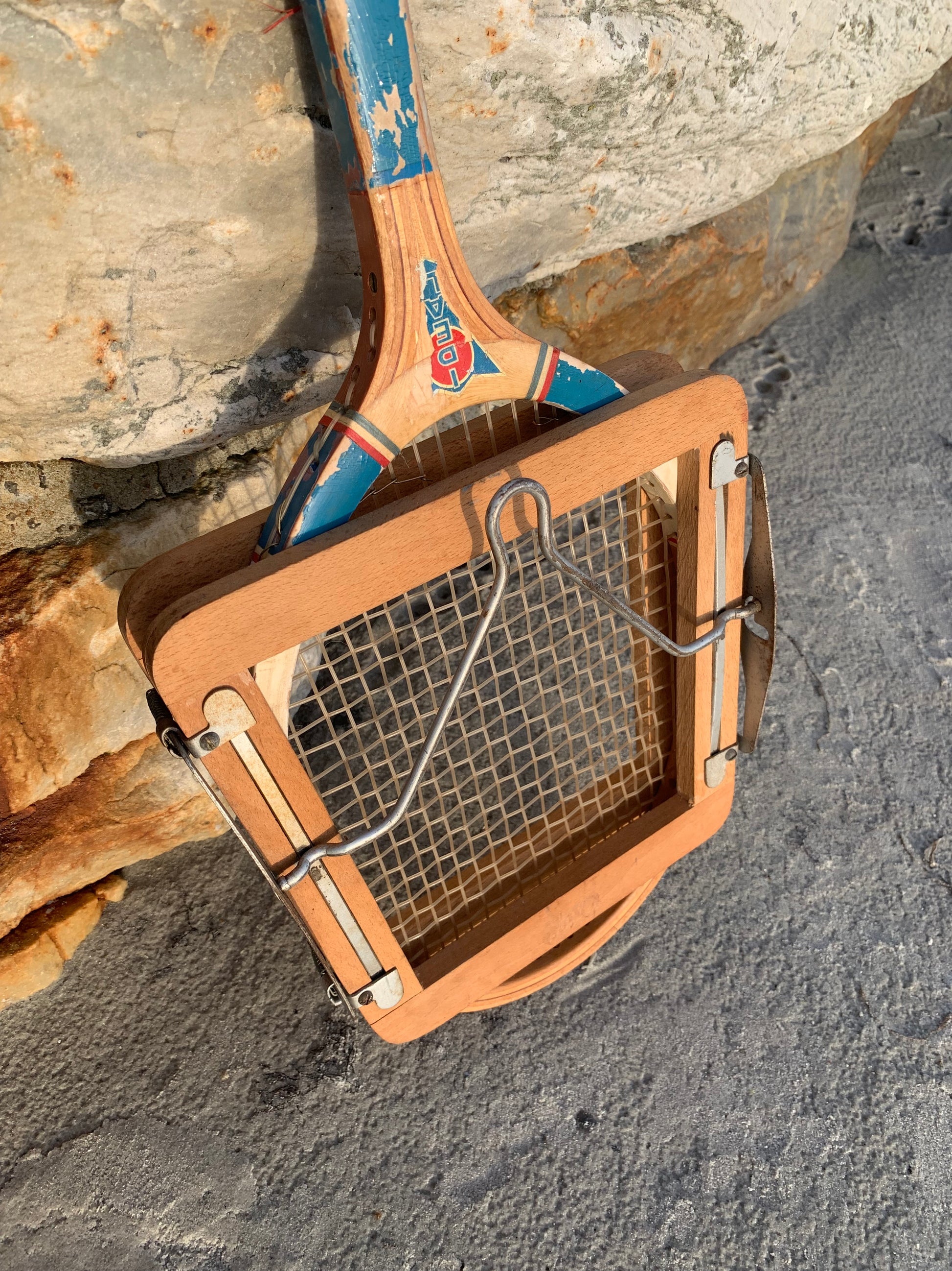 Fin og meget dekorativ gammel tennisketcher med ramme.