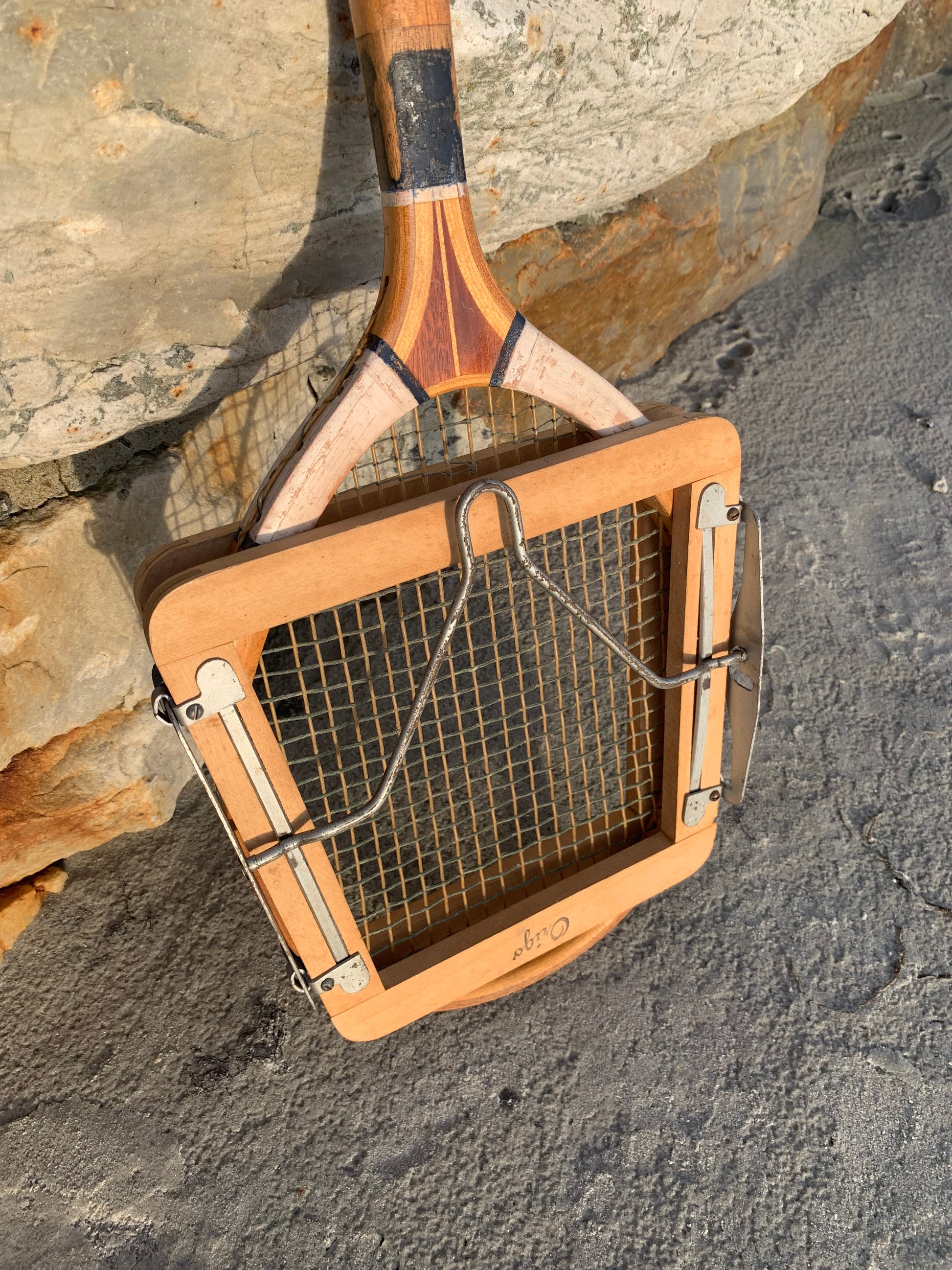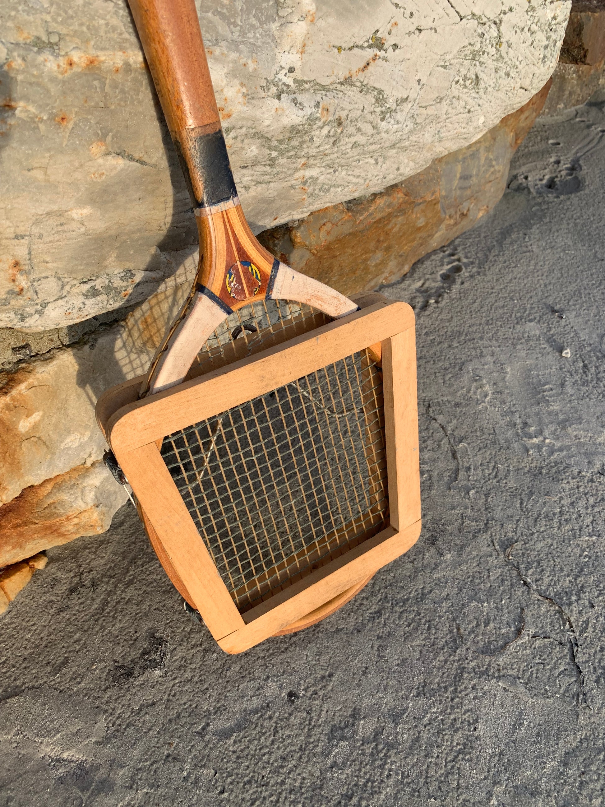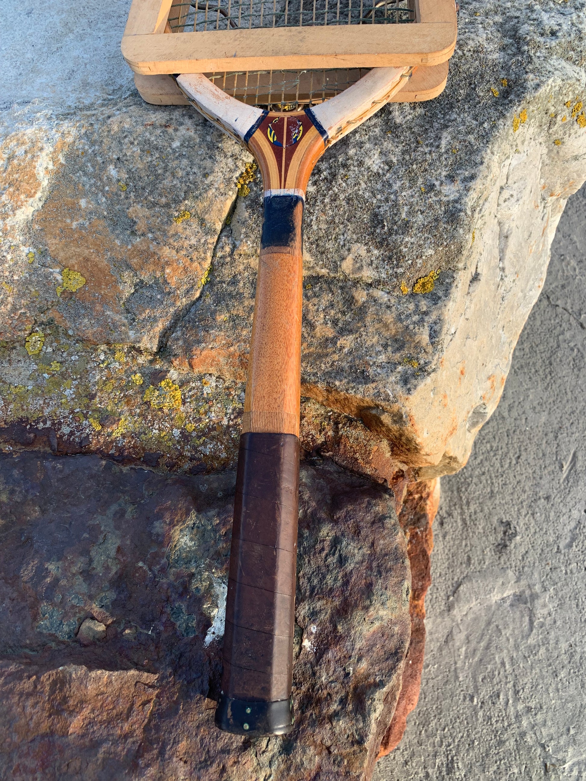 Fin og meget dekorativ gammel tennisketcher med ramme.