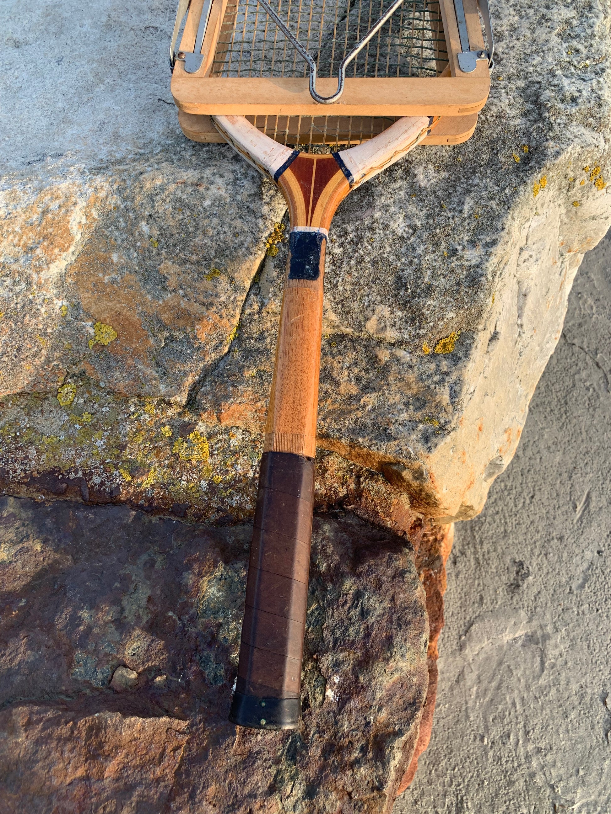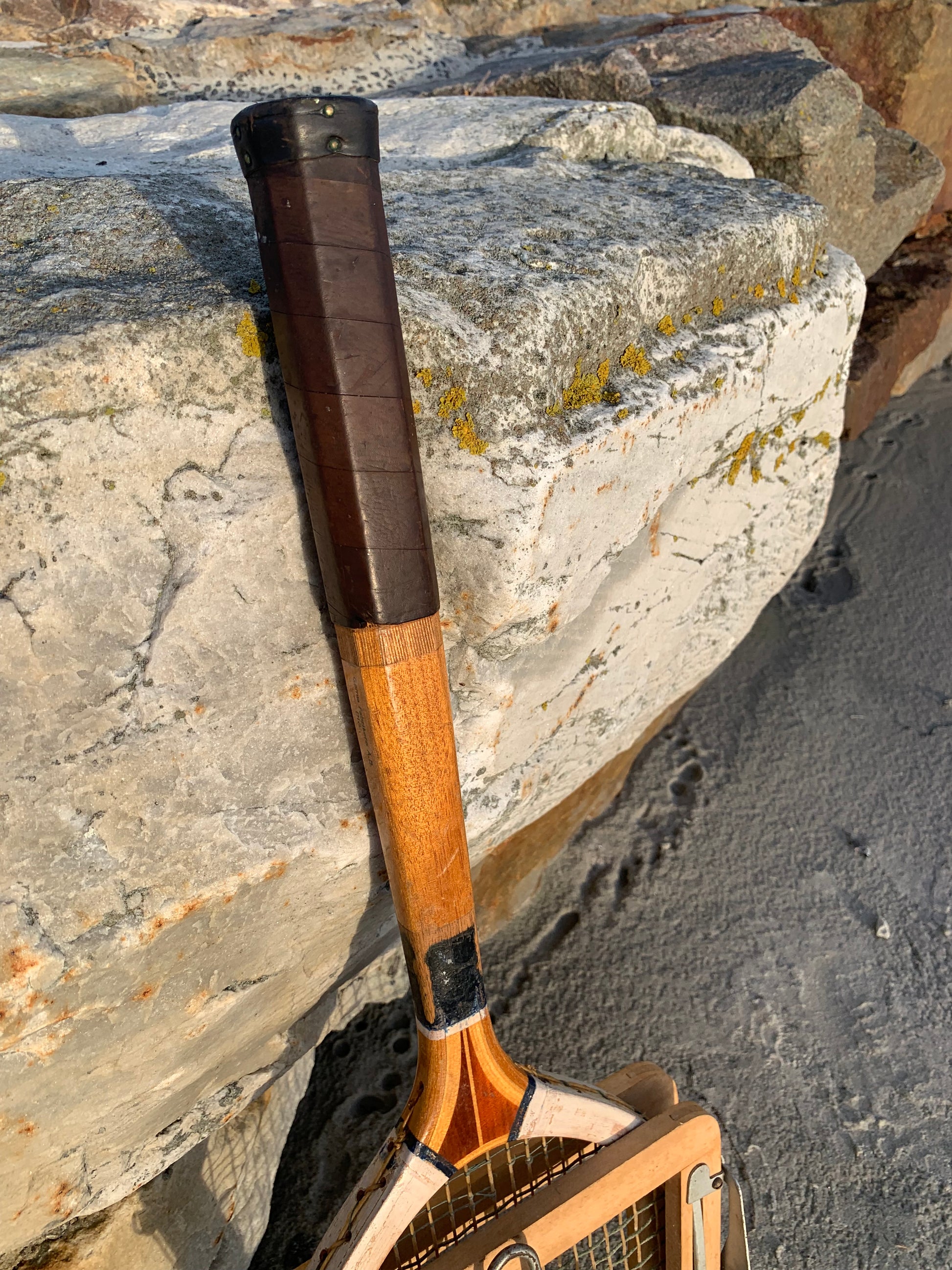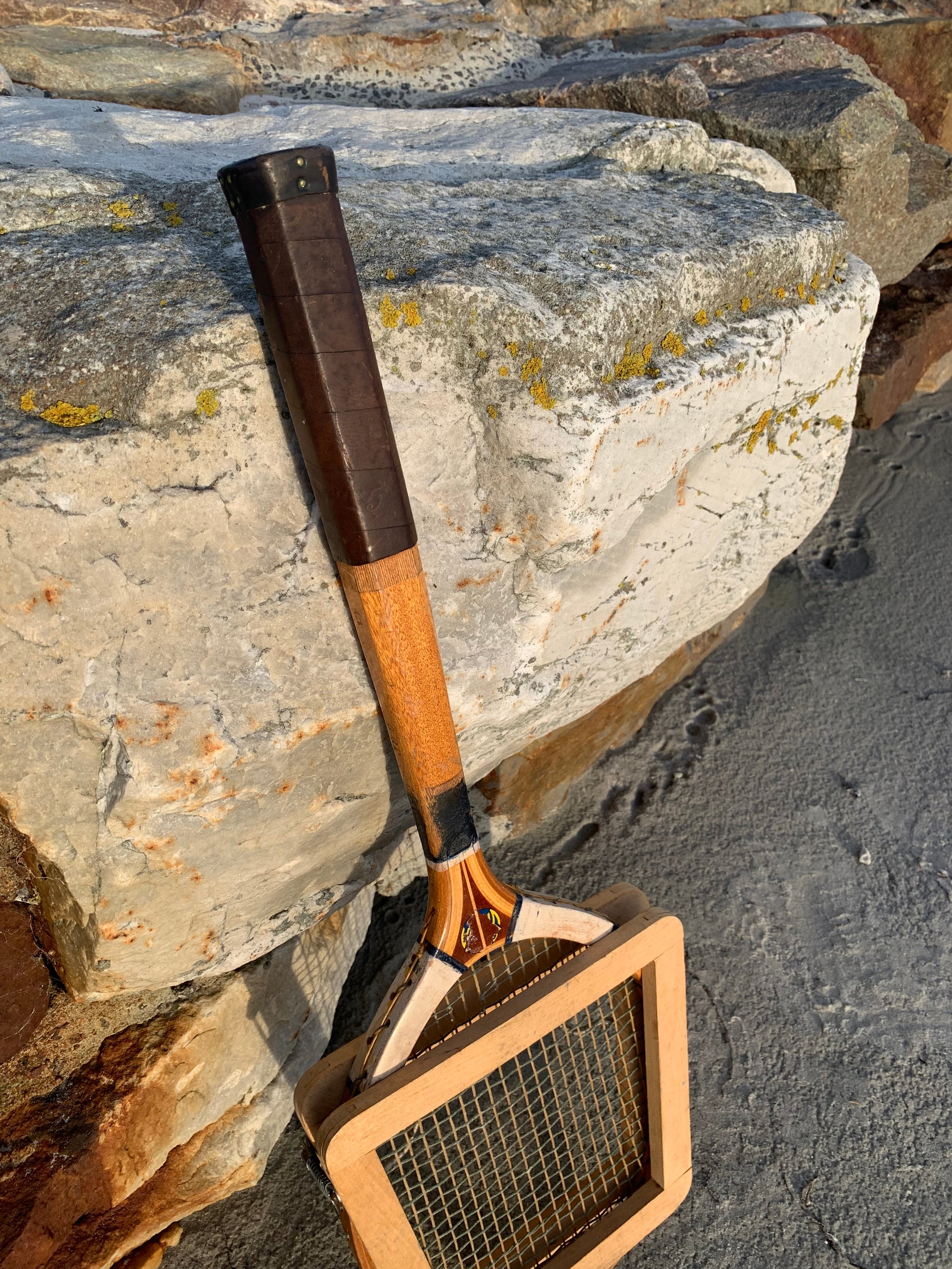 Fin og meget dekorativ gammel tennisketcher med ramme.