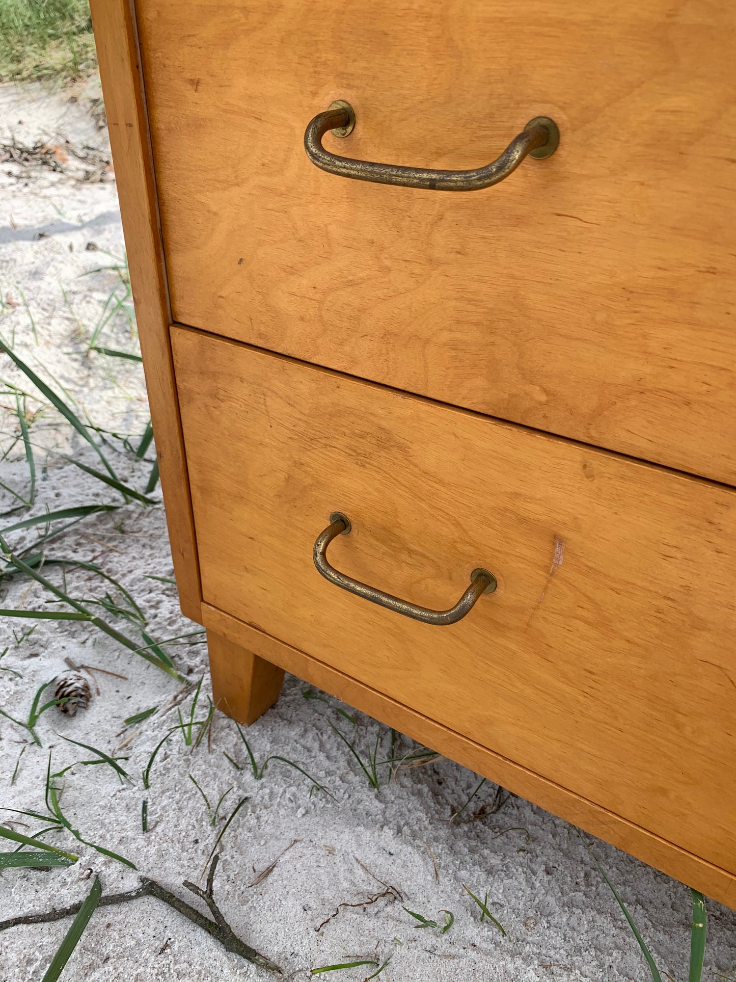 Fin lille kommode med tre skuffer. Tidens tand har bidt en lille smule i den, men efter vores smag er det bare charmerende.