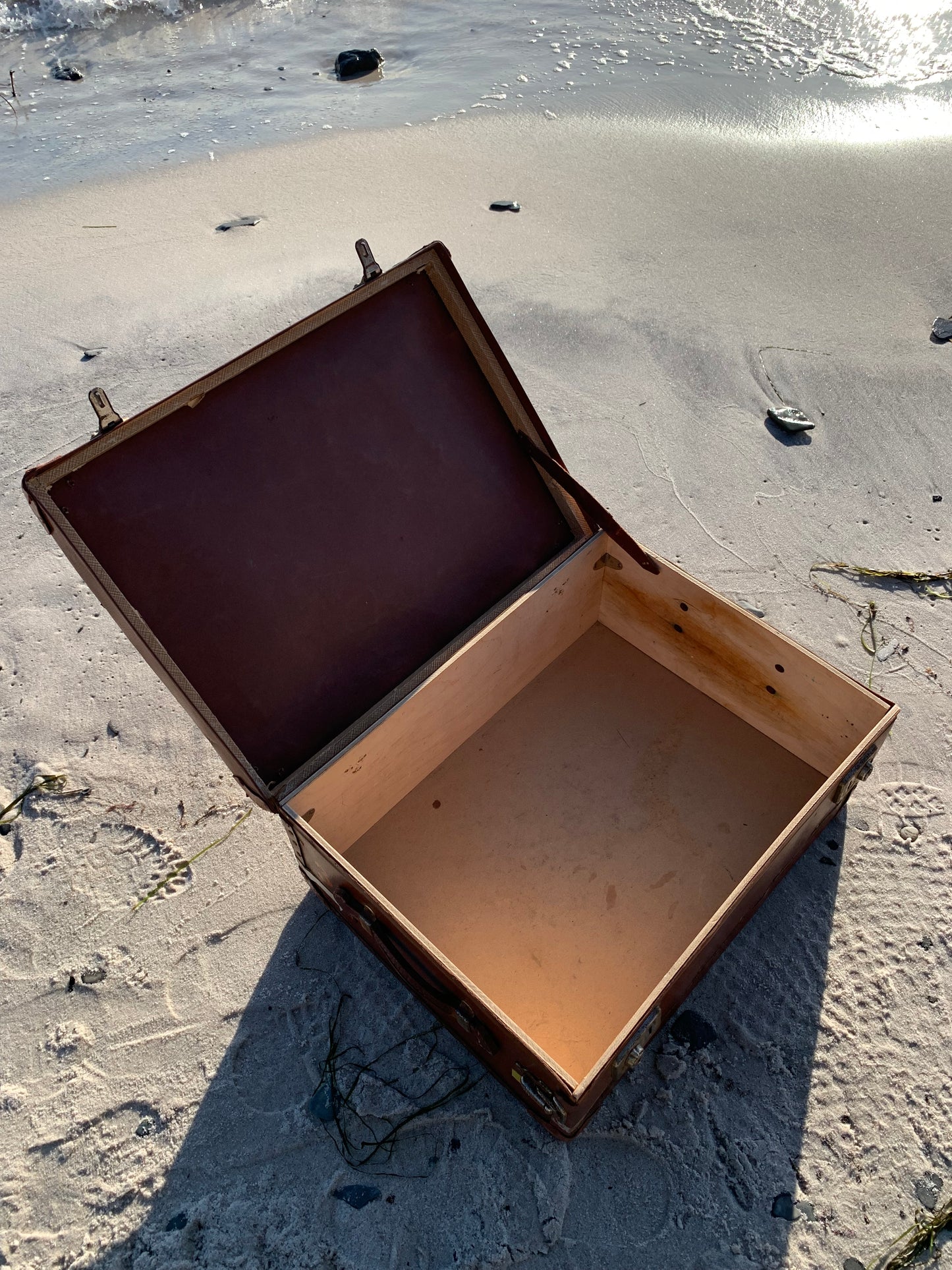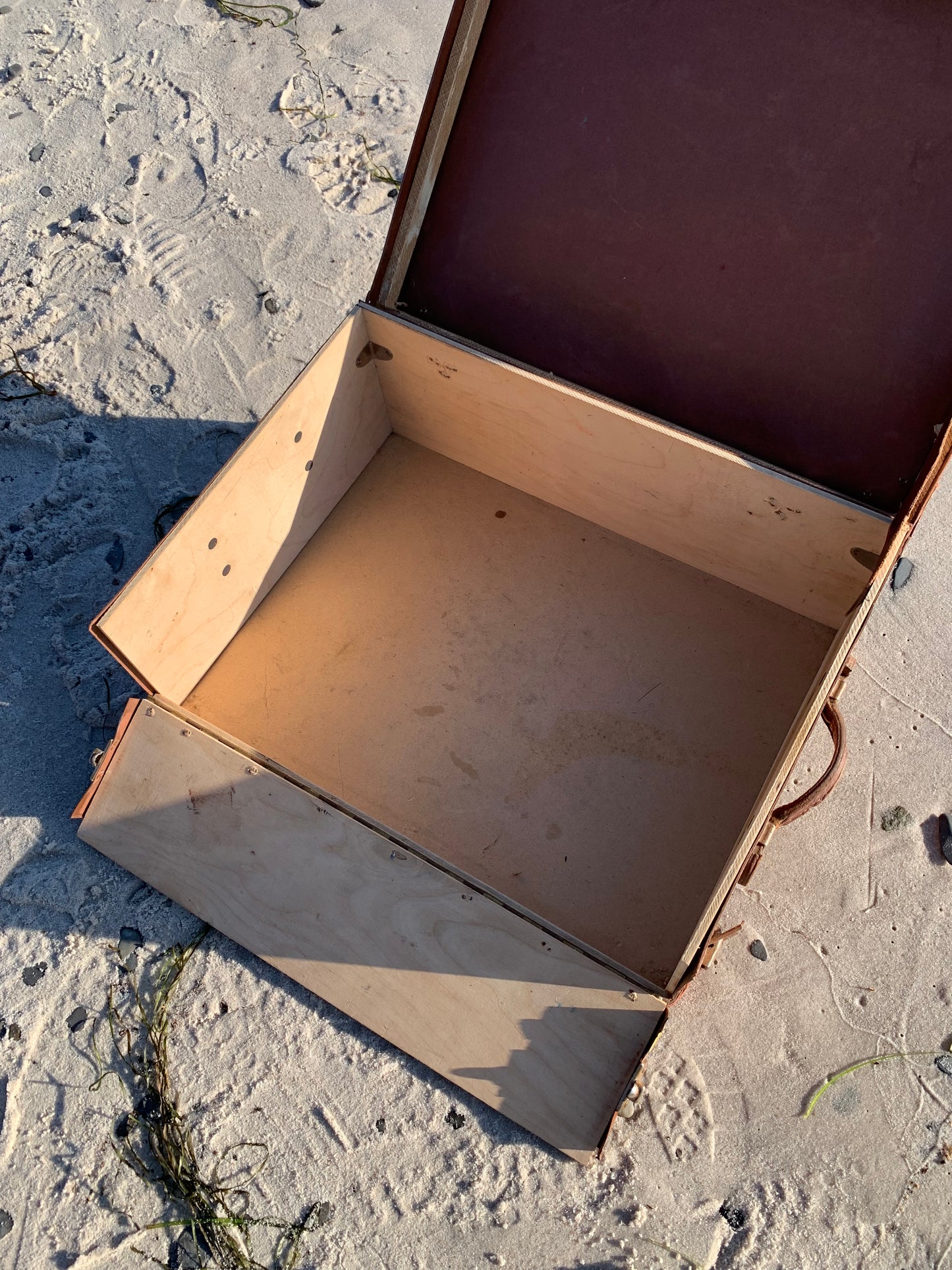 Sjov og charmerende kuffert beklædt med træ indeni. Kufferten kan åbne fronten.
