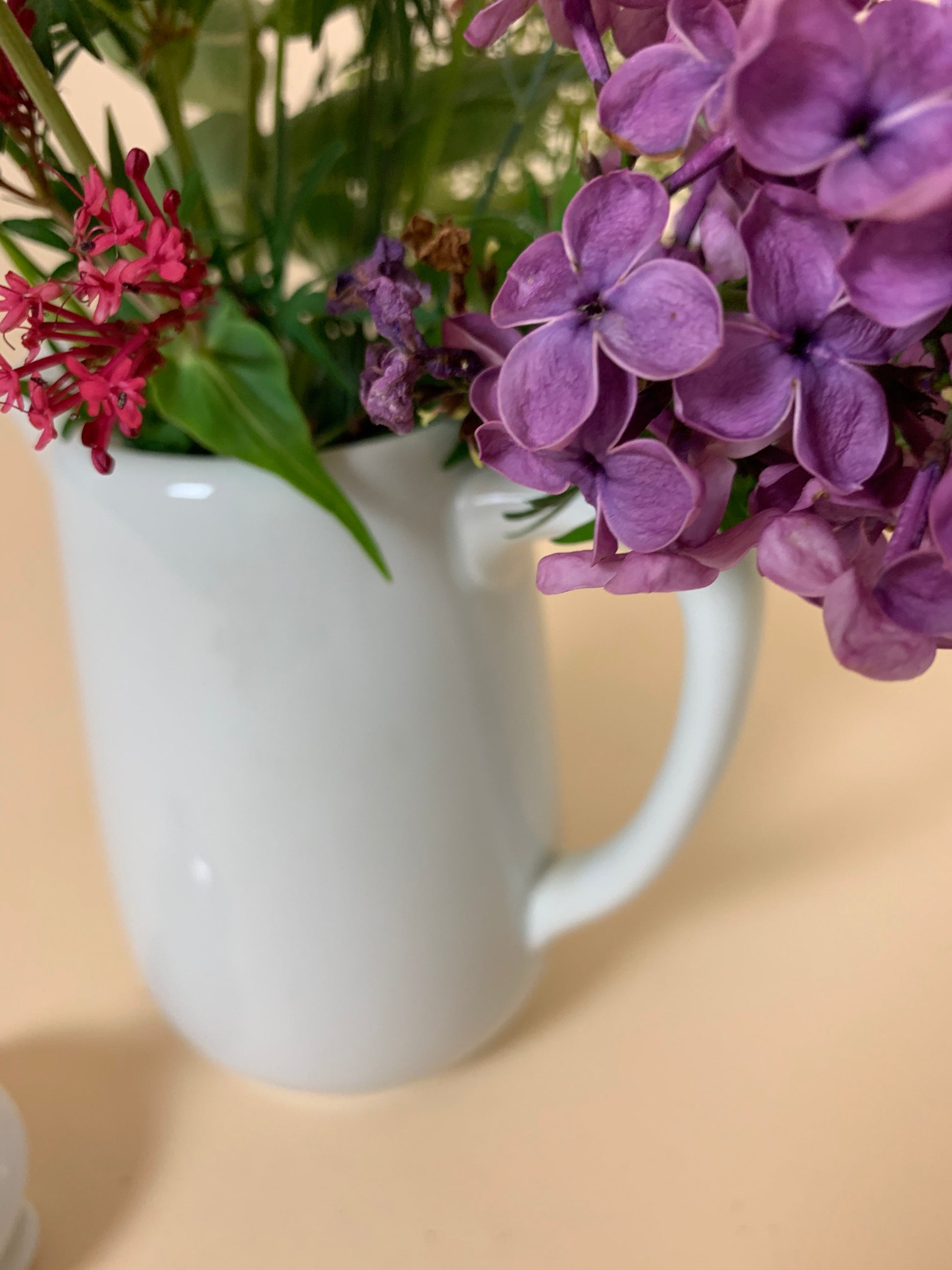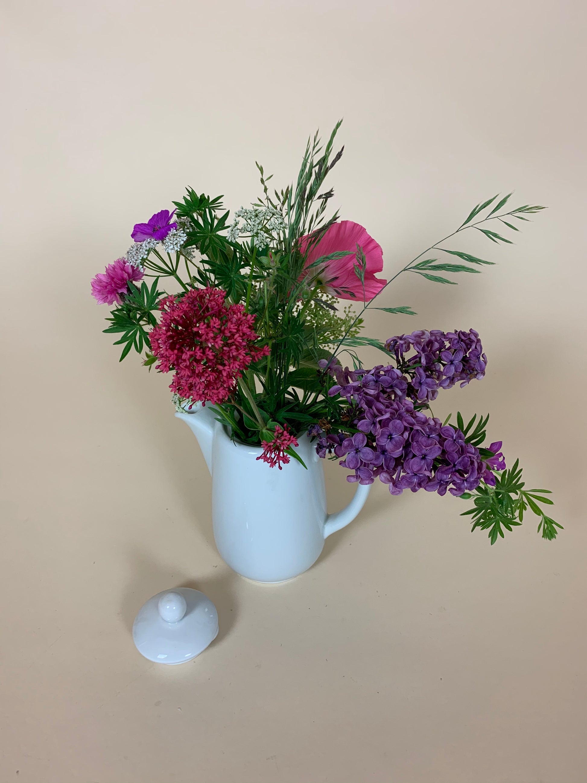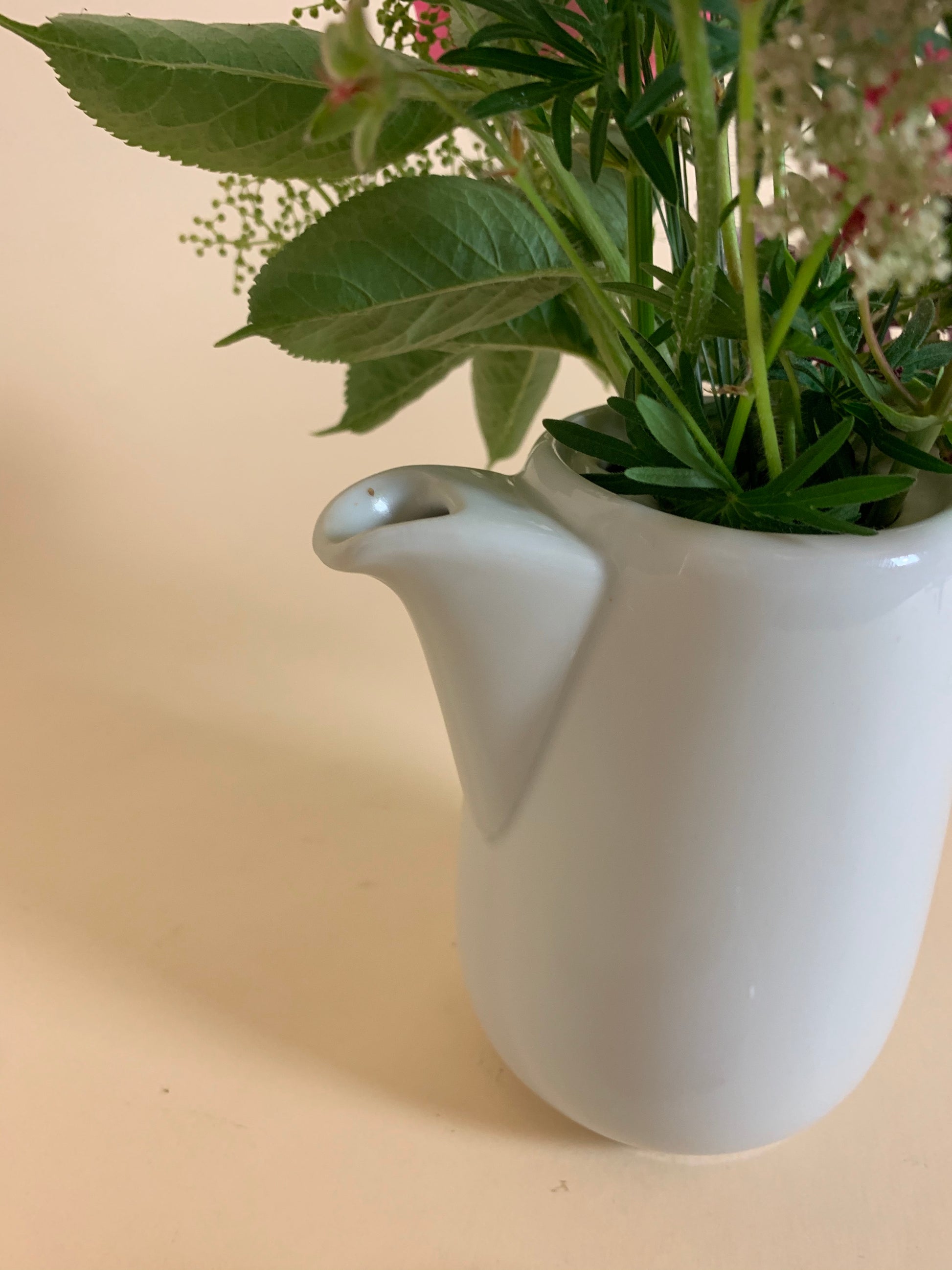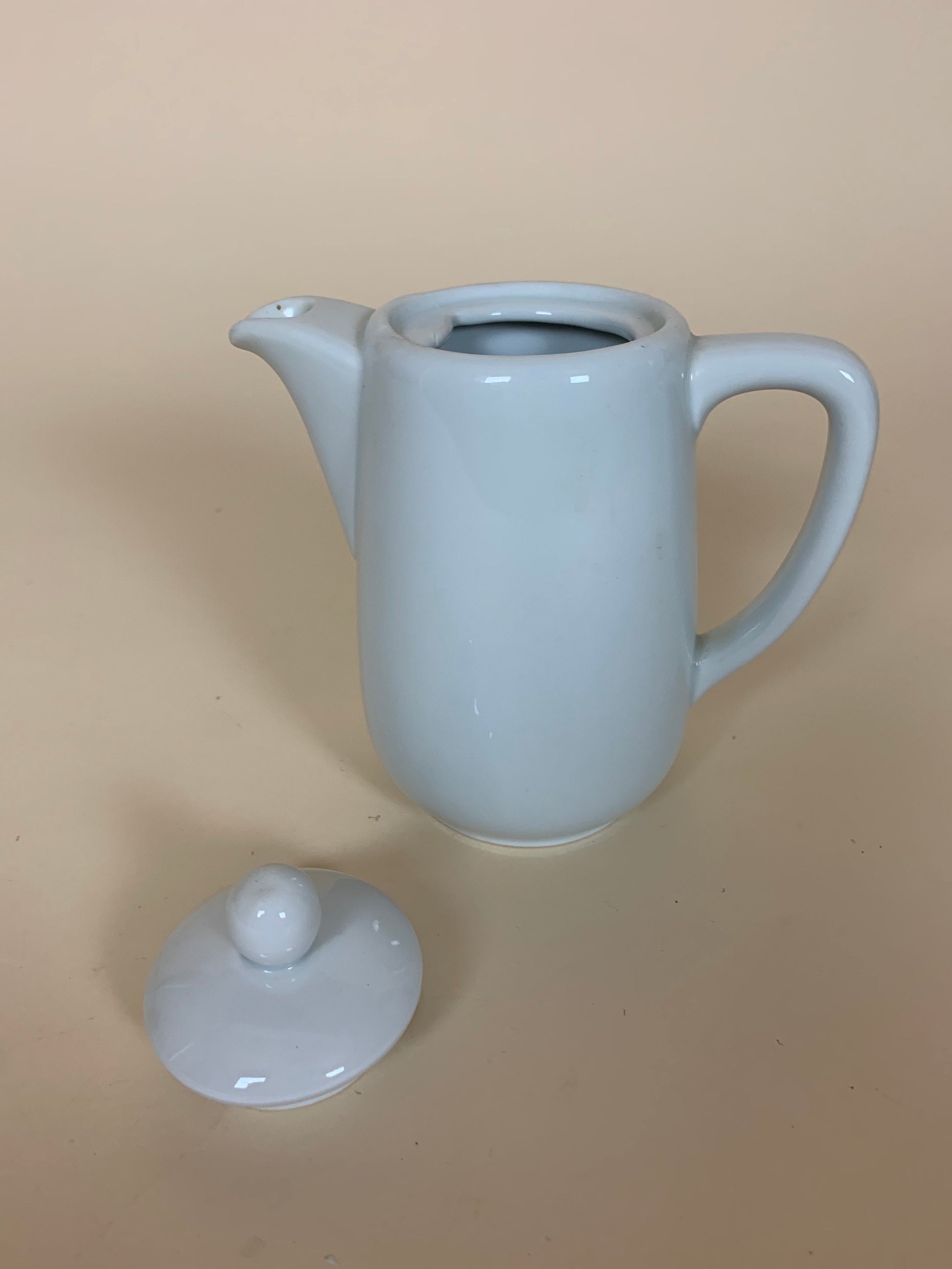 Fin porcelænskande med et låg der sidder fast når der hældes af kanden.