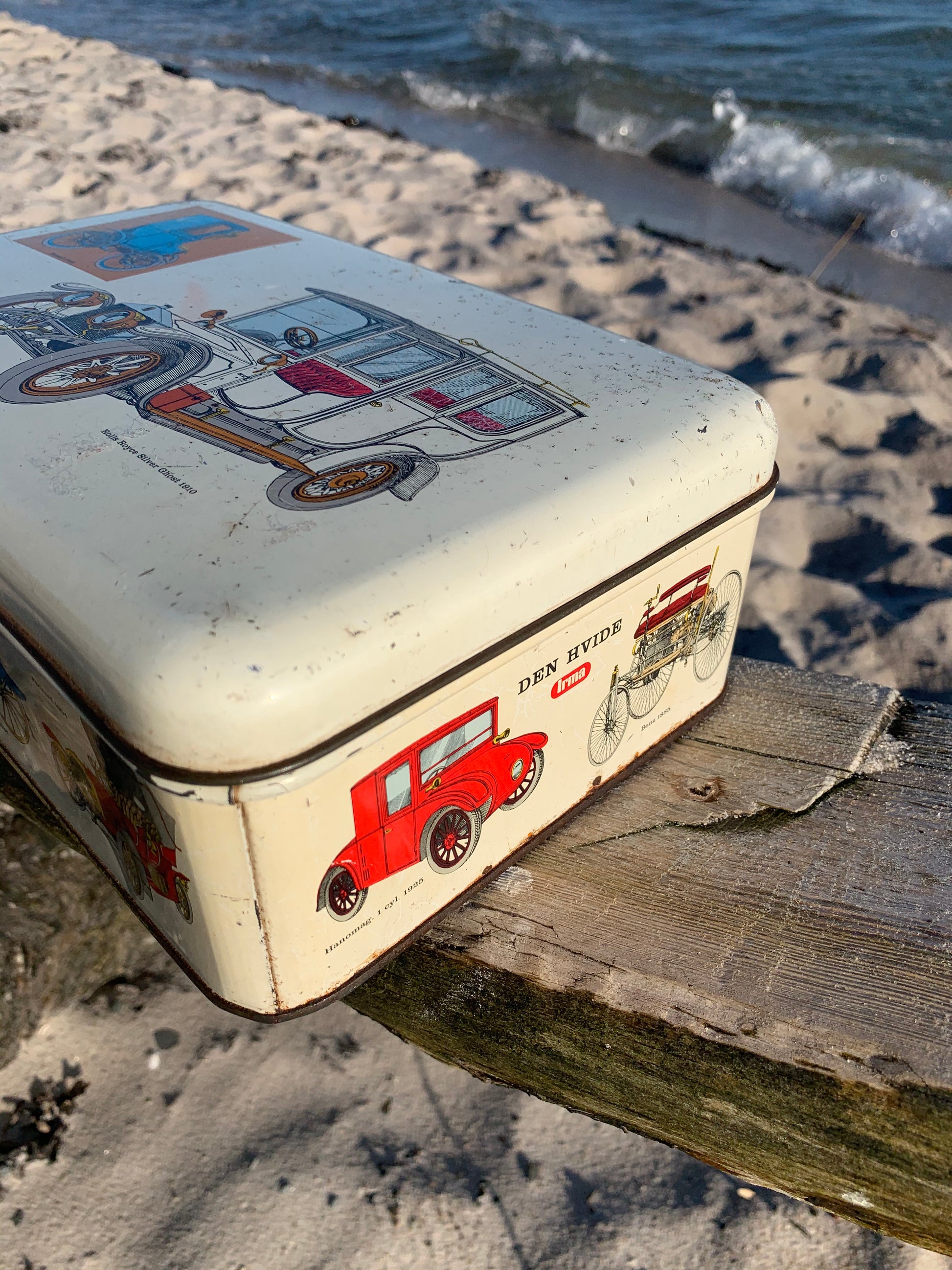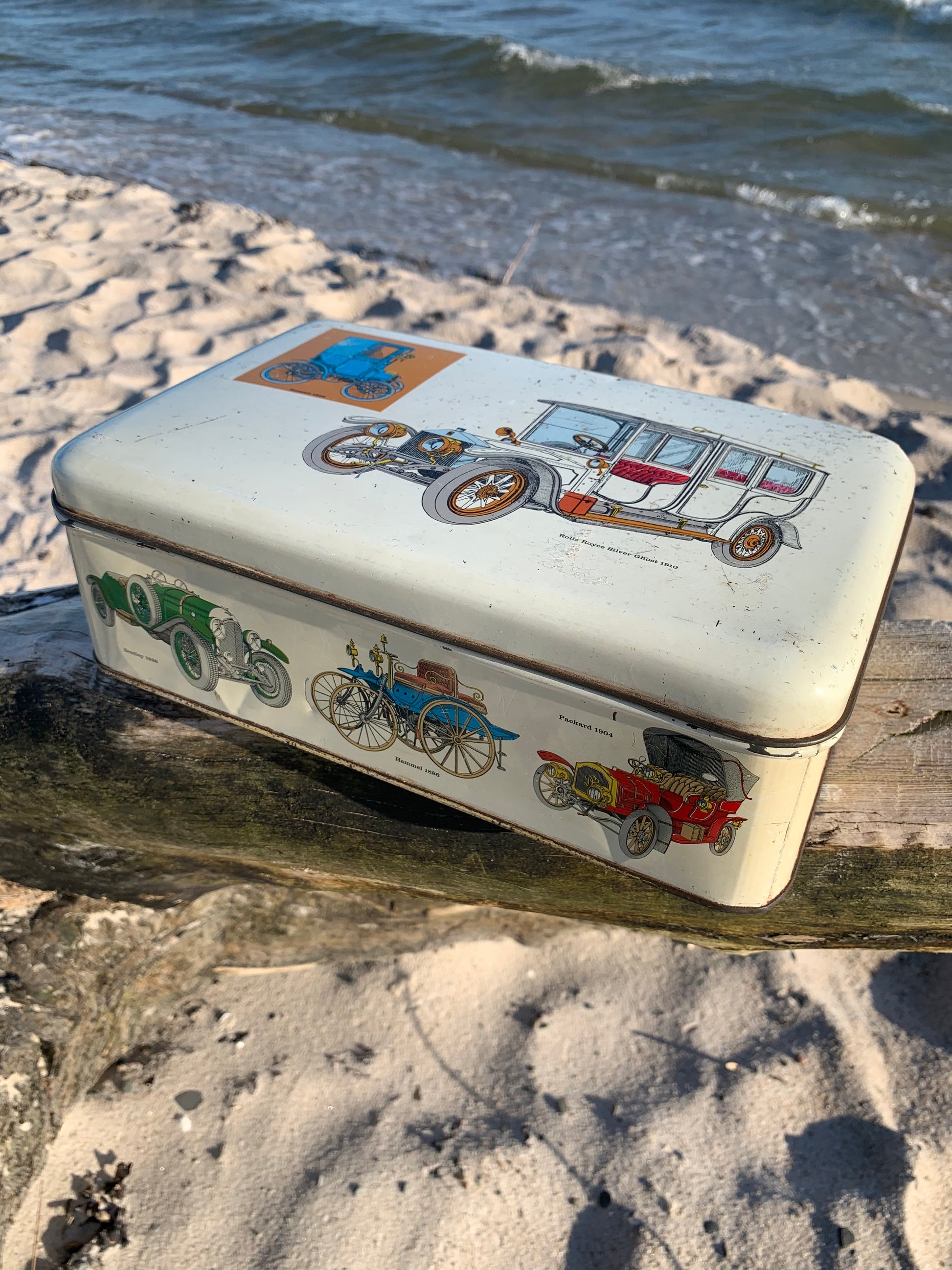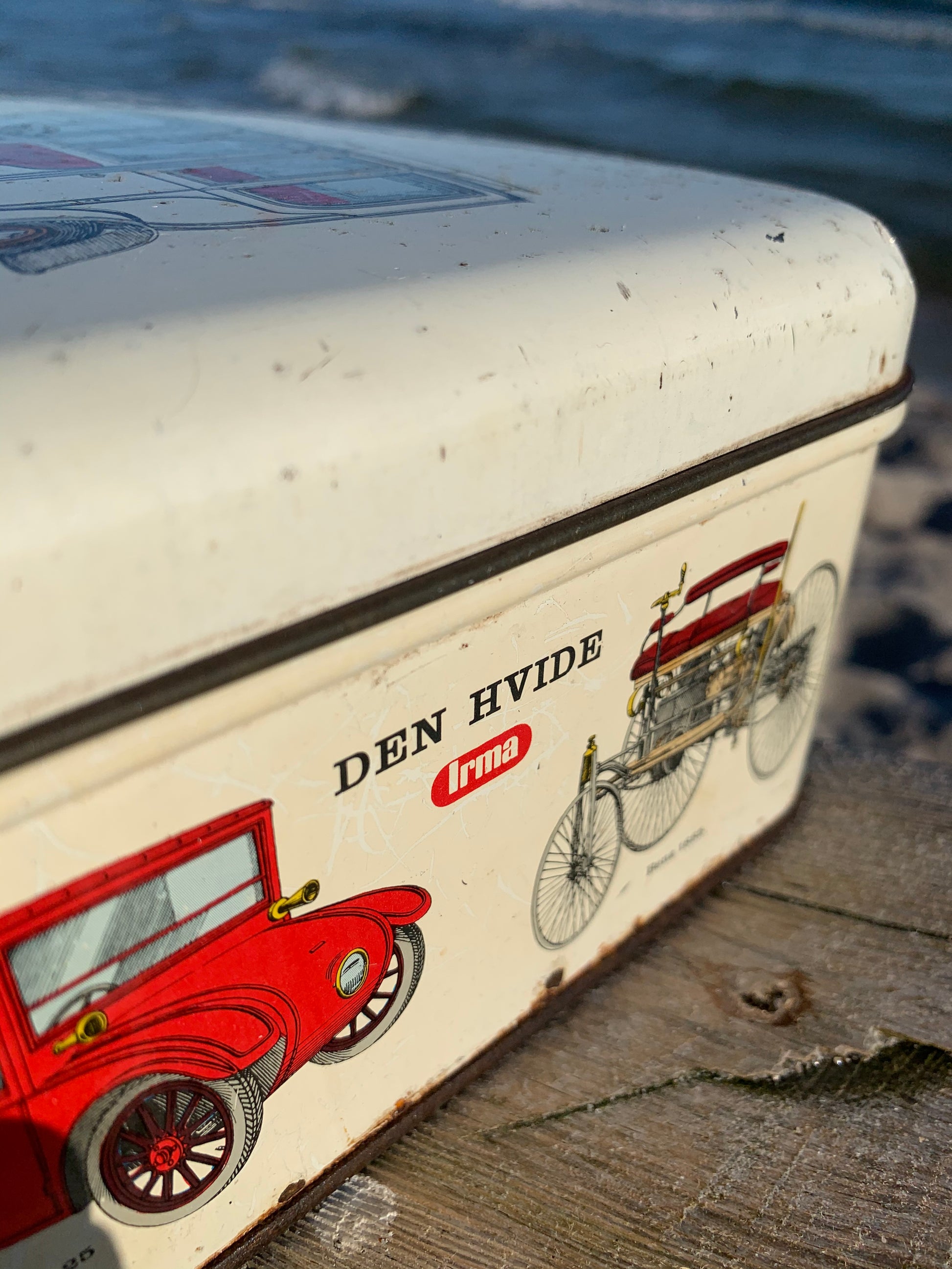 Sjov gammel metalæske fra Irma med bilmotiver.