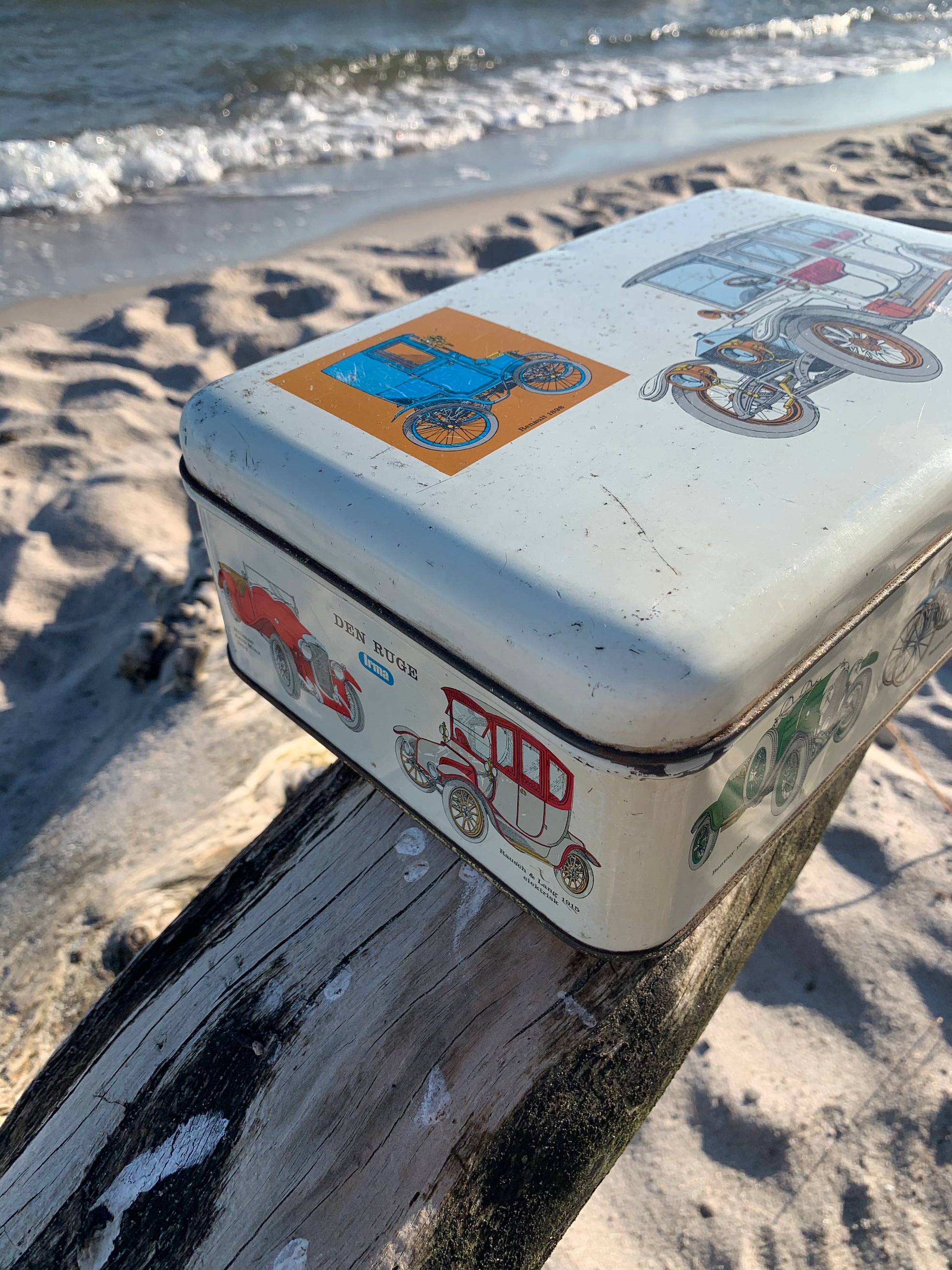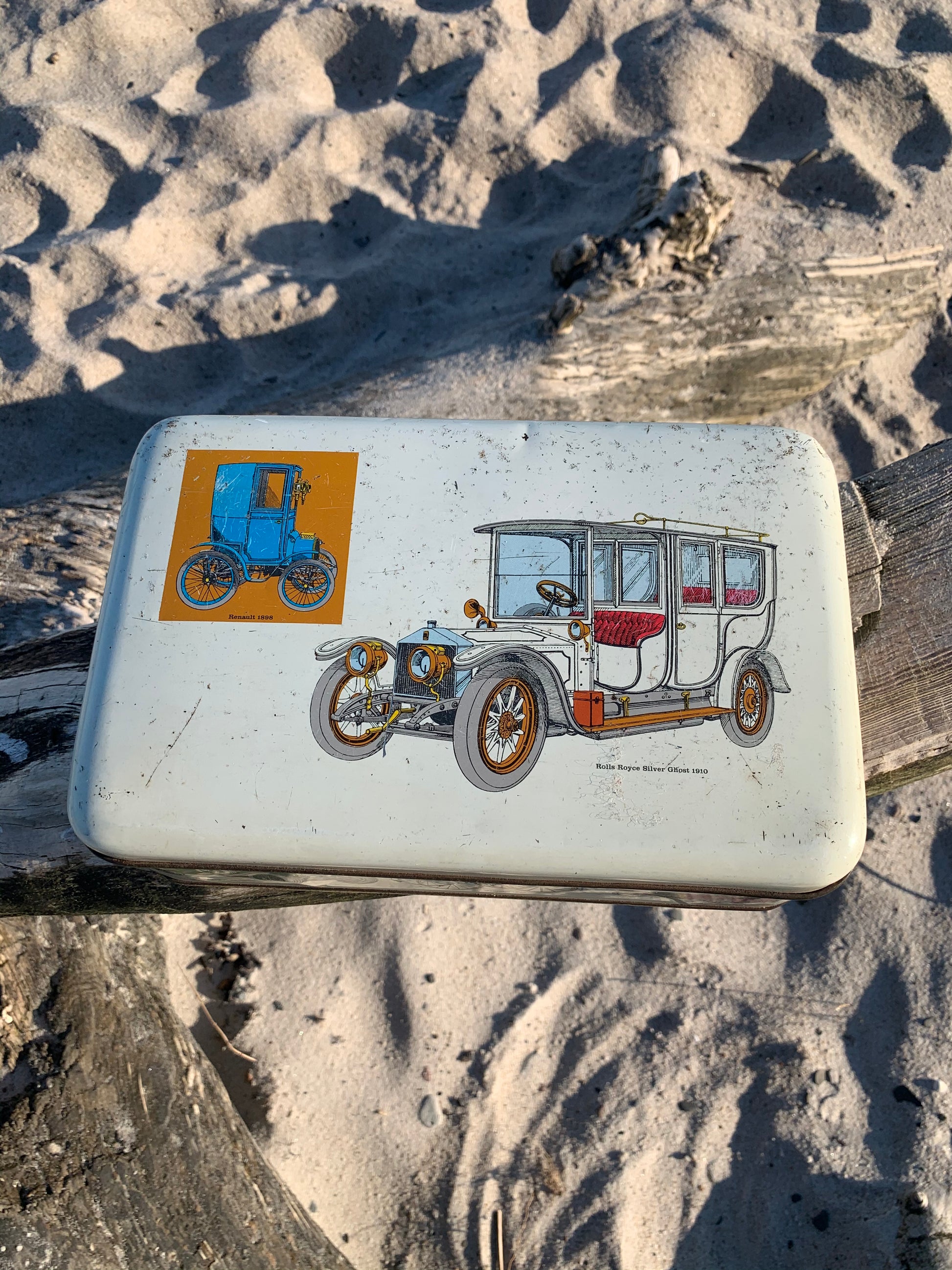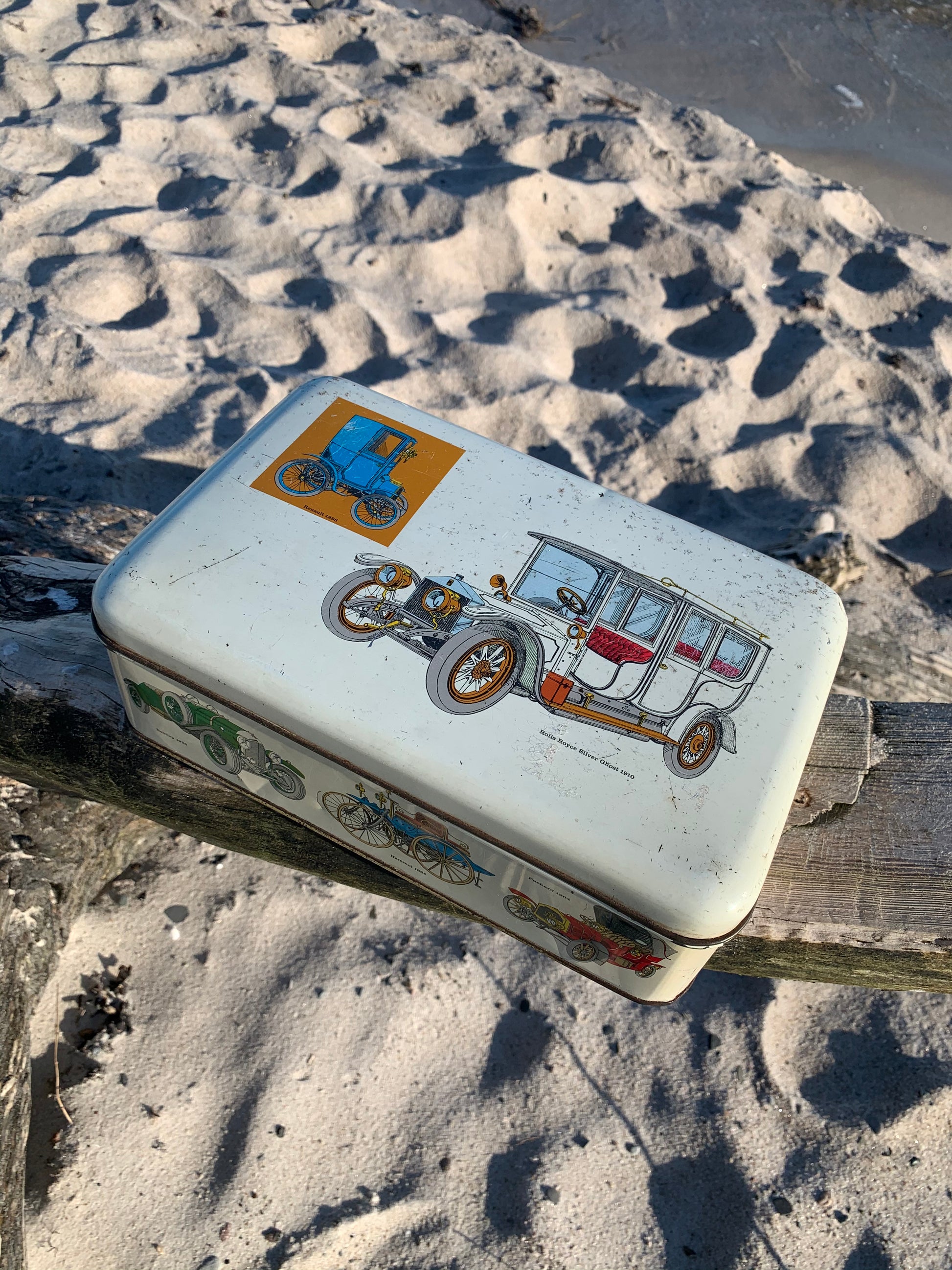 Sjov gammel metalæske fra Irma med bilmotiver.