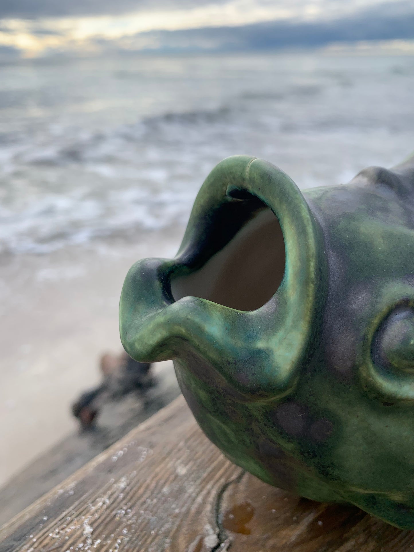 Michael Andersen fiskevase. Standen er gammel og god, der er ikke nogen skår eller afslag. Der er dog en minimal revne i glasuren samt lille ujævnhed indeni ved munden (dette ses ikke men kan konstateres når en finger køres rundt i kanten)