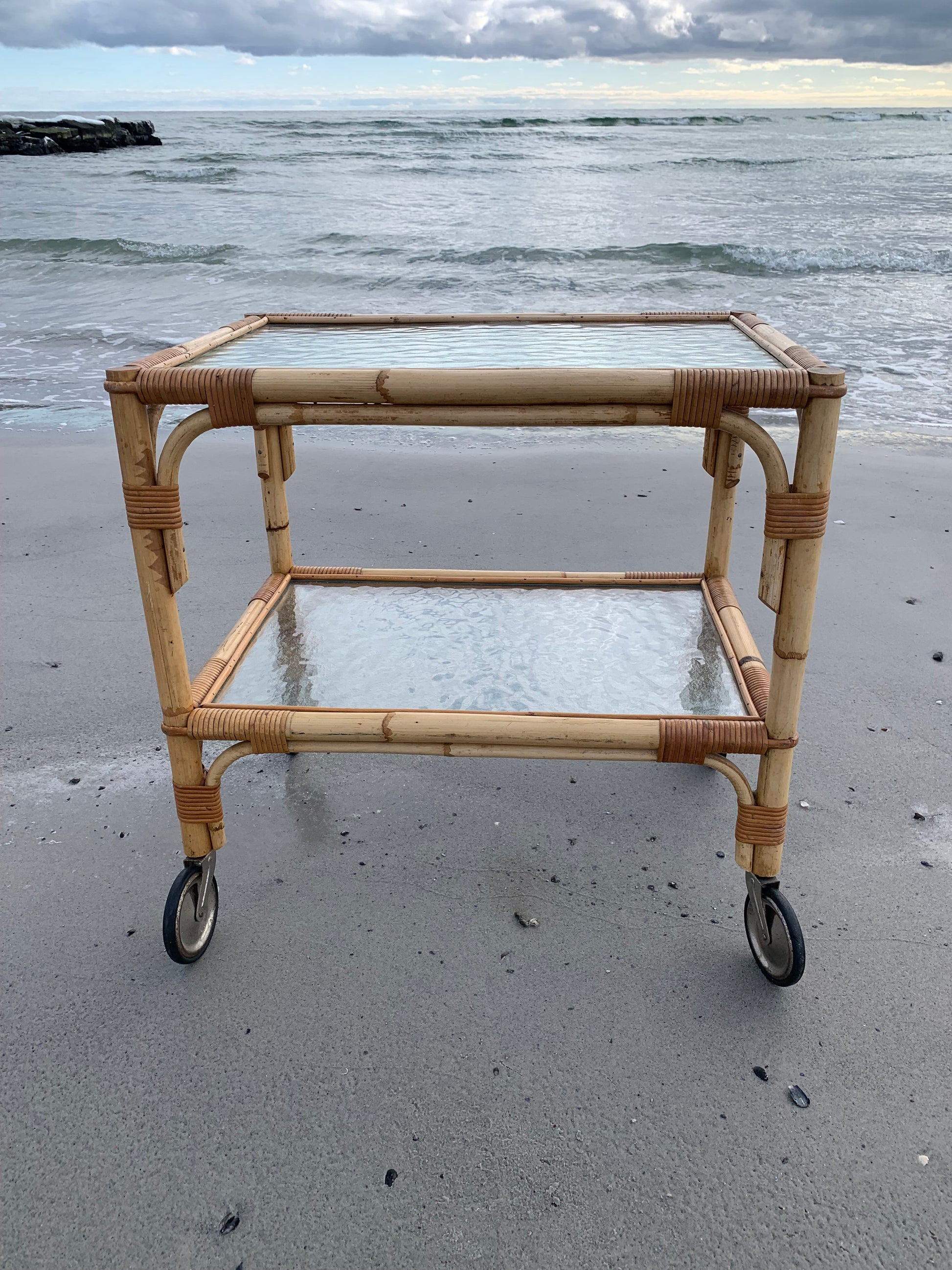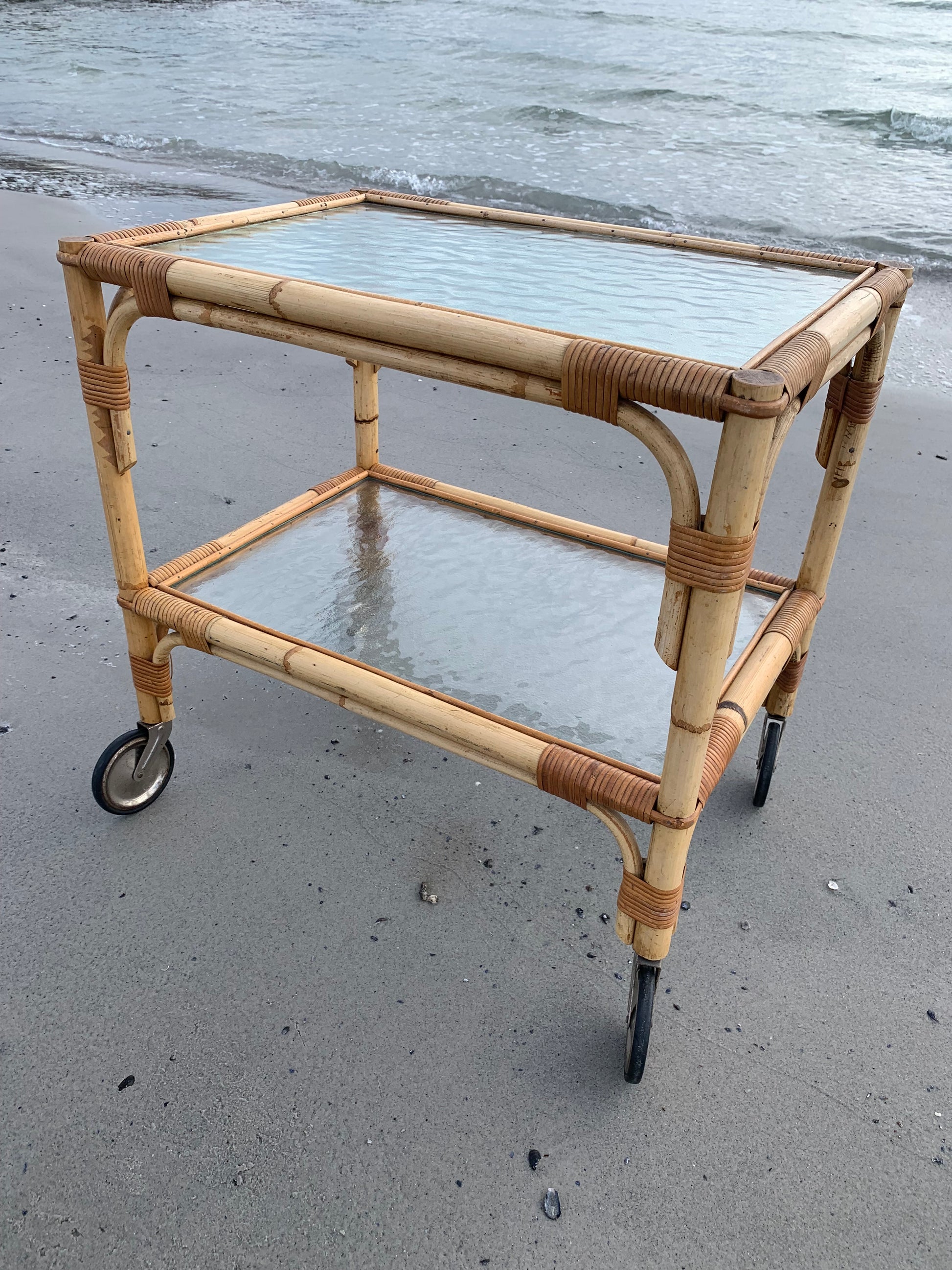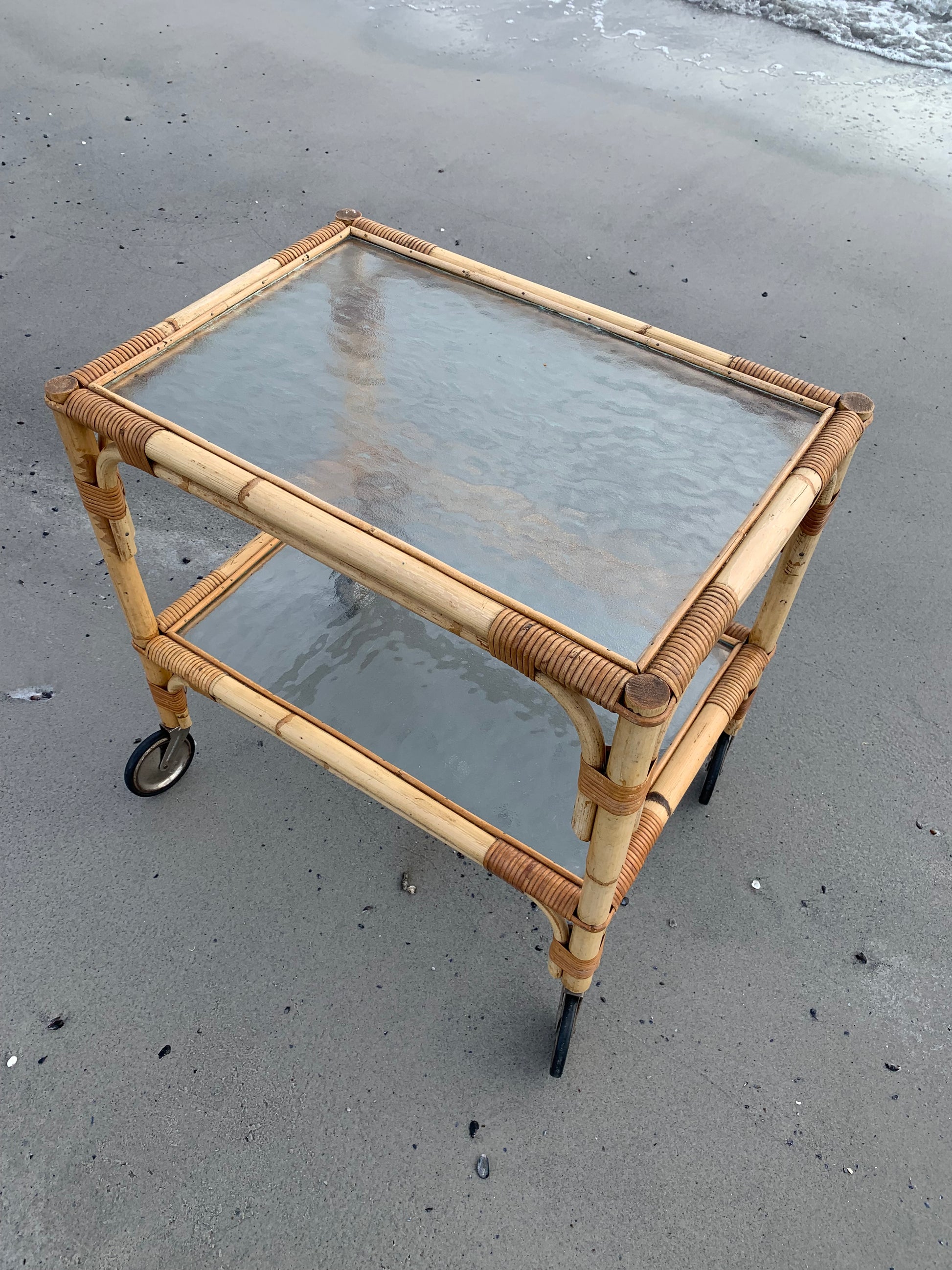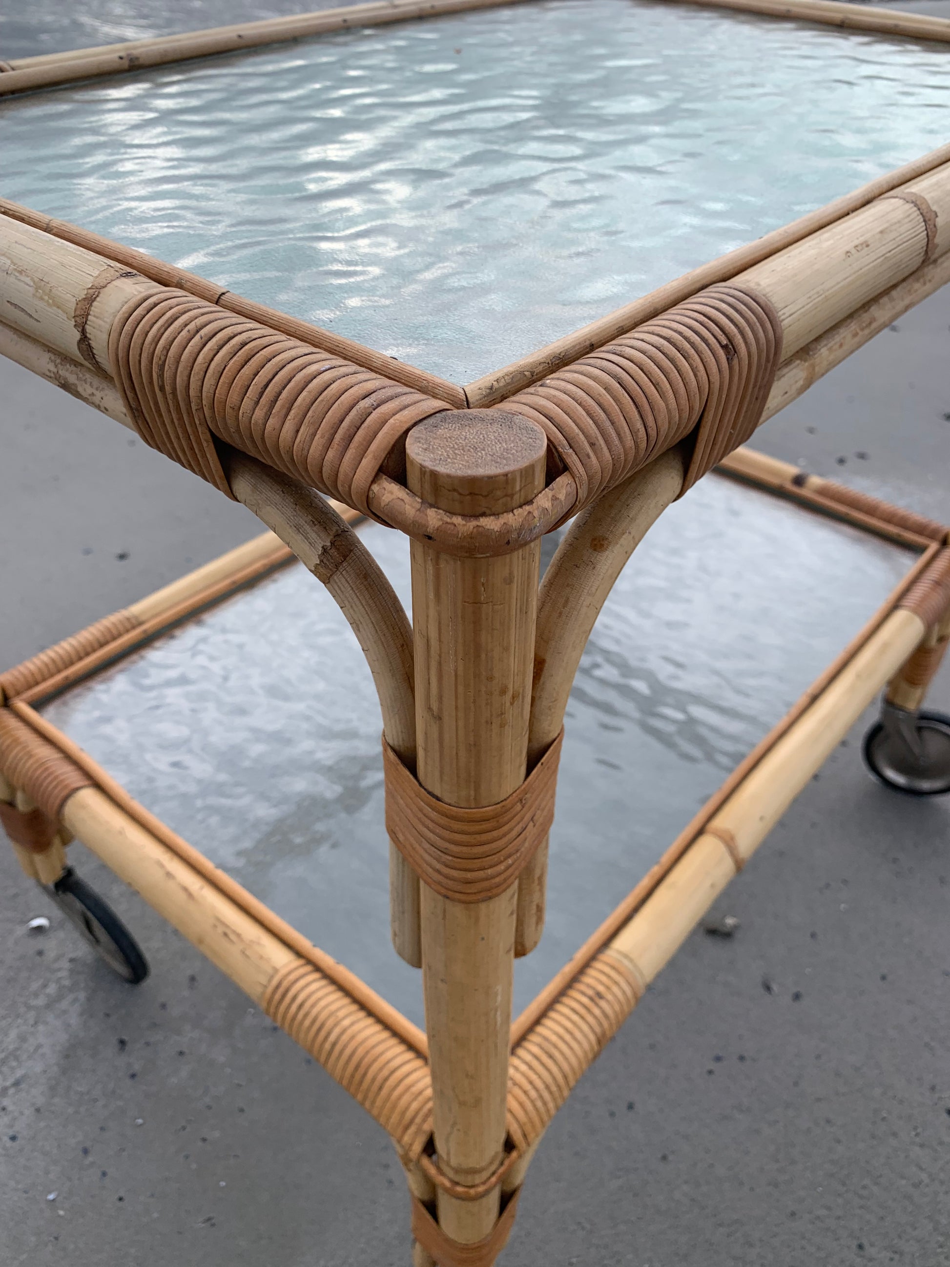 Fint og charmerende bambus bord/vogn med 2 glasplader og hjul. Bordet/vognen har en smule aldersrelaterede brugsspor men er overordnet i en rigtig god vintagestand.