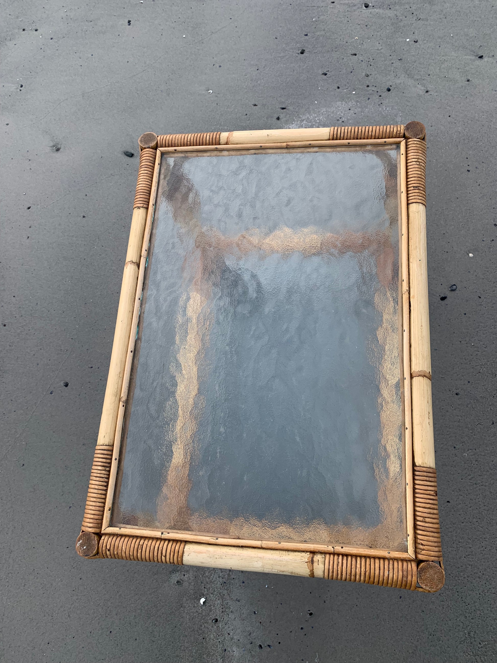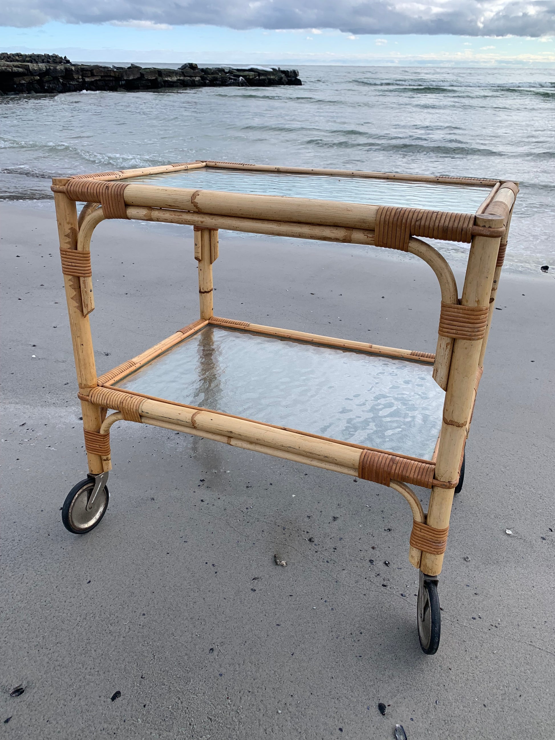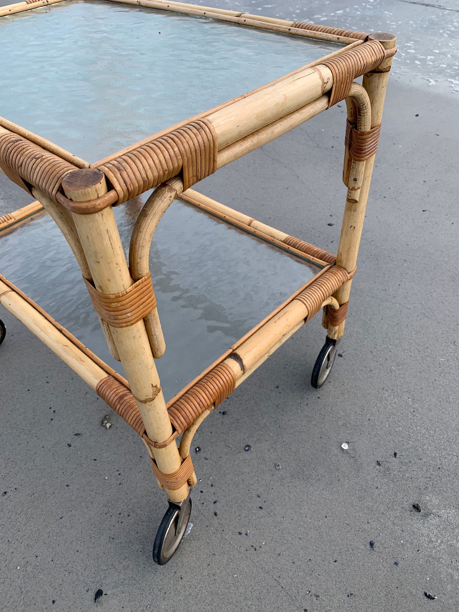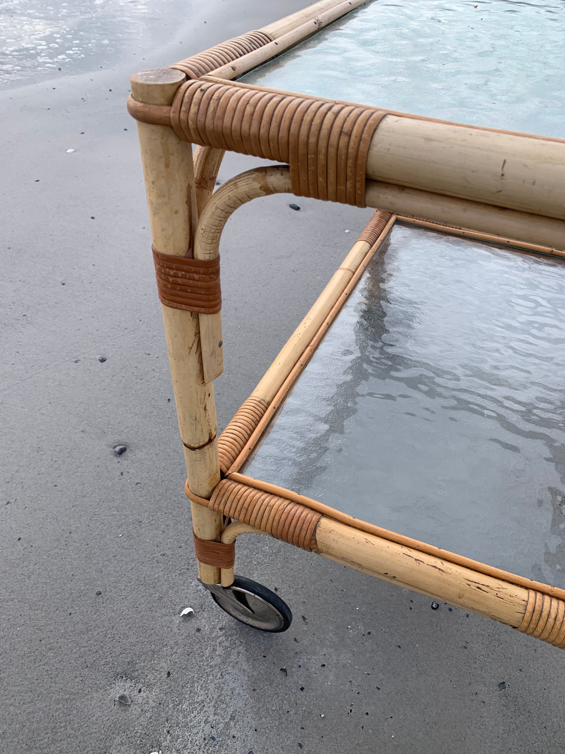 Fint og charmerende bambus bord/vogn med 2 glasplader og hjul. Bordet/vognen har en smule aldersrelaterede brugsspor men er overordnet i en rigtig god vintagestand.