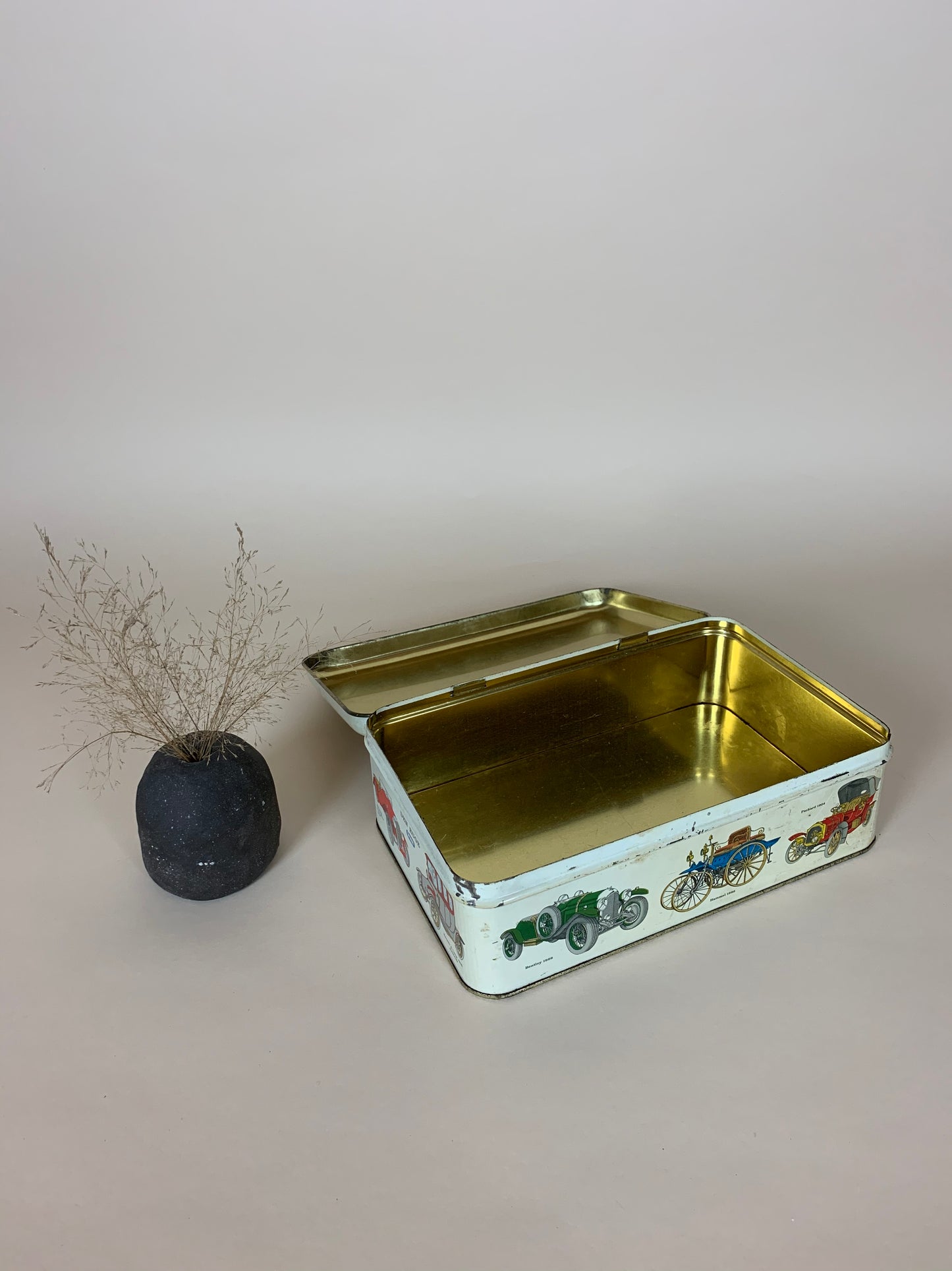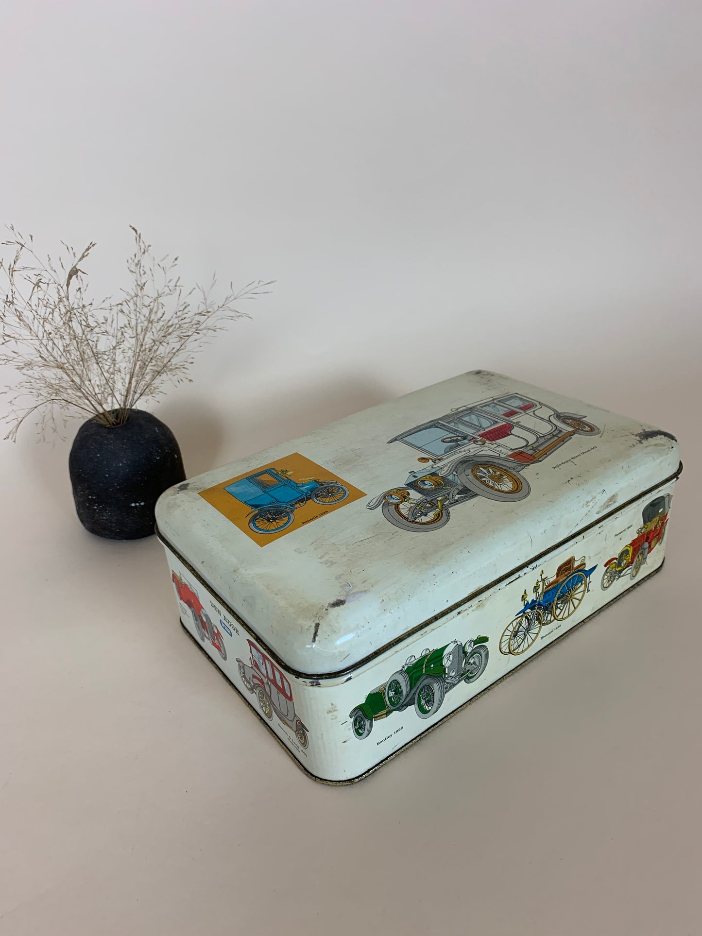 Sjov gammel metalæske fra Irma med bilmotiver.
