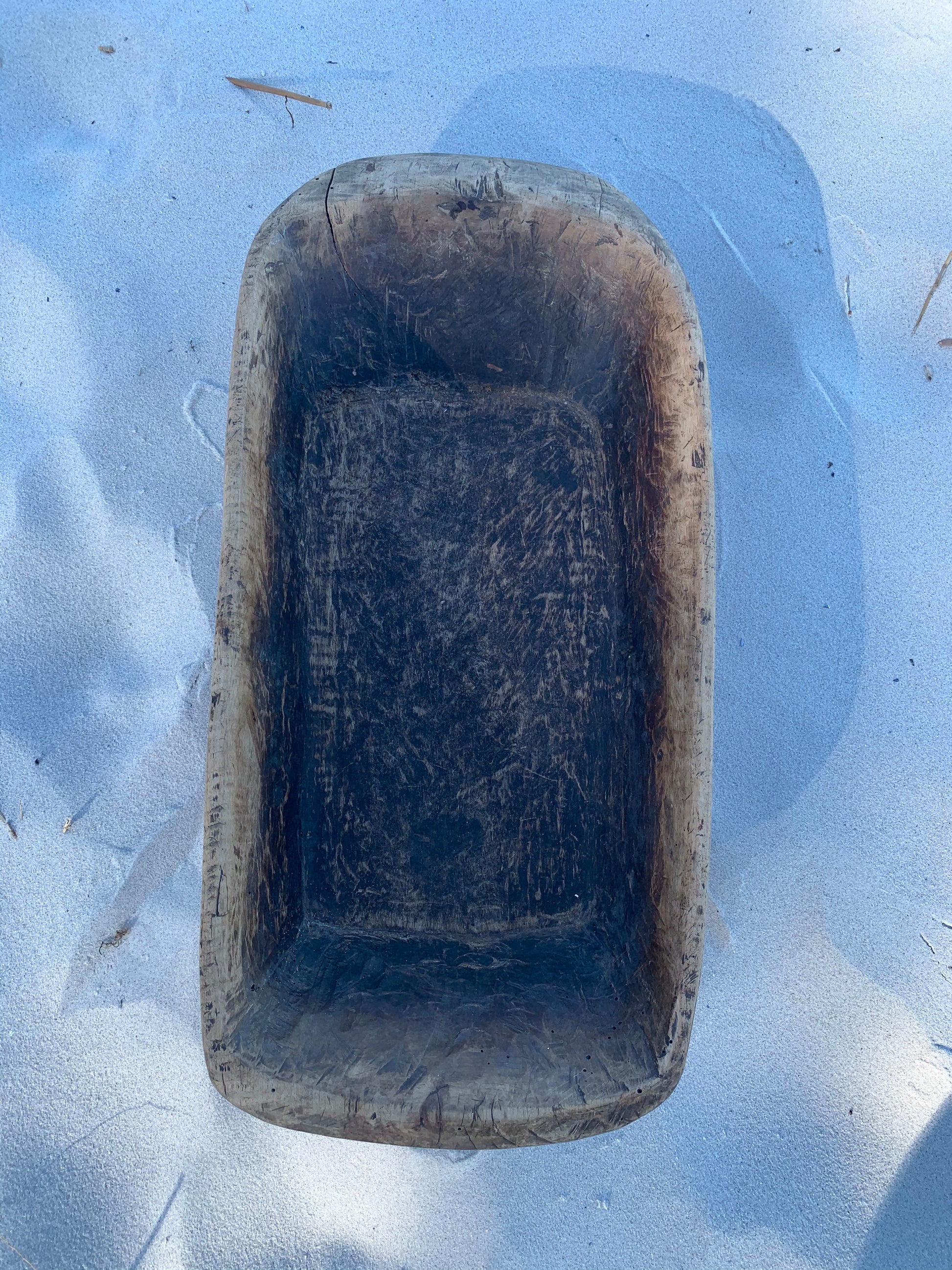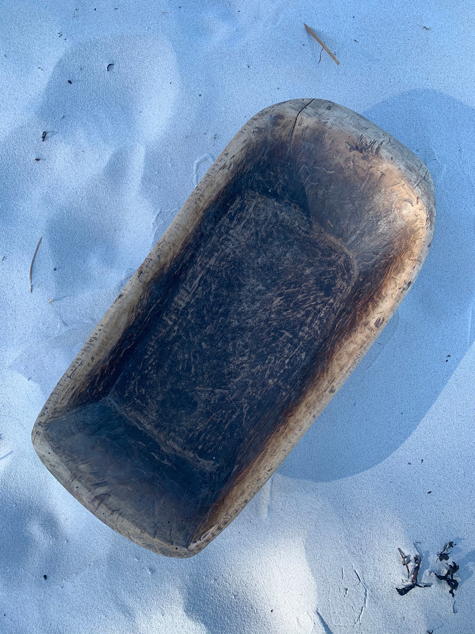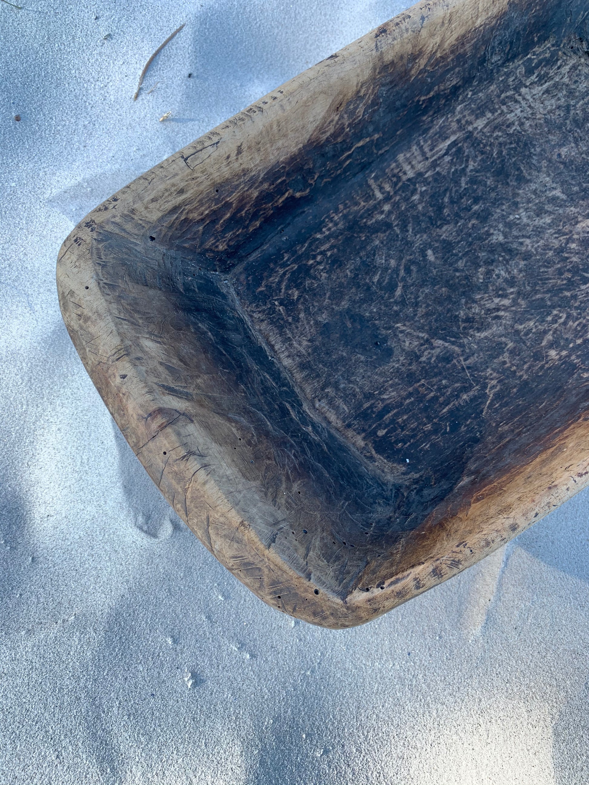 Skønt gammelt træfad. Fadet - der fremstår med masser af lækker patina - er asymmetrisk og har et skønt udtryk.