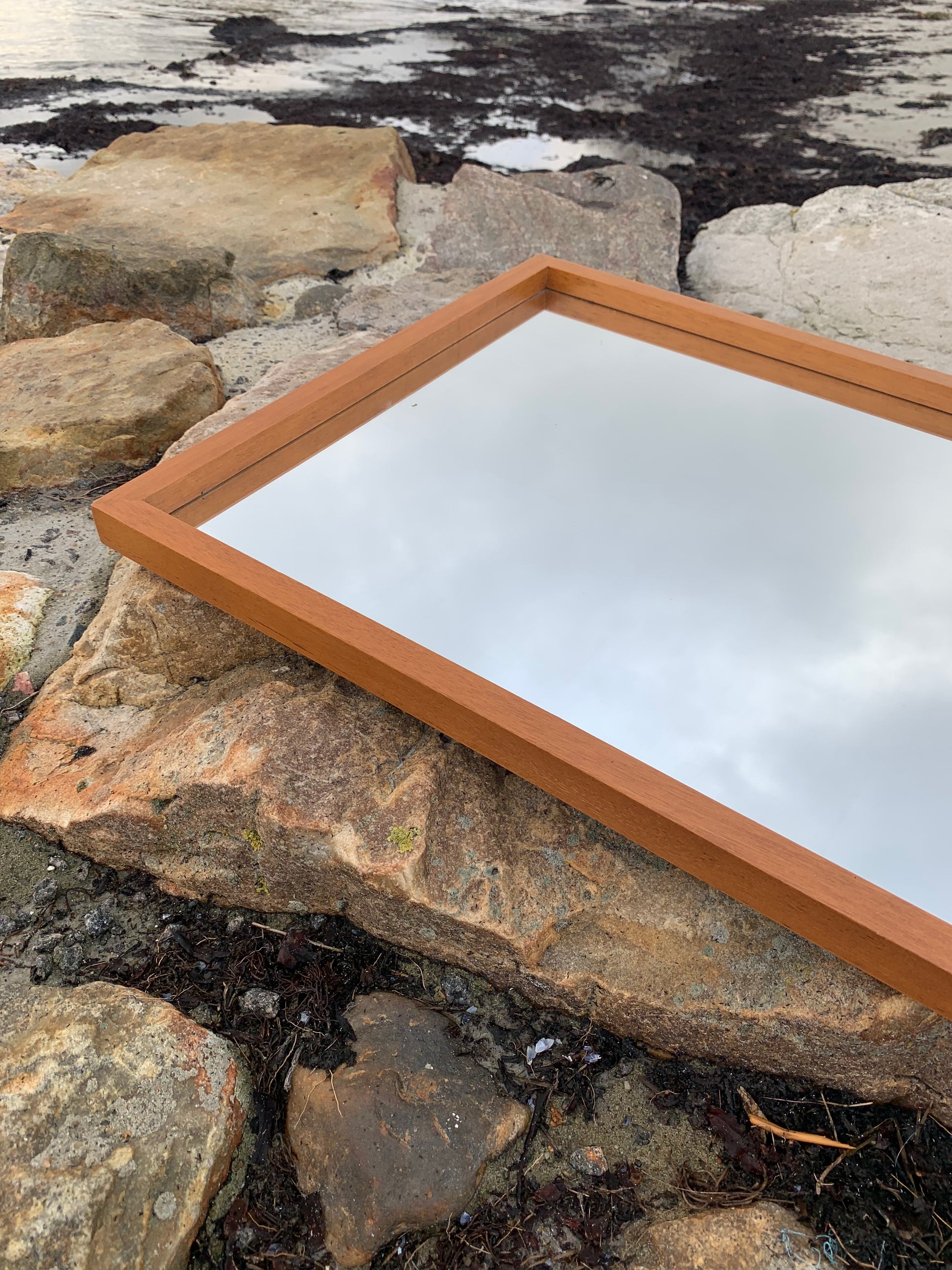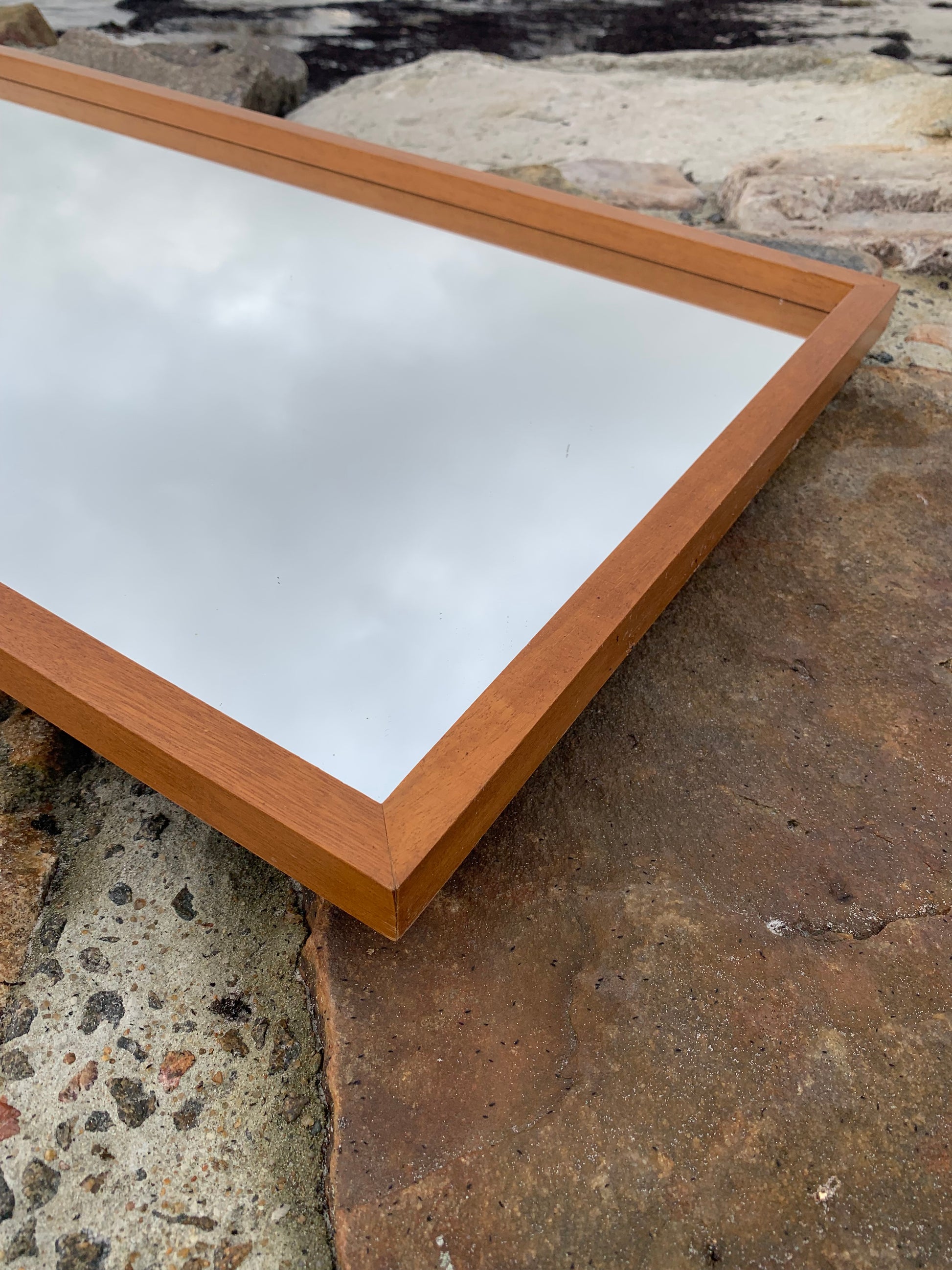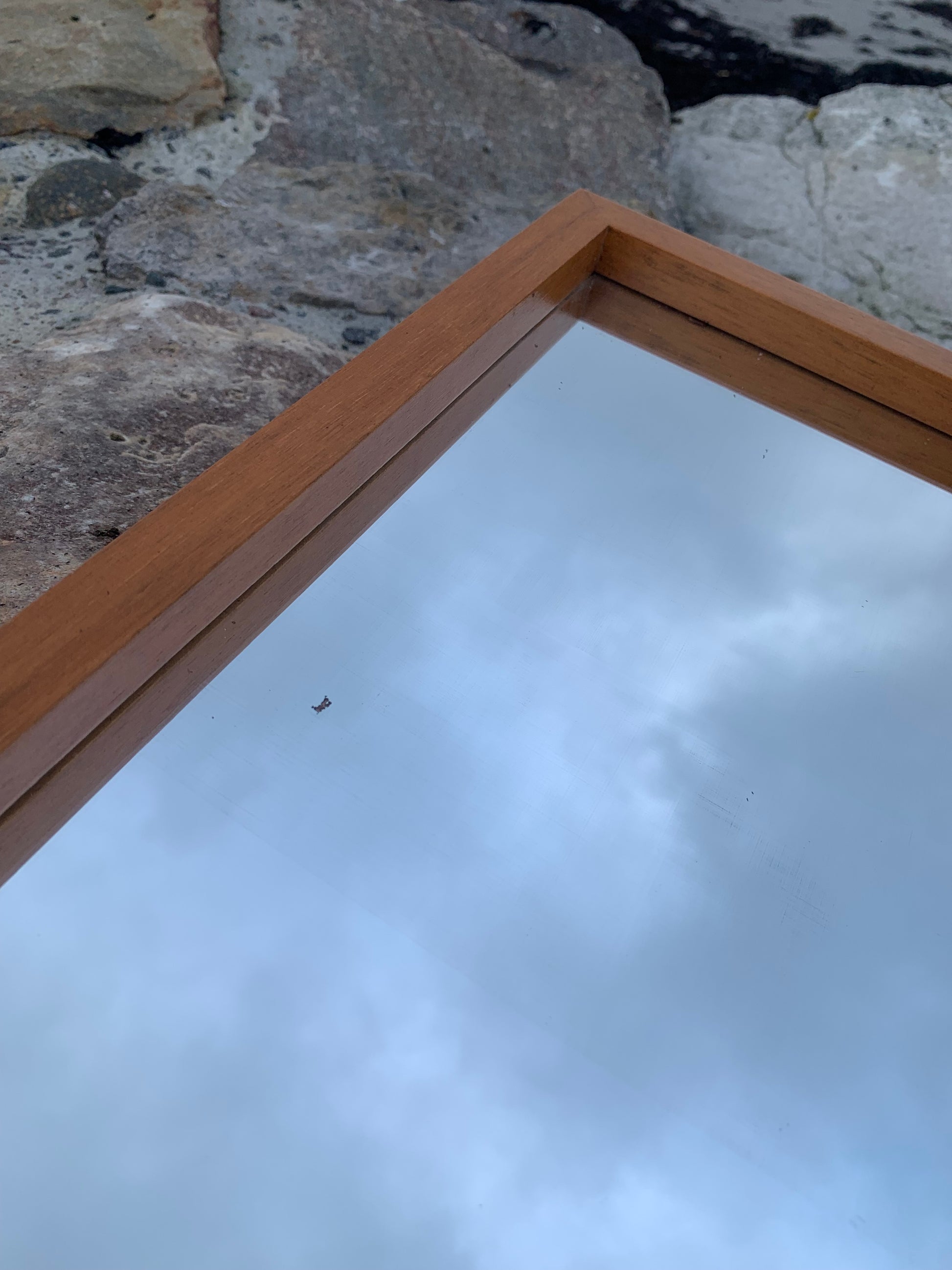 Fint gammelt spejl med træramme. Spejlet har en smule aldersrelaterede brugsspor men er overordnet i en god vintagestand.