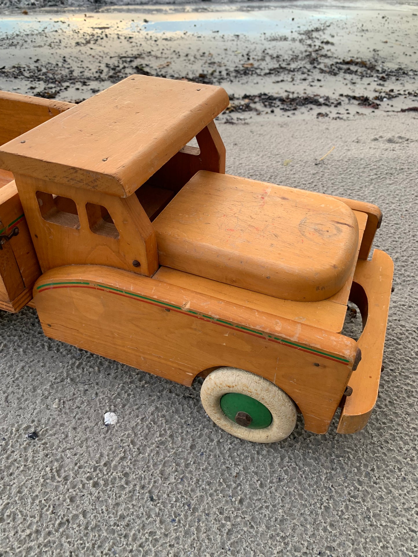 Stor flot lastbil i træ med fine detaljer. Siderne på ladet kan vippes ned.