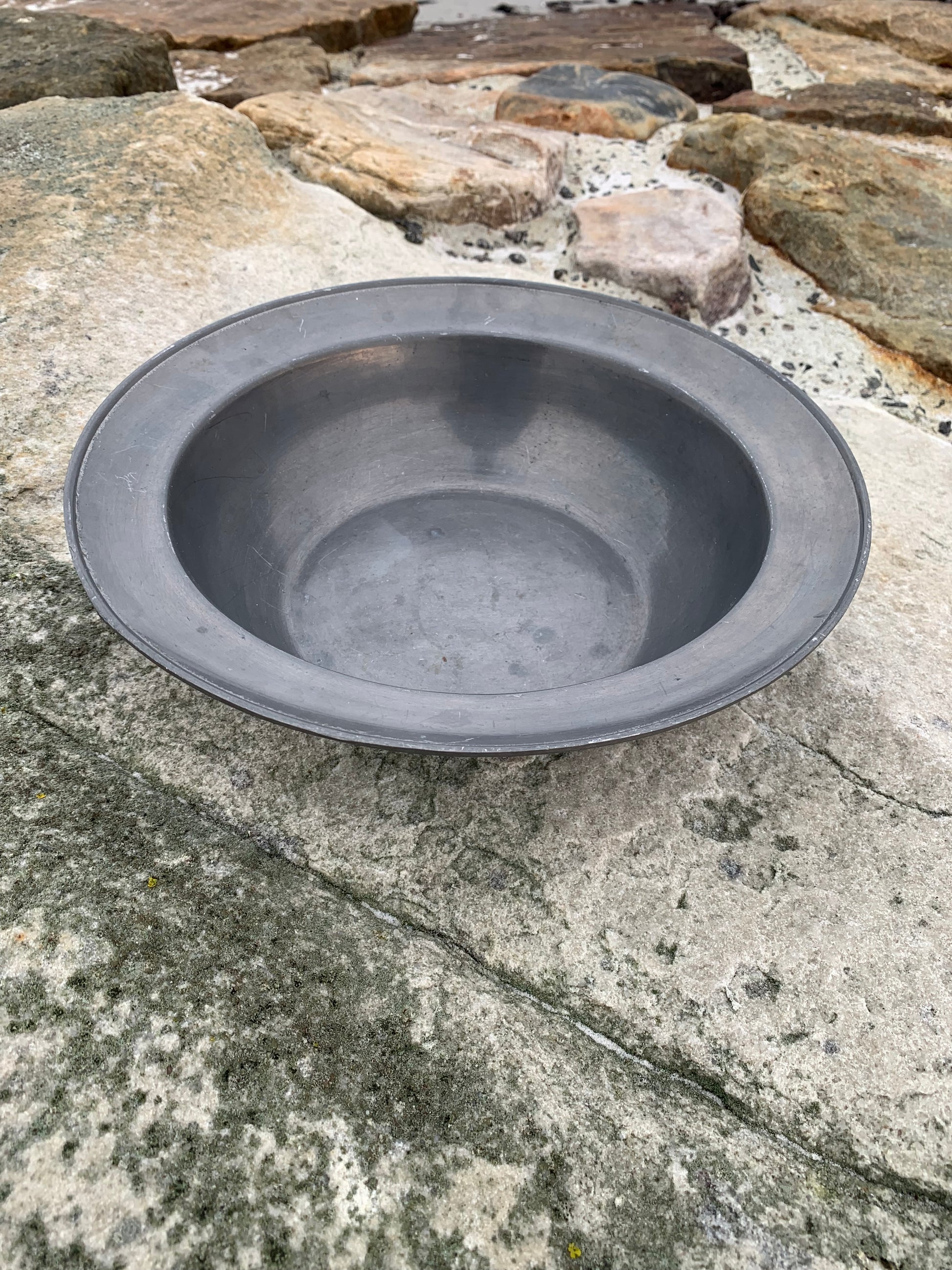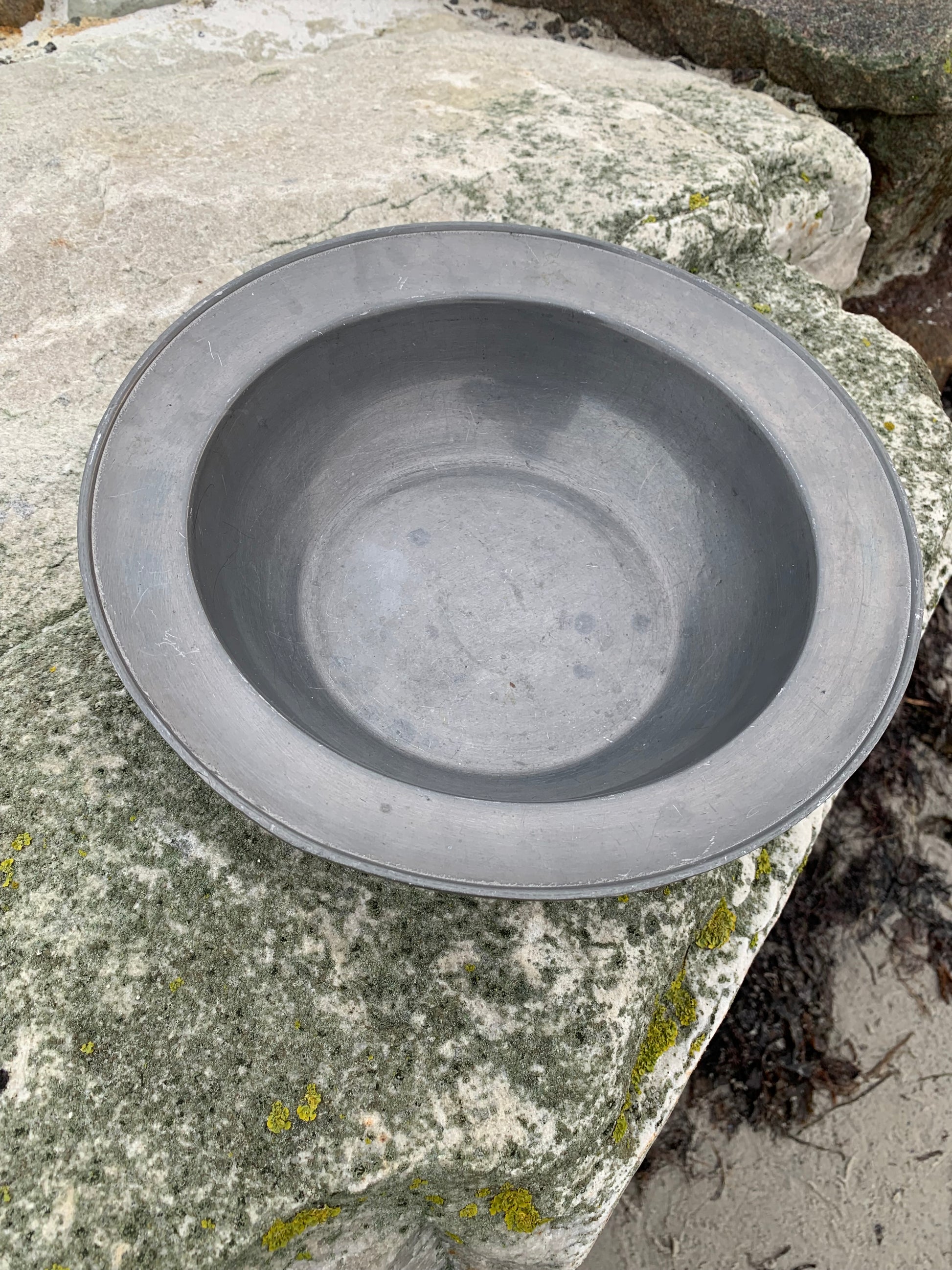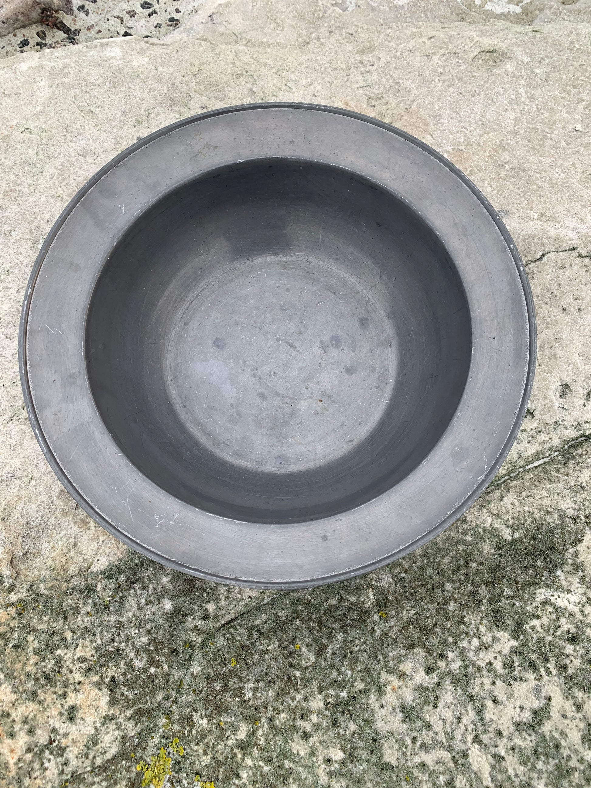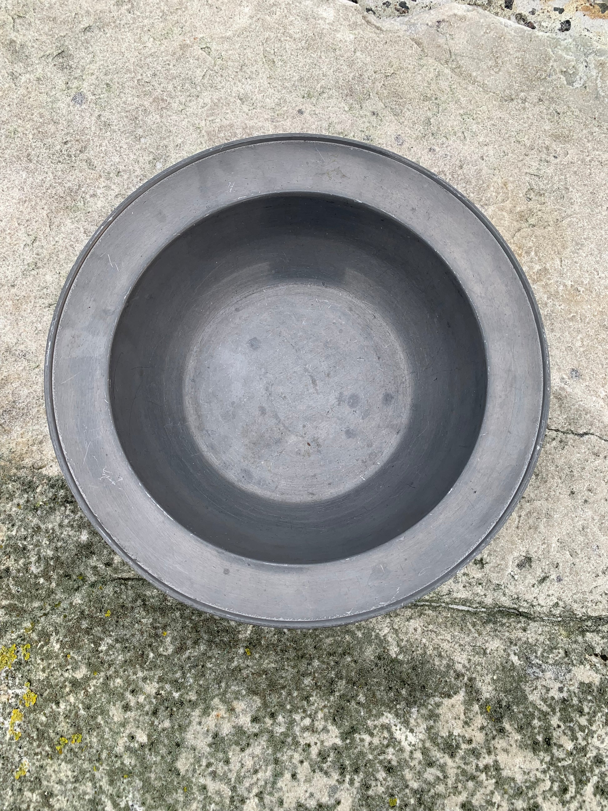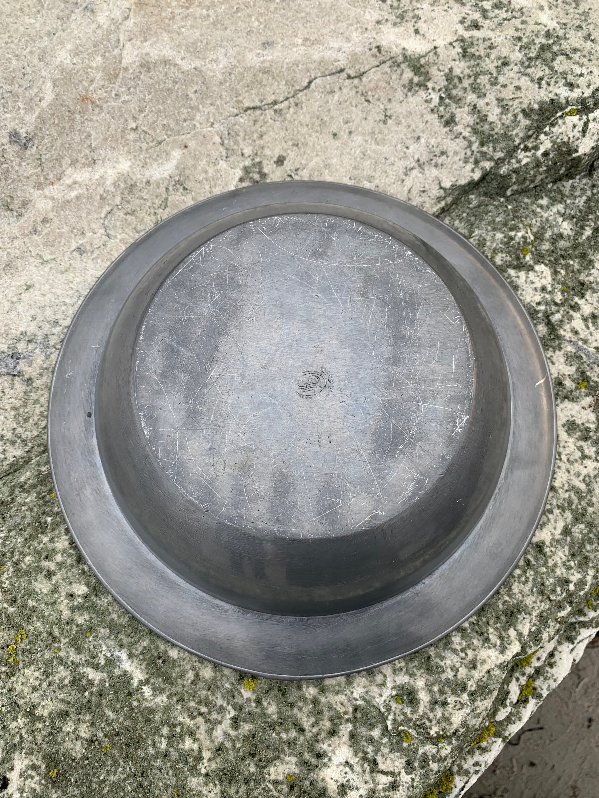 Skønt gammelt tinfad med masser af patina - meget dekorativt og med stempel.