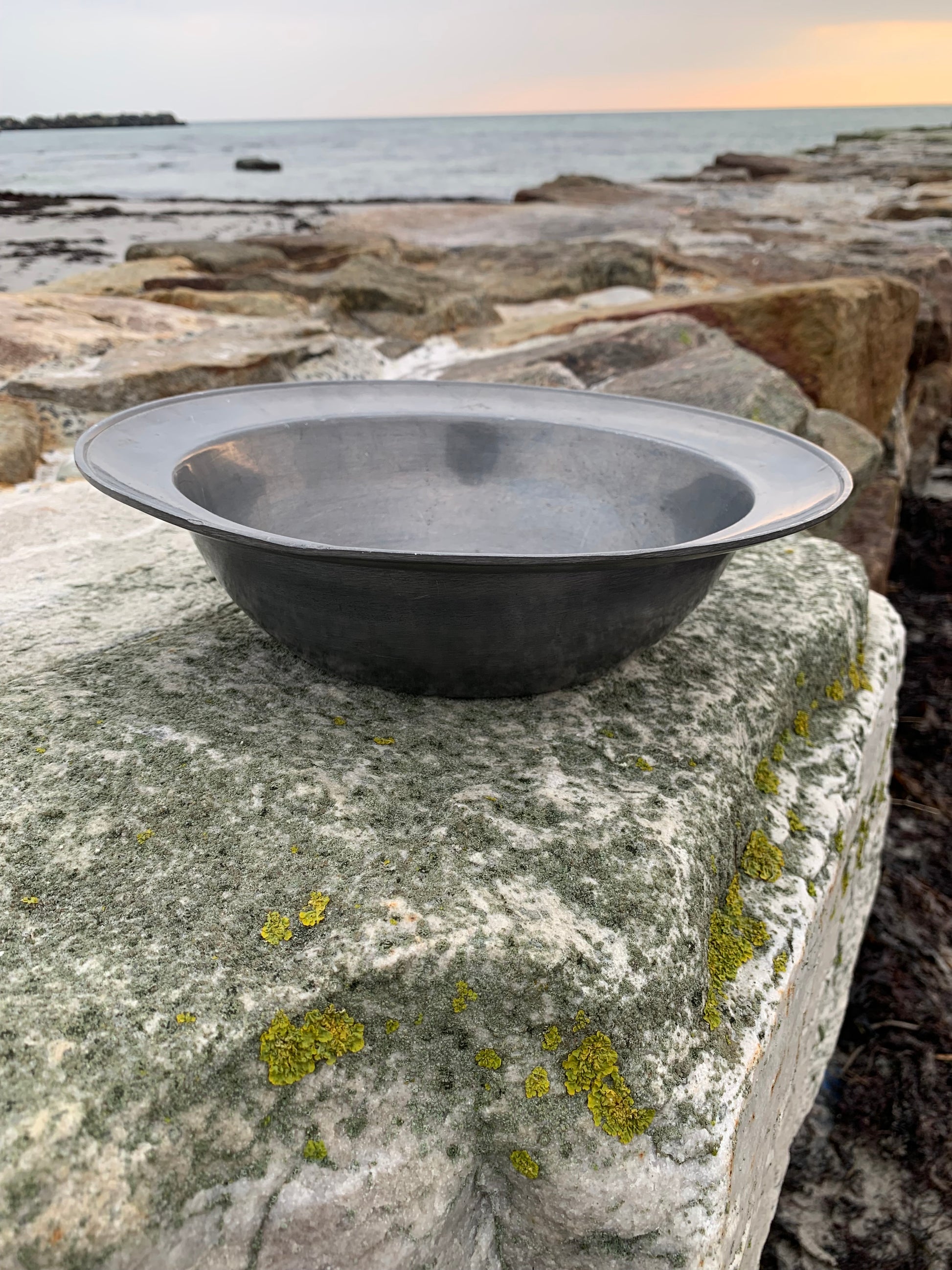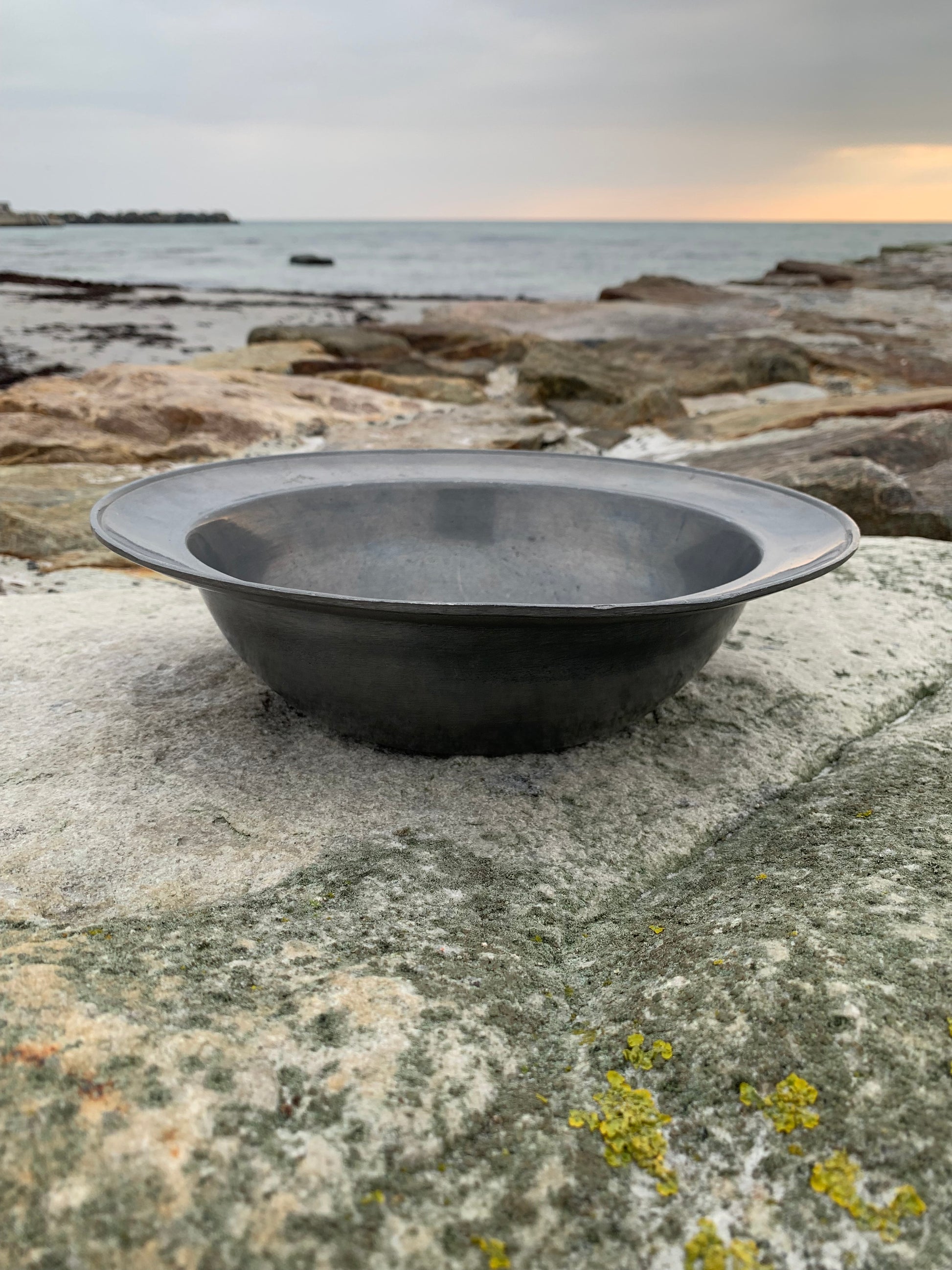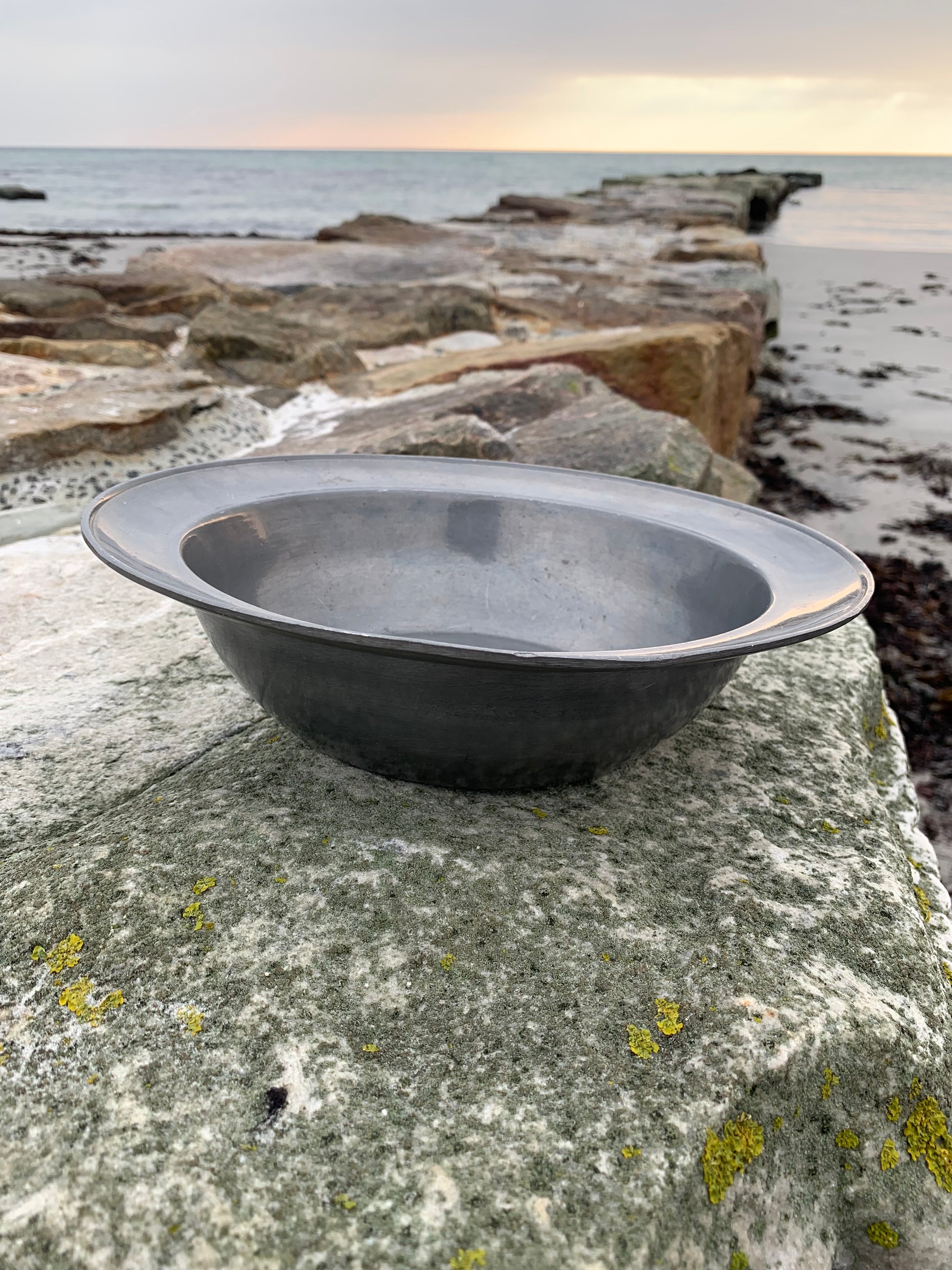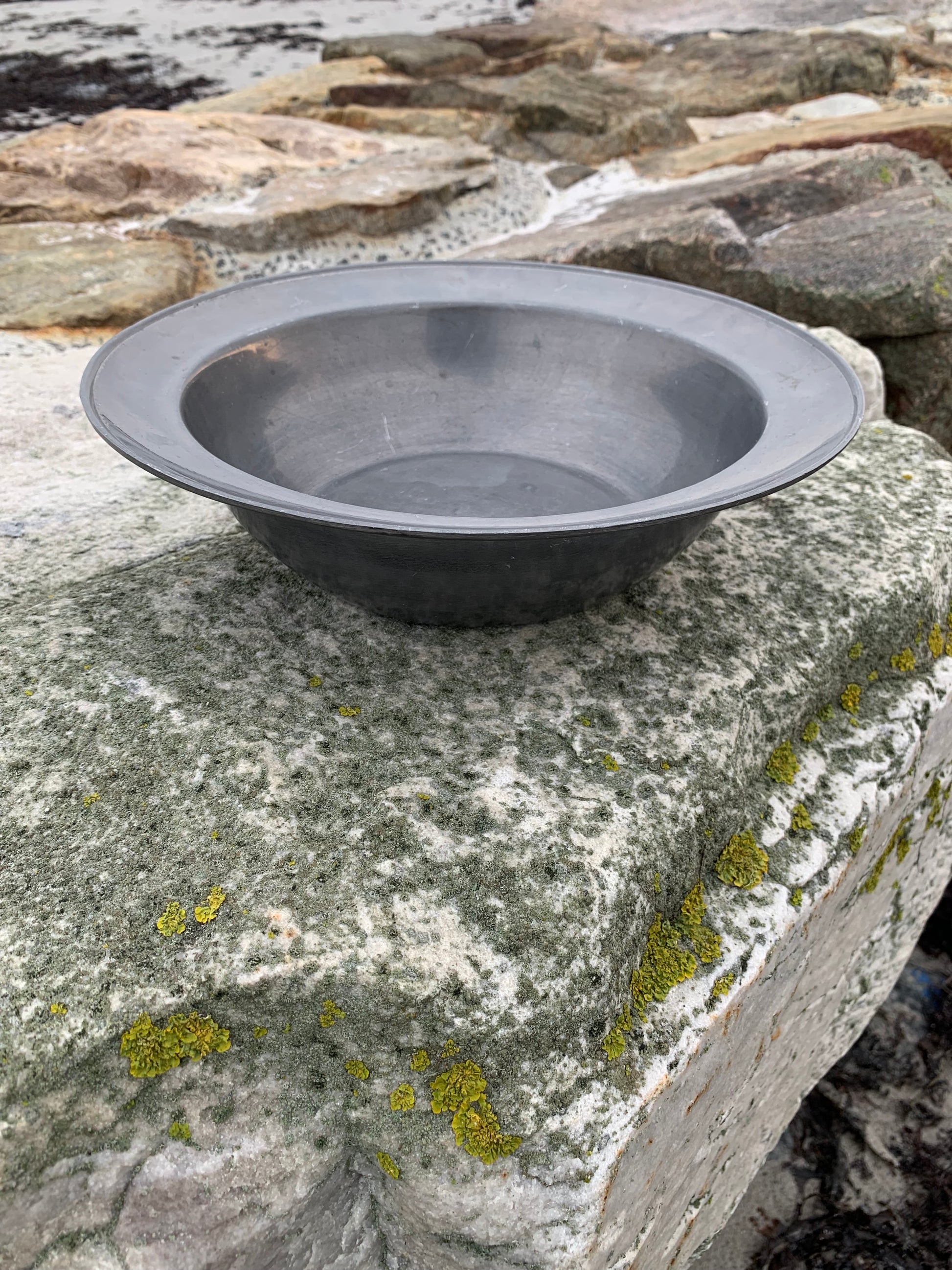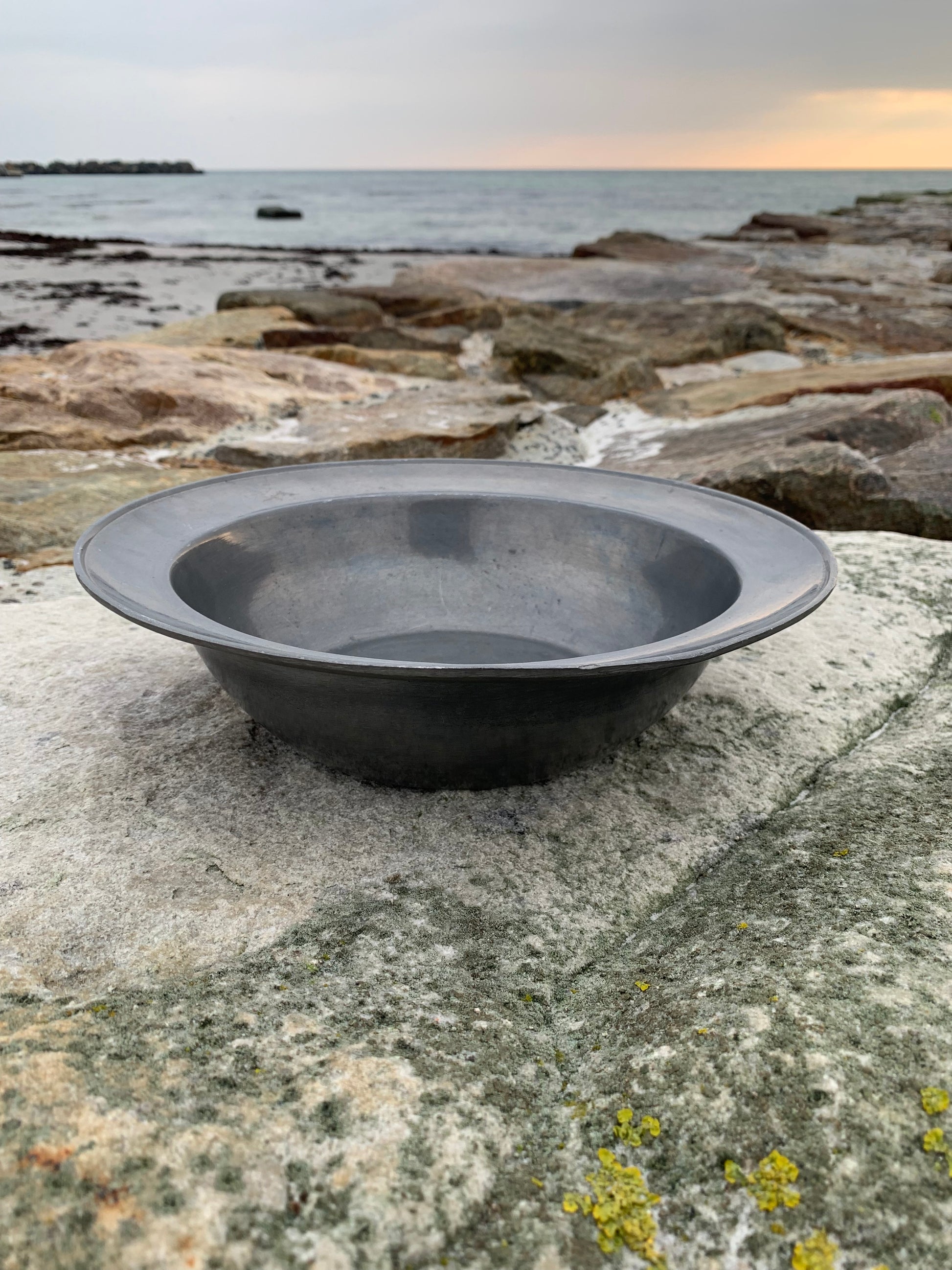 Skønt gammelt tinfad med masser af patina - meget dekorativt og med stempel.