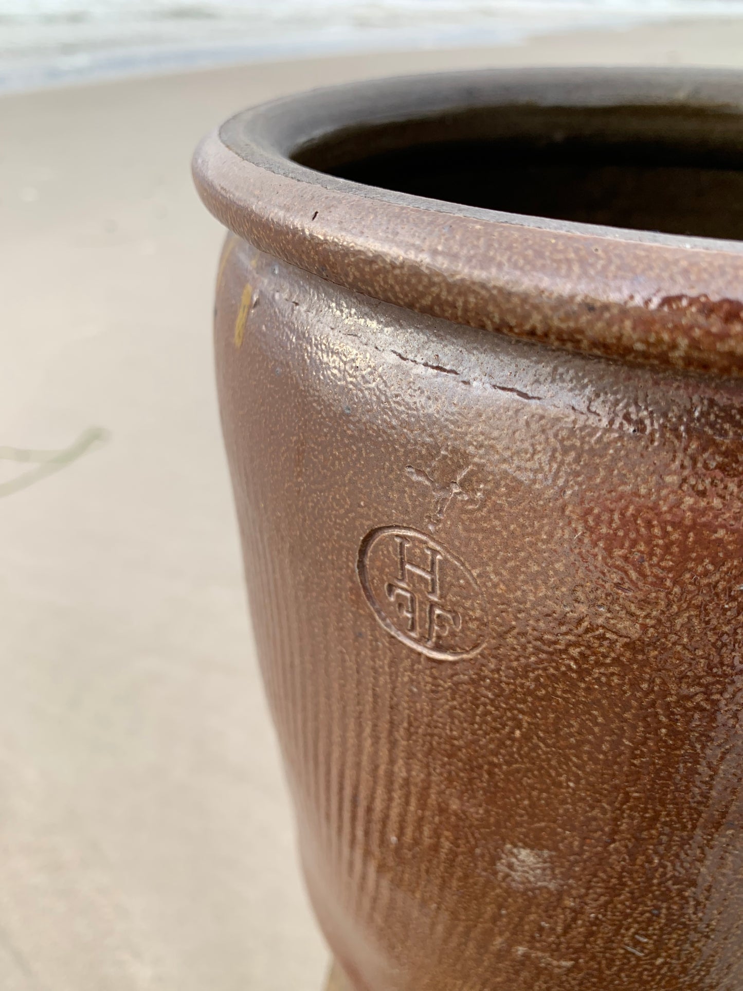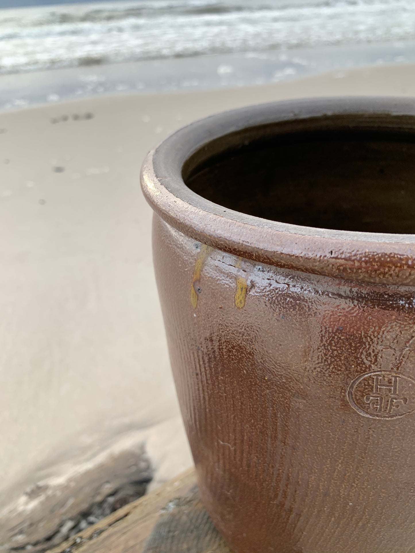 Anvendelig syltekrukke der kan anvendes til en plante, til køkkenredskaber eller hvad du ellers måtte finde på. Krukken er original, charmerende og har patina.