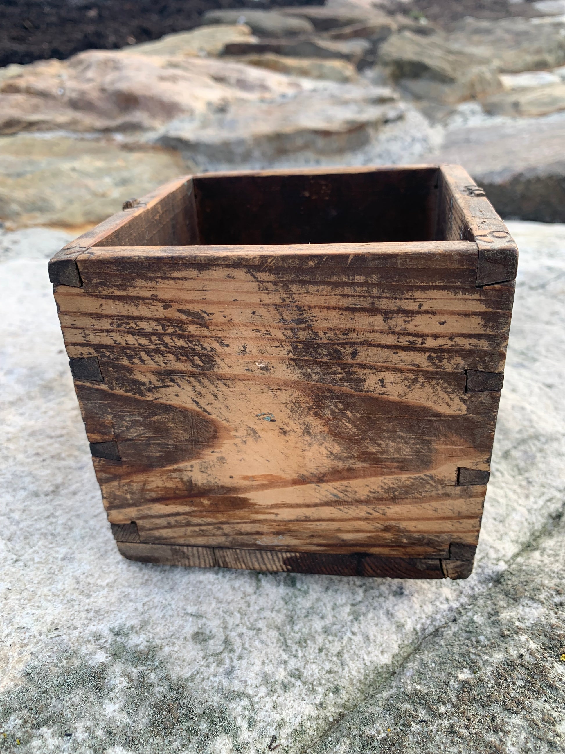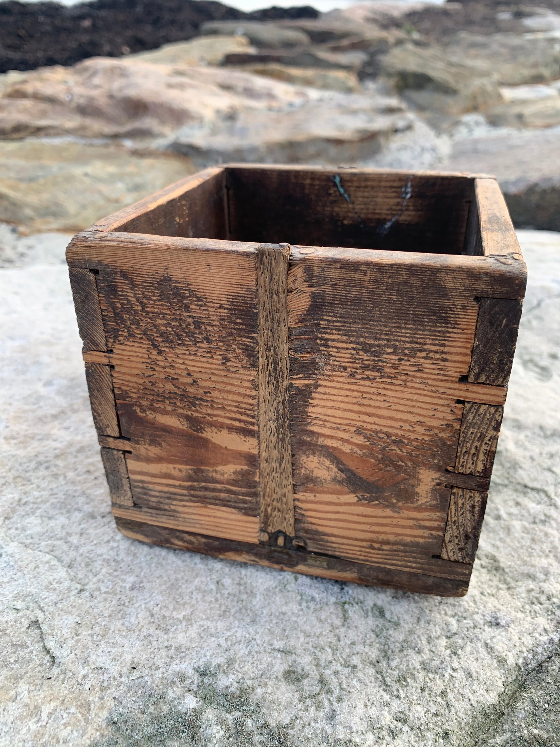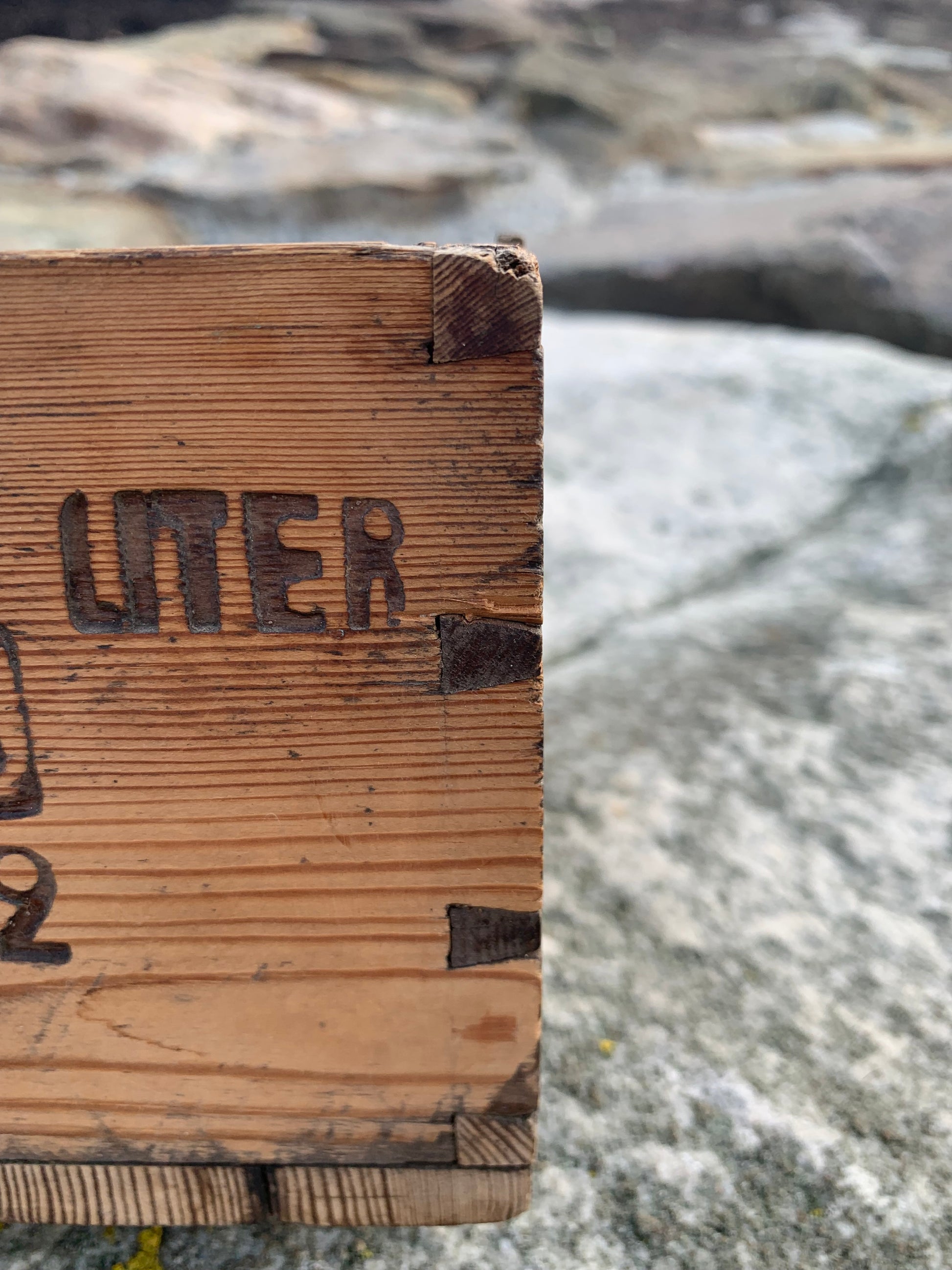 Smuk gammel trækasse med gravering. Kassen kommer fra et svensk bageri hvor den blev anvendt som mål. Kassen har en charmerende patina.