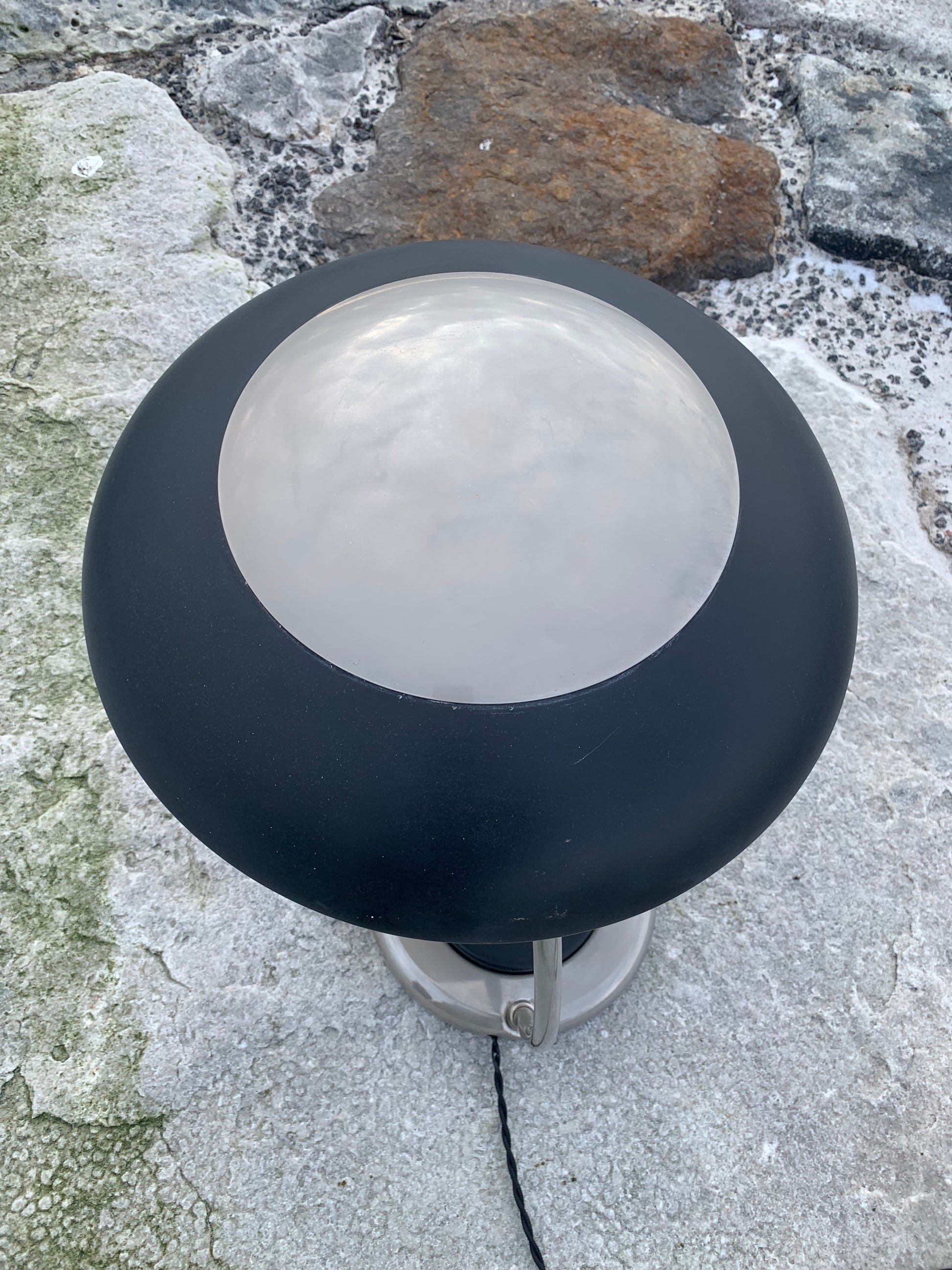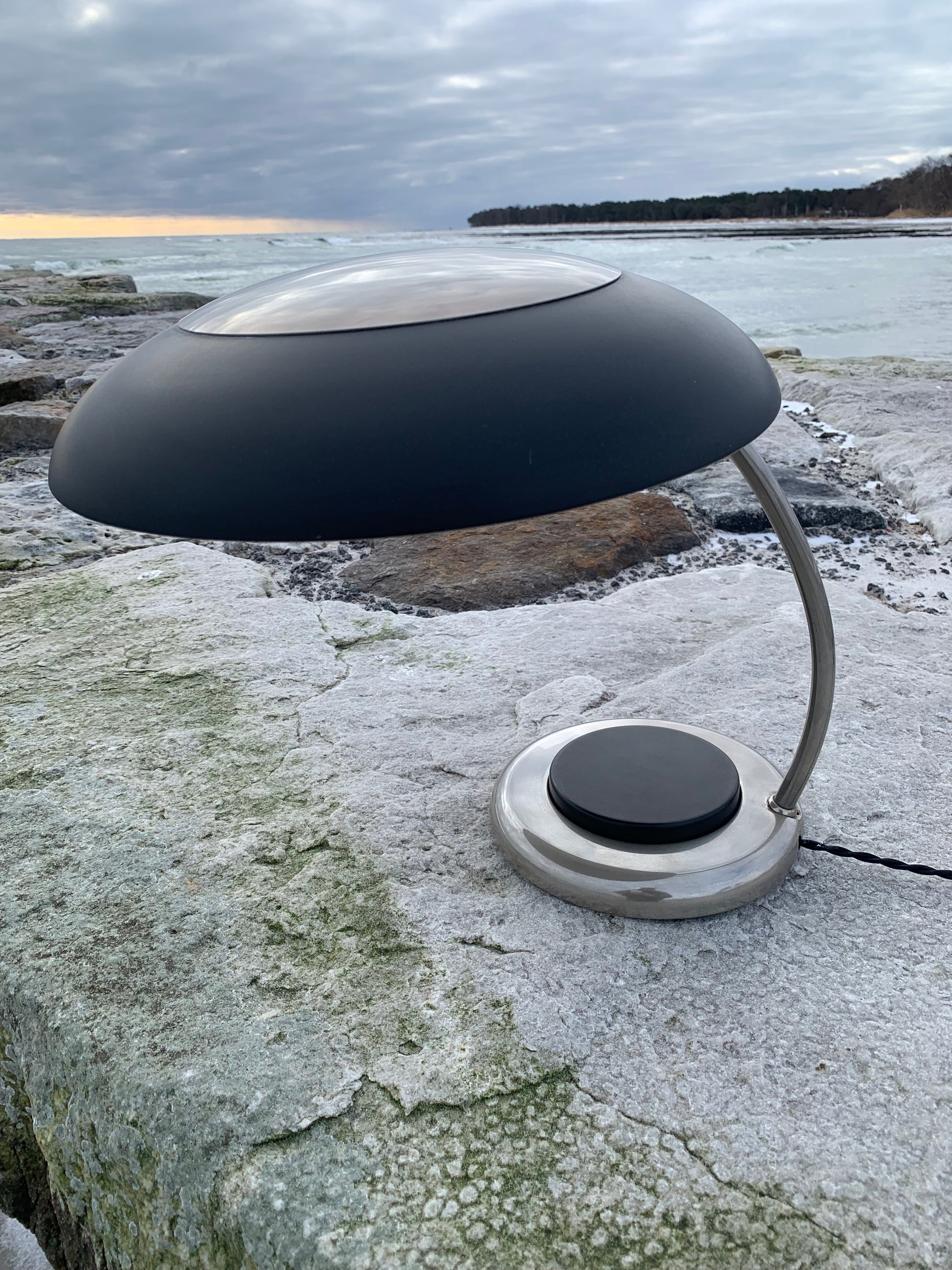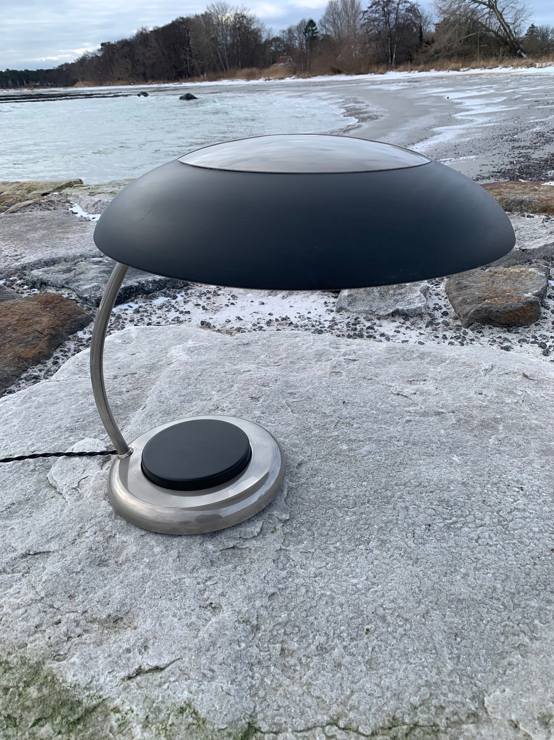 VEB NARVA LEUCHTENBAU LENGEFELD ufolampe. Lampen er sandsynligvis fra 1960’erne og fremstår flot med den slags aldersrelaterede brugsspor som en lampe med så mange årtier bag sig nærmest bør have. En sjov, sjælden og lækker detalje er den meget store trykkontakt (der tænder lampen) denne udgør nærmest hele lampens fod. Overordnet er lampen i en rigtig flot vintagestand.