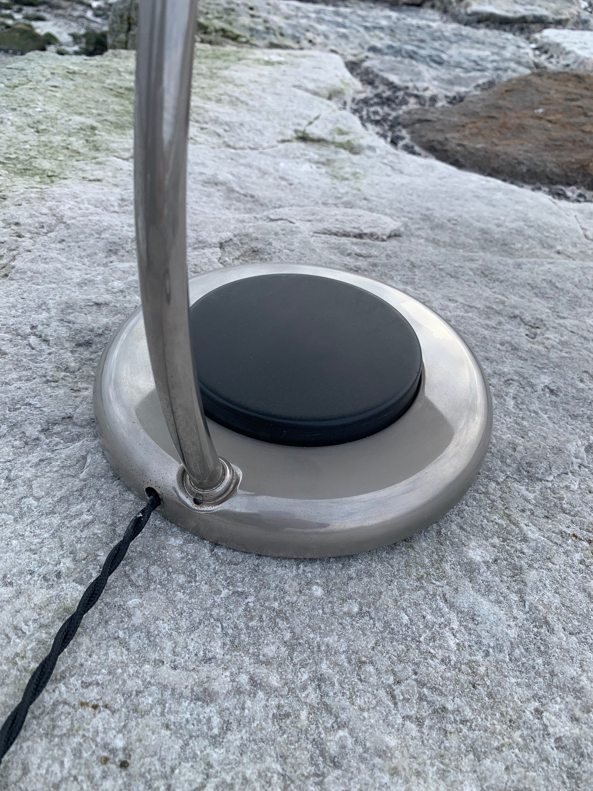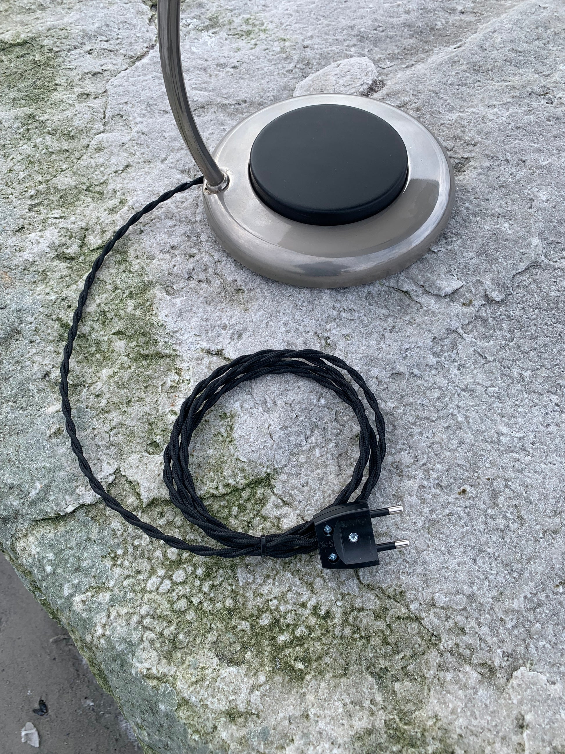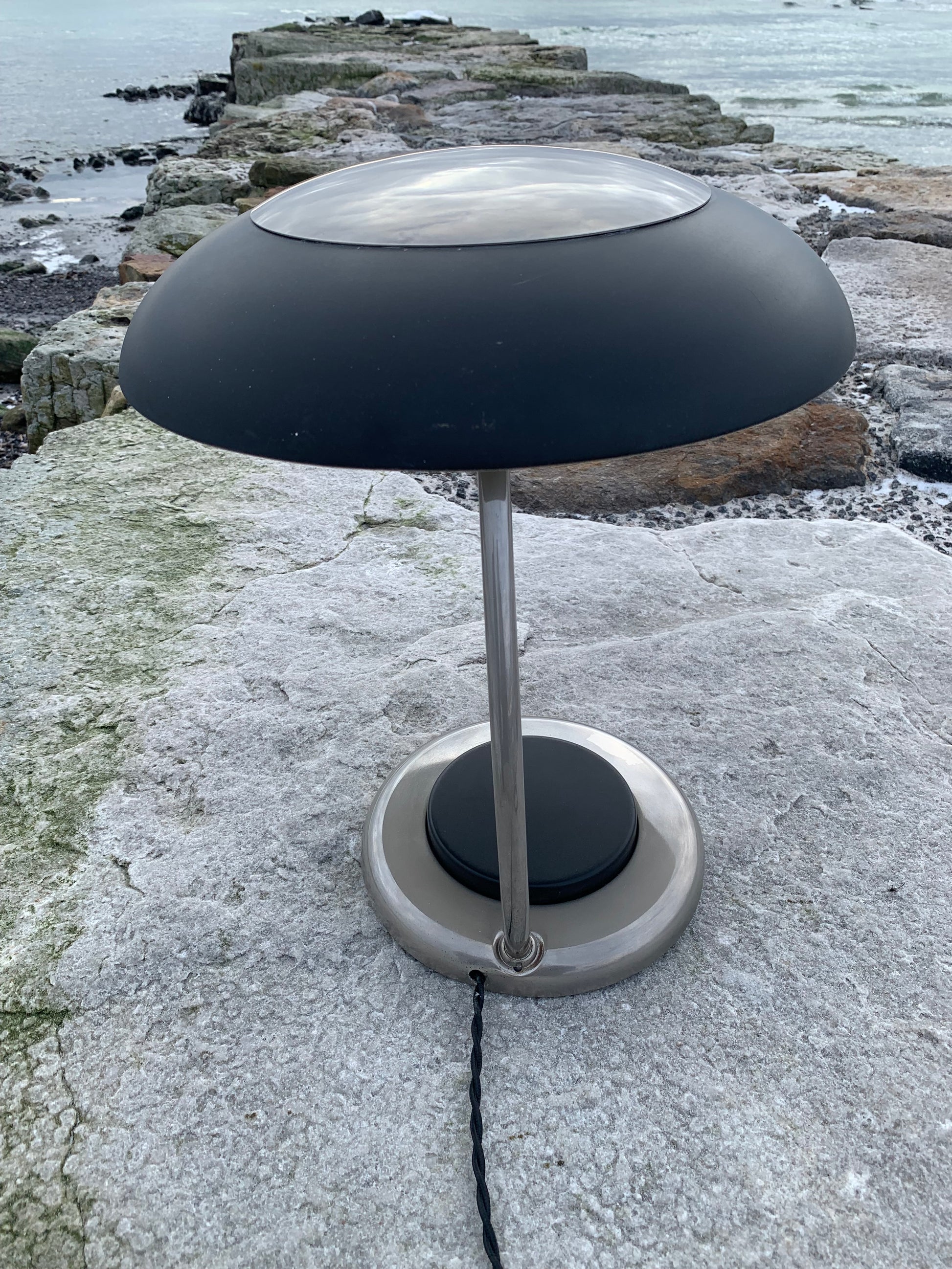 VEB NARVA LEUCHTENBAU LENGEFELD ufolampe. Lampen er sandsynligvis fra 1960’erne og fremstår flot med den slags aldersrelaterede brugsspor som en lampe med så mange årtier bag sig nærmest bør have. En sjov, sjælden og lækker detalje er den meget store trykkontakt (der tænder lampen) denne udgør nærmest hele lampens fod. Overordnet er lampen i en rigtig flot vintagestand.