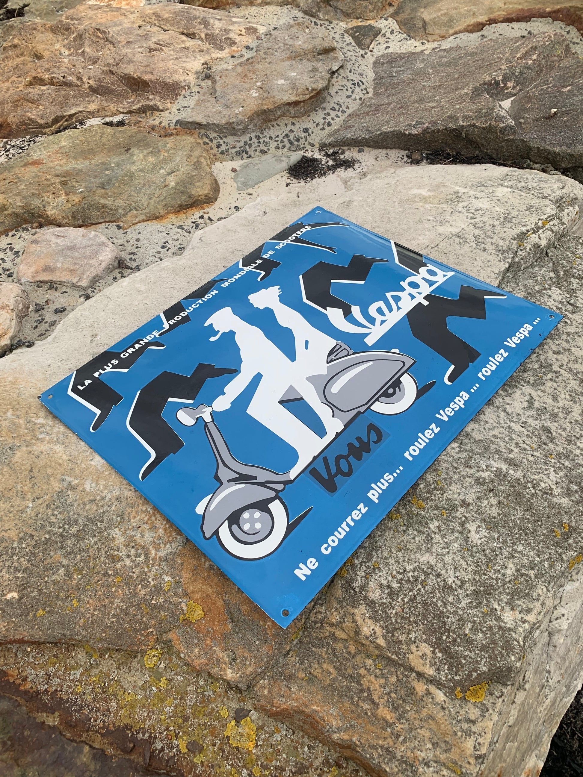 Vespa emaljeskilt (hvælvet) Skiltet er i en brugt men flot stand.