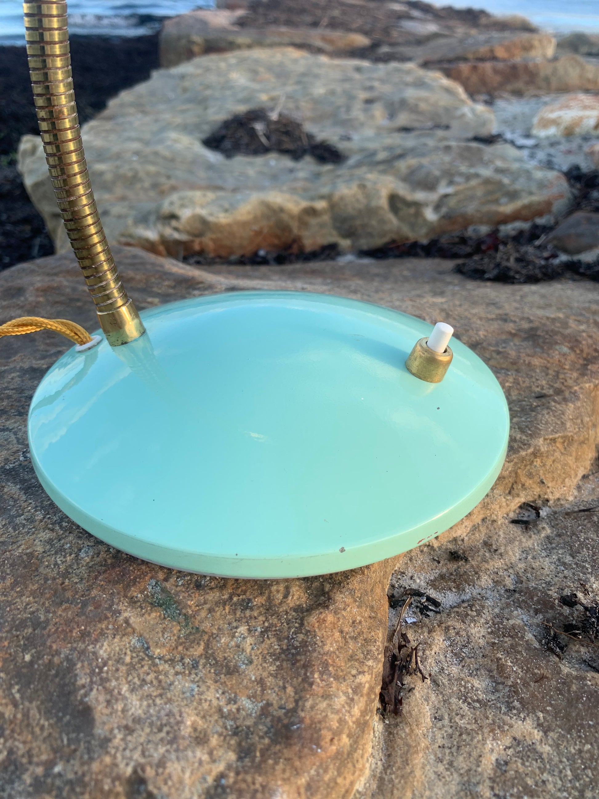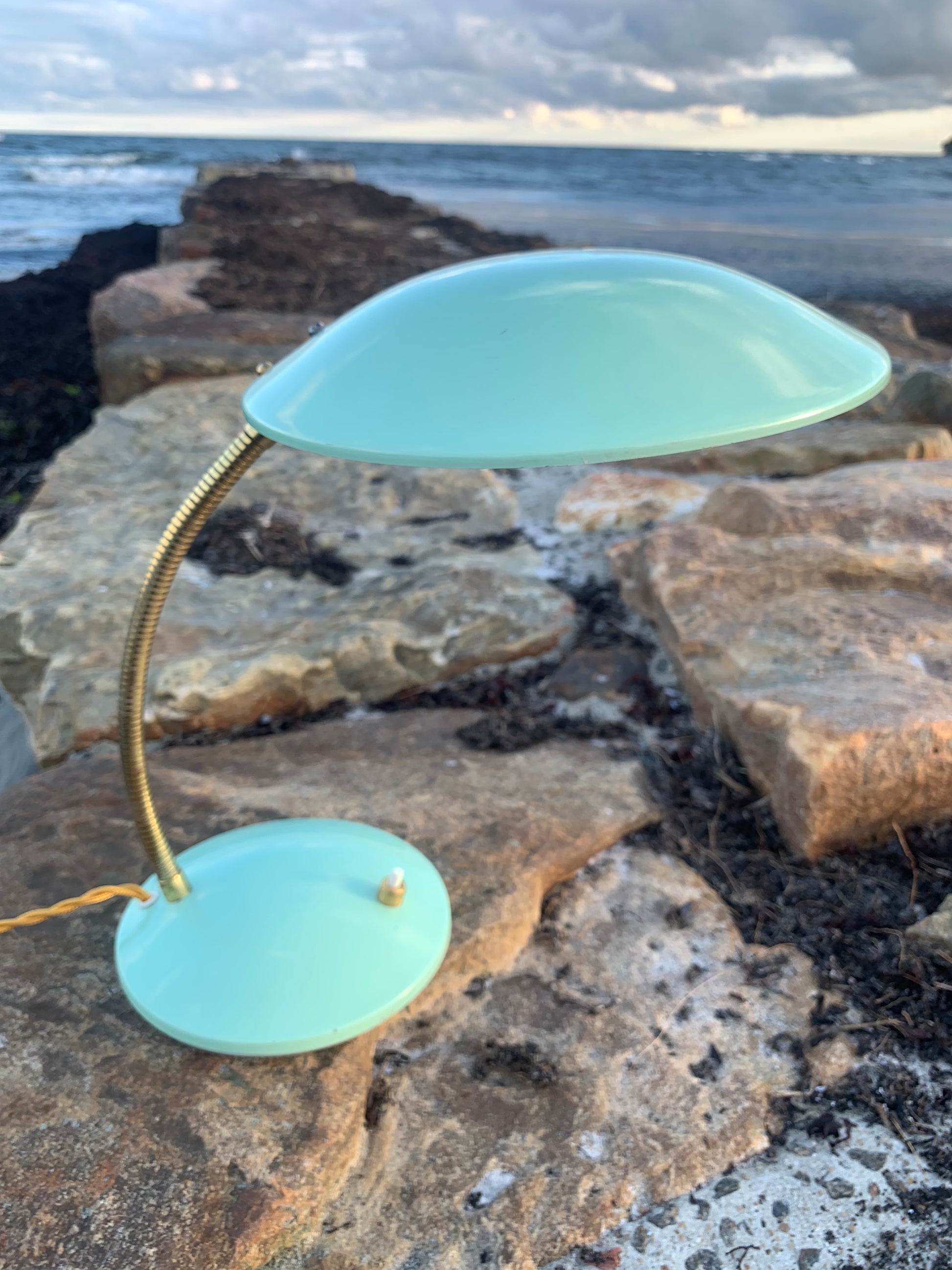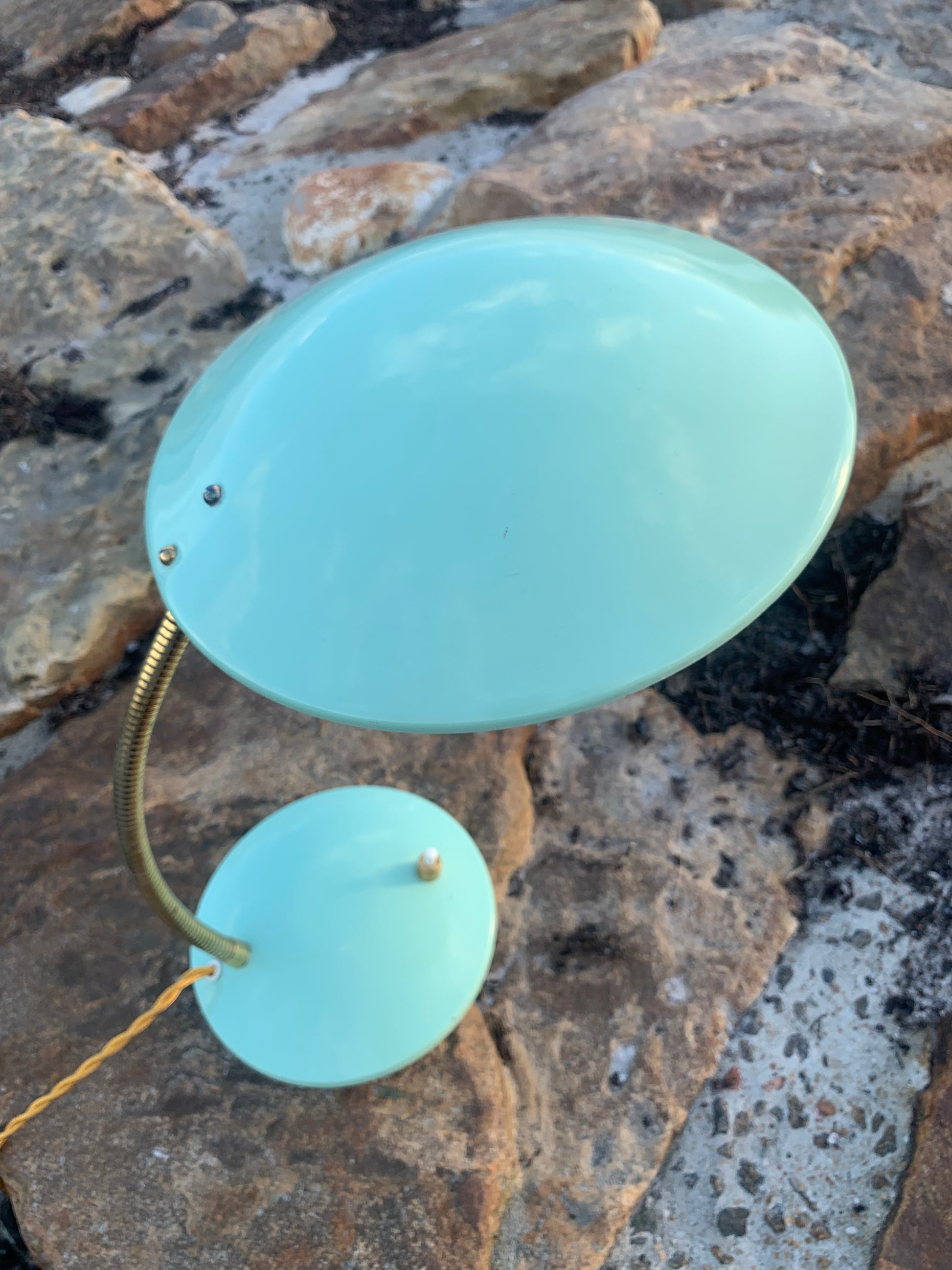 Fin gammel vintagelampe i en lækker mint farve. Lampen fremstår nykablet og med en smule aldersrelaterede brugsspor som disse lamper (efter vores smag) nærmest bør have.